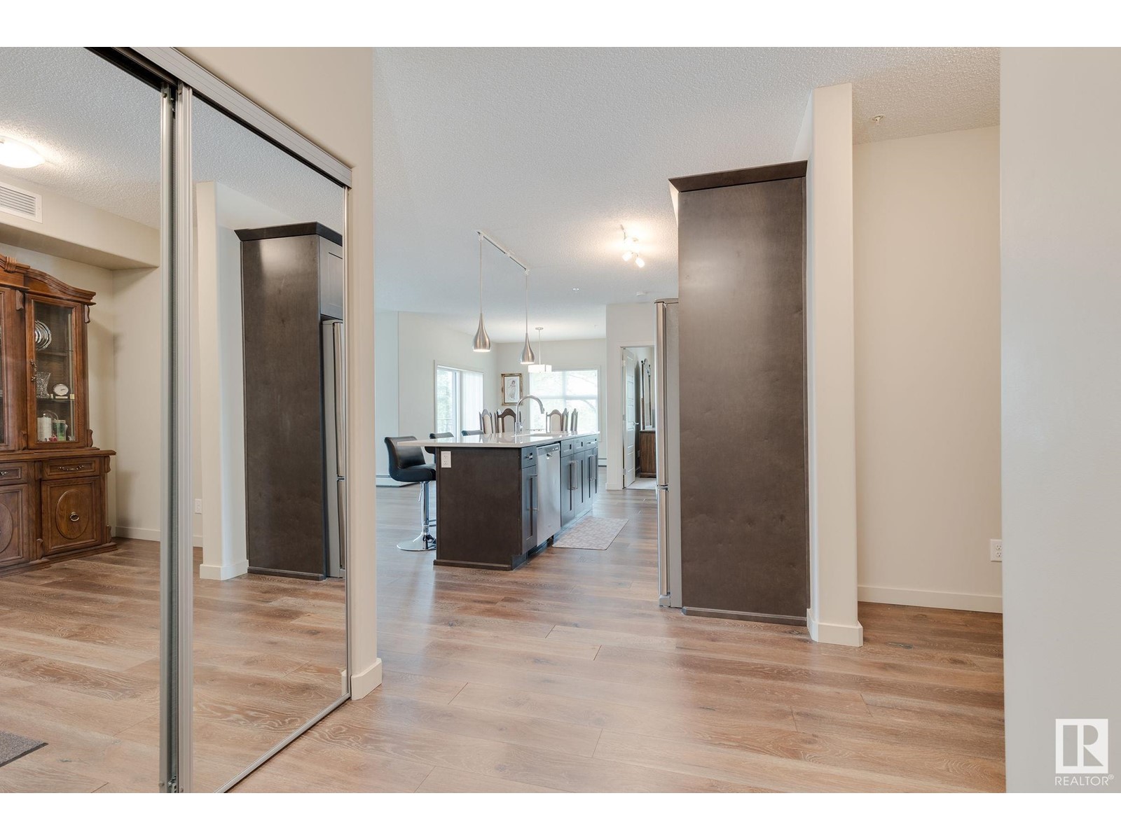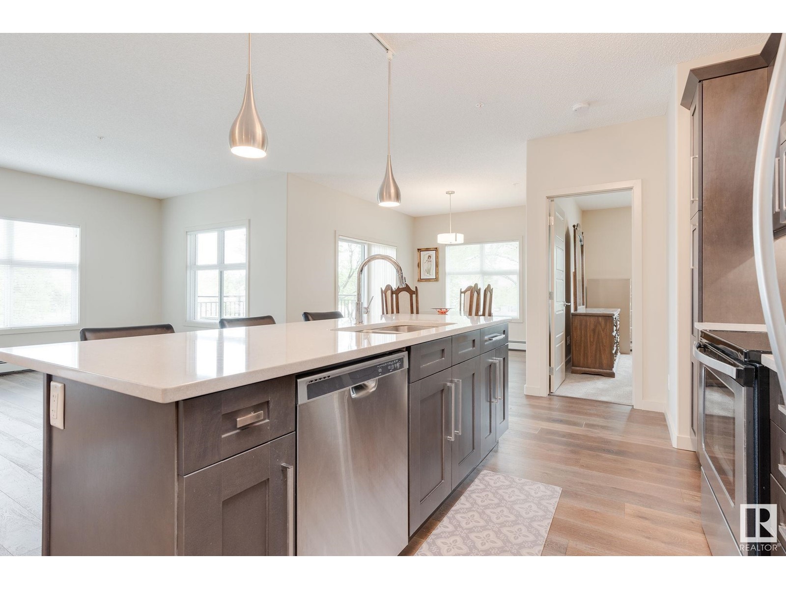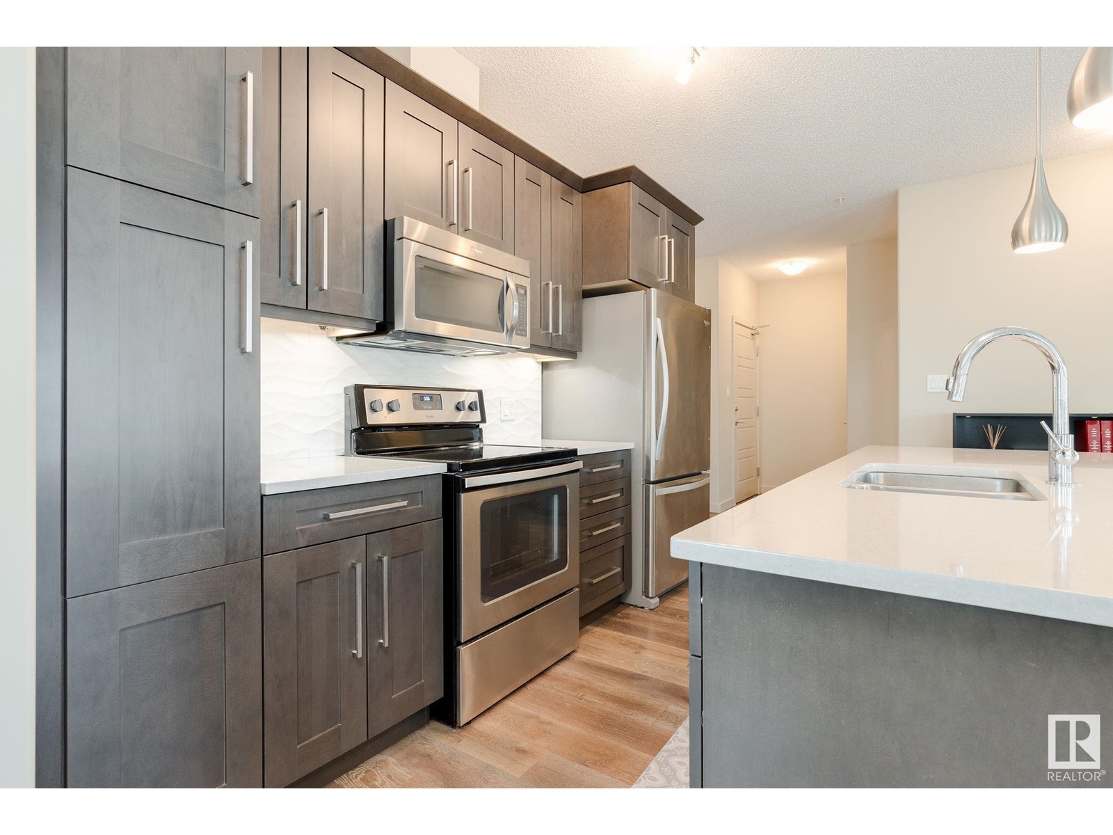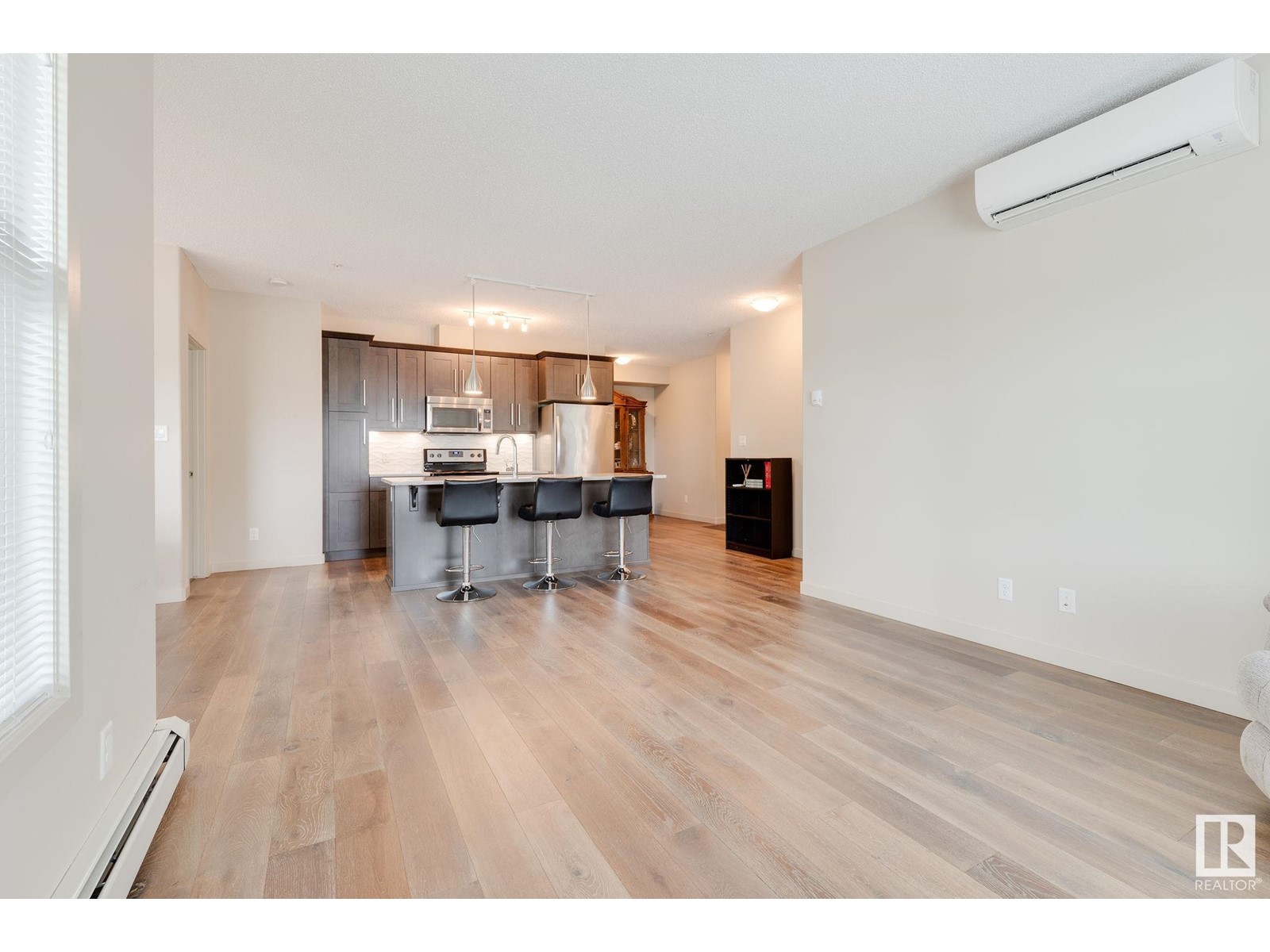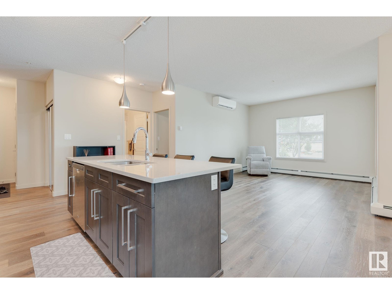Welcome to this gorgeous, SOUTH FACING, CORNER UNIT, two-bedroom condo with A/C in the neighborhood of Griesbach! Entering you will be blown away by the quality finishing throughout. Pristine hardwood flooring showcases the open concept living area. The kitchen shows elegantly with ample rich-toned cabinetry, stainless steel appliances and gleaming stone countertops. Adjacent dining space is perfect for your dinner parties and provides access to a fantastic and private patio with gas hook up. The living room is spacious and bright, the perfect place to entertain family. Primary bedroom is your own personal oasis, featuring a walk-through closet and 3-piece en suite. The second bedroom is spacious and has a 4pc bathroom right outside its door. ADDITIONAL FEATURES: In-suite laundry, a den/office space, upgraded countertops throughout, TWO TITLED UNDERGROUND PARKING STALLS, also separate large storage cage. Fitness facility and social room in the building. Close to amenities within steps of the building! (id:22211)