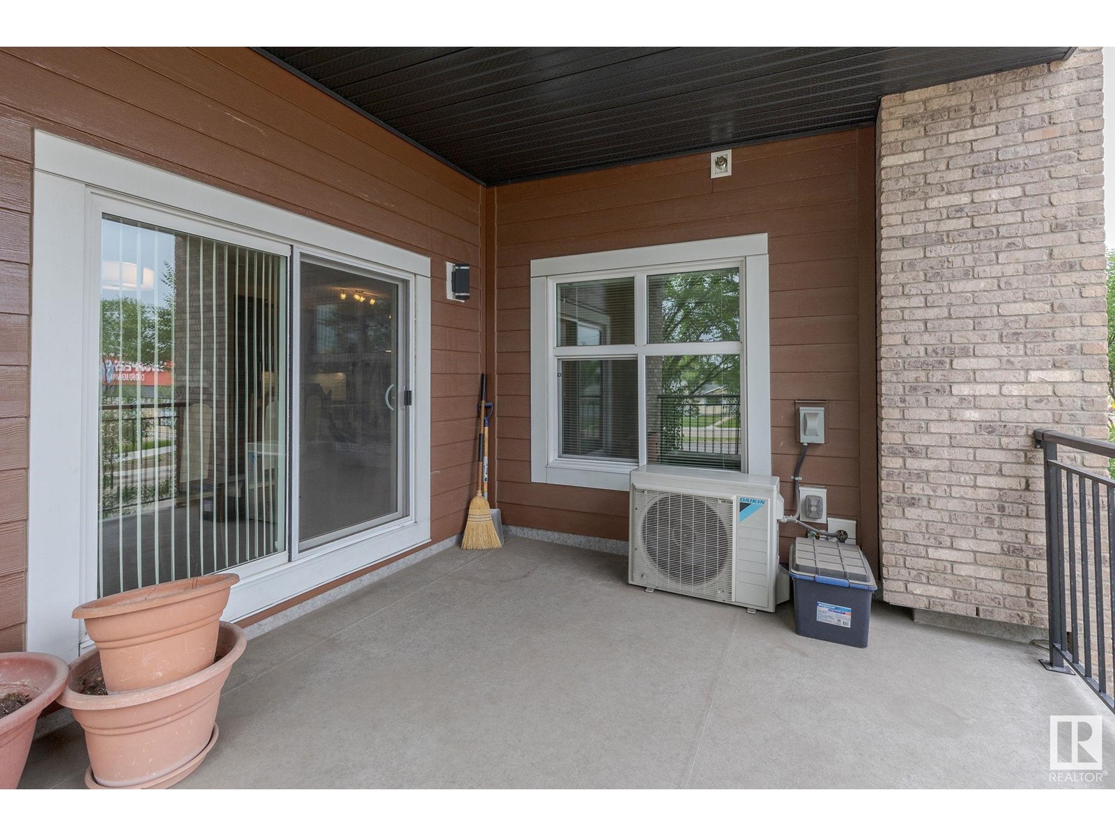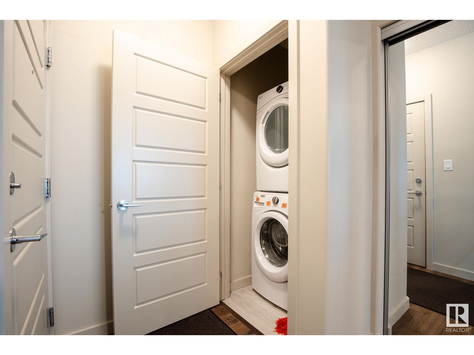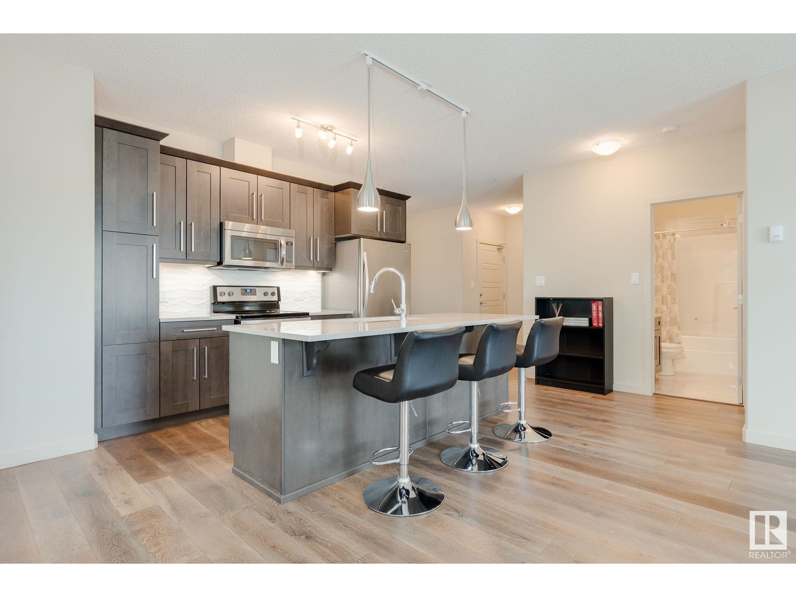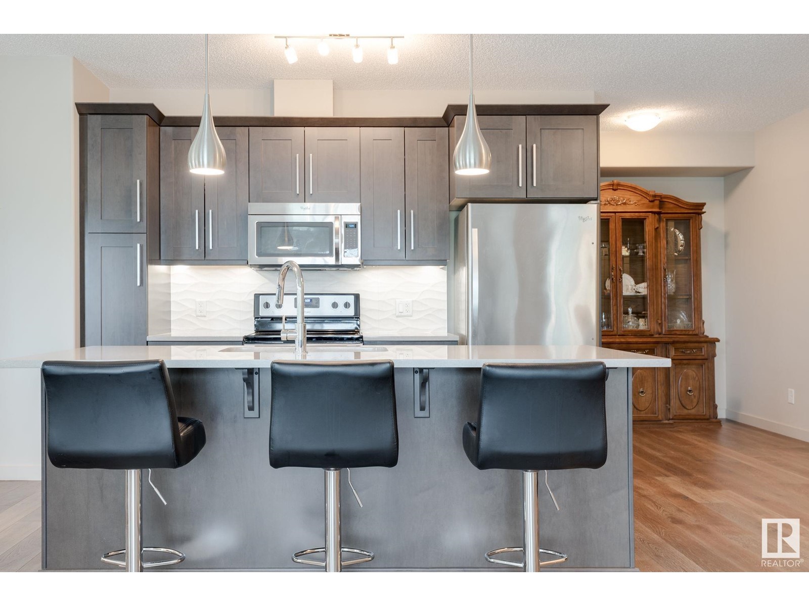 Welcome to this gorgeous, SOUTH FACING, CORNER UNIT, two-bedroom condo with A/C in the neighborhood of Griesbach! Entering you will be blown away by the quality finishing throughout. Pristine hardwood flooring showcases the open concept living area. The kitchen shows elegantly with ample rich-toned cabinetry, stainless steel appliances and gleaming stone countertops. Adjacent dining space is perfect for your dinner parties and provides access to a fantastic and private patio with gas hook up. The living room is spacious and bright, the perfect place to entertain family. Primary bedroom is your own personal oasis, featuring a walk-through closet and 3-piece en suite. The second bedroom is spacious and has a 4pc bathroom right outside its door. ADDITIONAL FEATURES: In-suite laundry, a den/office space, upgraded countertops throughout, TWO TITLED UNDERGROUND PARKING STALLS, also separate large storage cage. Fitness facility and social room in the building. Close to amenities within steps of the building! (id:22211)