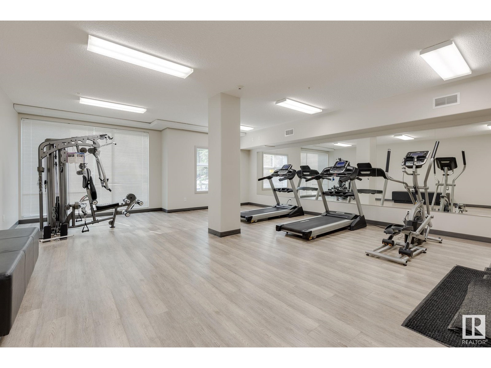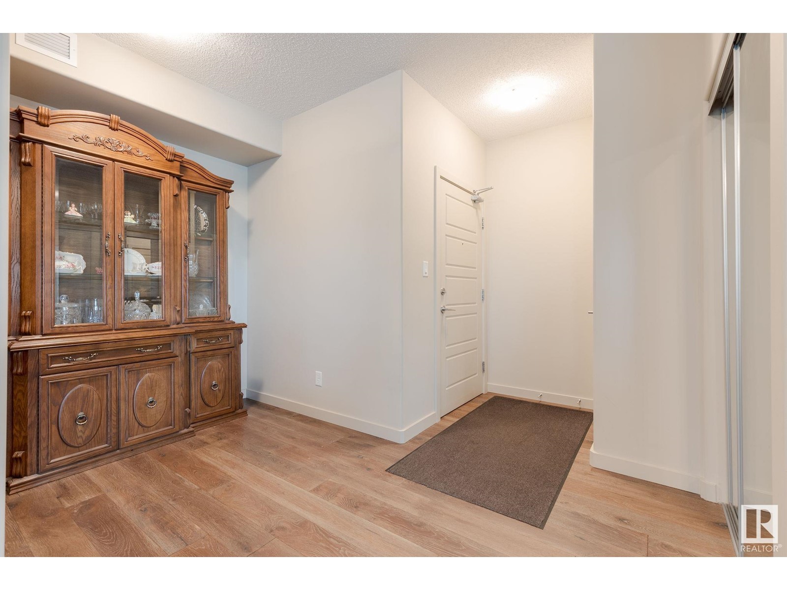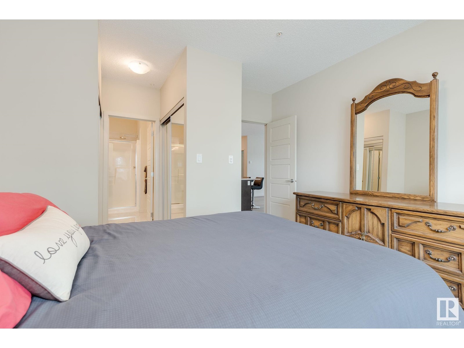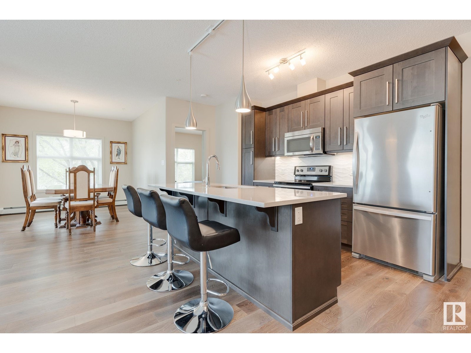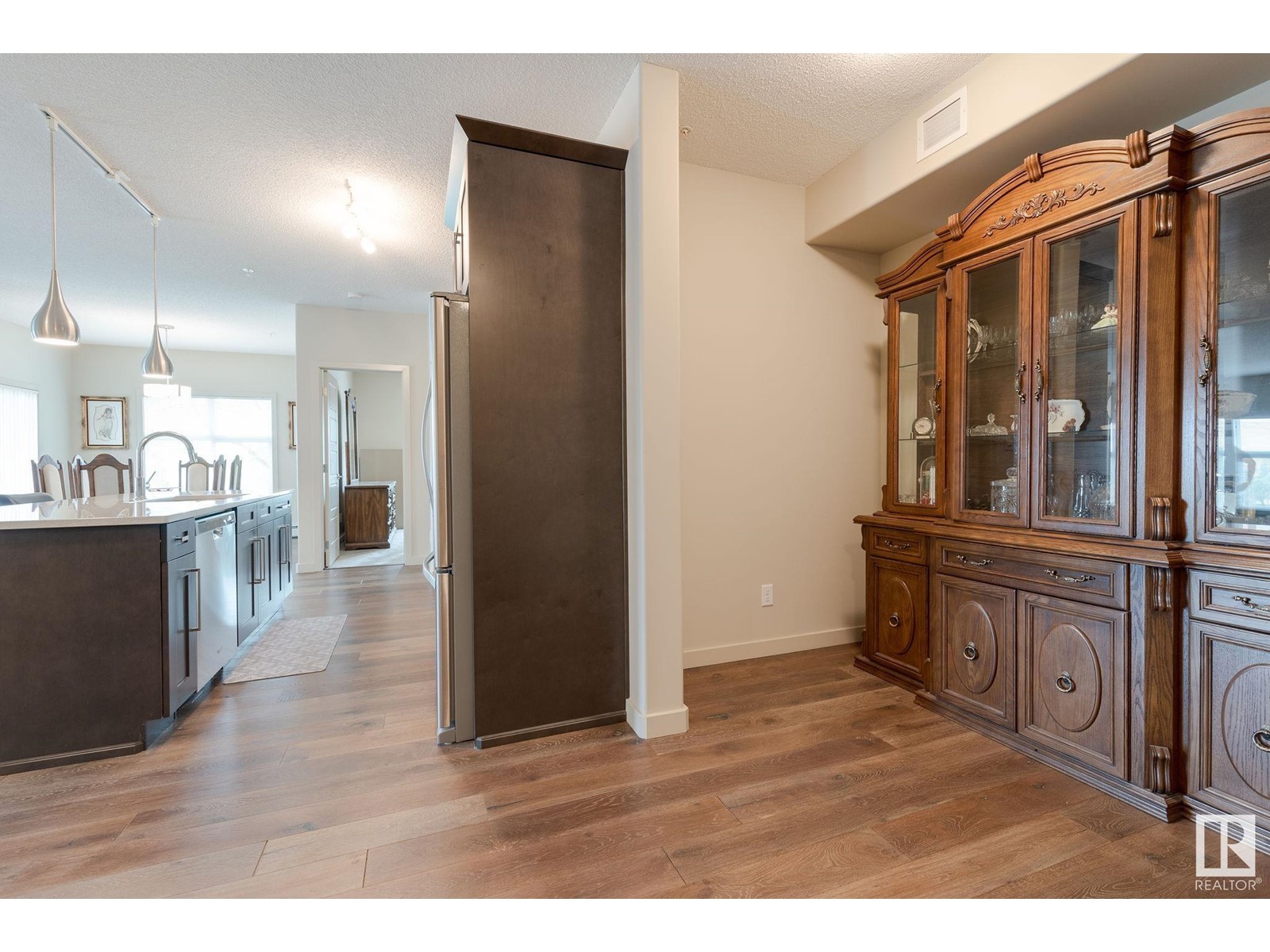 Welcome to this gorgeous, SOUTH FACING, CORNER UNIT, two-bedroom condo with A/C in the neighborhood of Griesbach! Entering you will be blown away by the quality finishing throughout. Pristine hardwood flooring showcases the open concept living area. The kitchen shows elegantly with ample rich-toned cabinetry, stainless steel appliances and gleaming stone countertops. Adjacent dining space is perfect for your dinner parties and provides access to a fantastic and private patio with gas hook up. The living room is spacious and bright, the perfect place to entertain family. Primary bedroom is your own personal oasis, featuring a walk-through closet and 3-piece en suite. The second bedroom is spacious and has a 4pc bathroom right outside its door. ADDITIONAL FEATURES: In-suite laundry, a den/office space, upgraded countertops throughout, TWO TITLED UNDERGROUND PARKING STALLS, also separate large storage cage. Fitness facility and social room in the building. Close to amenities within steps of the building! (id:22211)