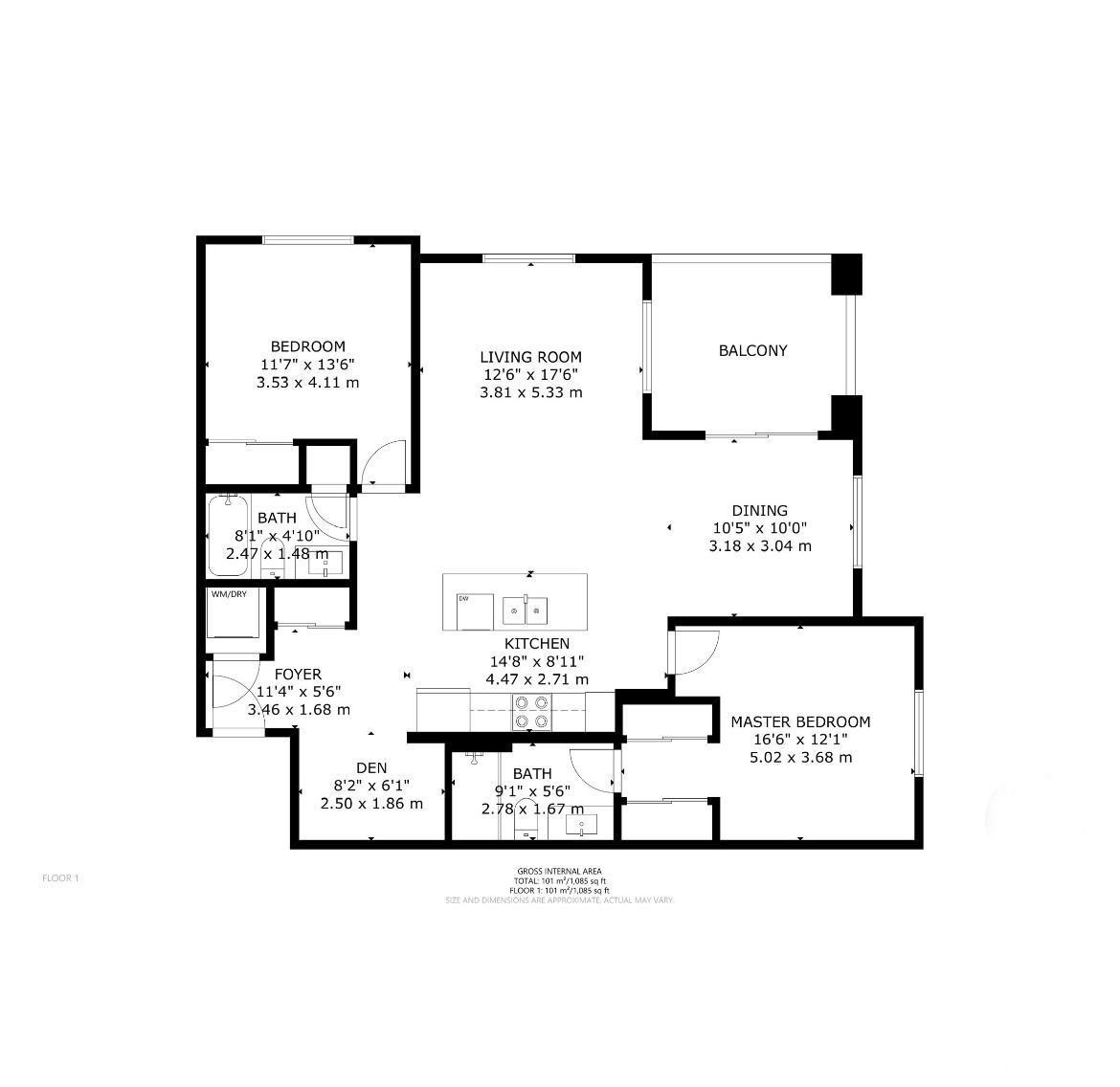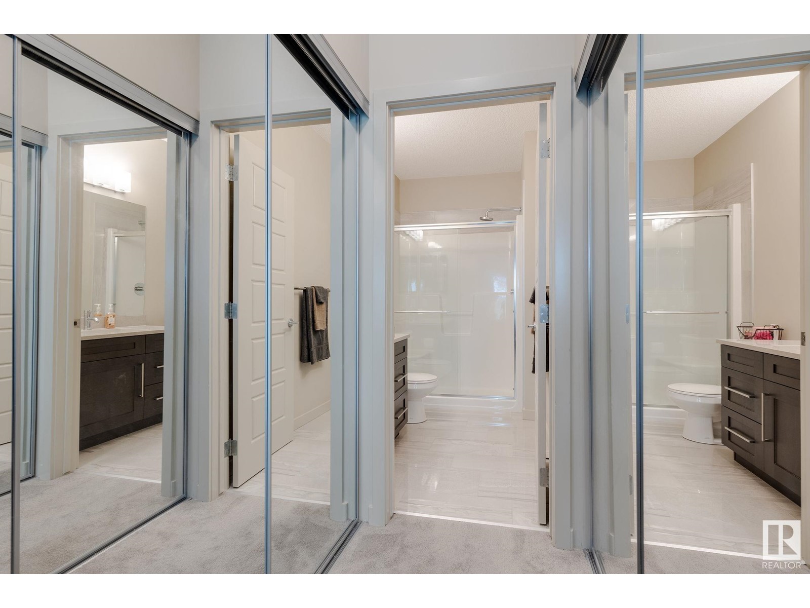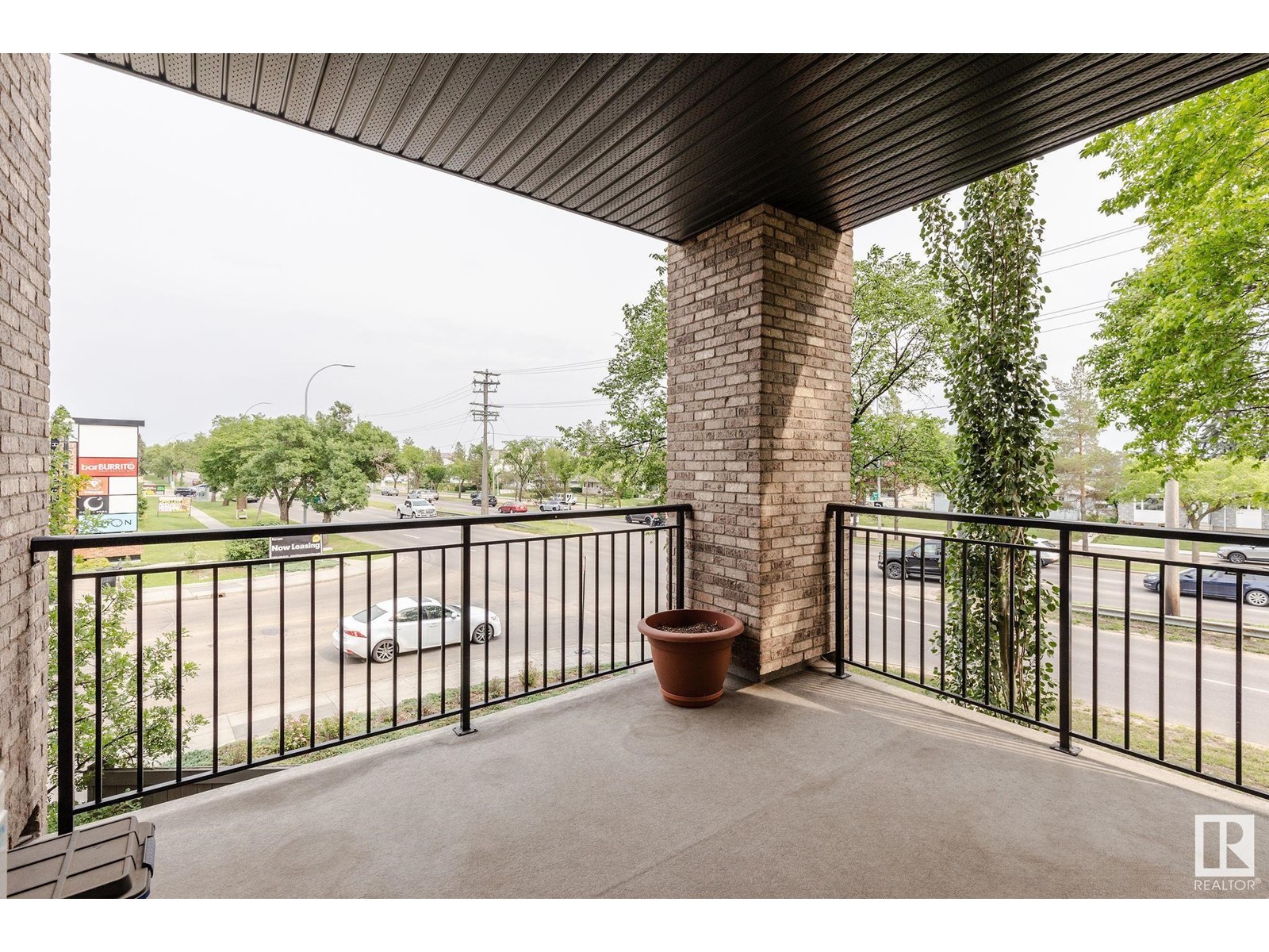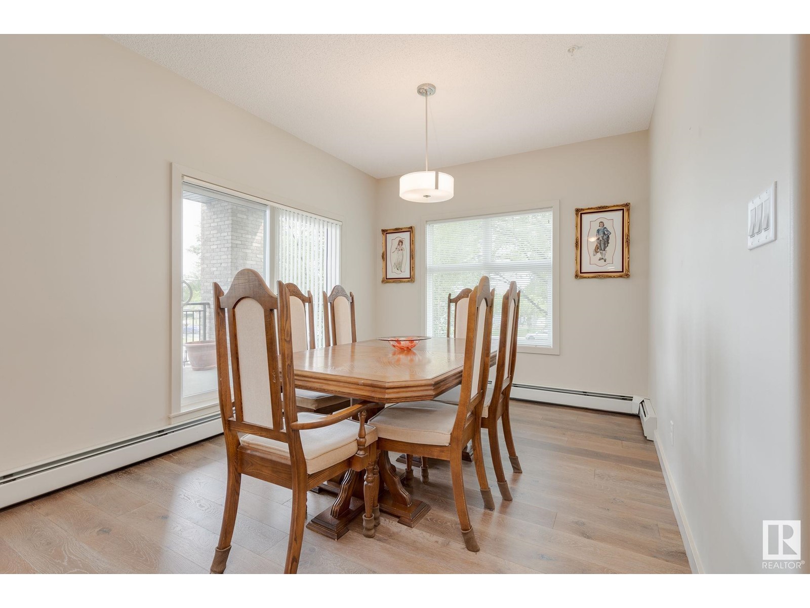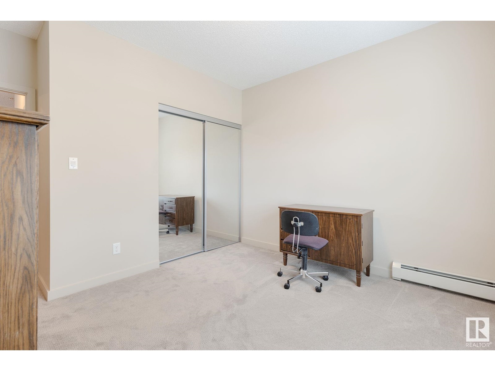 Welcome to this gorgeous, SOUTH FACING, CORNER UNIT, two-bedroom condo with A/C in the neighborhood of Griesbach! Entering you will be blown away by the quality finishing throughout. Pristine hardwood flooring showcases the open concept living area. The kitchen shows elegantly with ample rich-toned cabinetry, stainless steel appliances and gleaming stone countertops. Adjacent dining space is perfect for your dinner parties and provides access to a fantastic and private patio with gas hook up. The living room is spacious and bright, the perfect place to entertain family. Primary bedroom is your own personal oasis, featuring a walk-through closet and 3-piece en suite. The second bedroom is spacious and has a 4pc bathroom right outside its door. ADDITIONAL FEATURES: In-suite laundry, a den/office space, upgraded countertops throughout, TWO TITLED UNDERGROUND PARKING STALLS, also separate large storage cage. Fitness facility and social room in the building. Close to amenities within steps of the building! (id:22211)