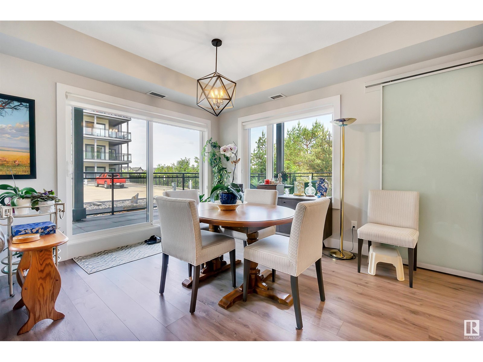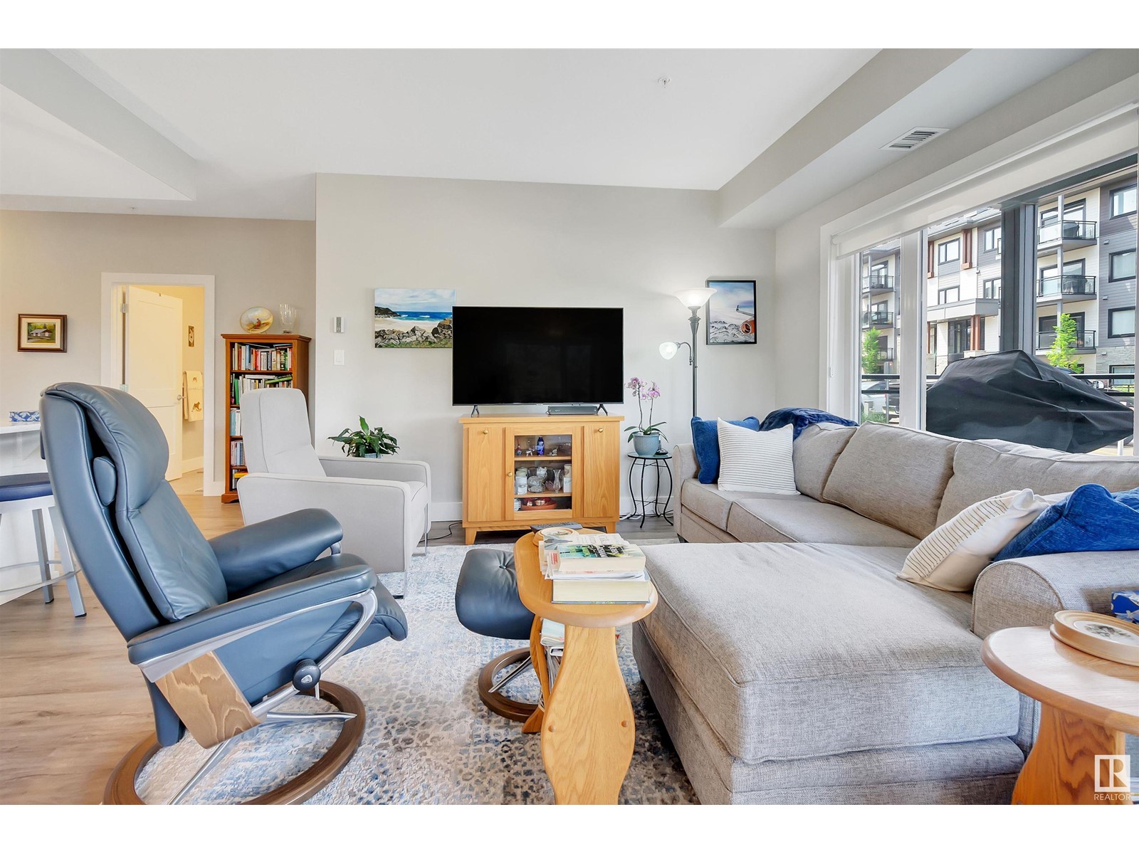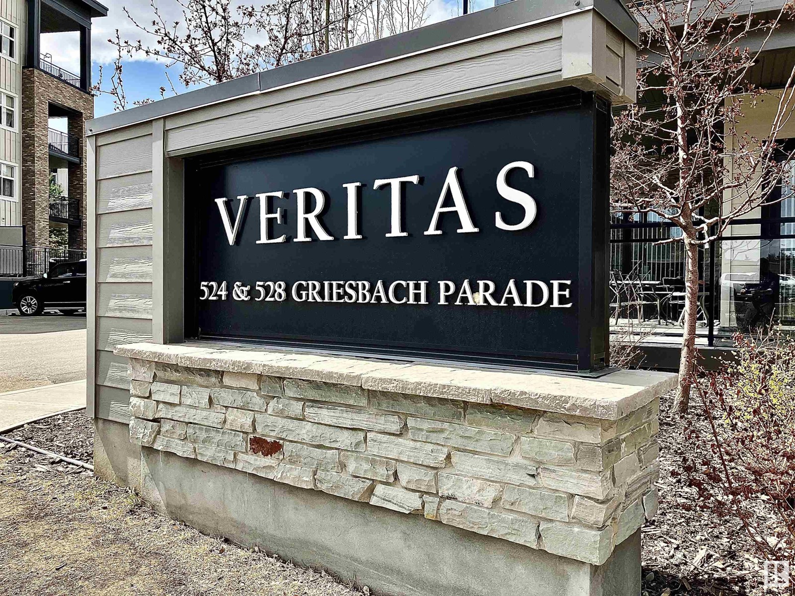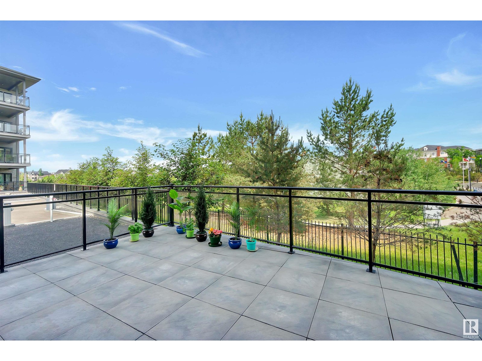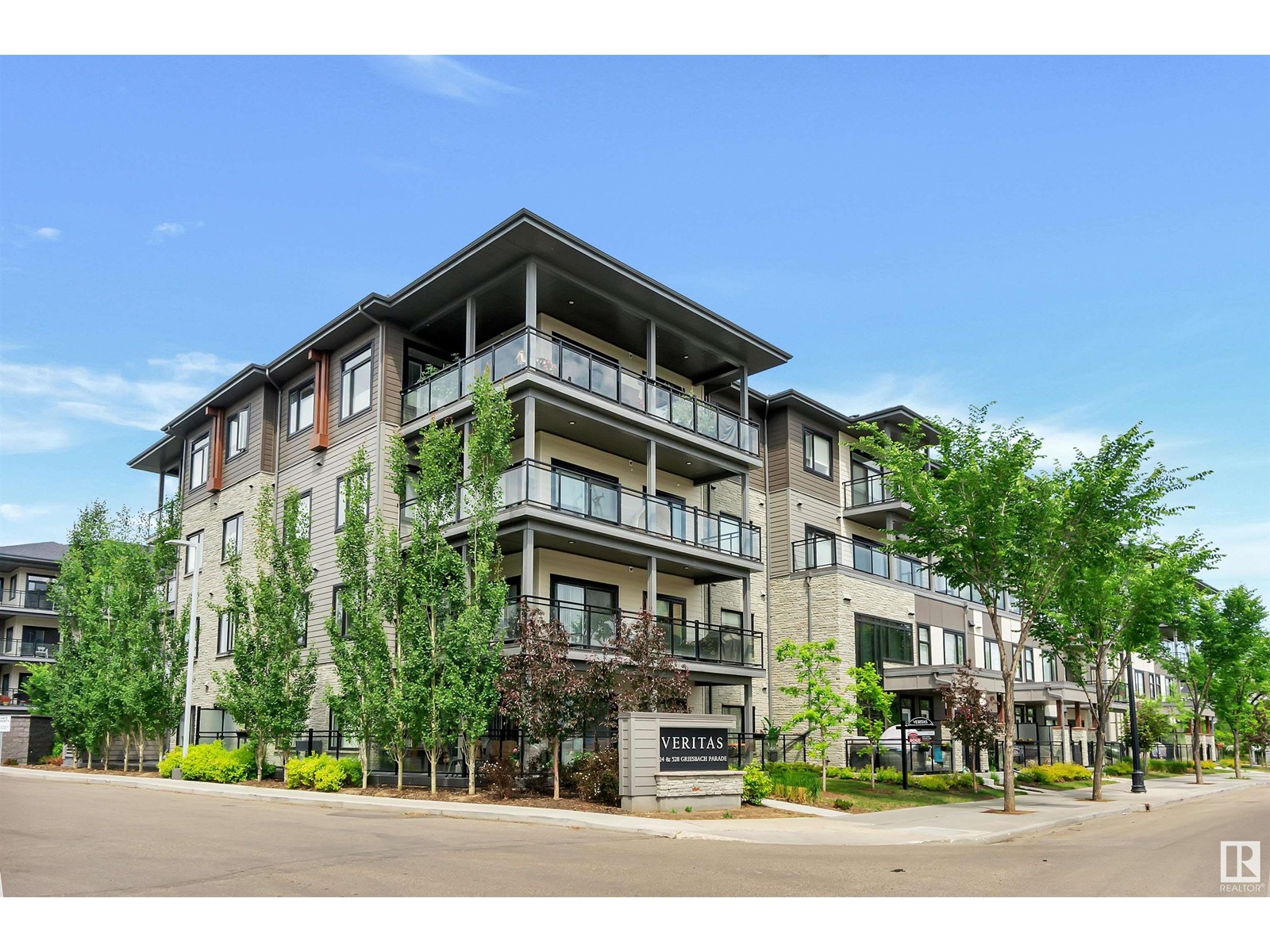 Veritas is an extraordinary newer condo project overlooking Patricia Lake and the Cultural Amphitheatre. This location is rich in amenities and history, featuring an abundance of walking trails and lakes, a 24-acre central park, and an urban village home to new restaurants and retail stores. You will be delighted when you see this 1346sf main floor unit. It is bright, open, modern and meticulously cared for! There are two bedrooms, den/flex room, 4 pc guest bath, and full laundry room. High end finishes throughout including luxury vinyl plank, upgraded light fixtures, quartz countertops, and stainless steel appliances. The primary bedroom is spacious and has an attached 4 pc ensuite. The unit comes with 2 titled parking stalls (one underground/with storage cage and another surface spot). The massive patio (292sf) is a great place to relax, and unwind. Did I mention central AC, fitness center, social room and guest suite included? Great unit for pet owners and those with mobility challenges. Welcome home. (id:22211)