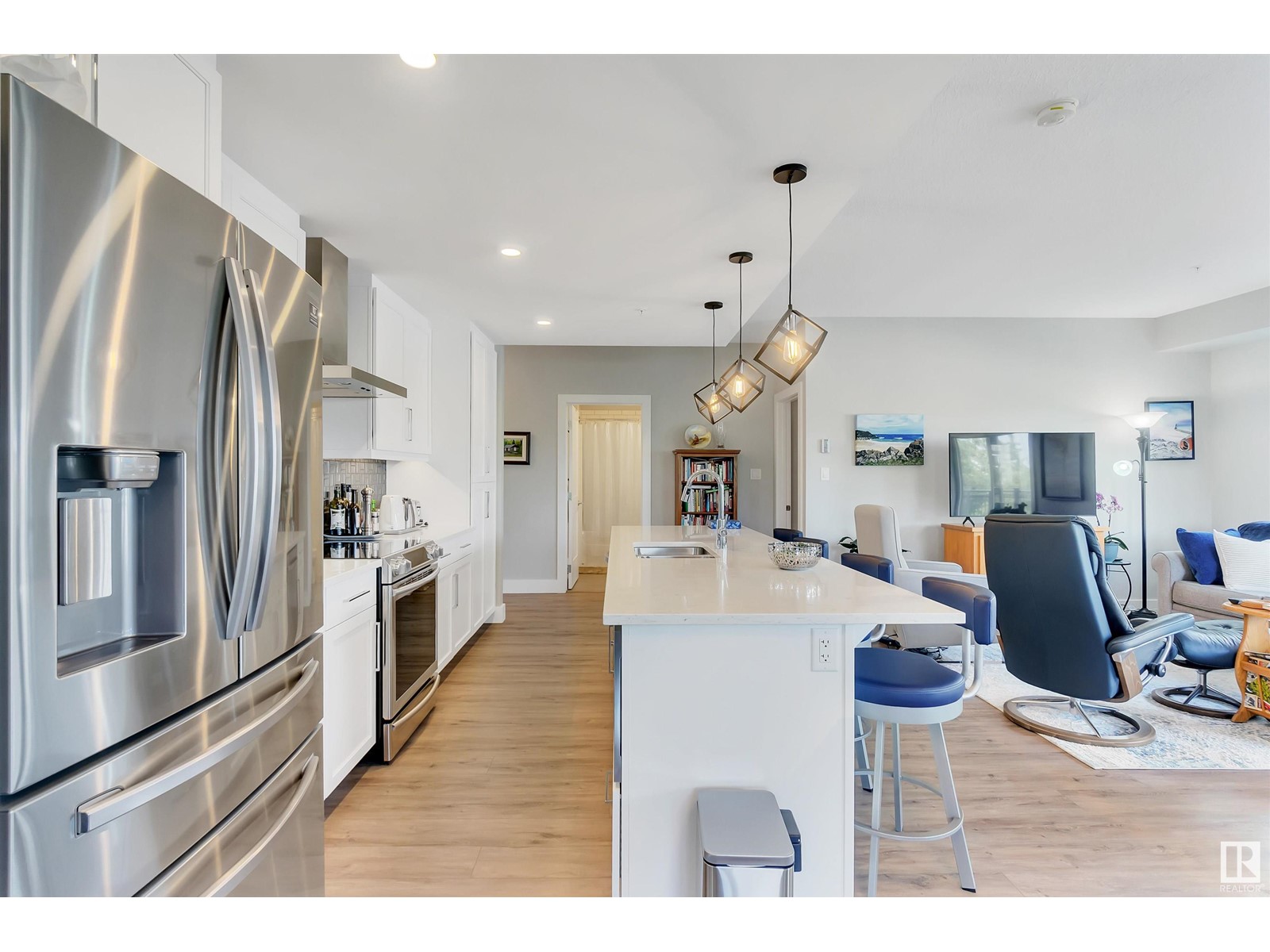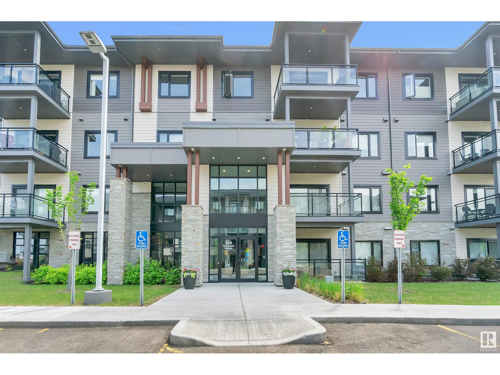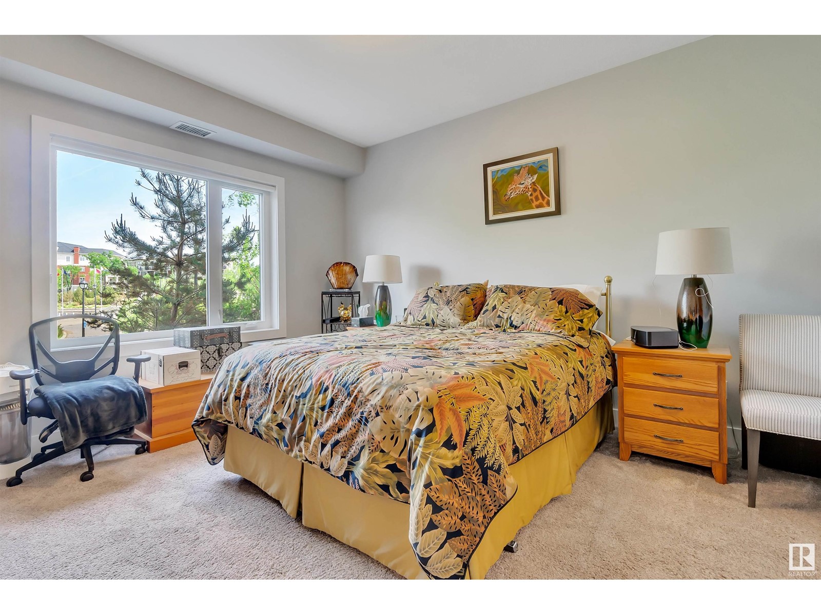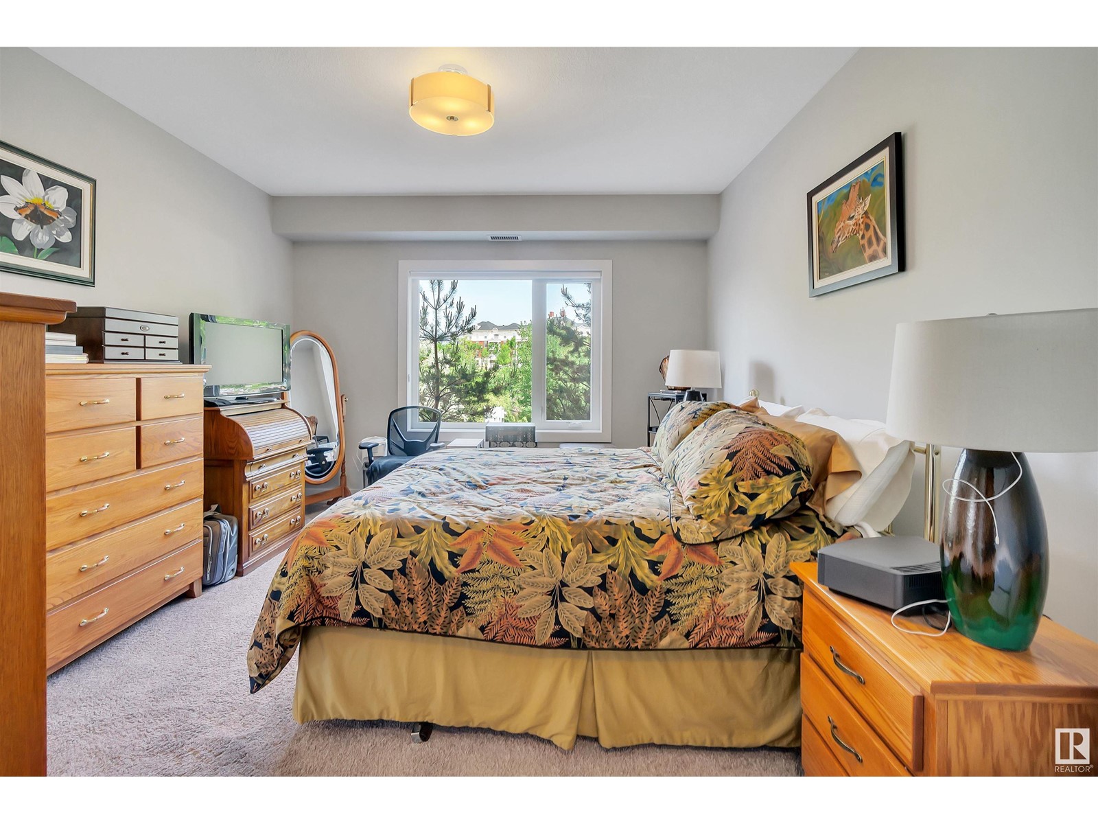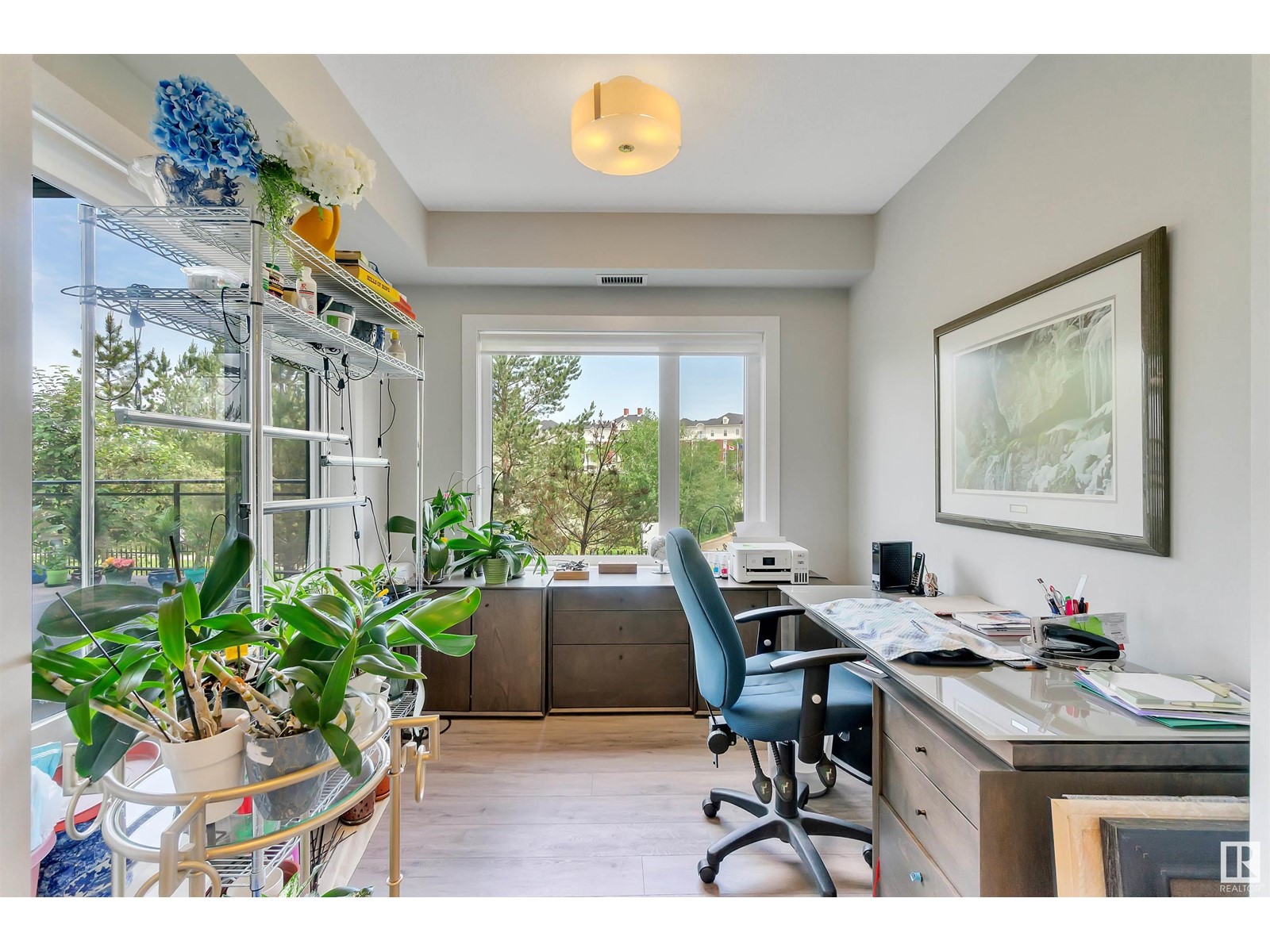 Veritas is an extraordinary newer condo project overlooking Patricia Lake and the Cultural Amphitheatre. This location is rich in amenities and history, featuring an abundance of walking trails and lakes, a 24-acre central park, and an urban village home to new restaurants and retail stores. You will be delighted when you see this 1346sf main floor unit. It is bright, open, modern and meticulously cared for! There are two bedrooms, den/flex room, 4 pc guest bath, and full laundry room. High end finishes throughout including luxury vinyl plank, upgraded light fixtures, quartz countertops, and stainless steel appliances. The primary bedroom is spacious and has an attached 4 pc ensuite. The unit comes with 2 titled parking stalls (one underground/with storage cage and another surface spot). The massive patio (292sf) is a great place to relax, and unwind. Did I mention central AC, fitness center, social room and guest suite included? Great unit for pet owners and those with mobility challenges. Welcome home. (id:22211)