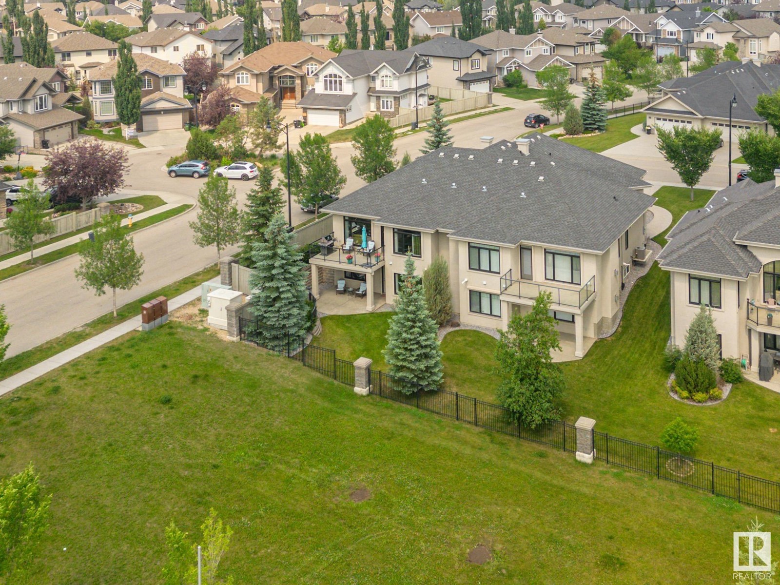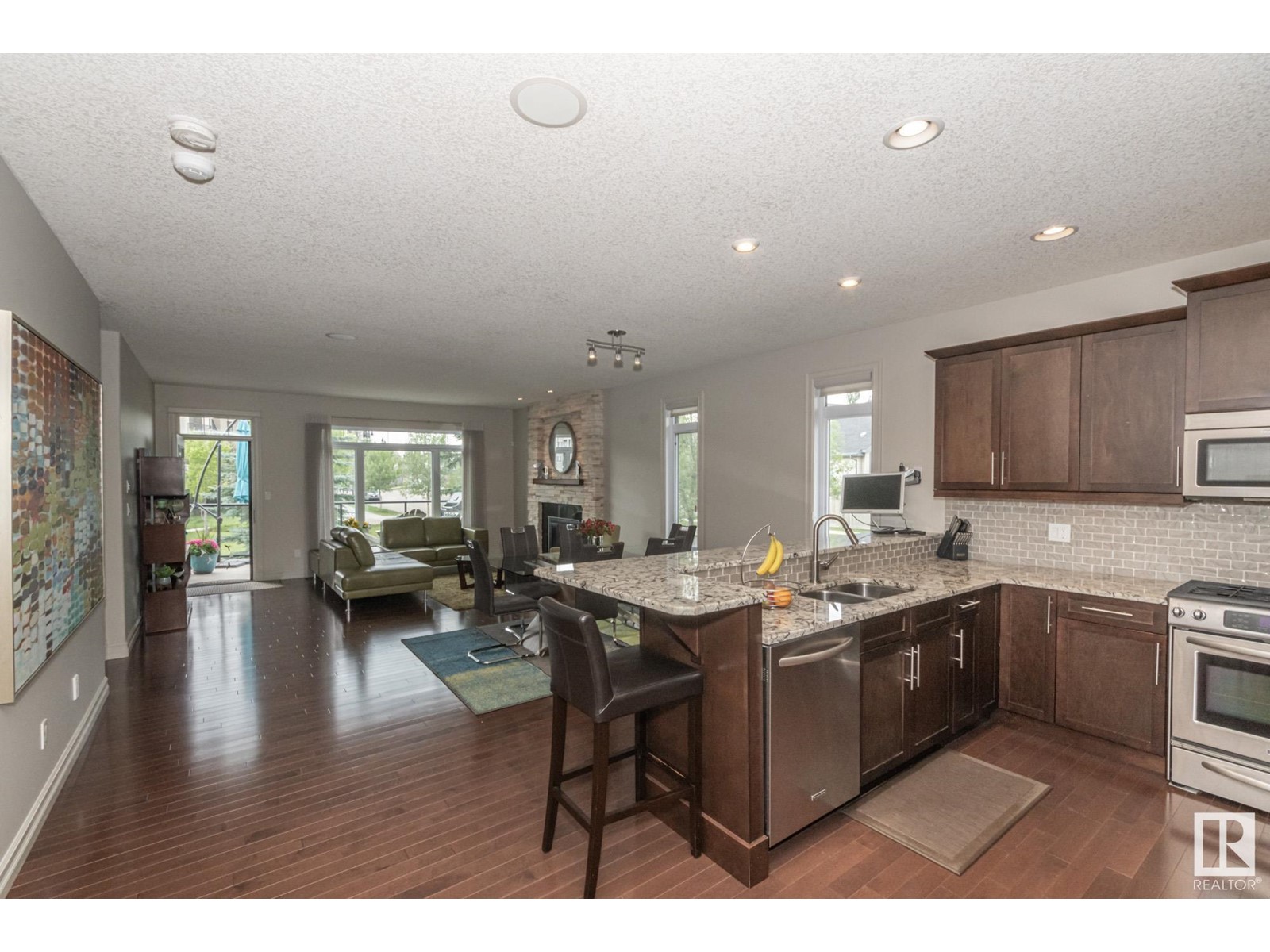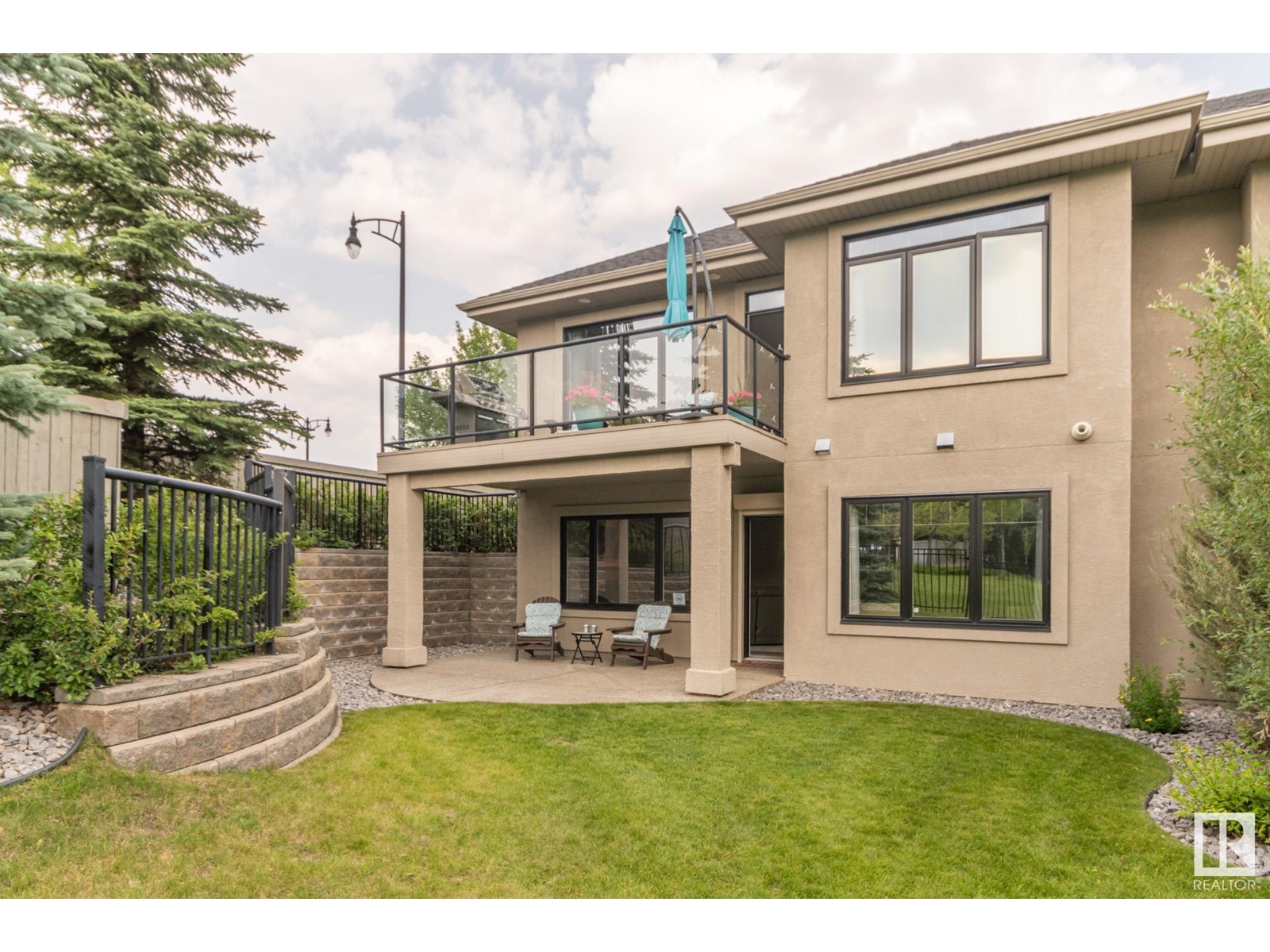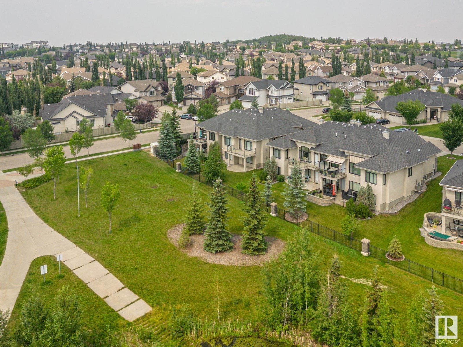 Welcome to the highly sought after MacTaggart Manors; lovely half duplex bungalow located in a quiet cul de sac backing onto MacTaggart pond, park & connecting trails. Great view. Quality finishing by Managen: over 2900 sq ft of total living area with high ceilings, hardwood floors, granite counters, gourmet kitchen with gas stove & walk-in pantry, & many upgrades throughout. Main floor with open plan includes large master bedroom with ensuite bathroom, an office [or bedroom] near the front entry, laundry & private deck off the living room. Walkout basement is fully finished; there's in-floor heating, 2 generous sized bedrooms, spacious family room with wet bar & fireplace, a workout or hobby room, full bathroom. Covered patio in a park-like setting right off the lower living area. Loads of storage cupboards. Extras are: gas BBQ hook-up, central AC, gas fireplace on each floor, irrigation system, double garage with epoxy floor & a tap. It's like a new home. HOA covers lawn maintenance & snow removal. (id:22211)