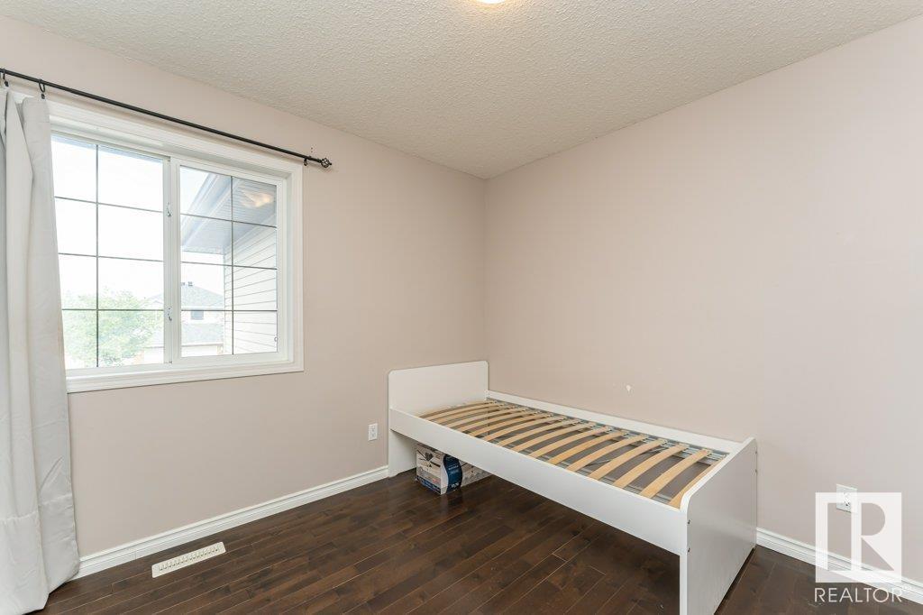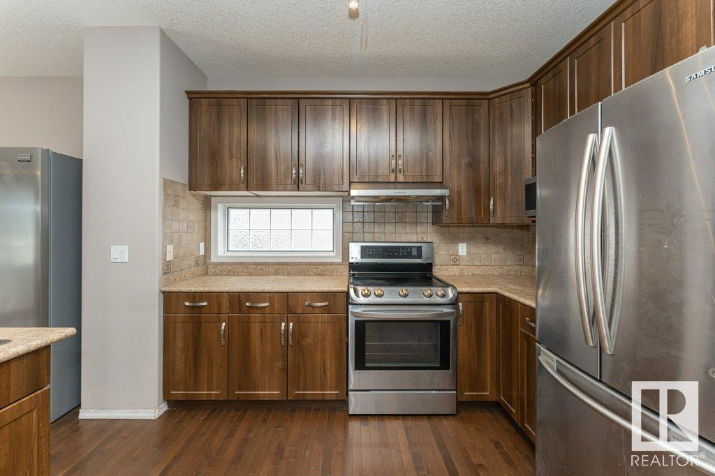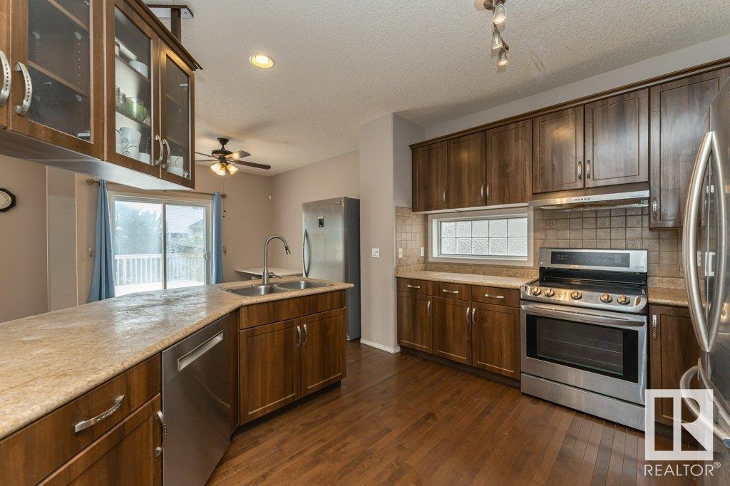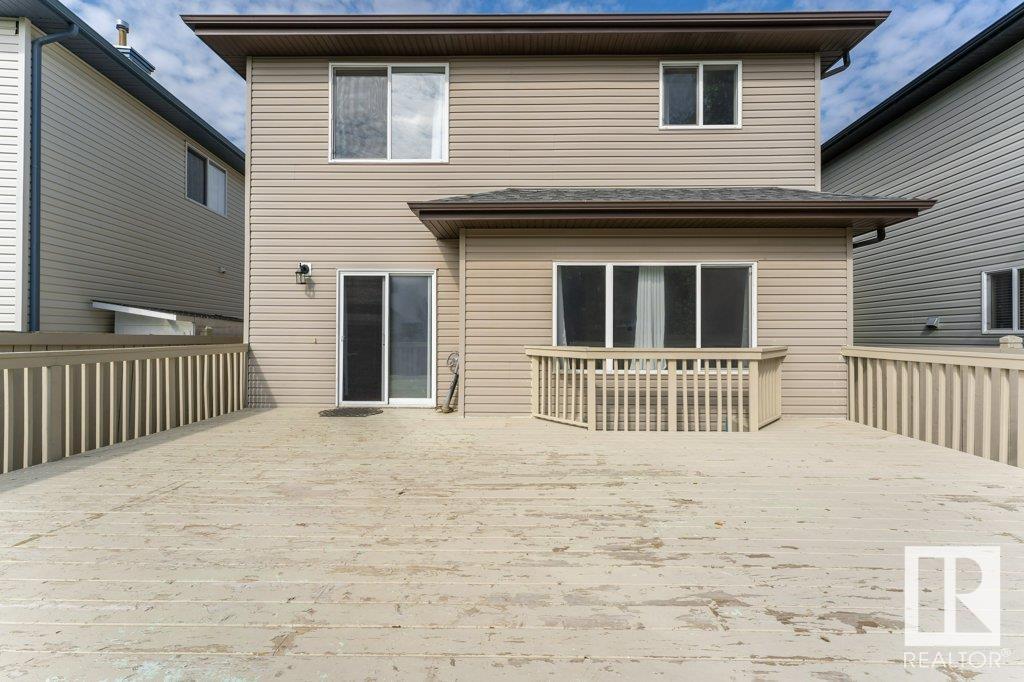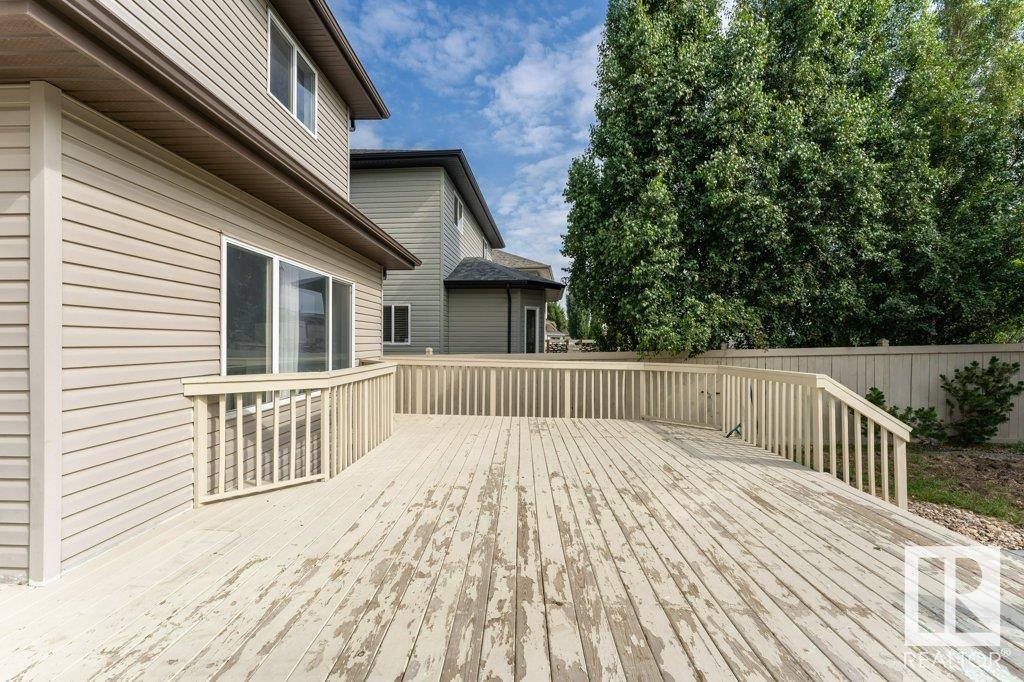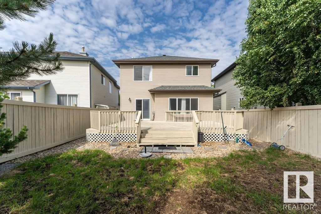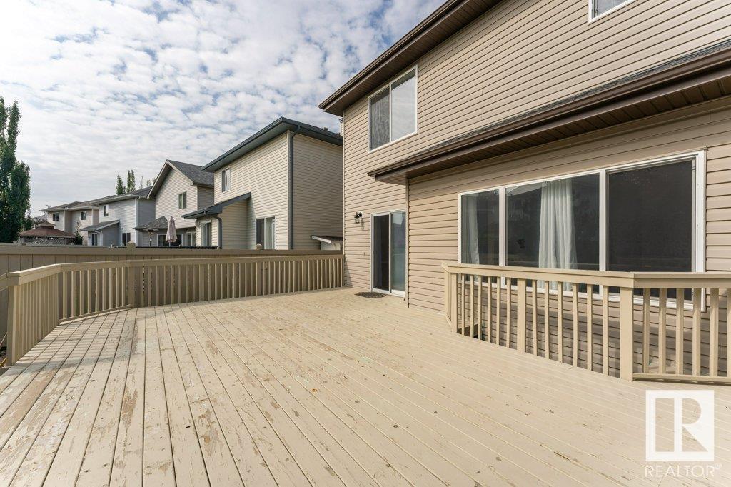 Super location in the highly desirable Leger community. This MacLachlan and Mitchell built home is fully finished and boasts a double front attached garage, 5 bedrooms, 3.5 bathrooms, a large bonus room and walnut hardwood floors throughout the main and upstairs. 17' ceiling front foyer. A sunken living room with a natural gas fireplace. Dark walnut kitchen cabinets with crown moldings. The back yard is fully fenced, very private and features a massive deck off the back of the home with beautiful morning sun and shade in the late afternoon/evening. Recent upgrades include a newer roof, hot water system, dishwasher, washer and dryer. Excellent access to trails and the river valley system, public transportation, shopping, schools and footsteps from the Southwest Edmonton Farmers Market, Terwillegar Community Recreation Centre, Lillian Osborne and Mother Margaret Mary schools. (id:22211)
