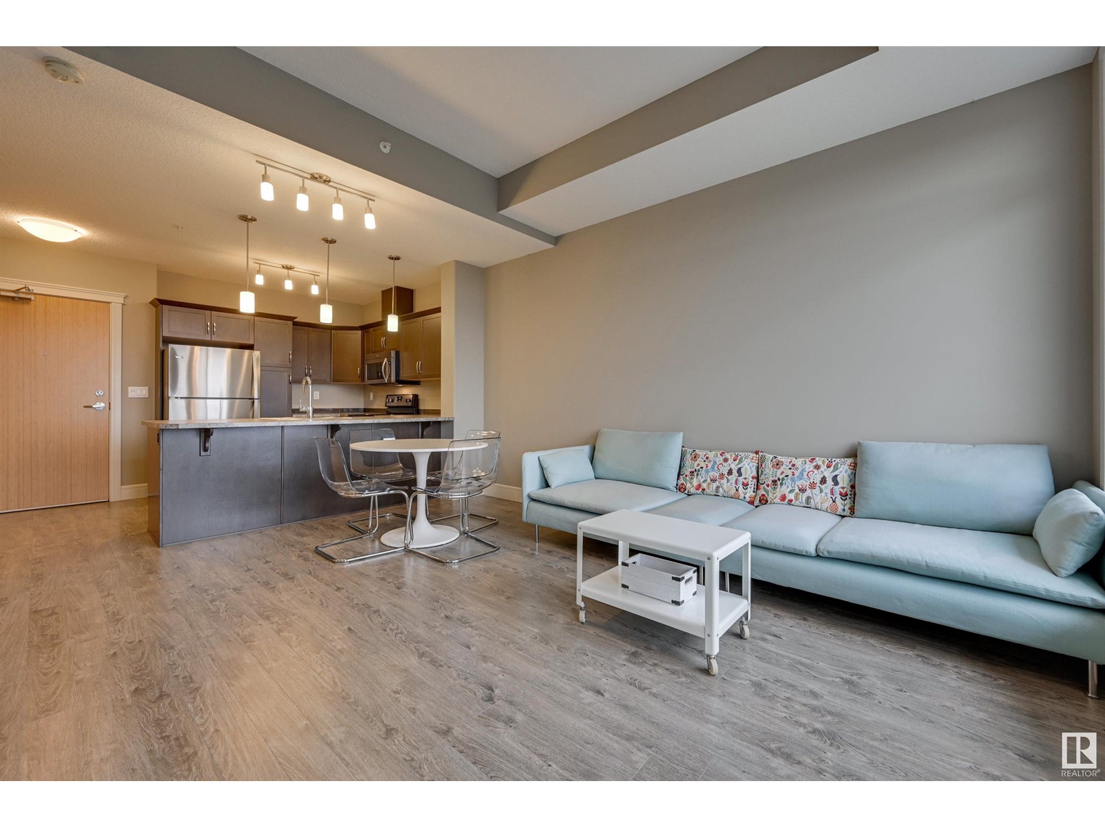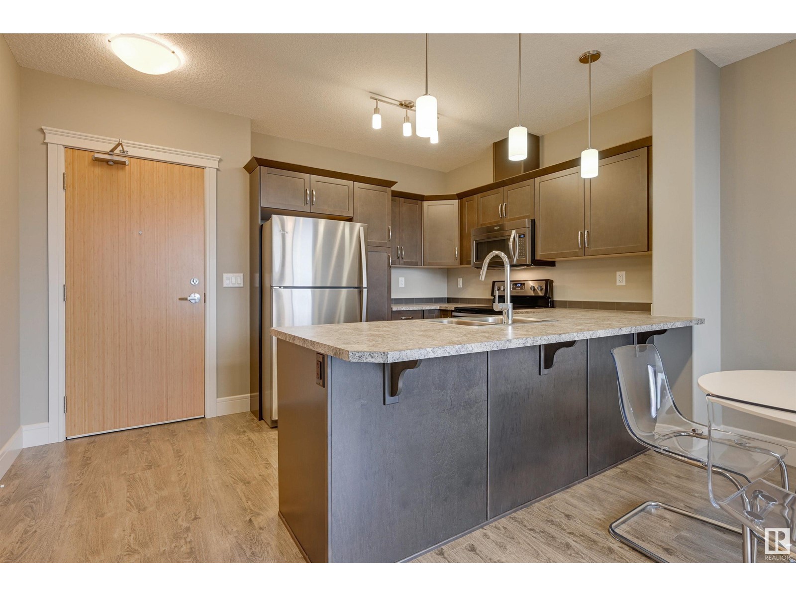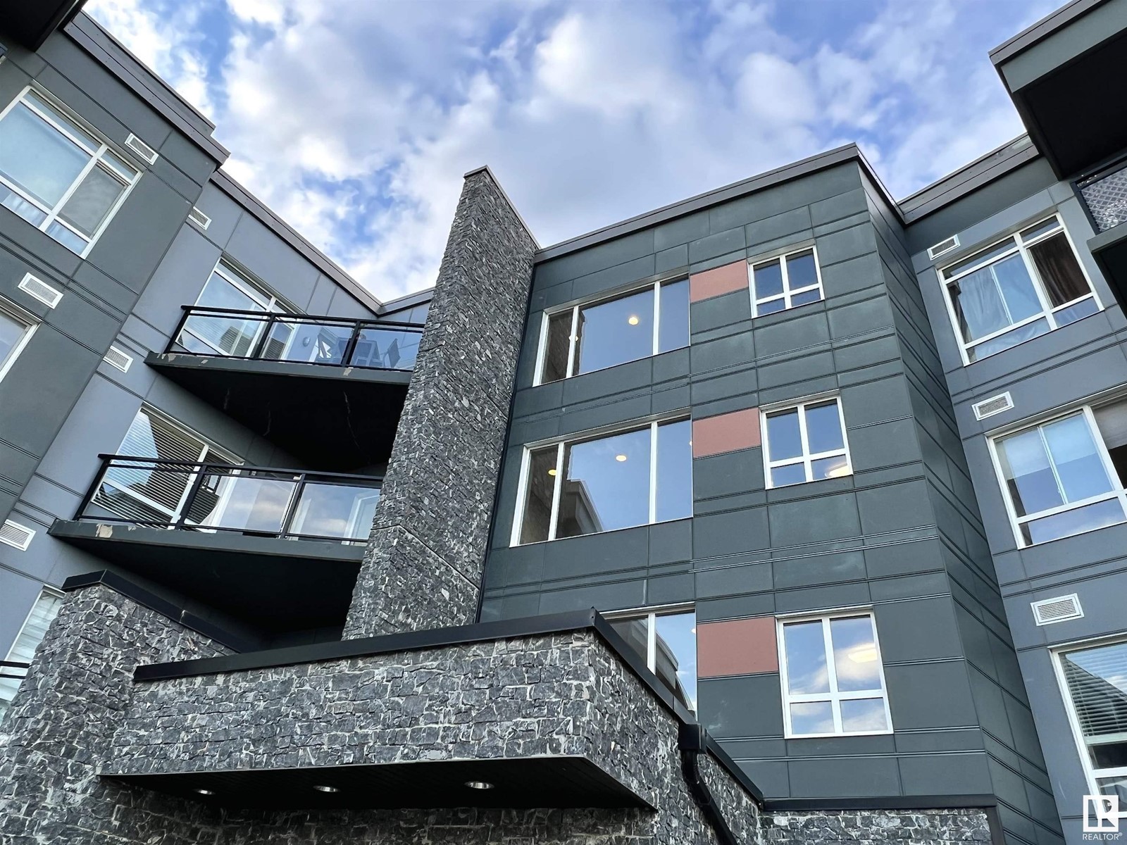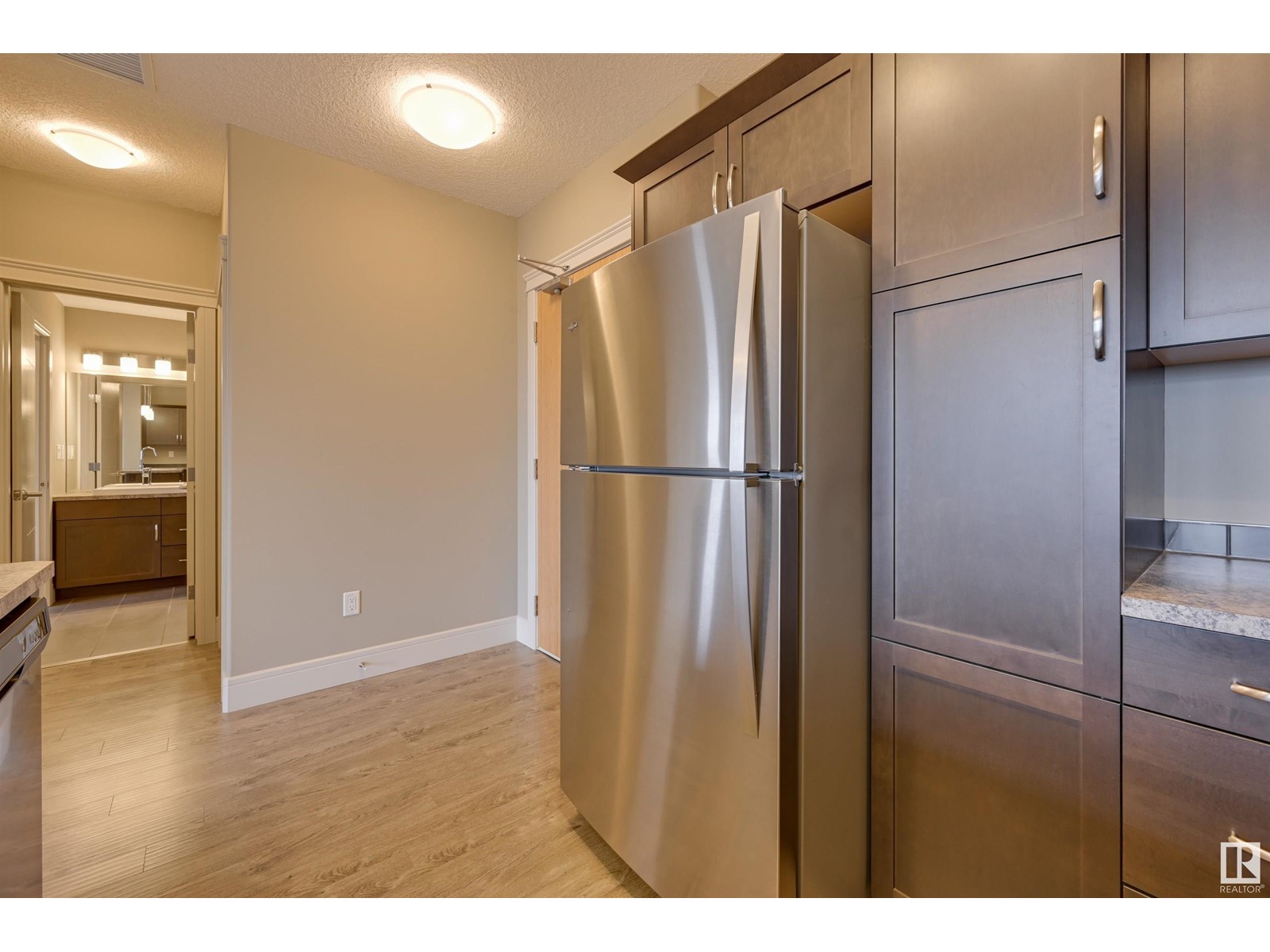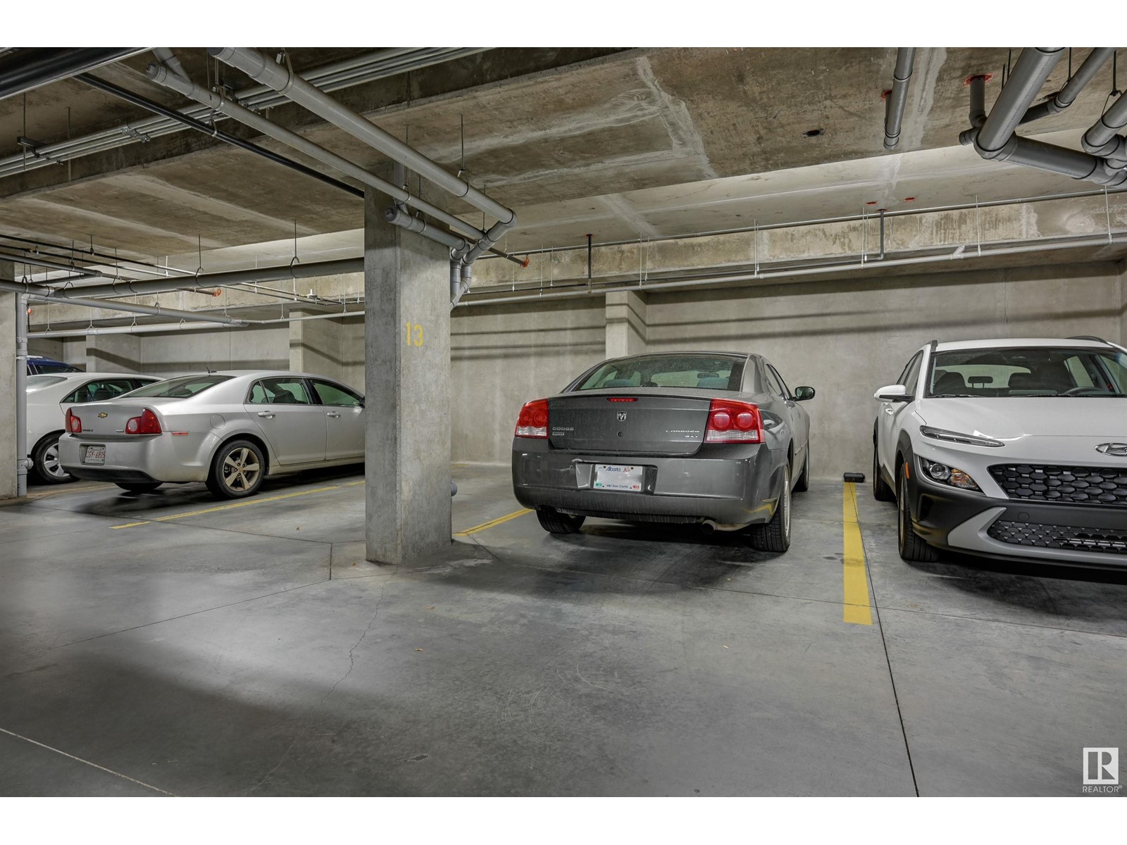 Concrete and Steel with superb style and function in this premium building. Enjoy the higher ceilings and windows in this top floor one bedroom executive home with much to offer including excellent sound proofing. Close to all amenities, with Central Air Conditioning, open plan, in-suite Laundry and plenty of storage, Flooring is durable Laminate throughout with the exception of Tile in the bath. The spacious kitchen offers tall Cabinets, plenty of counter space, and SS Appliances. The abundance of large windows throughout ensures plenty of natural light. The Living room has access to the Balcony which features a Gas Hook up and Tempered Glass Railings. Enjoy the quiet view over the neighborhood, trees, and in the distance the evening illumination of downtown. Topping this is secure underground heated parking. Very reasonable Condo Fees at $334.28. Granville Community provides parks, ponds, schools, walking trails, grocery stores, Costco, and easy access to Henday & Whitemud Drive. Excellent choice. (id:22211)