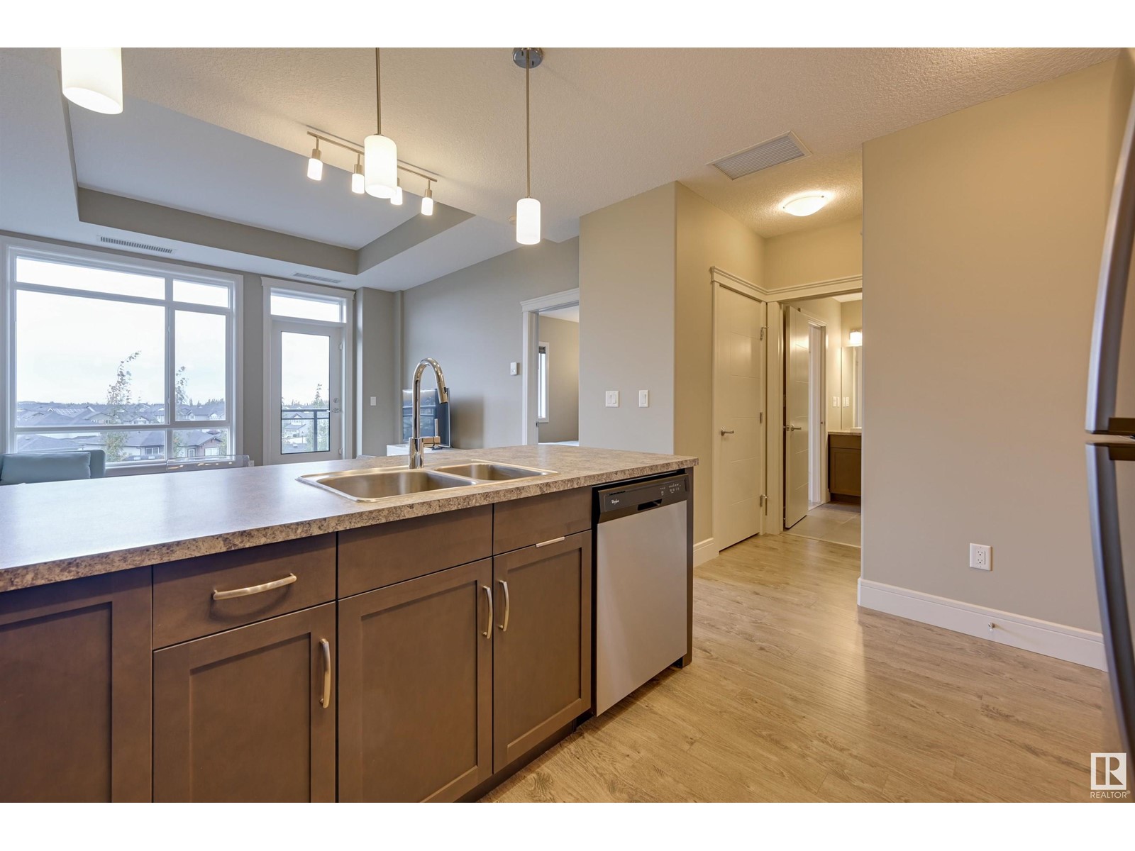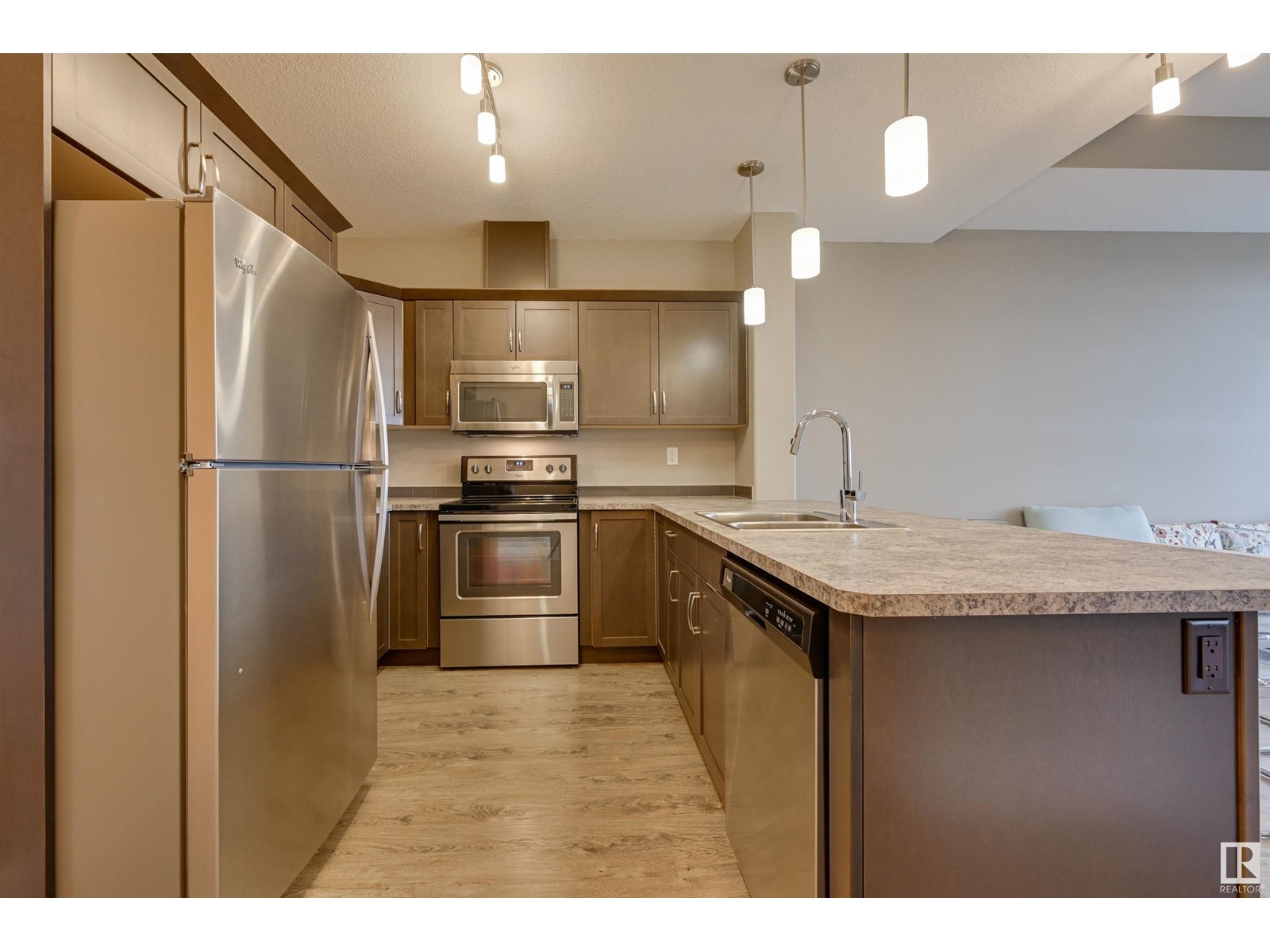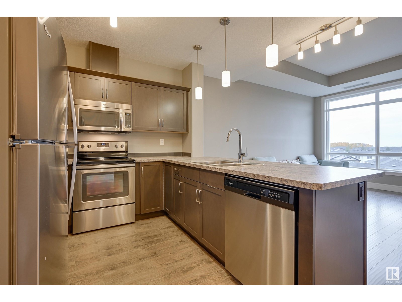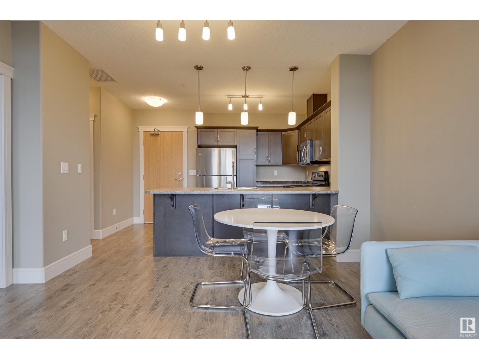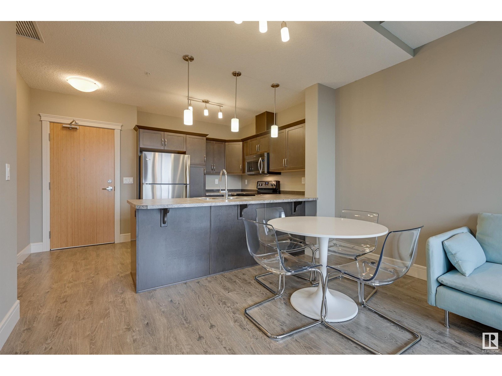 Concrete and Steel with superb style and function in this premium building. Enjoy the higher ceilings and windows in this top floor one bedroom executive home with much to offer including excellent sound proofing. Close to all amenities, with Central Air Conditioning, open plan, in-suite Laundry and plenty of storage, Flooring is durable Laminate throughout with the exception of Tile in the bath. The spacious kitchen offers tall Cabinets, plenty of counter space, and SS Appliances. The abundance of large windows throughout ensures plenty of natural light. The Living room has access to the Balcony which features a Gas Hook up and Tempered Glass Railings. Enjoy the quiet view over the neighborhood, trees, and in the distance the evening illumination of downtown. Topping this is secure underground heated parking. Very reasonable Condo Fees at $334.28. Granville Community provides parks, ponds, schools, walking trails, grocery stores, Costco, and easy access to Henday & Whitemud Drive. Excellent choice. (id:22211)