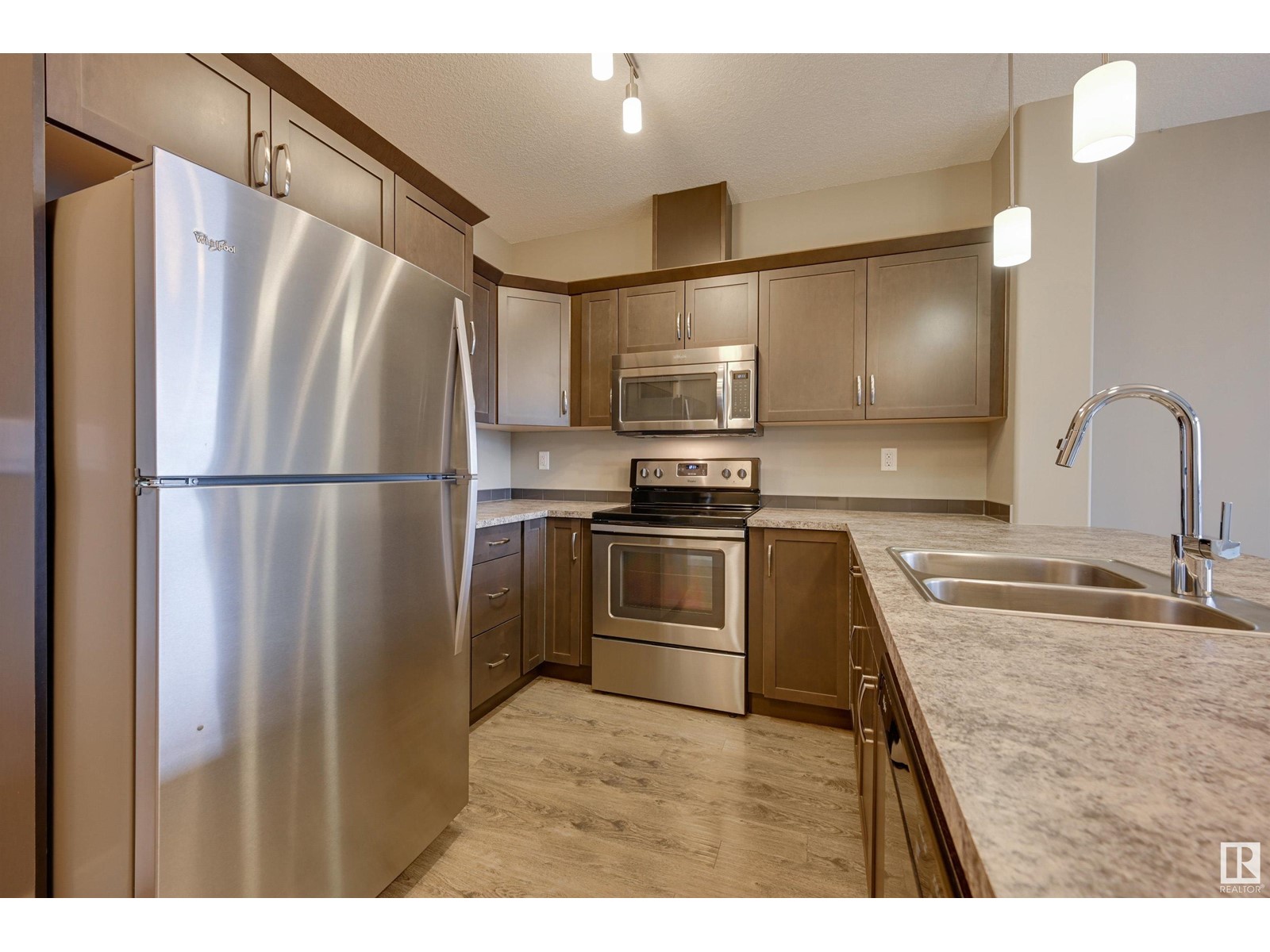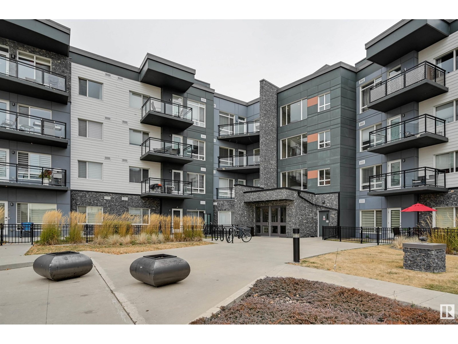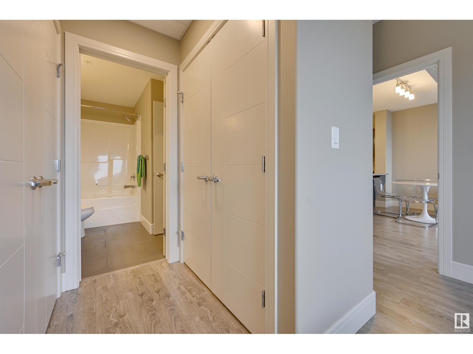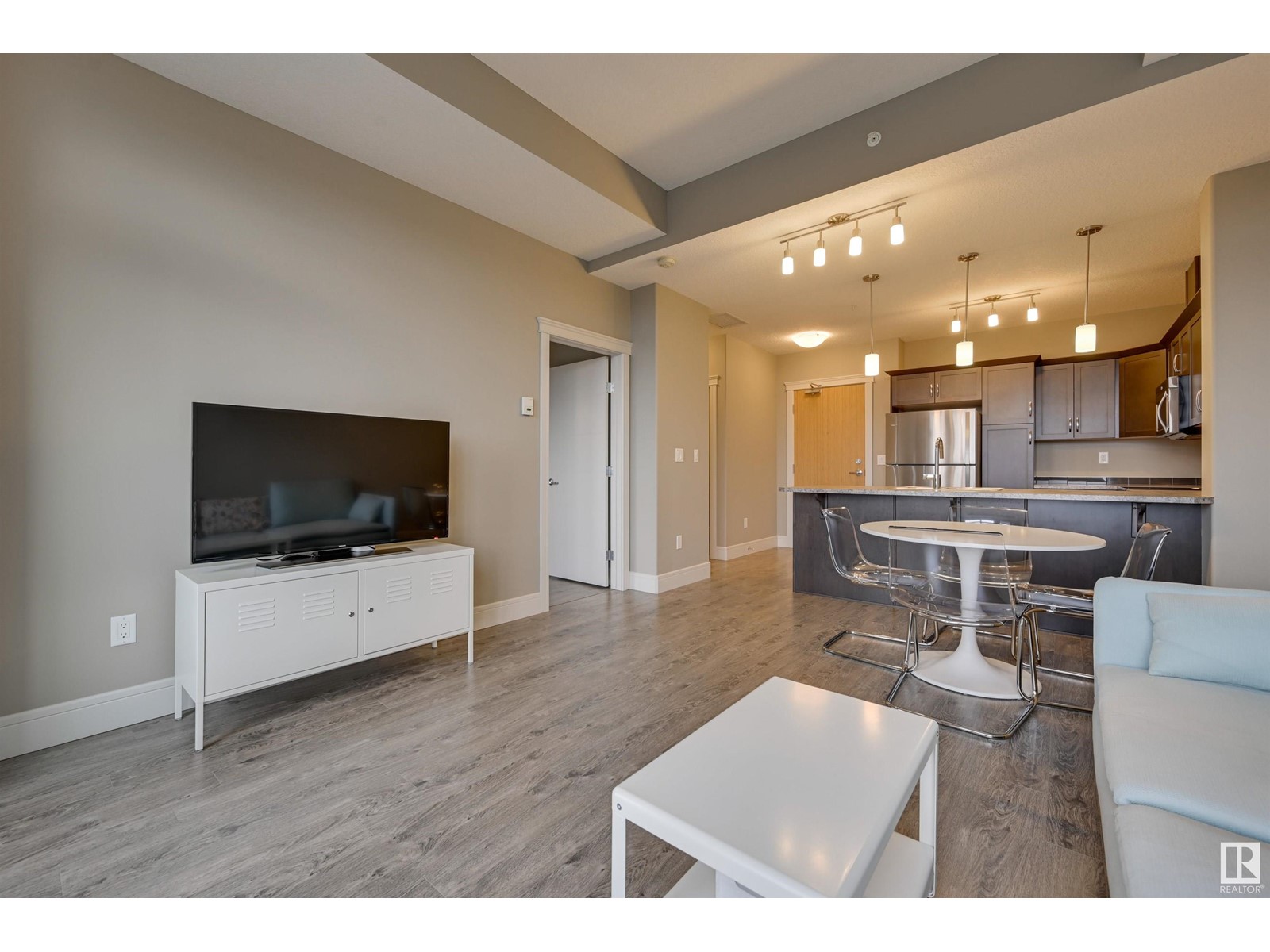 Concrete and Steel with superb style and function in this premium building. Enjoy the higher ceilings and windows in this top floor one bedroom executive home with much to offer including excellent sound proofing. Close to all amenities, with Central Air Conditioning, open plan, in-suite Laundry and plenty of storage, Flooring is durable Laminate throughout with the exception of Tile in the bath. The spacious kitchen offers tall Cabinets, plenty of counter space, and SS Appliances. The abundance of large windows throughout ensures plenty of natural light. The Living room has access to the Balcony which features a Gas Hook up and Tempered Glass Railings. Enjoy the quiet view over the neighborhood, trees, and in the distance the evening illumination of downtown. Topping this is secure underground heated parking. Very reasonable Condo Fees at $334.28. Granville Community provides parks, ponds, schools, walking trails, grocery stores, Costco, and easy access to Henday & Whitemud Drive. Excellent choice. (id:22211)