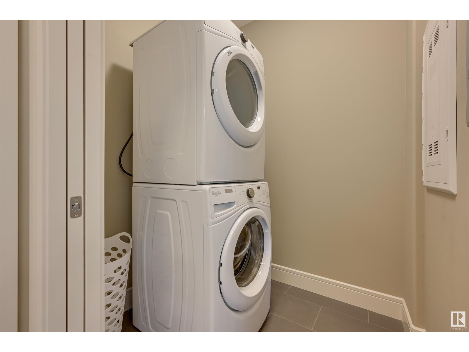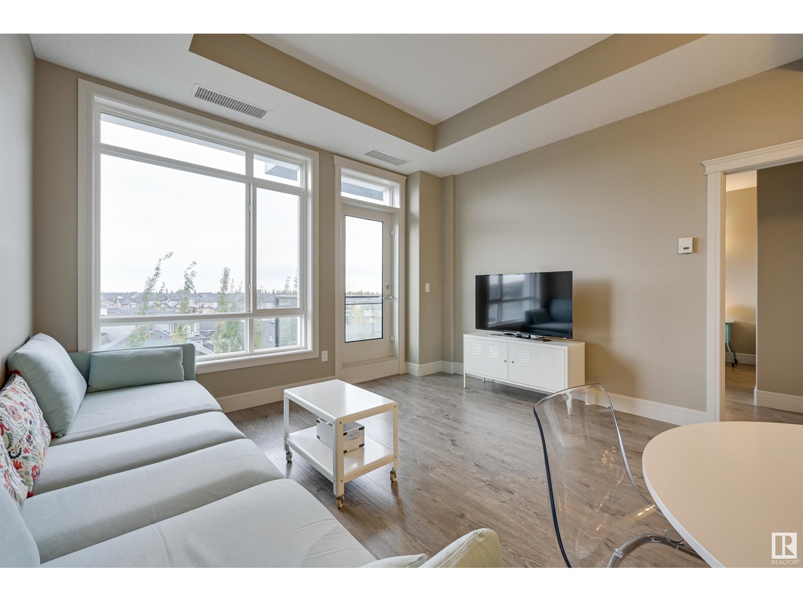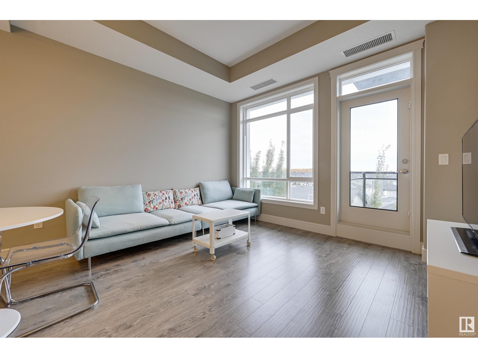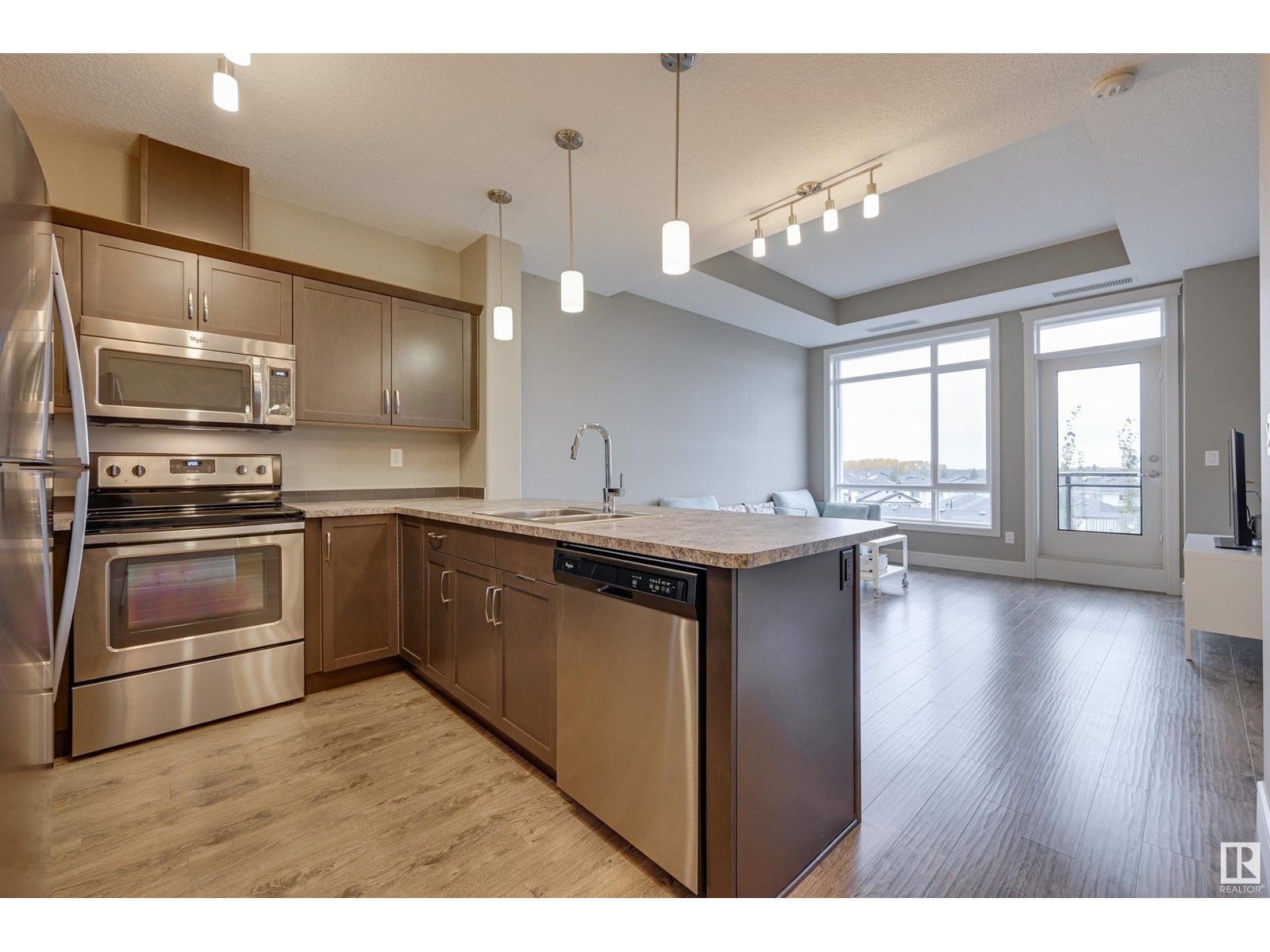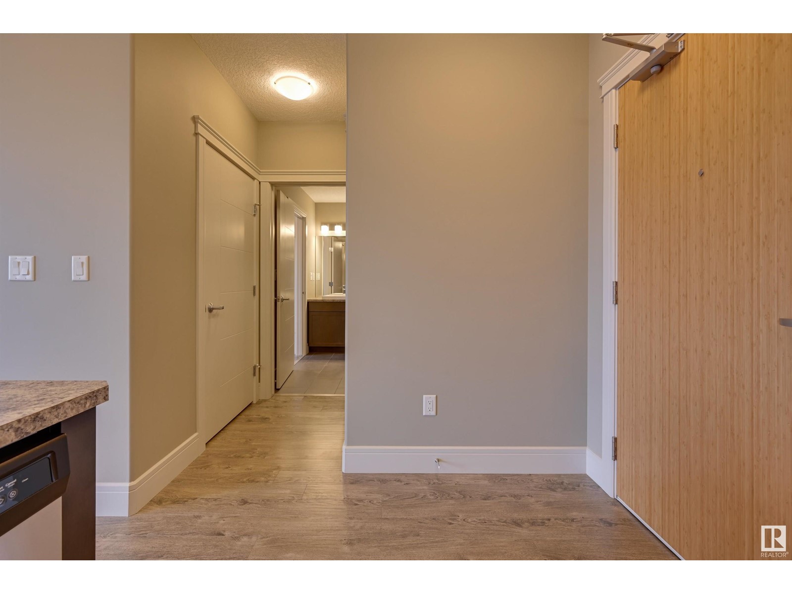 Concrete and Steel with superb style and function in this premium building. Enjoy the higher ceilings and windows in this top floor one bedroom executive home with much to offer including excellent sound proofing. Close to all amenities, with Central Air Conditioning, open plan, in-suite Laundry and plenty of storage, Flooring is durable Laminate throughout with the exception of Tile in the bath. The spacious kitchen offers tall Cabinets, plenty of counter space, and SS Appliances. The abundance of large windows throughout ensures plenty of natural light. The Living room has access to the Balcony which features a Gas Hook up and Tempered Glass Railings. Enjoy the quiet view over the neighborhood, trees, and in the distance the evening illumination of downtown. Topping this is secure underground heated parking. Very reasonable Condo Fees at $334.28. Granville Community provides parks, ponds, schools, walking trails, grocery stores, Costco, and easy access to Henday & Whitemud Drive. Excellent choice. (id:22211)