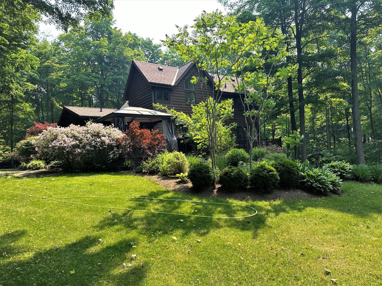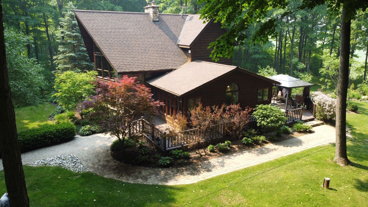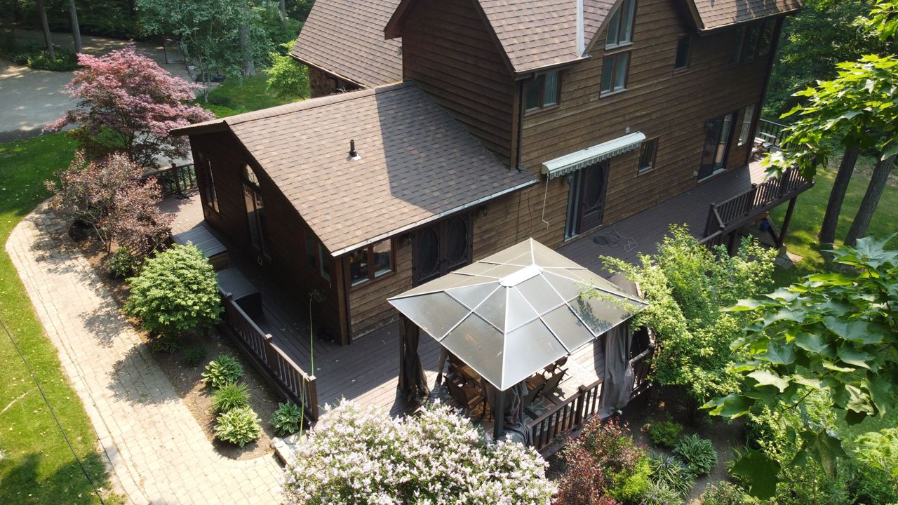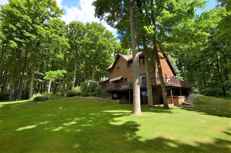 Gorgeous Viceroy Home Nestled In The Trees on the sought after 10th line, With Views That Will Take Your Breath Away. This 3 Bedroom Home Has All The Features You Would Find In The Country Including Hardwood Floors, Eat In Kitchen, Large Island, multiple Walk Outs To Deck, Open Concept Main Area, 21 Foot Ceilings, a stone floor to ceiling Wood Fireplace, Floor To Ceiling Windows, Finished Walkout Basement With Wood Stove, Wrap Around Porch, Hot Tub, Long Winding paved Drive Way That Leads To This Beautiful Home On Just Under 2 Acres. follow the trail to see the firepit at the edge of the property and sit back and unwind and slow down your pace.This is one of the most desirable roads to to call home in the area. Home has a great layout and anywhere you stand, you can see nature, trees and views that seem to go on forever. garden shed and storage tent to house any of your toys.