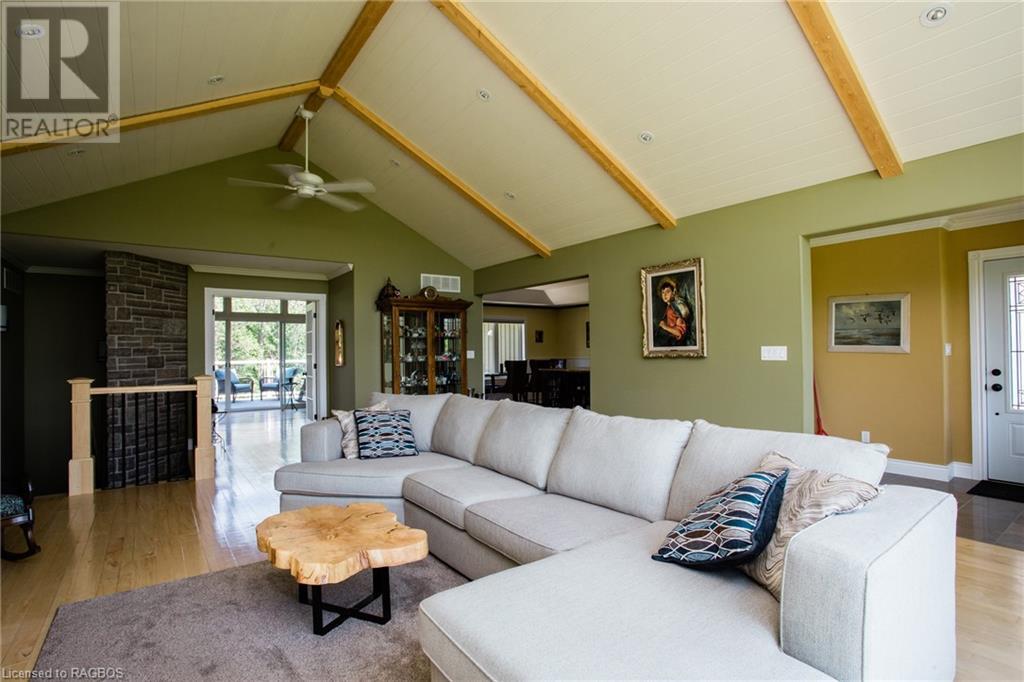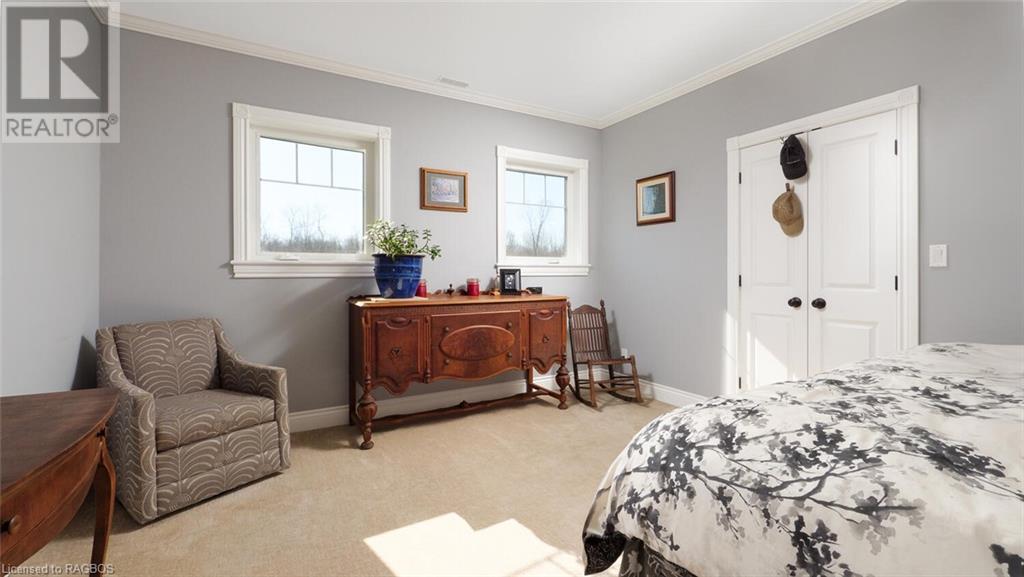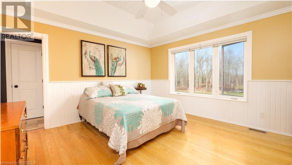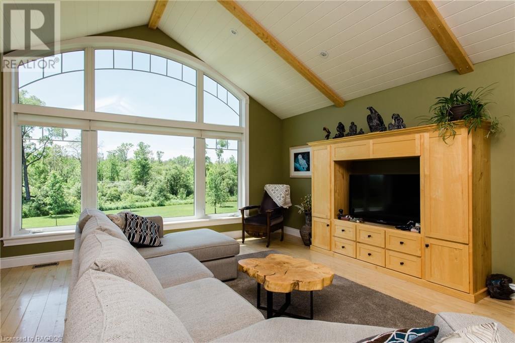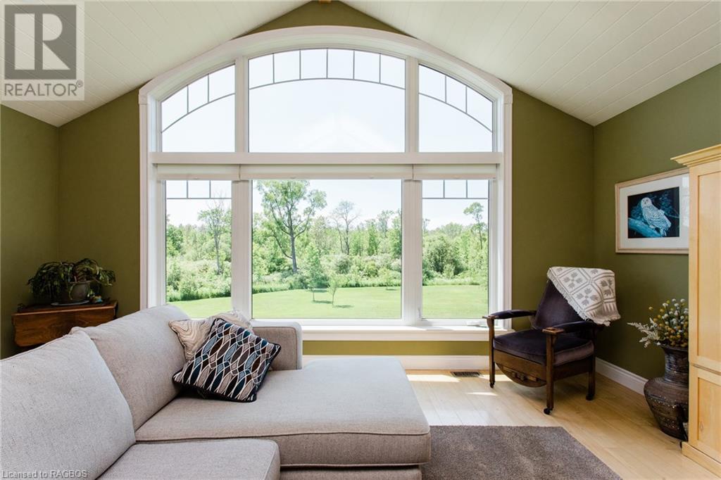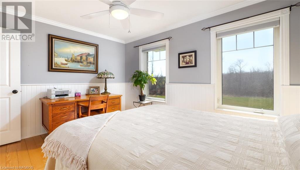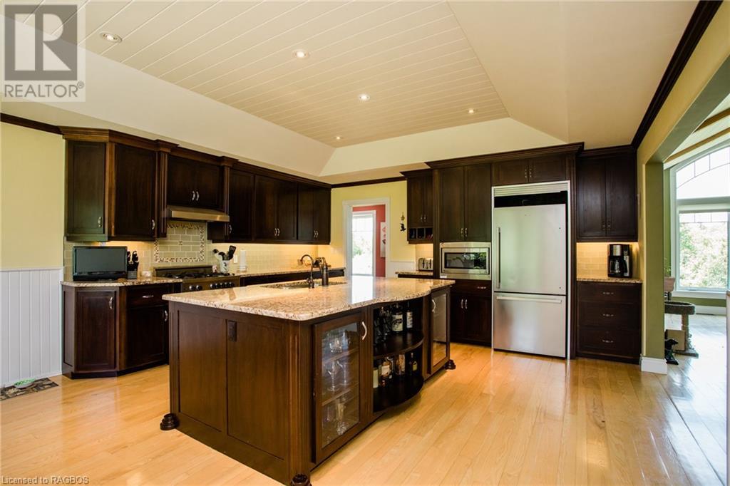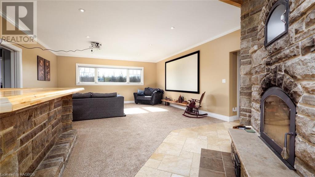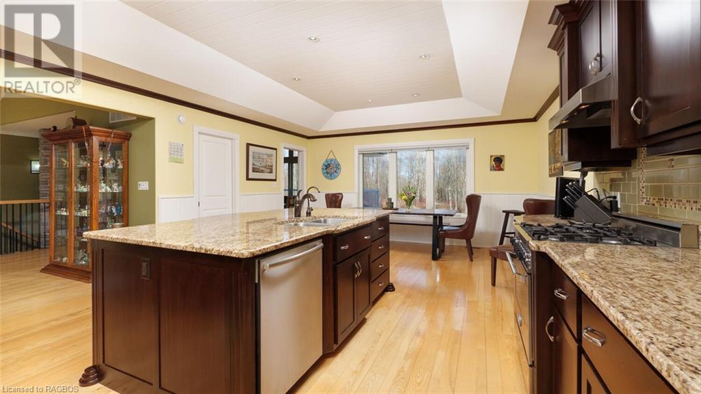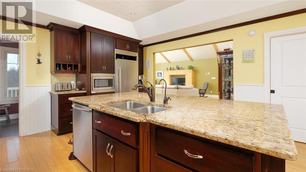 Enjoy this private paradise on 99.6 acres with trails throughout and an outstanding custom built stone home, just a few minutes from town! Open concept main living area with a dream chef's kitchen & walk-in pantry, dining area, sunroom & a great room with vaulted ceilings, all with fabulous views of the river, woods, and landscaped grounds. Main floor primary bedroom with 3 pc ensuite and walk-in closet, a 2nd bedroom, 4 pc bathroom; foyer & mudroom entry from heated 3 car garage. Lower level family room with bar and fireplace. Two bedrooms, exercise, office, cold room, utility/laundry room, wood storage. Walk-out to patio & hot tub! The trails meander along the river, through forests and meadows. Enjoy your acreage year round - horseback riding, walking, snowshoeing, xc skiing, or ATV'ing. Large pond, lovely gardens & fruit trees. The varied landscape creates a birder's paradise for viewing a multitude of species. The Indian River runs along the length of the property: fish, canoe or kayak. The home has spacious rooms, fabulous views of the countryside and river, and is located on a paved road 15 min to Owen Sound or Wiarton. Call your REALTOR® today to view this wonderful property! (id:22211)