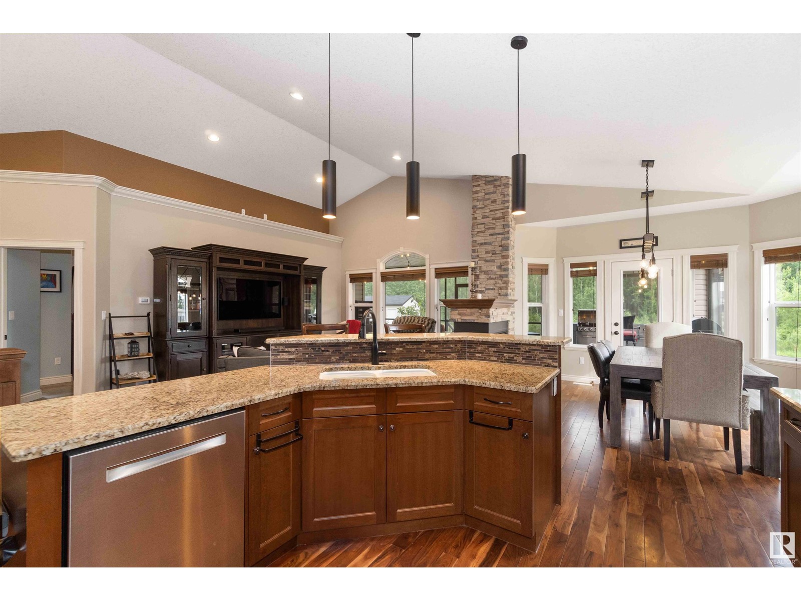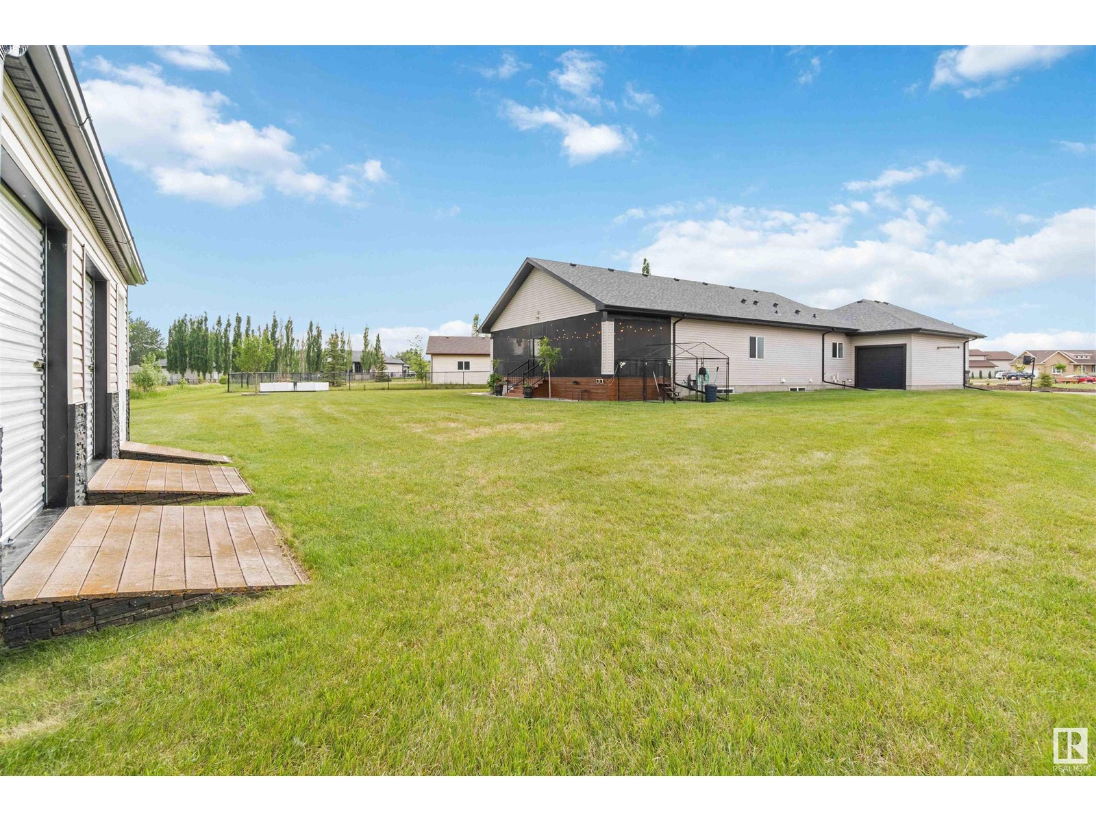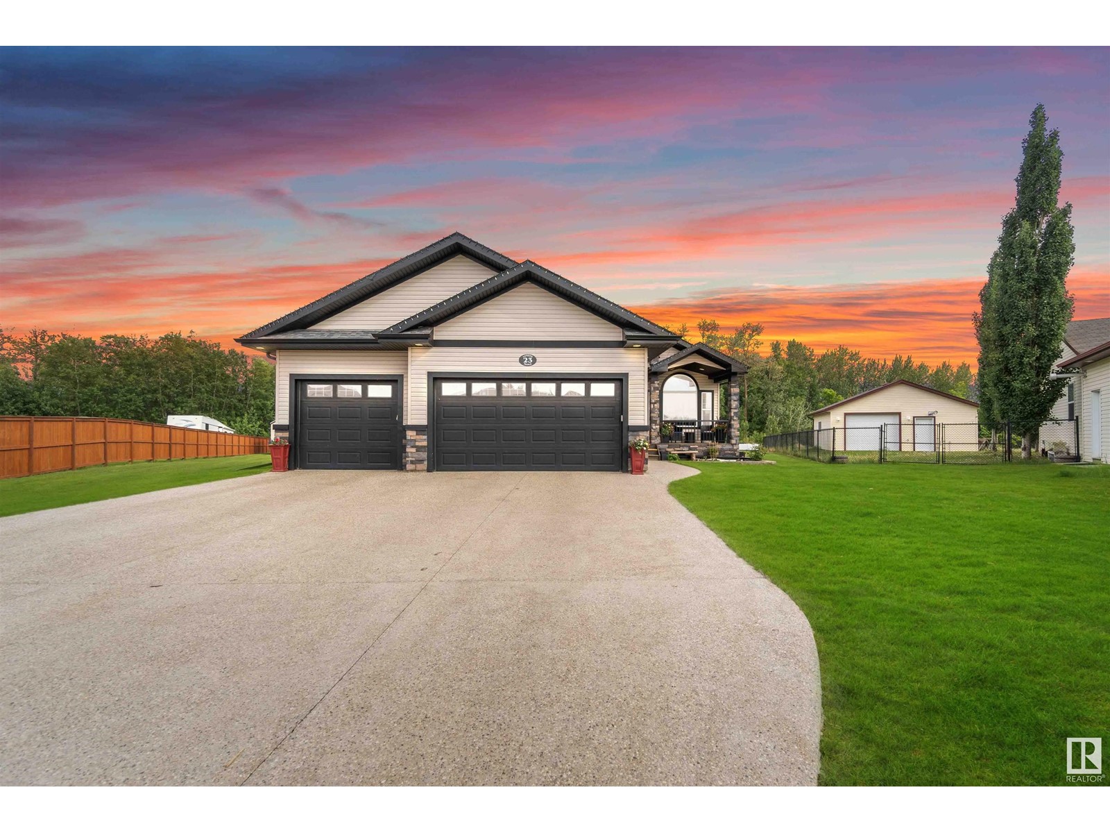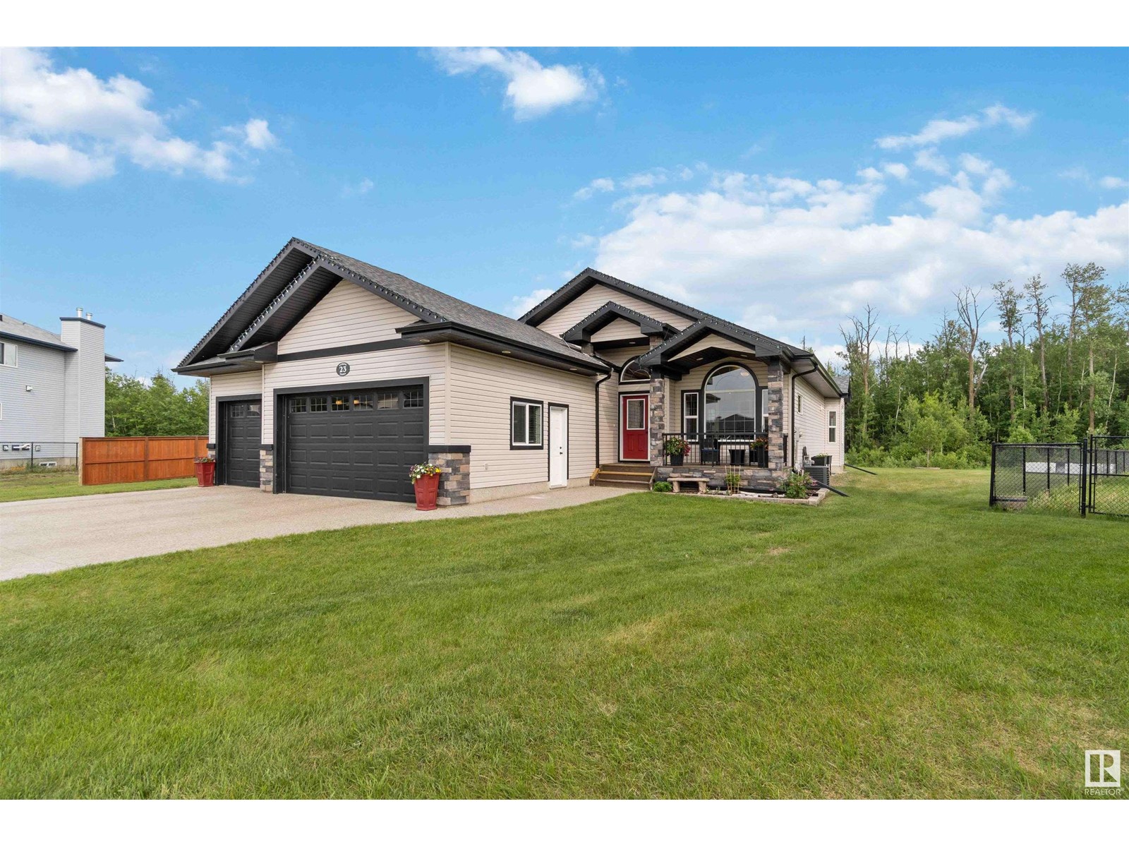 Introducing a unique bungalow nestled in the growing community of Gibbons. This impressive home showcases a triple dream garage and is situated on a spacious 1/2 acre lot. With 2 bedrooms on the main level, 2 bedrooms in the basement, and a den, this versatile layout caters to various lifestyles and needs. Step inside and experience the seamless flow of the open concept design, creating a welcoming atmosphere for relaxation and entertainment. Vaulted ceilings (13.6) add an elegant touch, enhancing the feeling of spaciousness and openness. The well-appointed kitchen is a chef's delight, featuring granite countertops, stainless steel appliances, walkthrough pantry and ample storage options for all your culinary needs. Backing onto a tranquil green belt, this bungalow offers a picturesque setting that invites you to immerse yourself in the beauty of nature. The covered back deck becomes a private oasis, perfect for enjoying outdoor gatherings or quiet moments of reflection. (id:22211)