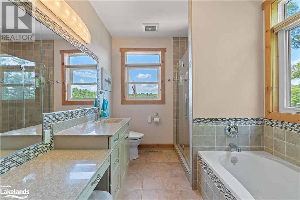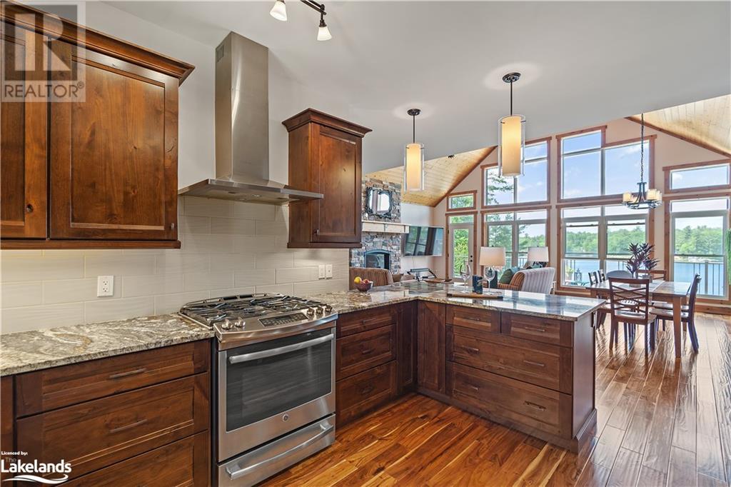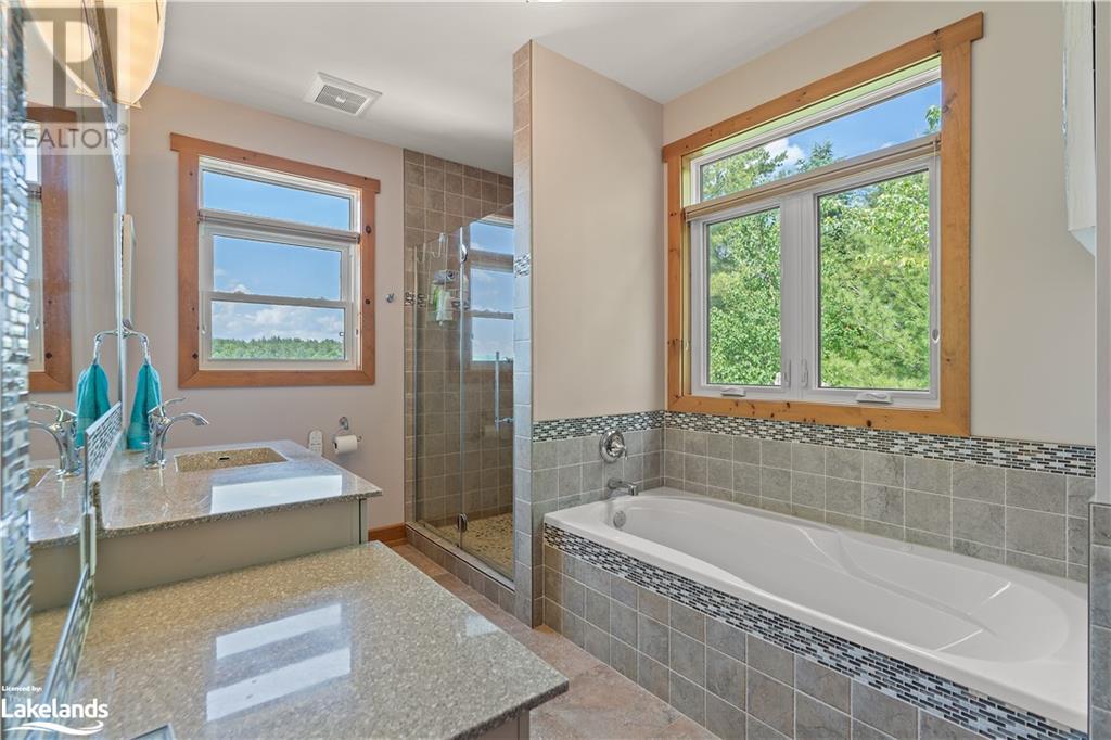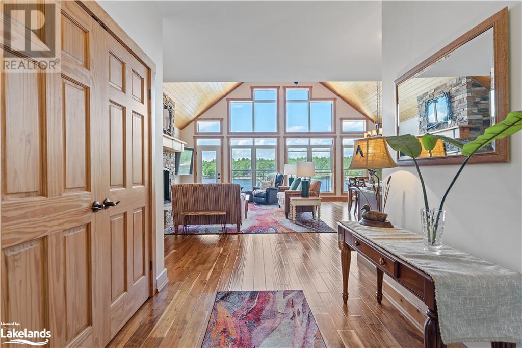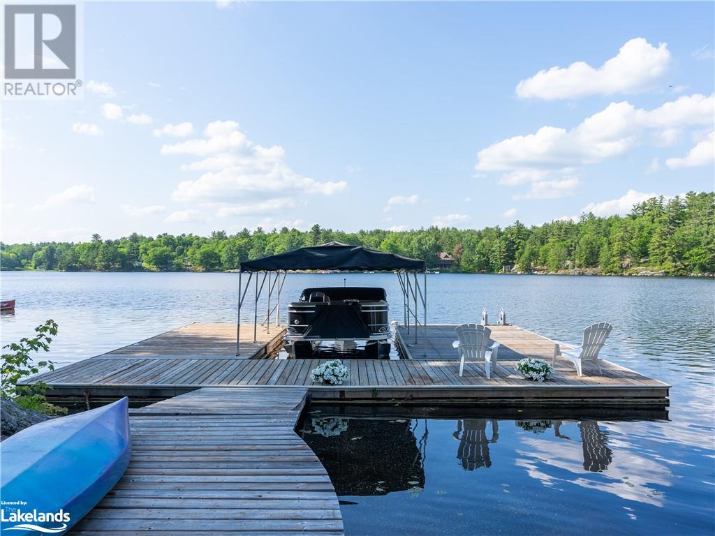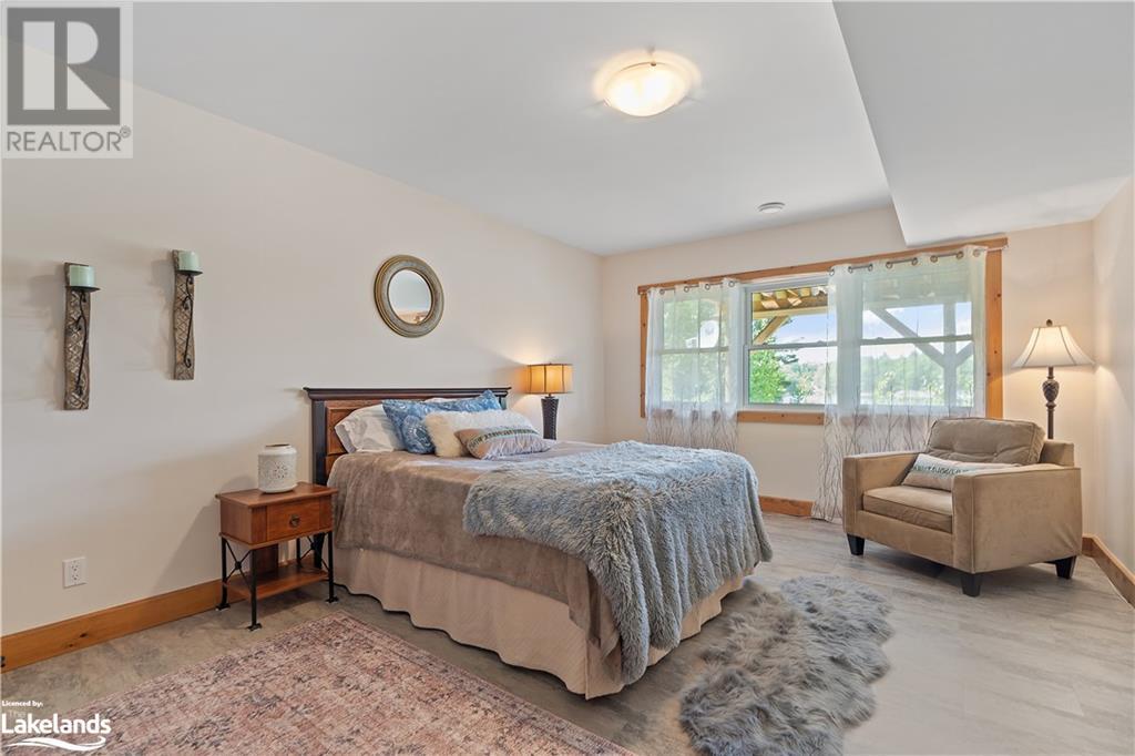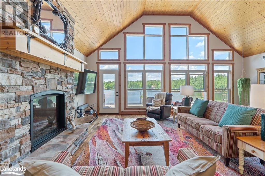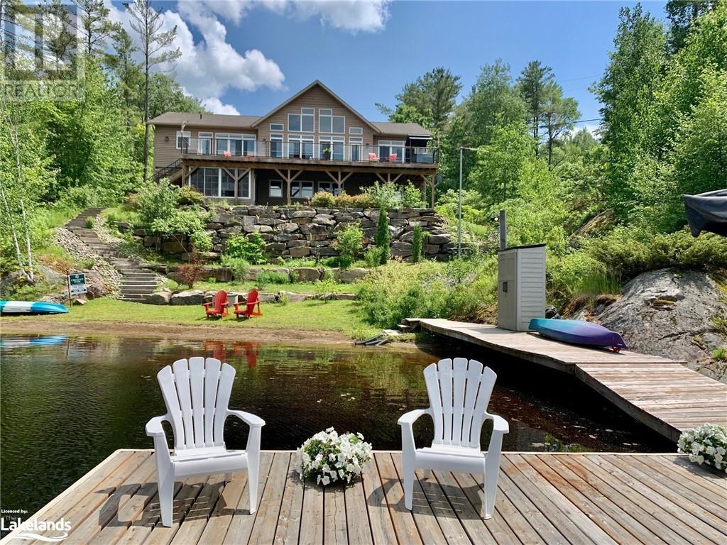 Welcome to this absolutely stunning, quality designed All season Home/Cottage on Beautiful Kahshe Lake featured in the May issue of Muskoka Life magazine! Completed in 2015 by a reputable local builder, this property shows beautifully and is maintained with pride of ownership that a special buyer will appreciate. Offering 4000 sq ft of beautifully designed living space that your family could enjoy this season. Well designed. landscaped lot with panoramic views of the lake from principal rooms and a large entertaining deck. Impressive Granite stone steps to waterfront lead to a sandy beach with large U shaped dock and covered boat port. Perennial gardens amongst circular driveway with 3 car detached garage 2018 (insulated storage room above) + a 2 car attached, heated garage with indoor access to the mud room/laundry. An inviting foyer w ample closets leads into the main living space with 16' high, pine cathedral ceiling that attracts plenty of light into your day. The warm, acacia wood floors throughout the main floor are beautifully crafted. An impressive stone, propane fireplace with generous wood mantle makes another, stunning design feature. Quality, wood kitchen cabinets with natural vein, patterned granite countertops goes beautifully with the overall design. Plenty of counter space, large peninsula style, stainless appliances with propane range is a joy to prepare family meals. Private, main floor, primary bedroom with gorgeous views of the lake + walk out to the large deck with glass railings. Spa like 4pc ensuite and large walk in closet make this a comfortable, personal getaway. Additional 2 bedrooms on the main floor (or use 1 as a TV den) are privately located with another 4pc bth. Wide stairs, off the foyer to the lower level family room that would make an ideal media room. 4th bedroom, 3 pc bath with ample closets & storage rooms. 3 season Muskoka room w stone floor. Located off easy access all season road. 10 mins to Washago & 20 mins to Gravenhurst. (id:22211)