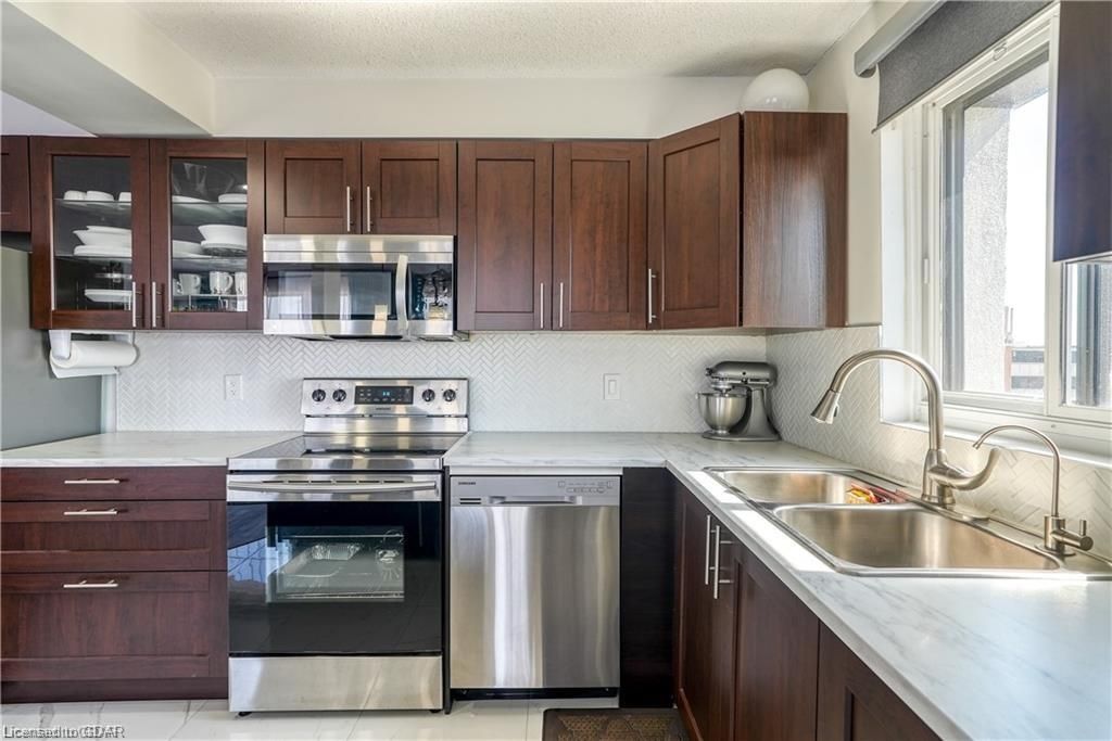 Are you on the hunt for an awesome deal on a 2-bedroom + den condo in Guelph? Look no further! Get ready to be wowed by the spacious 1,166 sq. ft. of carpet-free living space. The kitchen is a dream with its newly renovated open concept design, featuring shiny stainless steel appliances, and a peninsula with breakfast bar. Plus, the unit flooring was upgraded last year with brand new vinyl throughout, giving it a fresh and modern look. There's a big pantry, in-suite laundry, and a convenient 3-piece washroom. And check this out—there's a roomy master bedroom with its very own 2-piece ensuite bathroom. You'll also find a second spacious bedroom with a fantastic view and a beautiful den that's perfect for all your needs. The building has got you covered with awesome amenities, including an exercise room, a happening party room, and even a dry sauna. Plus, it's conveniently located near parks, schools, downtown, walking and biking trails, and the highway 6 for easy commuting.