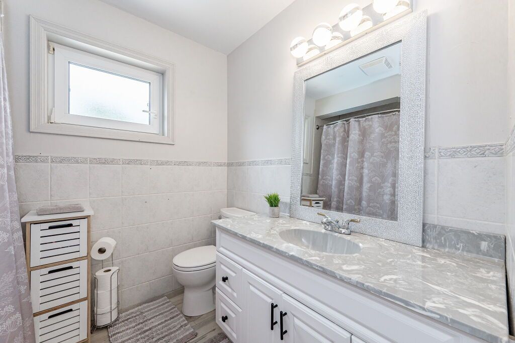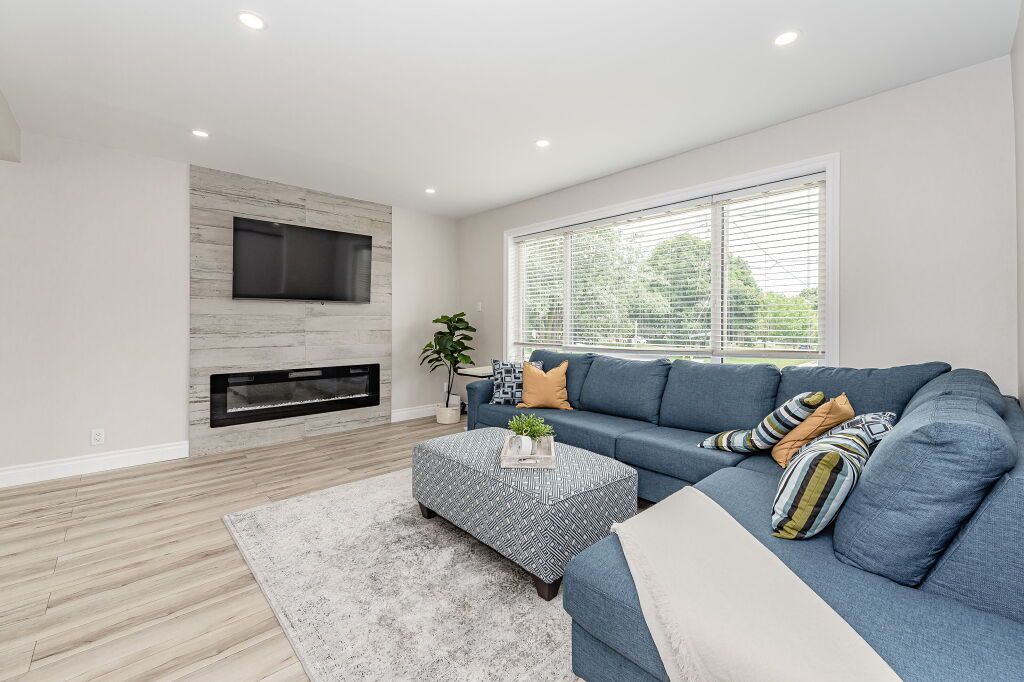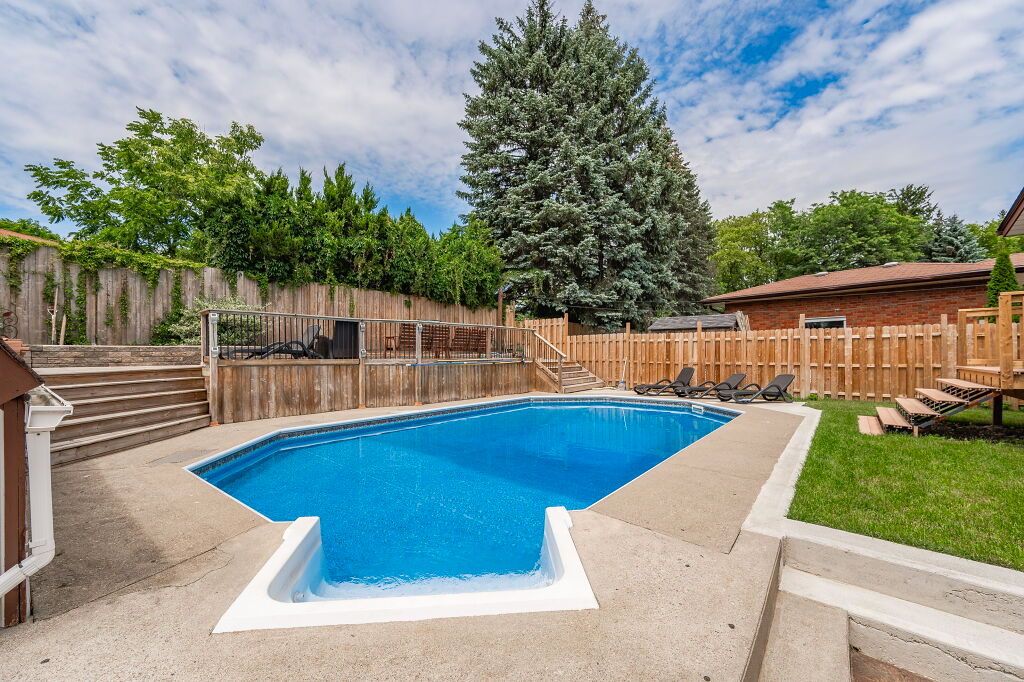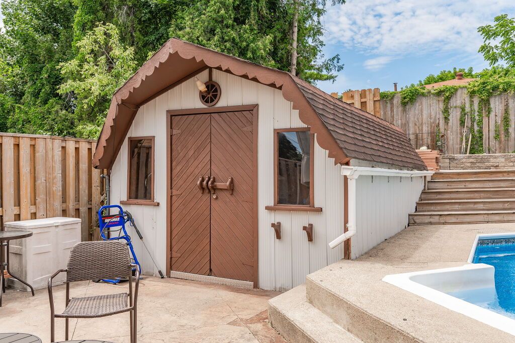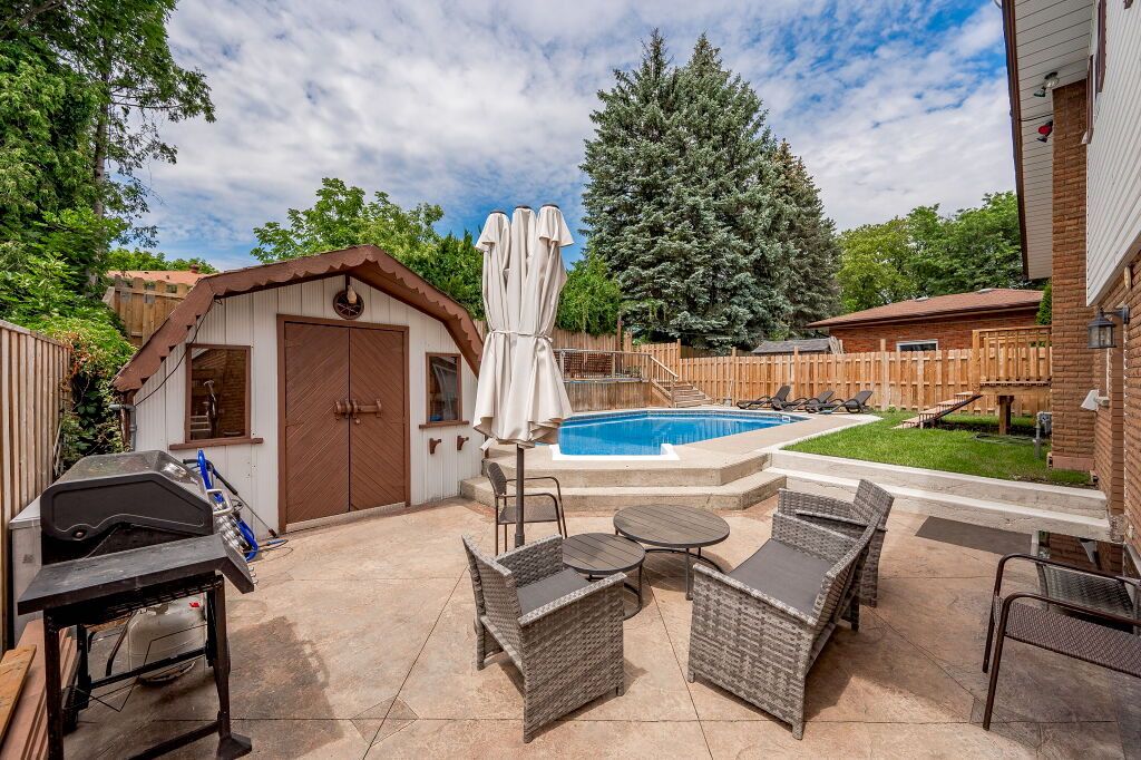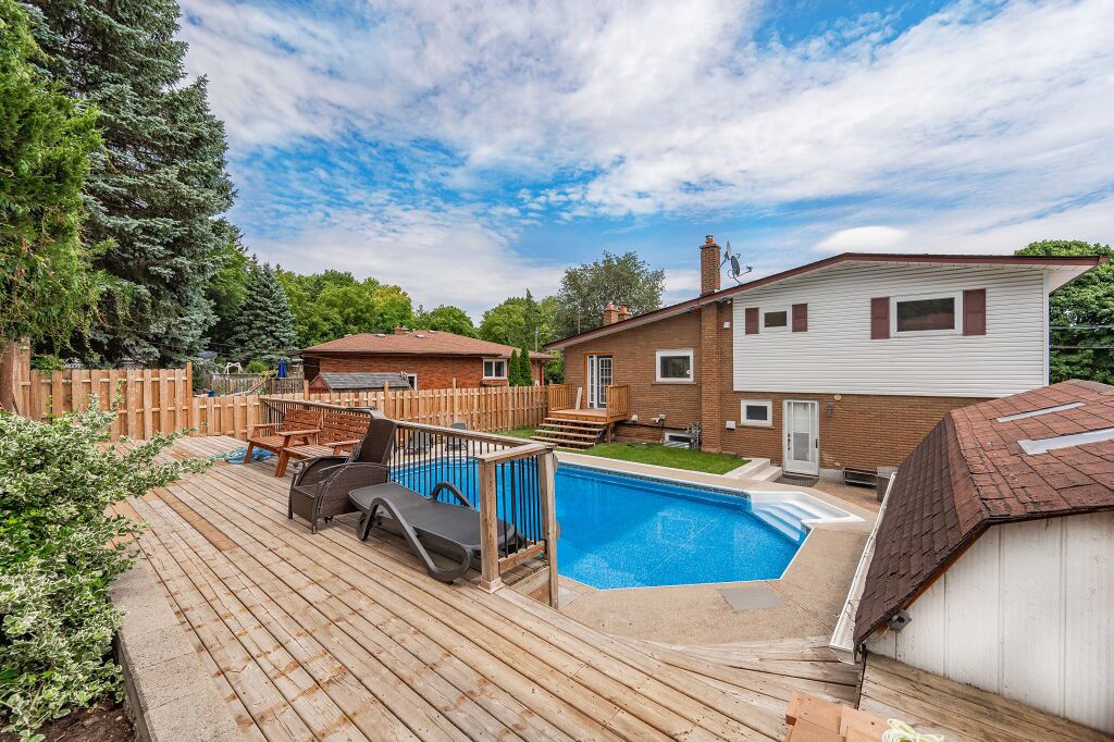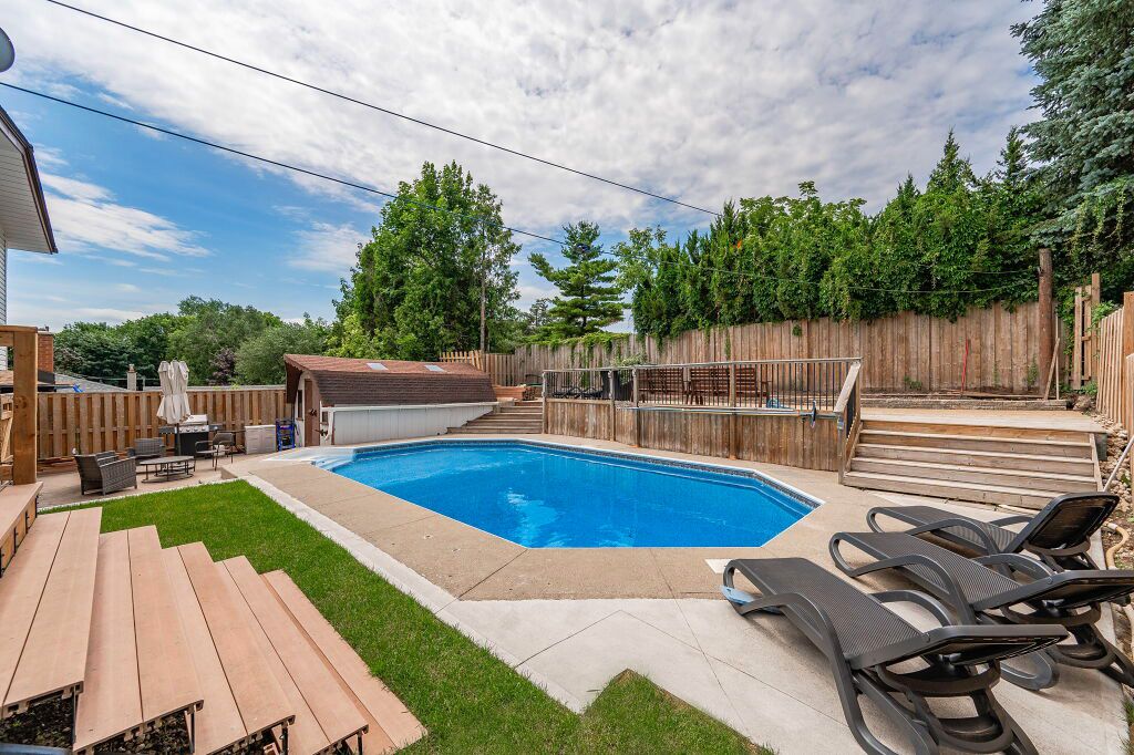 Exquisite home has undergone complete top-to-bottom renovation boasting gorgeous backyard W/inground pool! As you arrive double-wide stamped concrete driveway catches your eye accompanied by captivating gardens & front porch. Eat-in kitchen W/fresh white cabinetry, quartz counters, high-end S/S appliances, tiled backsplash & generous bank of pantry cupboards. Centre island features elegant light fixture & overhang for dining & entertaining. The kitchen seamlessly flows into expansive living room W/high-end vinyl floors, abundance of natural light streaming through oversized window & stylish feature wall W/modern fireplace. Completing this level is 2pc bath & laundry room. Upstairs you'll discover 3 generously sized bdrms W/large windows & ample closet space. 4pc main bath W/sizable vanity & shower/tub combo. Finished bsmt W/rec room featuring vinyl floors, multiple windows, 3pc bath, feature wall W/custom B/I shelves & fireplace. The bar provides the perfect setup for entertaining.Backyard oasis complete W/stone patio for BBQing as well as upper deck for basking in the sun. 32 X 16 ft heated inground pool surrounded by concrete patio. Large shed for storage needs. Close to parks, schools & all amenities!