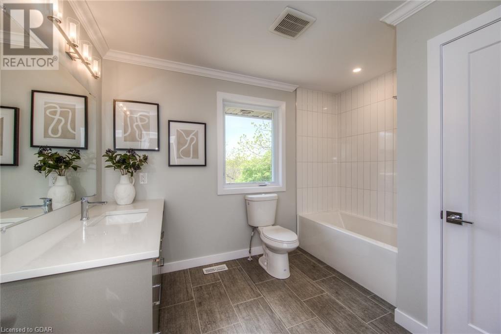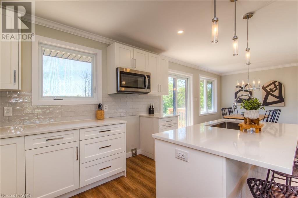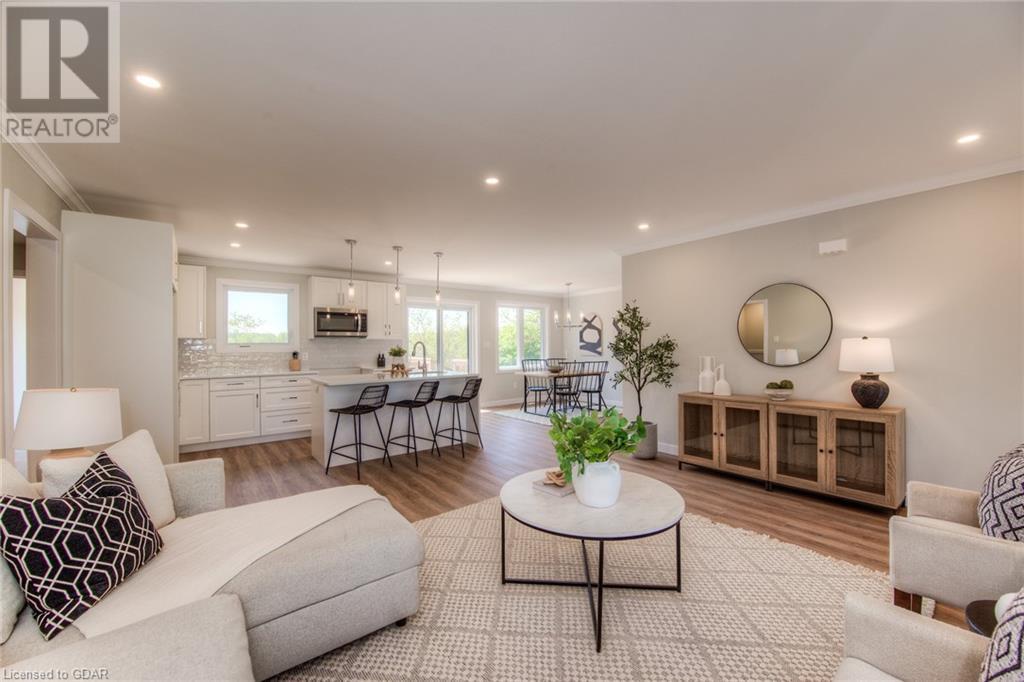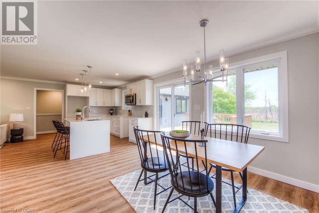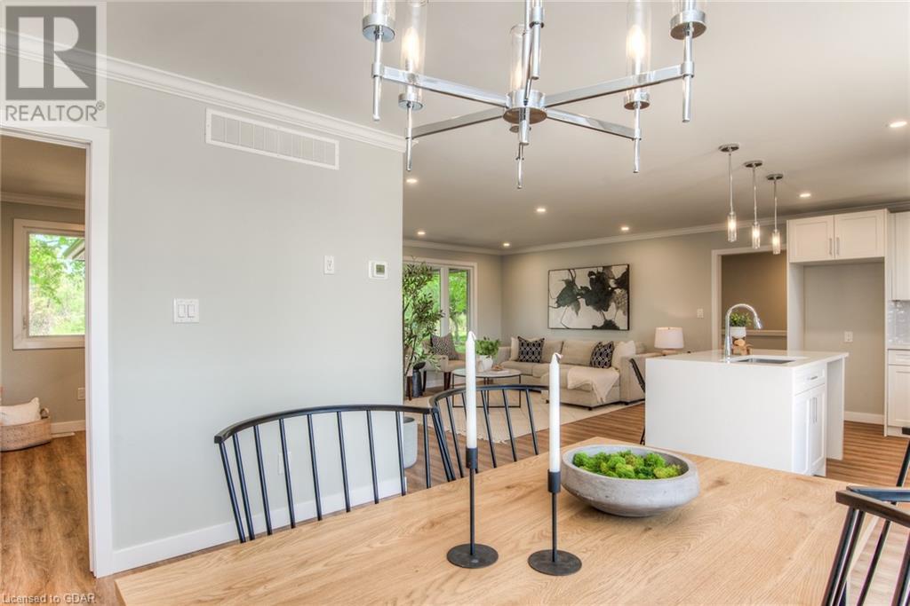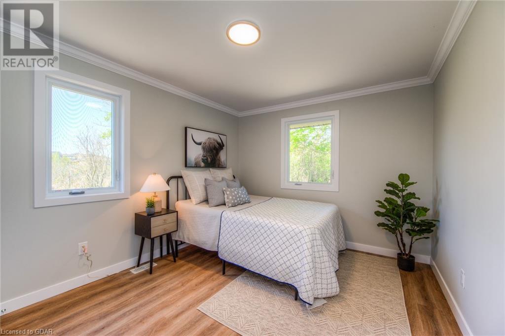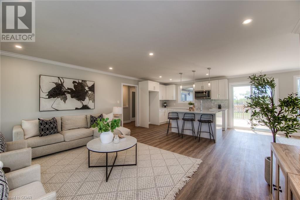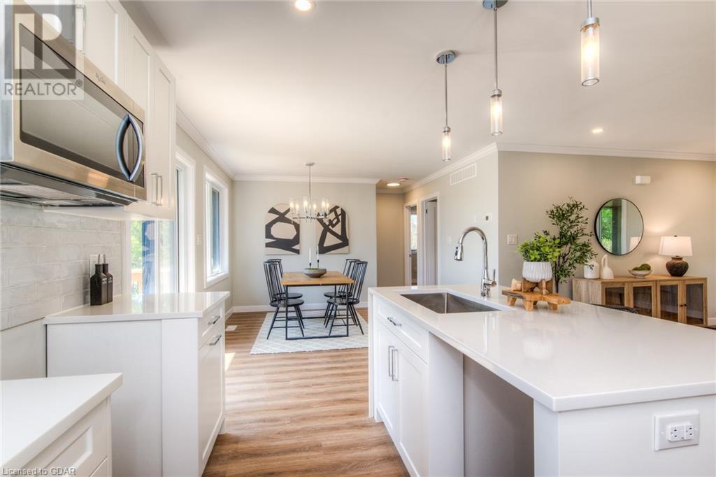 This fully renovated and updated modern 3-bedroom bungalow sits on a quiet dead end street in a desirable pocket of Guelph. Located o a beautiful 80x250 ft lot & surrounded by conservation land, this quintessential family home is move-in ready with some amazing updates. A long driveway offers ample parking. A covered porch off the front and deck out back allows you to be able to enjoy the beautiful yard space. Hard surface flooring throughout & updated EnergyStar windows offer tons of natural light, creating an open living space that connects the indoors beautifully to the outdoors. Open concept main living space will truly be the heart of this home, overlooking the living room, dining room & kitchen. The living room is complete with a panoramic window while the updated kitchen boasts tiled backsplash, brand new cabinetry & quartz countertops. Adjacent to the dining room are two bedrooms and a bathroom, updated with a ceramic tiled tub & shower combo and quartz countertops. Down the main hall you will pass main-floor laundry as you enter into the primary suite - boasting vaulted ceilings, rear deck access, and complete with walk-in closet & a 3-piece ensuite. The basement offers ample storage & workshop space. Furnace/AC (2023), roof (2022), windows (2022), reinsulated throughout (2022). Located conveniently too all major amenities and an easy drive to the 401. There is so much to experience & enjoy in this home's location - it truly has it all! (id:22211)