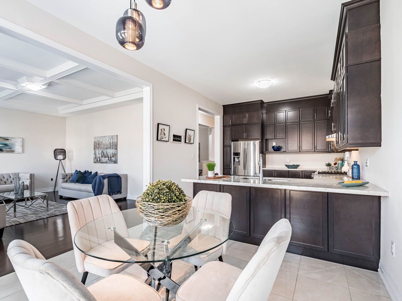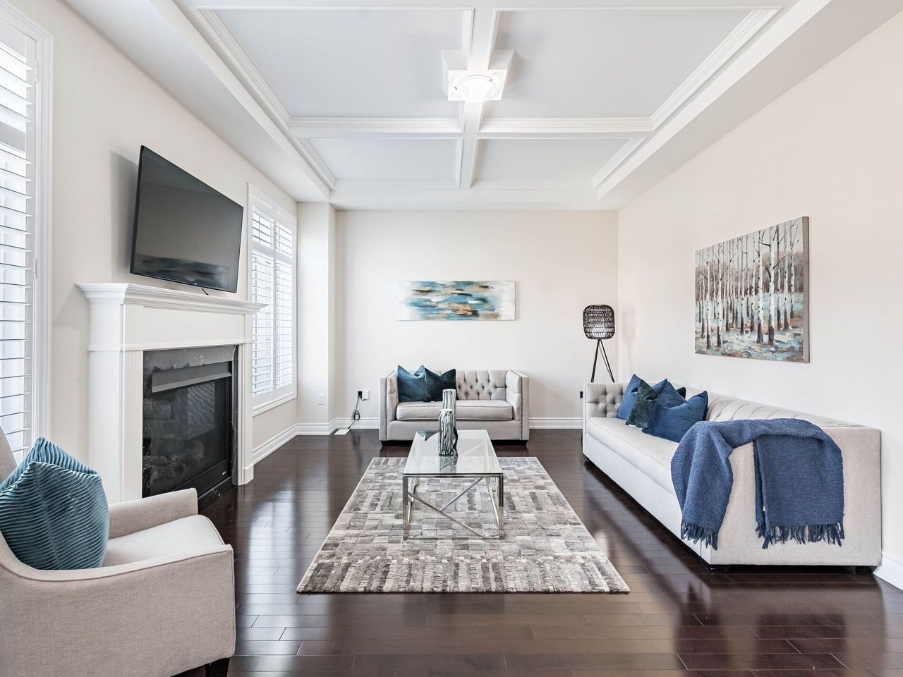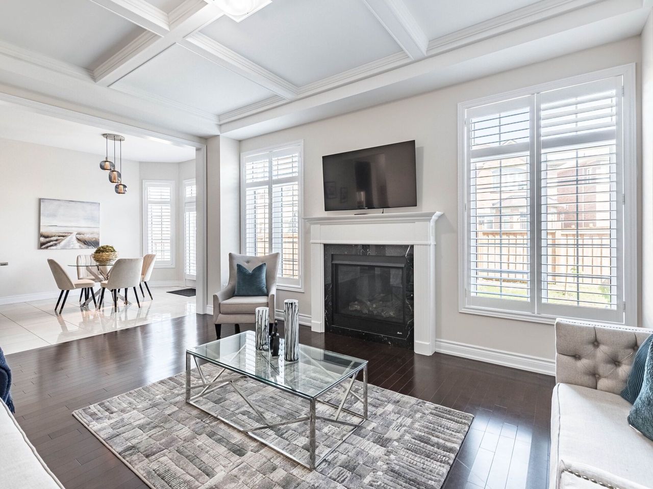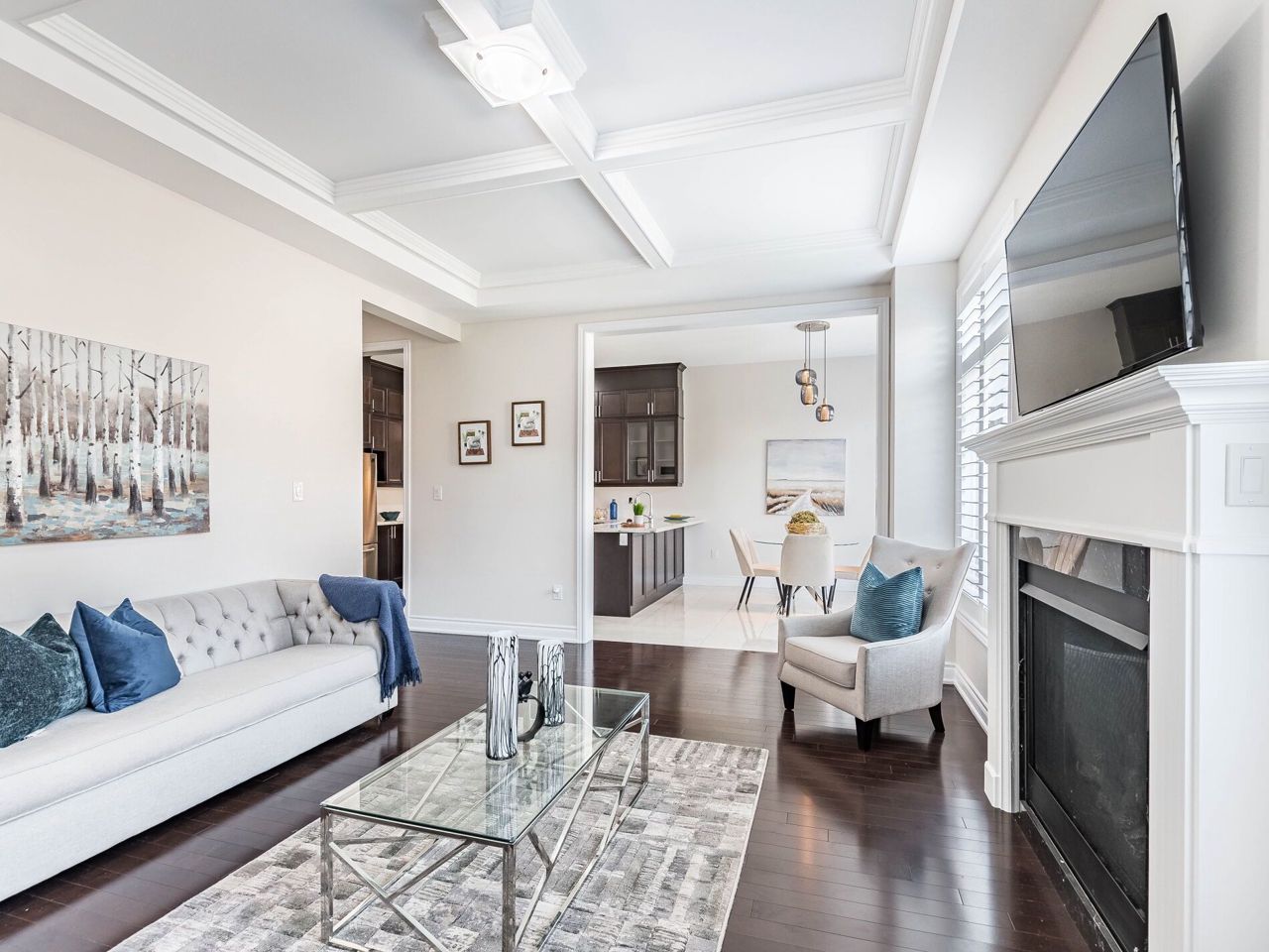 Fireplace Hardwood Floor Coffered Ceiling
