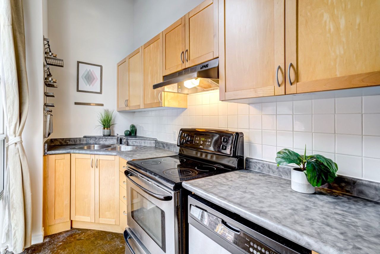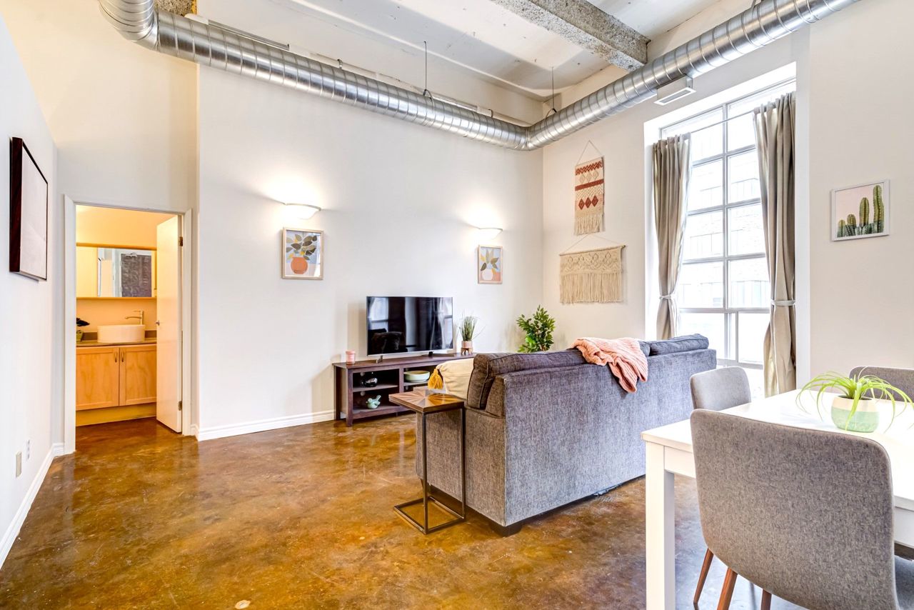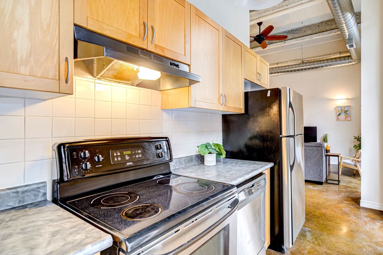 Fantastic 1 Bedroom, 1 Bathroom Condo @ Annex Lofts. Large "loft like" Condo w/ Polished Concrete Floors, 14' ceilings, Soaring 11' Windows, Exposed Beams/Vents, Updated Bath w/ Concrete Counters, SS Appliances, Walk-in Closet, In-Suite Laundry! Shows 10+ Close to James Street North, Farmers Market, and GOFridge, Stove, dishwasher , washing machine, dryer, elfs