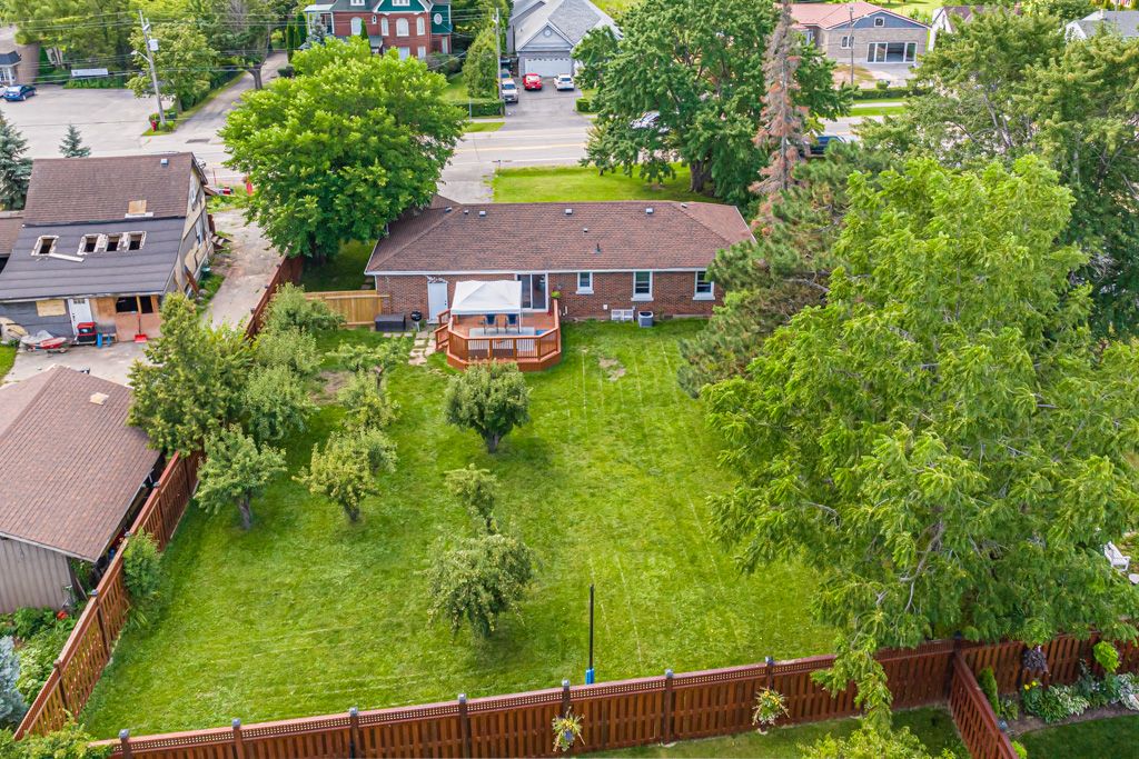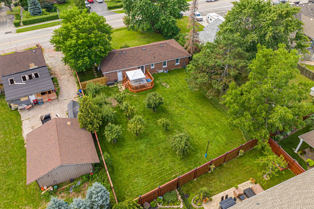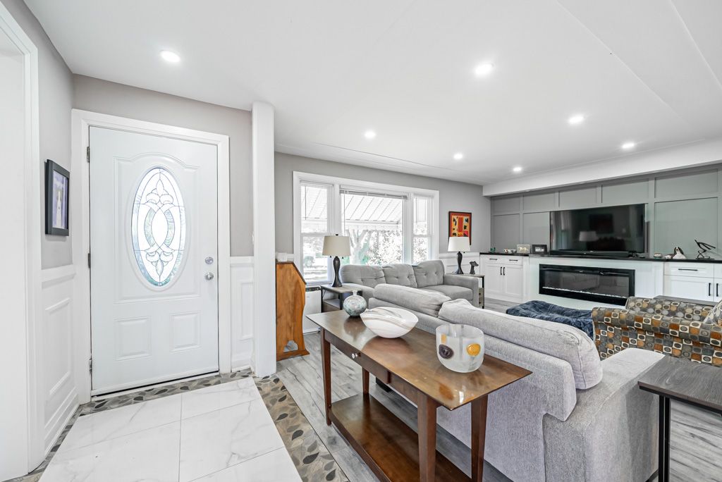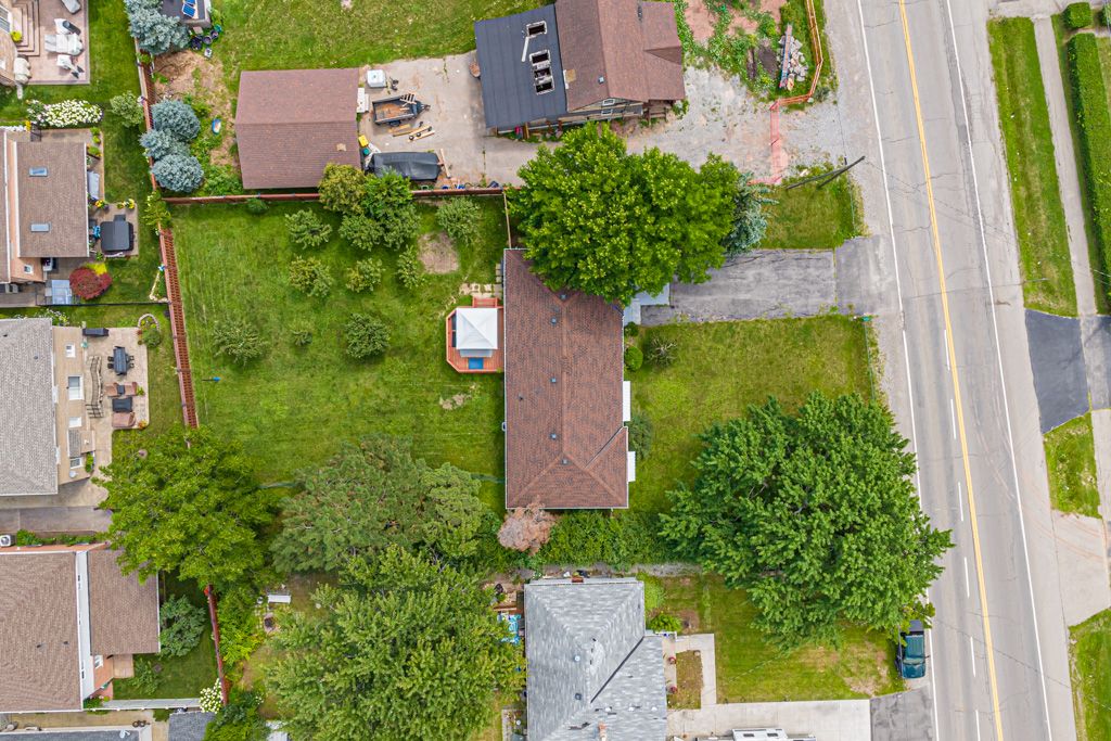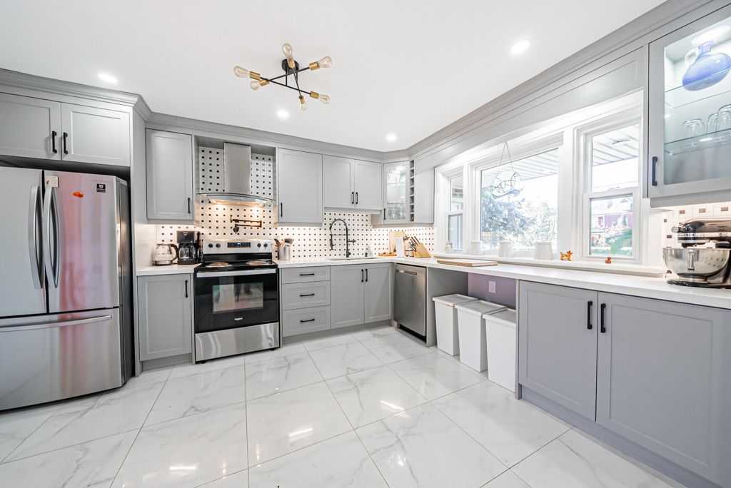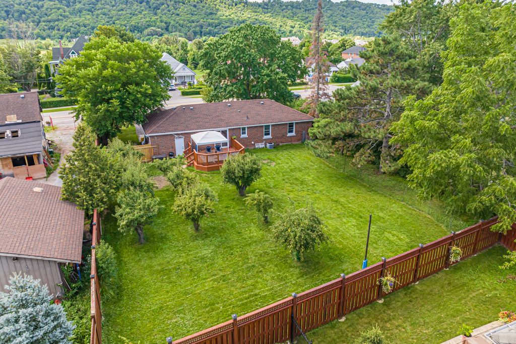 Stunning bungalow nestled on a large lot, boasting breathtaking views of the majestic Escarpment. This renovated home is adorned with designer touches throughout. From the moment you step inside, the attention to detail is evident. The interior has been completely revitalized, featuring new doors, windows, and flooring that harmoniously blend modern aesthetics with cozy comfort. The spacious living room is, highlighted by a charming fireplace that exudes warmth on cooler evenings. The built-in cabinetry, wainscoting, and captivating feature wall add a touch of sophistication to the space. Prepare to be enamored by the kitchen's allure. Dressed in elegant grey shaker cabinetry, the kitchen presents a striking contrast against the pristine white quartz countertops. A modern range hood and designer light fixture illuminate the culinary haven, while glass door upper cabinets provide both functionality and a contemporary vibe. The marble design ceramic flooring adds a touch of luxury.Adjacent to the kitchen, the dining room features a walkout leads to a spacious deck, granting access to the serene and private treed backyard.