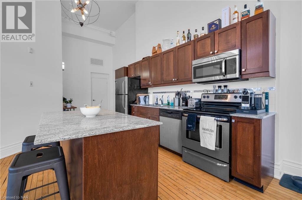 Located in the historic and award winning Stinson Lofts, this one bedroom condo is the perfect place to call home! From the moment you walk in, you will be greeted with soaring 14 ft ceilings, gorgeous hardwood floors, and tons of natural light from the many large windows encasing this corner unit. The kitchen features gorgeous subway tiles, granite countertops, an island for extra prepping and seating space, and stainless steel appliances. This loft welcomes you with its open concept design, making it a great space to entertain, and ample room to arrange as you’d like! Laundry can be conveniently accessed through the generously sized bedroom, as well as an ensuite bath! Take a look at the beautiful escarpment views from your personal balcony, and enjoy everything the Stinson Lofts has to offer - https://youtu.be/bG_-yietzUc. (id:22211)