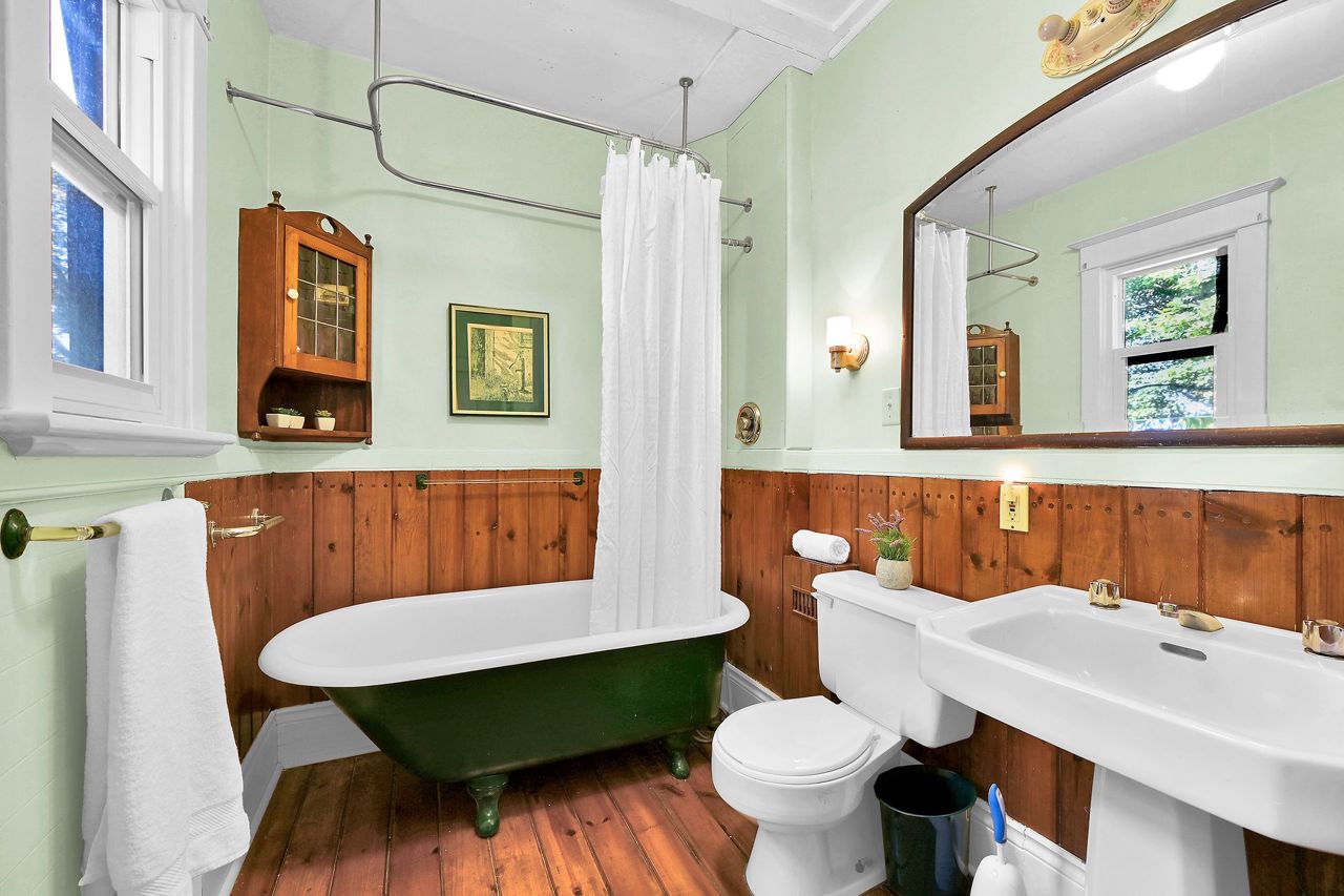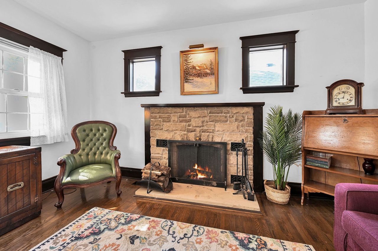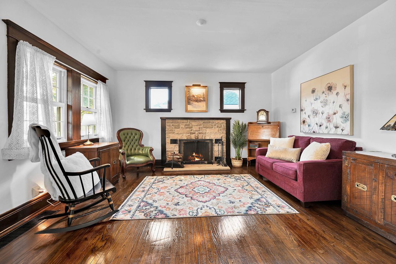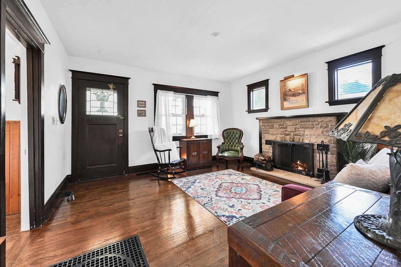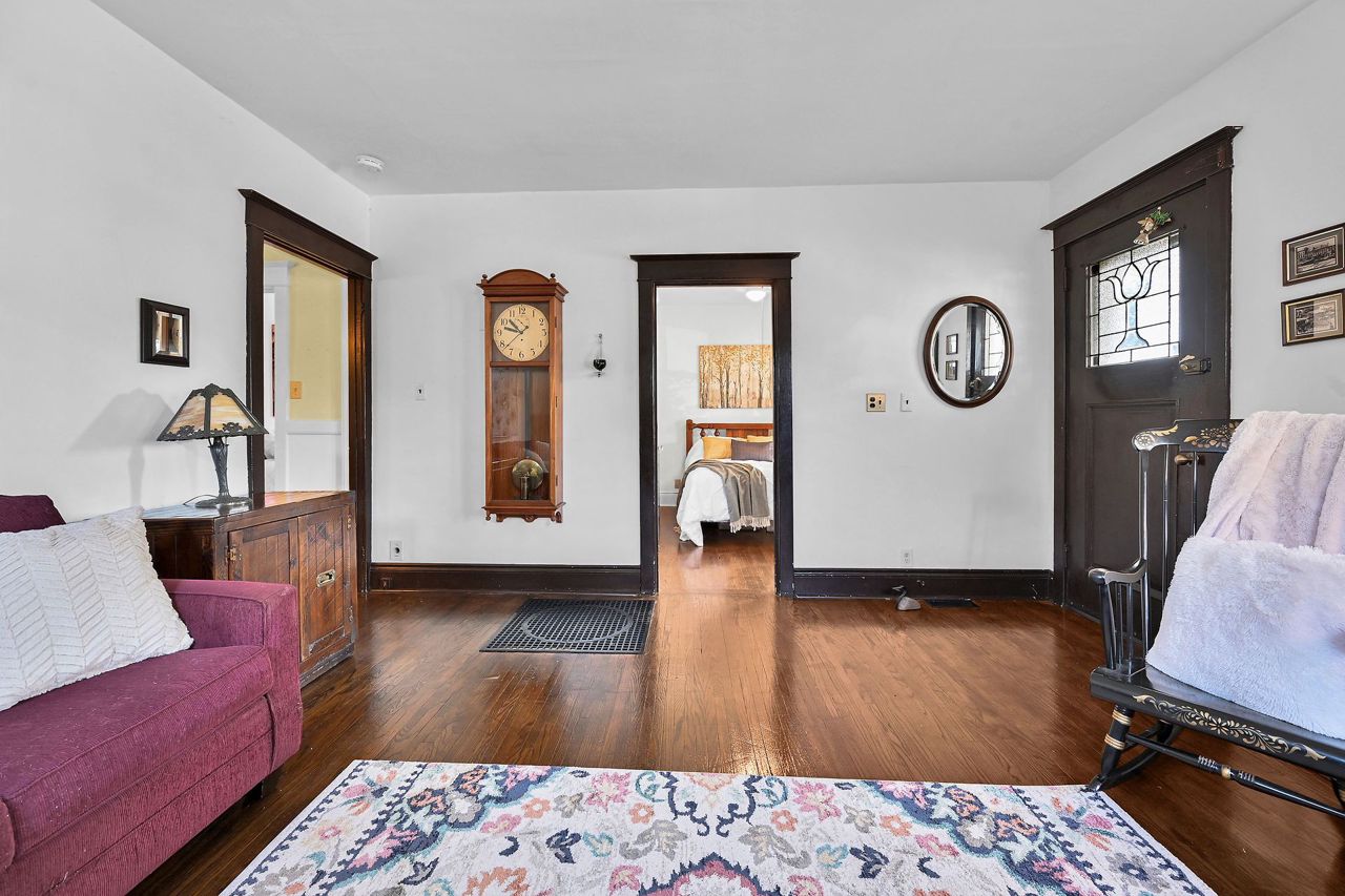 Charming 2 bedroom 1.5 bath bungalow located on mature lot, backing onto green space. Step in off the covered porch, into nicely proportioned living room, with wood fireplace, sunny windows, and stunning pine floors. Spacious eat in kitchen with easy access to rear porch overlooking mature lot. Main floor bath includes claw foot tub. Open basement equipped with workshop, laundry, and 2 pce bath plus walk up to rear yard. Plenty of storage. Step outside into peaceful backyard, with detached wood cladded garage and concrete driveway for 4. Mature gardens throughout. No Great for first time buyers, empty nesters looking to downsize.