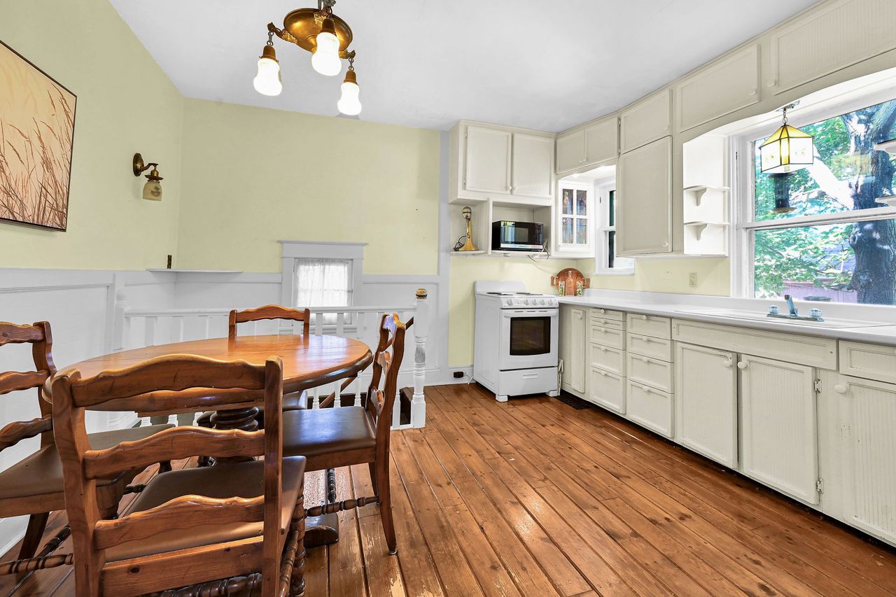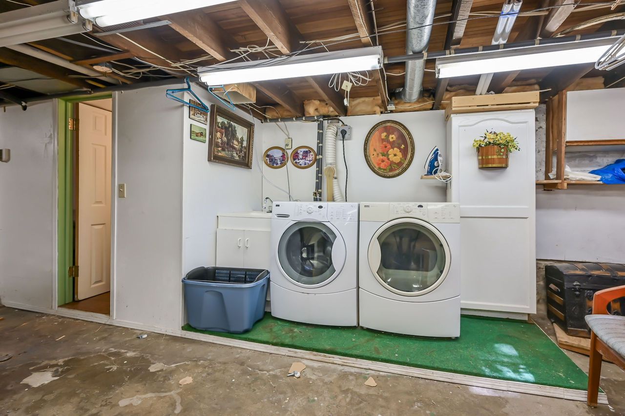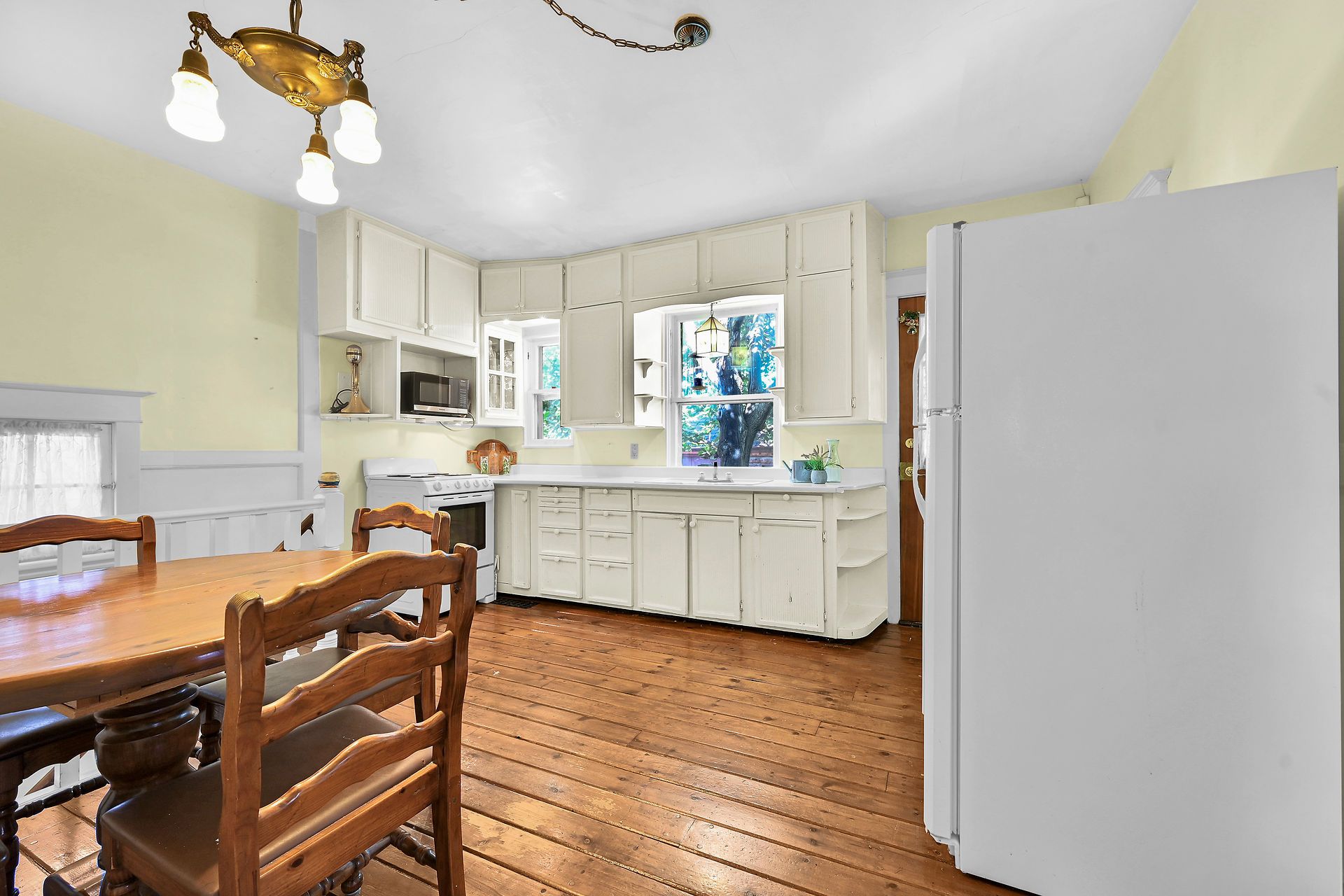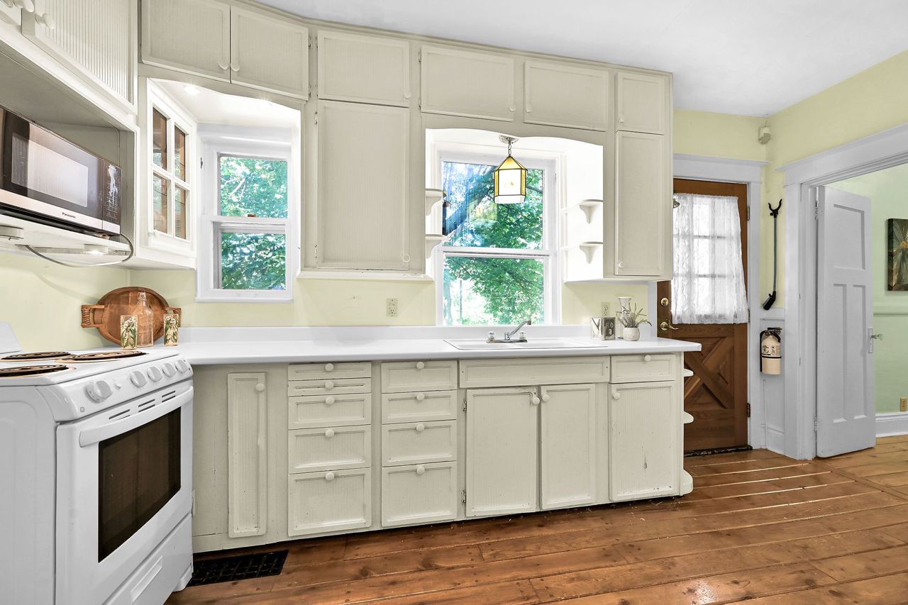 Charming 2 bedroom 1.5 bath bungalow located on mature lot, backing onto green space. Step in off the covered porch, into nicely proportioned living room, with wood fireplace, sunny windows, and stunning pine floors. Spacious eat in kitchen with easy access to rear porch overlooking mature lot. Main floor bath includes claw foot tub. Open basement equipped with workshop, laundry, and 2 pce bath plus walk up to rear yard. Plenty of storage. Step outside into peaceful backyard, with detached wood cladded garage and concrete driveway for 4. Mature gardens throughout. No Great for first time buyers, empty nesters looking to downsize.