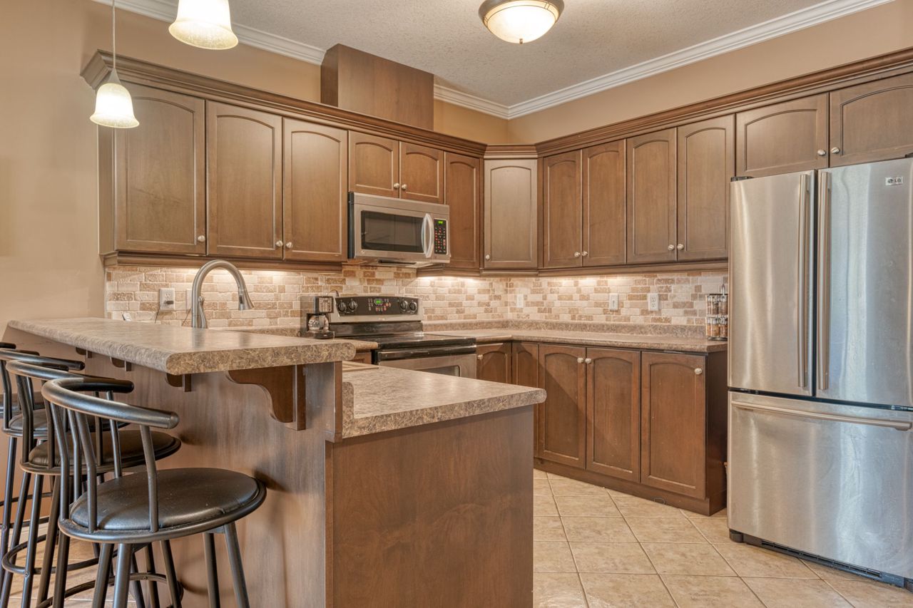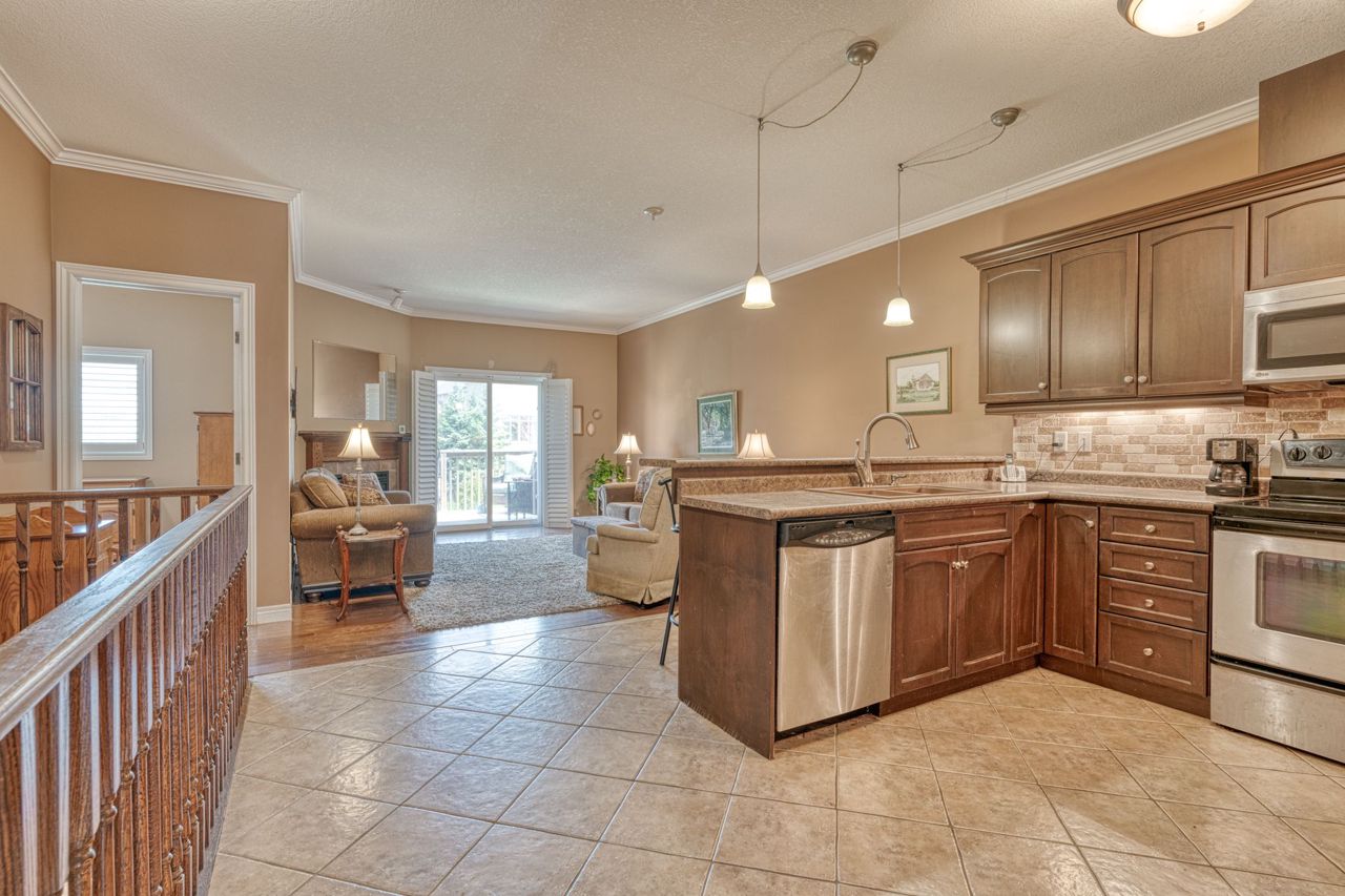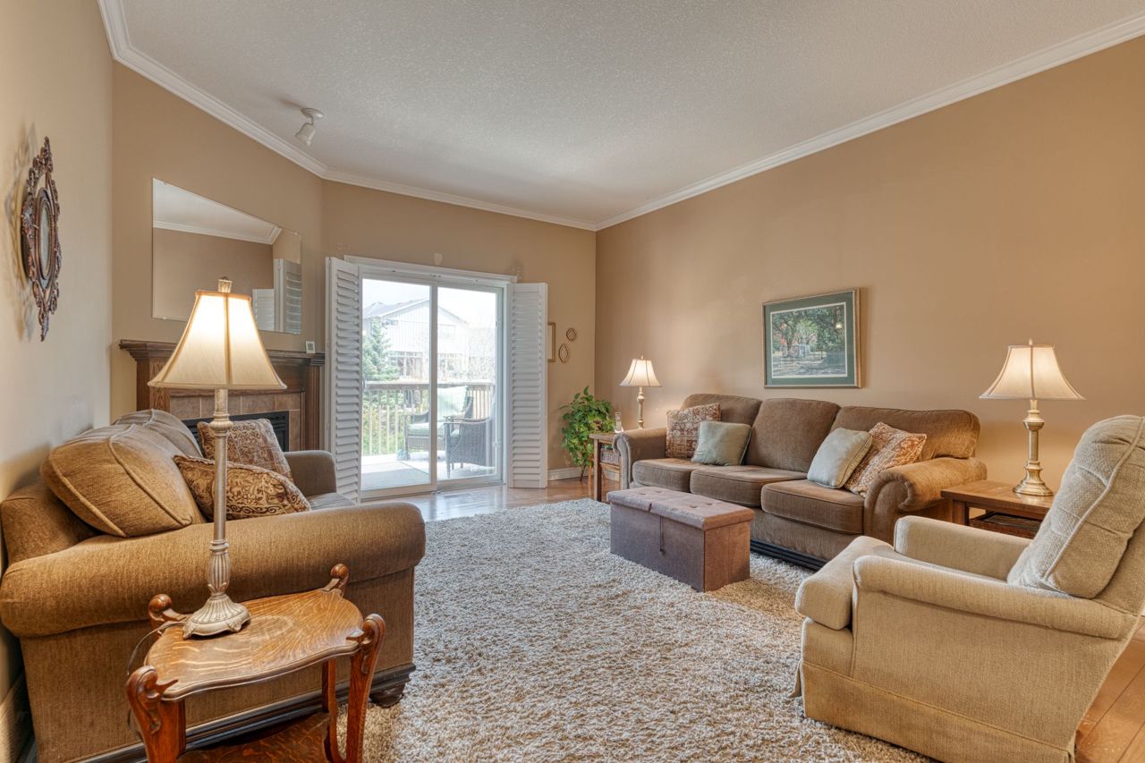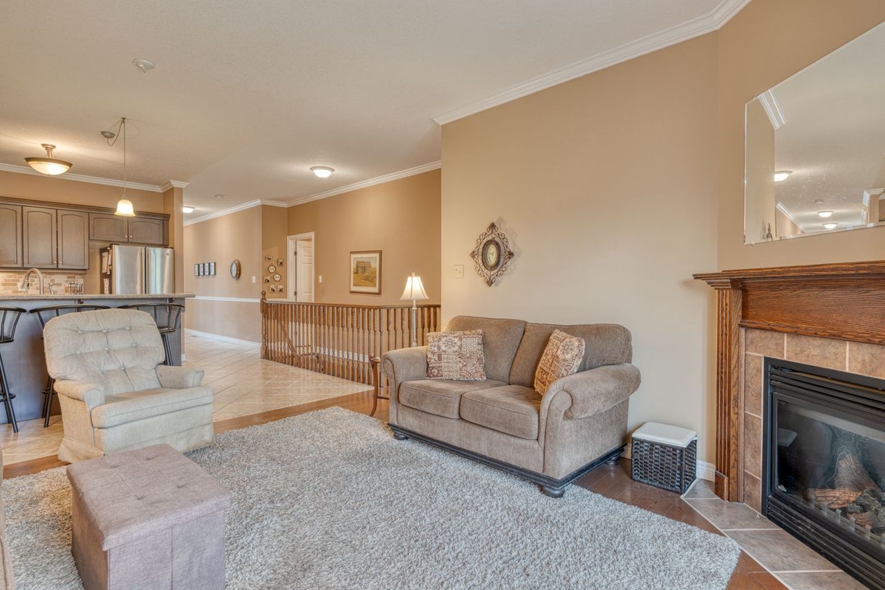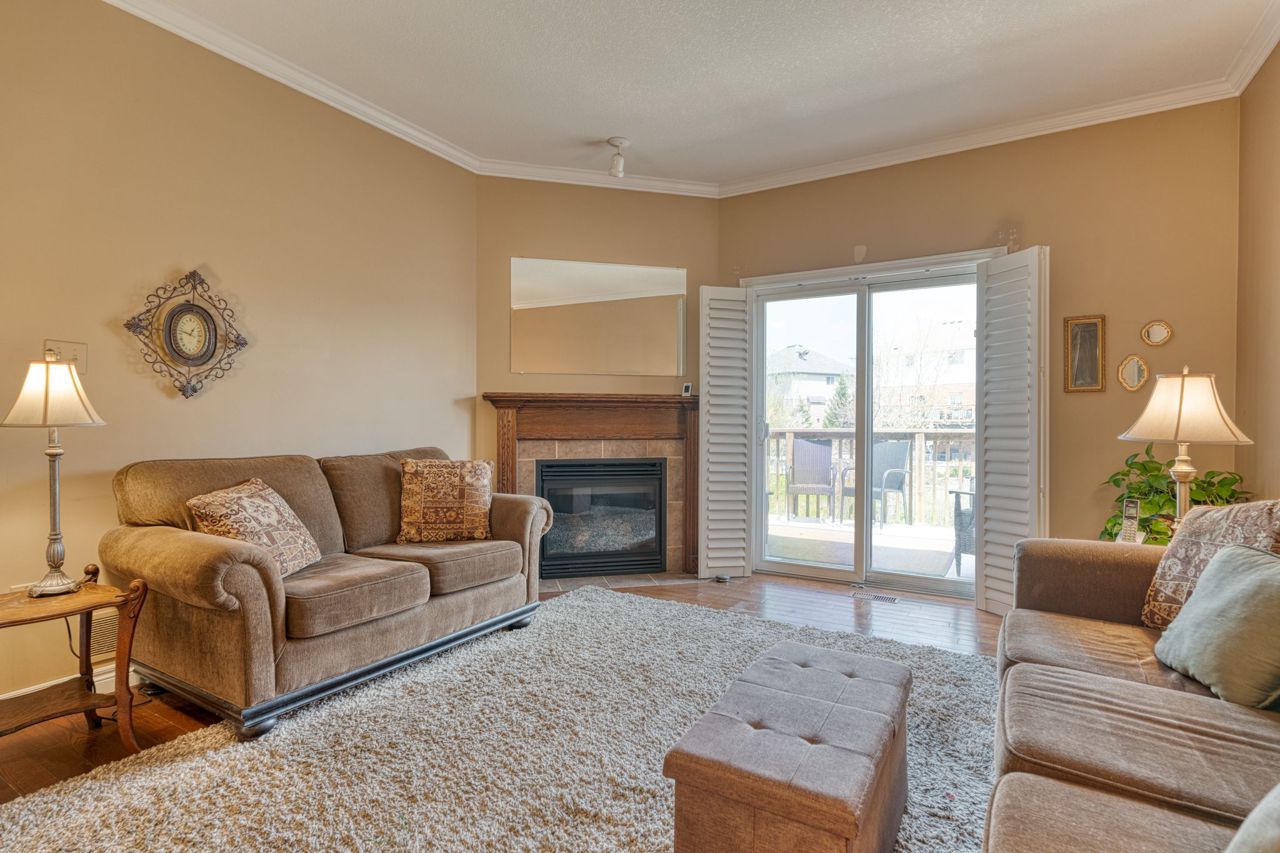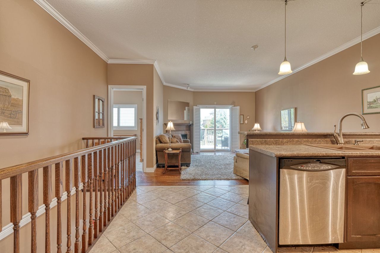 Rarely offered unit in quiet complex! This 2 bed, 2.5 bath bungalow town with finished walk out basement backs onto greenspace that you can enjoy from either the upper or lower patio areas. Hardwood flooring, gas fireplace, generous size primary bedroom with ensuite. The second bedroom is currently used as a dining room. Finished basement with large family room, full bathroom and another room for either an office, gym, hobby room or bedroom. This home sits in a well run quiet complex. Single garage with inside entry. Furnace & AC (2021) Shingles (2022). Pets permitted. Don't delay! RSA.