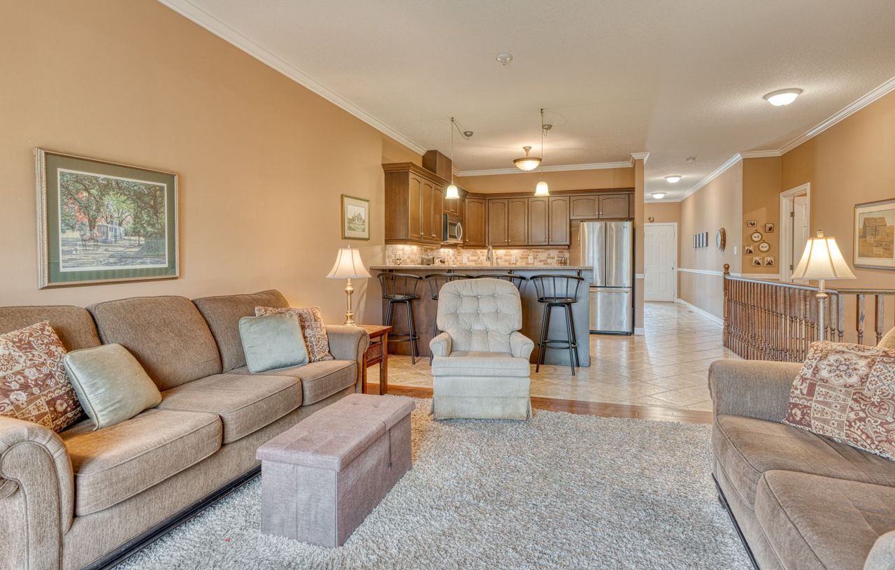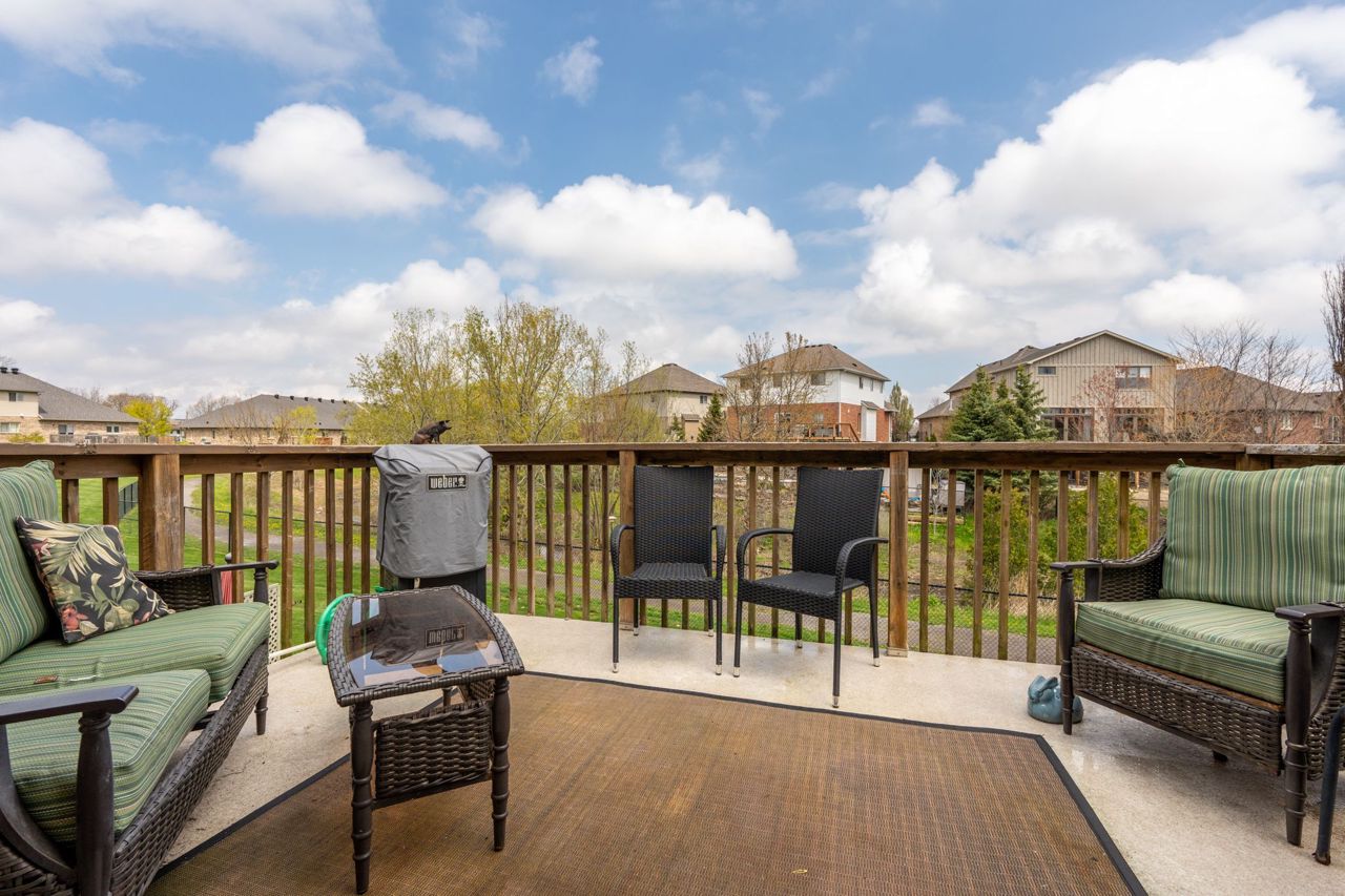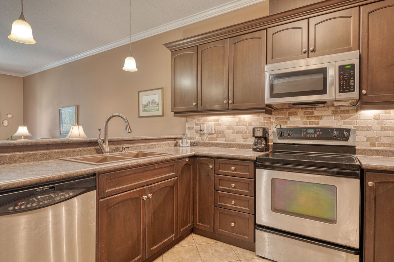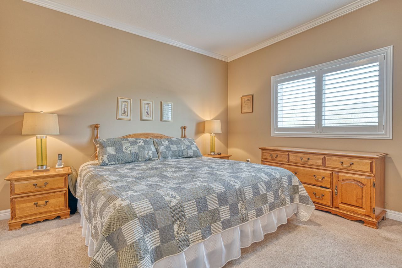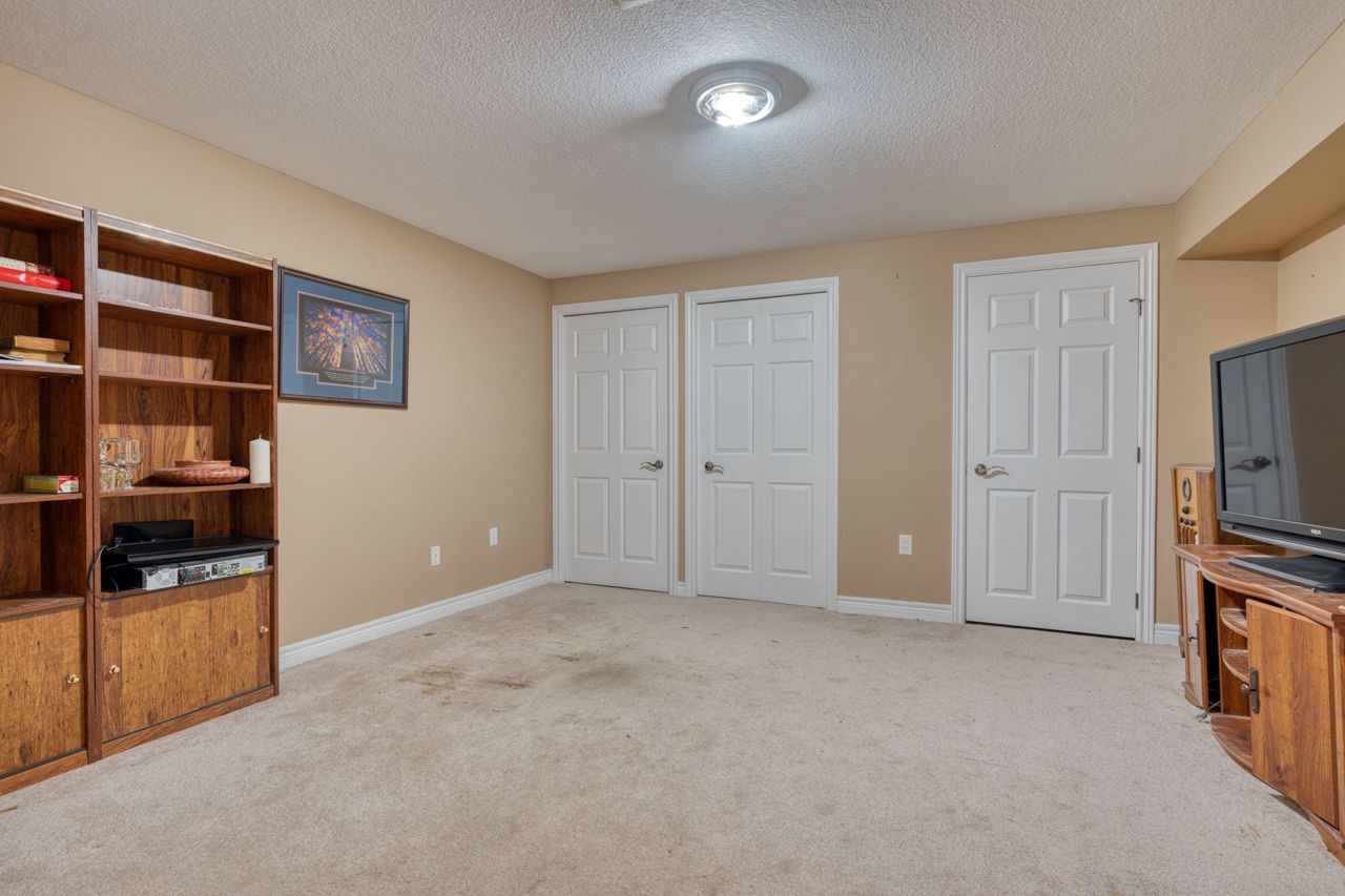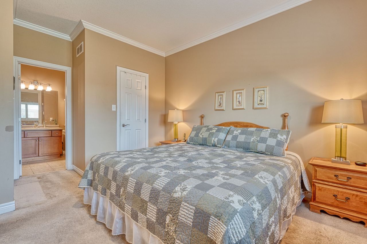 Rarely offered unit in quiet complex! This 2 bed, 2.5 bath bungalow town with finished walk out basement backs onto greenspace that you can enjoy from either the upper or lower patio areas. Hardwood flooring, gas fireplace, generous size primary bedroom with ensuite. The second bedroom is currently used as a dining room. Finished basement with large family room, full bathroom and another room for either an office, gym, hobby room or bedroom. This home sits in a well run quiet complex. Single garage with inside entry. Furnace & AC (2021) Shingles (2022). Pets permitted. Don't delay! RSA.