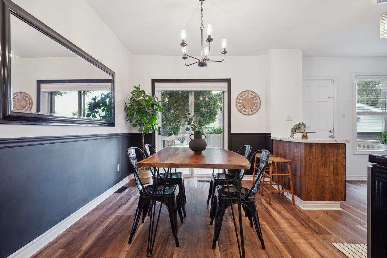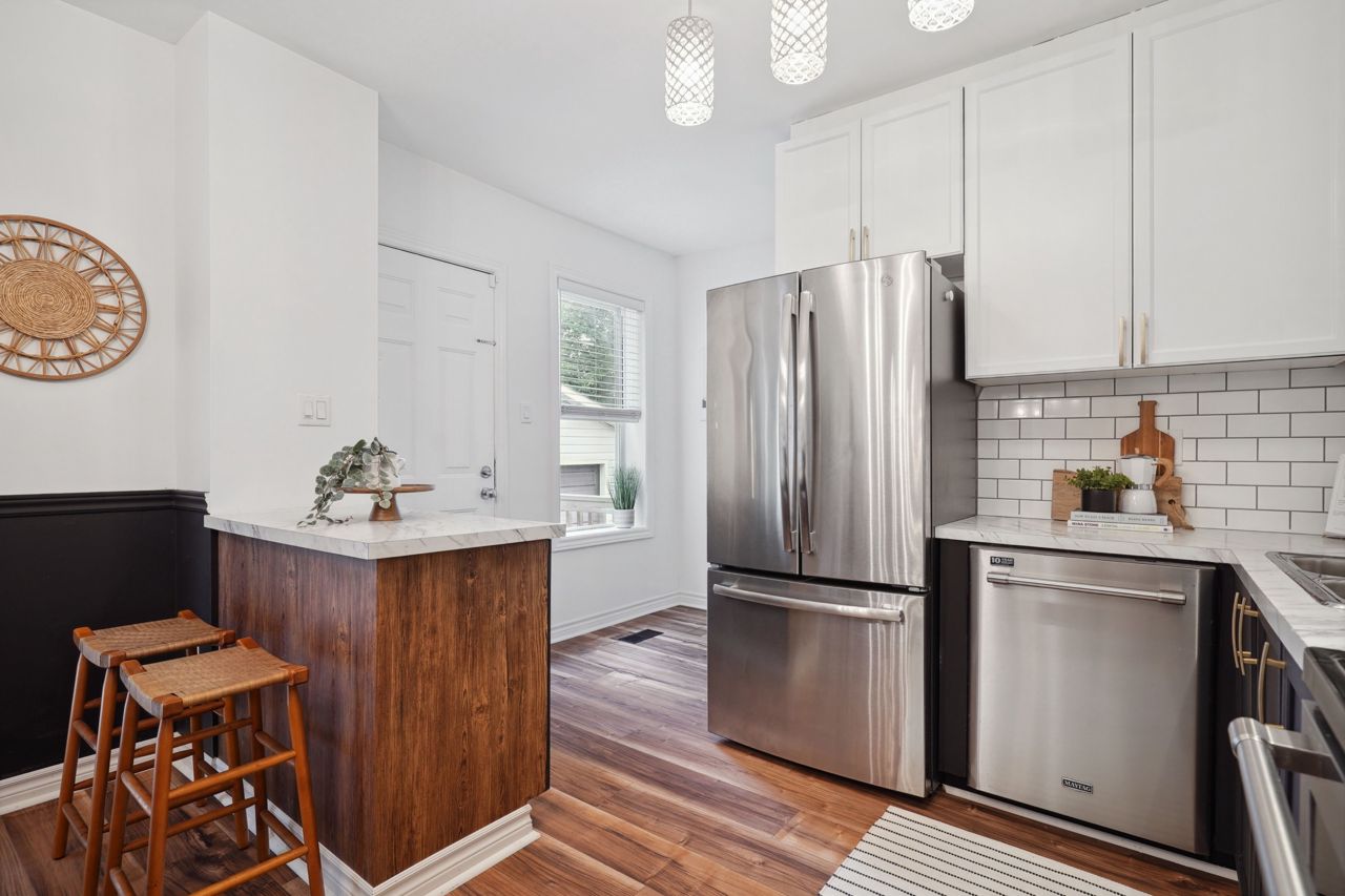 Rarely offered in this neighbourhood, Two Bedroom + Two Bathroom, 1.5 Storey Home with over 900 Sq Ft of Living Space and Tasteful Updates. Spacious Foyer with Coat Closet + Rare and Convenient 2-pc Bath (added in 2022) allows for a comfortable entry/exit space. Living Room with large window overlooks Front Porch. Entertaining is made easy in the Open Concept Kitchen + Dining Room with new Backsplash and all Stainless Steel Appliances. Two Walkouts to Backyard Deck allow for Seamless Indoor/Outdoor Living. Prim Bedroom with Closet overlooks the Backyard and Second Bedroom is Bright + Spacious. Renovated + Stylish 4-Pc Bathroom on Second Floor. Private Fully Fenced, Low Maintenance Backyard has plenty of room for entertaining. One Car Garage + space for 3 cars on Private Driveway. Well-built Garage can double as a Workshop and contains its own Electrical Sub Panel. Steps away from Juravinski Hospital and all the shopping and restaurant amenities of Concession St. ***OFFERS ANY TIME***Water Resistant Laminate Flooring (2023). Paint throughout (2023). Kitchen Backsplash (2023). Both Bathrooms (2022). Roof (2015). Refrigerator, stove, dishwasher, washer, dryer.