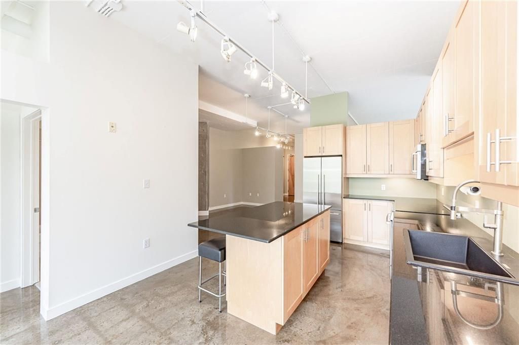 Check out this one of a kind unit in the Core Lofts. Super soho model (one of the largest available). 1,508 sq. ft. and shows beautifully. Luxury ensuite with separate bath & large shower, as well as another 2nd full bathroom. Add an open den/office giving spacious living areas. Polished concrete flooring with floor to ceiling windows and a Juliette balcony and 10 ft ceilings. Lovely eat in kitchen with separate island & granite counters, having plenty of storage, is open to the living and dining area (perfect for entertaining). Appliances Bosch dishwasher, microwave, induction stove and Fisher & Paykel fridge. Laundry is placed out of the way in the ensuite (easily missed, look out for it). Lots of trees & greenery as your view in the summer and fall to look out at. Walk to downtown, transportation, minutes to 403. Note: large locker included on same floor as condo.