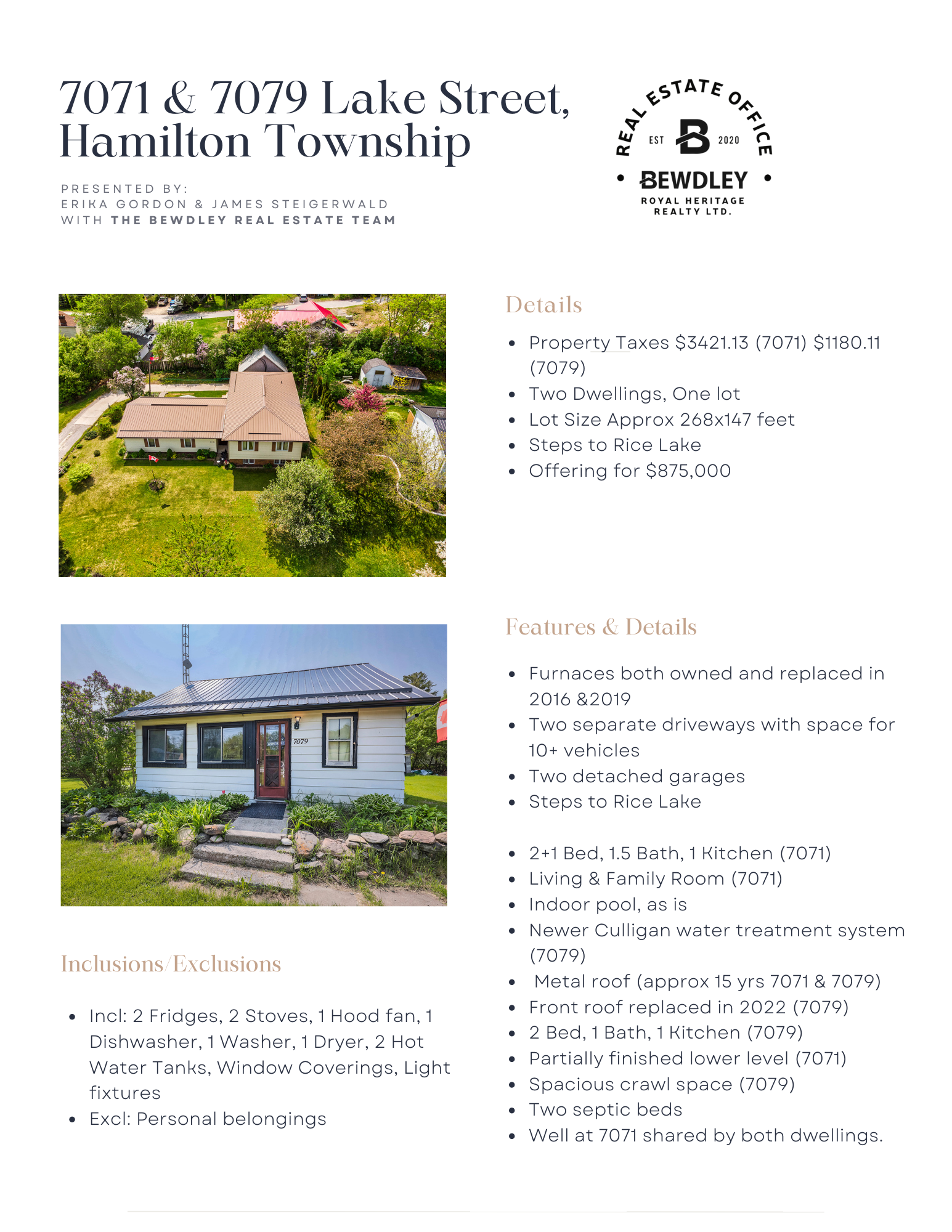 * Rare Opportunity * to own two dwellings on large 268'x147' lot by Rice Lake. The Main dwelling offers a spacious three level floor plan with tons of potential. This sprawling, split level home has been lovingly cared for by its original owners and is awaiting your personal touch! The second dwelling offers a single level complete with two bedrooms, one bathroom, a kitchen and living room, making it the perfect Granny suite for family or investment opportunity. Each dwelling is completely functional on its own offering separate septic, hydro, driveways, address' and more! If You've Been Searching For A Special Property To Call Home This Is The One!Sold together with 7079 Lake Street, Hamilton Township. Furnace 2019 & 2016, Owned Hot Water Tanks (1 Gas, 1 Electric), Newer Culligan water treatment system, Metal roof (approx 15 yrs for both), 1 Well currently shared by both dwellings
