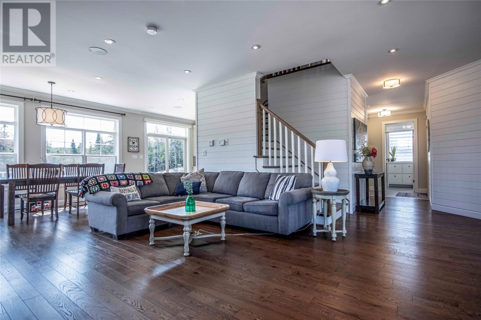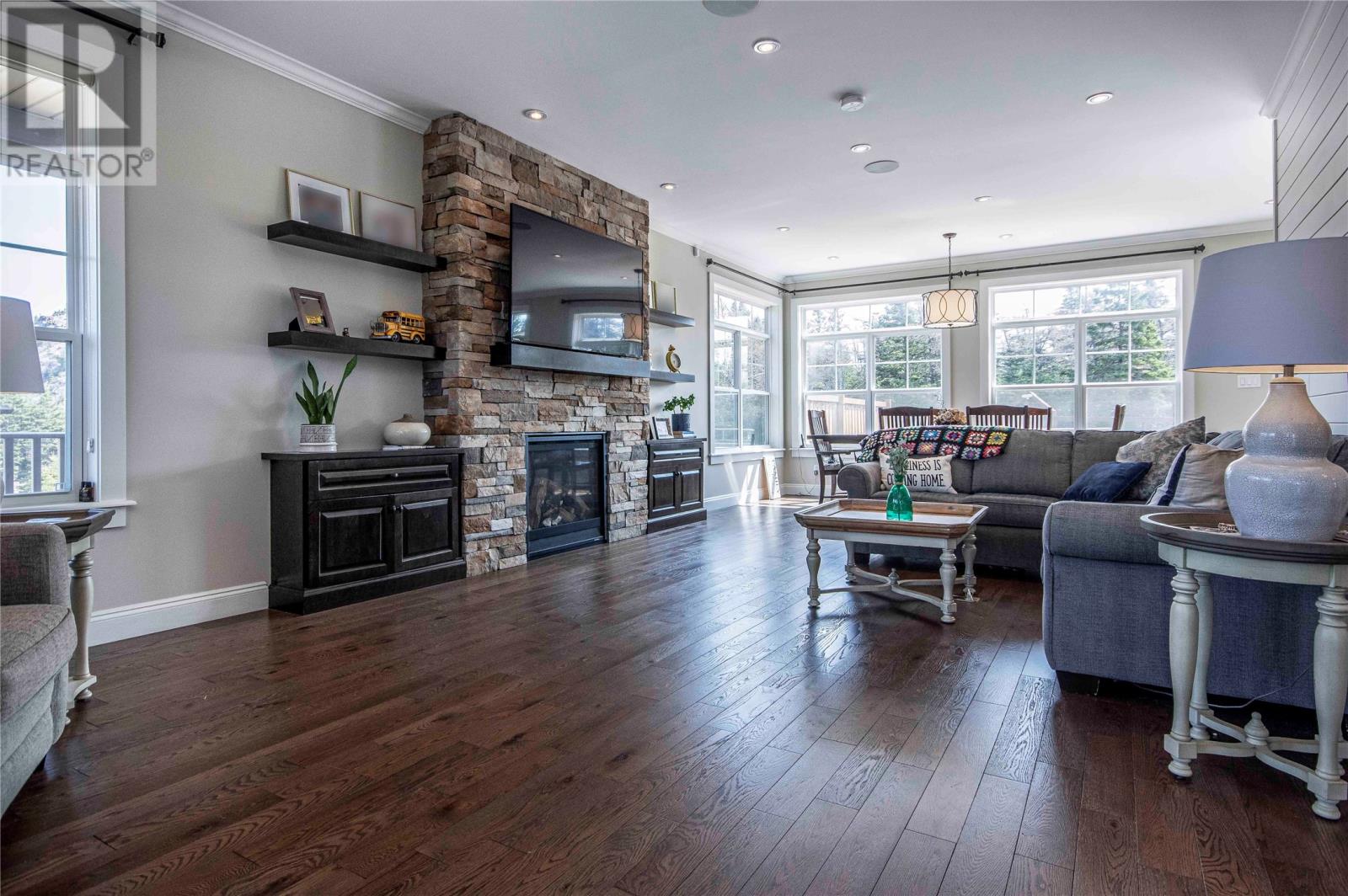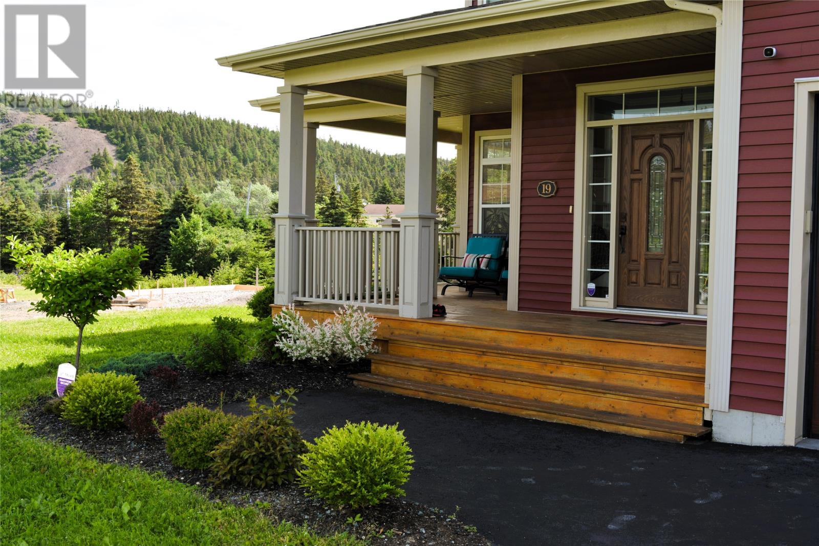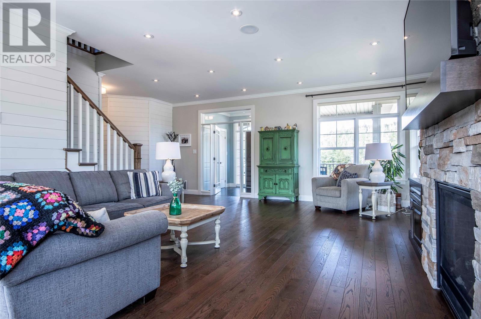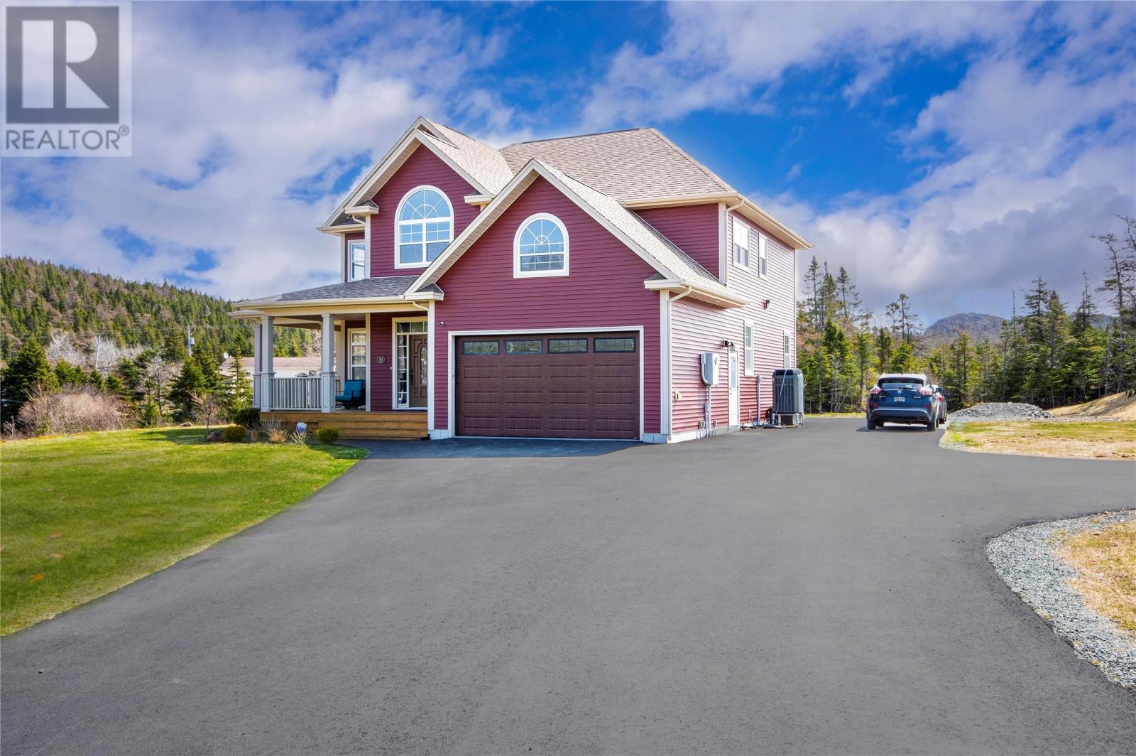 Welcome to 19 Country Path located in the scenic Town of Holyrood. This executive, pristine custom home is situated on an oversized private lot backing directly onto trees and the North Arm River. This spacious home is sure to impress from the moment you enter the picturesque property that shows like new. The property is fully landscaped with ample space to build a garage at the rear. The open concept has beautiful shiplap walls, quality hardwood floors and ceramic tiles, custom lighting and pot lights, spacious walk-in front porch and closet as well as a large area with custom ‘drop zone’ leading to attached garage. The exquisite kitchen and living spaces are designed for family and entertaining with a large granite island, abundance of quality cabinets and large custom walk-in pantry. The living space boasts a beautiful, custom propane fireplace with custom built quality shelving and cabinets. The beauty continues onto the second floor of the home with large windows in each of the three bedrooms and two bathrooms. The large principal suite has a cozy sitting room, beautiful ensuite with custom tile shower with waterfall showerhead, soaker tub and double vanity, and a large walk-in custom closet. There is a sizeable, finished room that is accessible via one bedroom (above the garage) that can be used as an office, playroom or sitting area. The second level is also complemented with a large laundry room that features custom shelving. The basement is fully complete with quality finishes throughout and features one spacious bedroom, full 3-piece bathroom, ample living space and plenty of storage. Located near schools, daycares, playground, soccer, baseball, dog park and, seconds away from the old railbed trail for hiking, ATVs and snowmobiling! 15 minutes to CBS; 25 minutes to St John’s. Other features include built in sound on main floor and rear patio, 400 amp service, lift pump in basement and home security system. (id:22211)