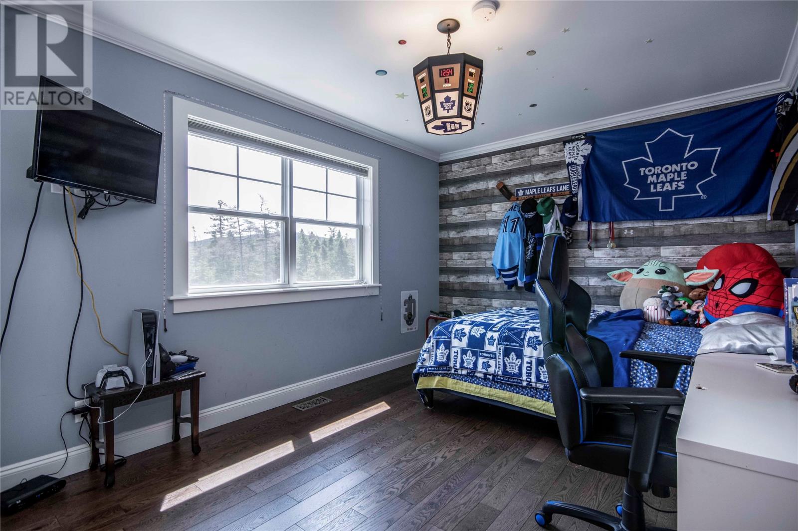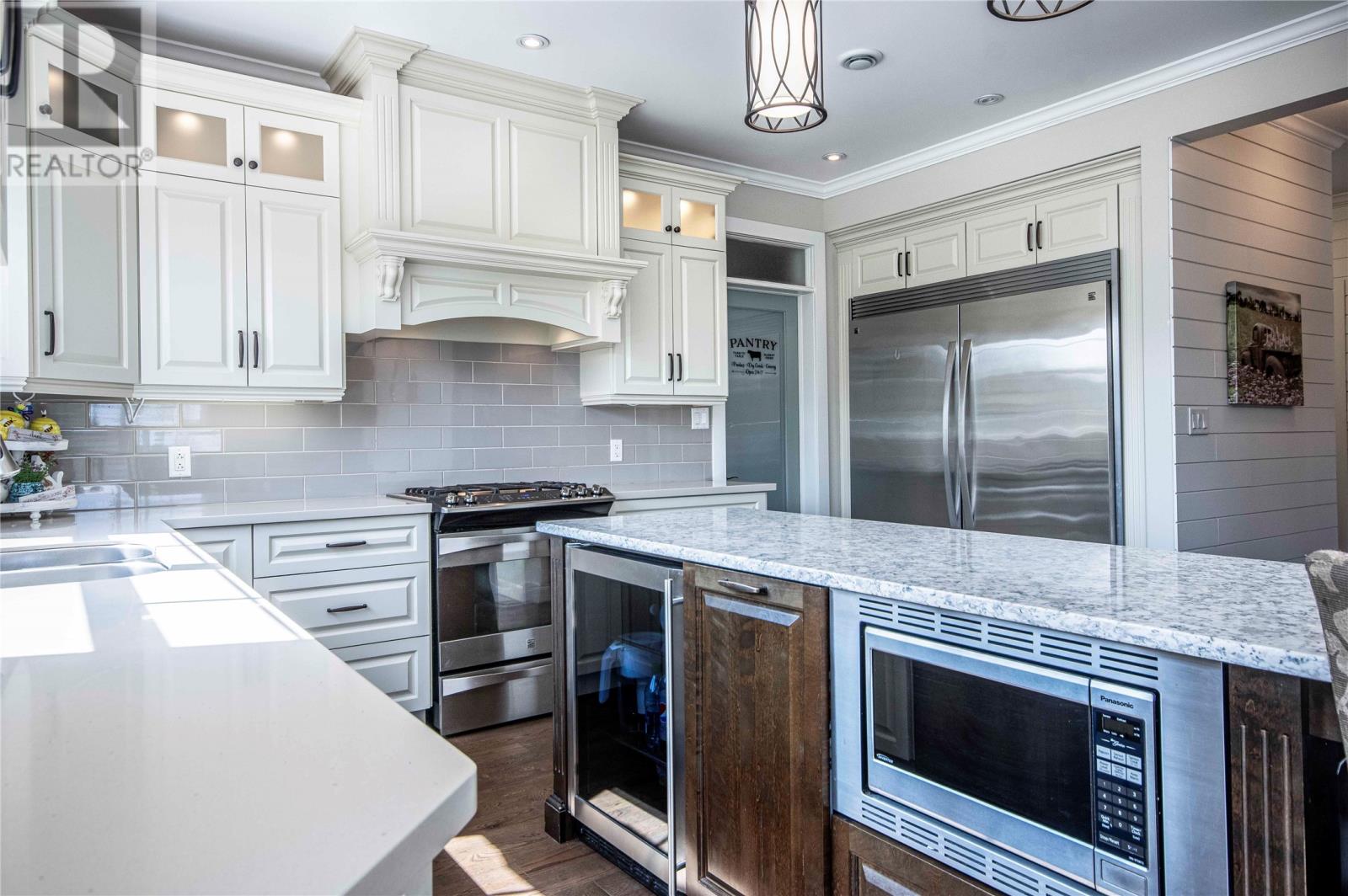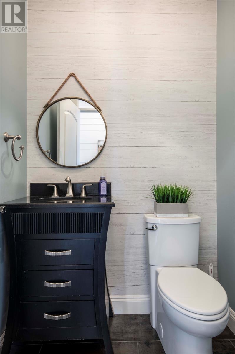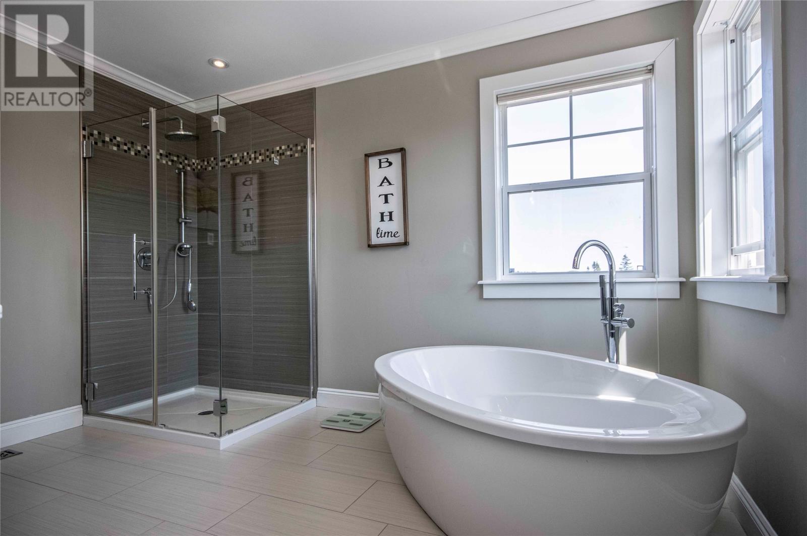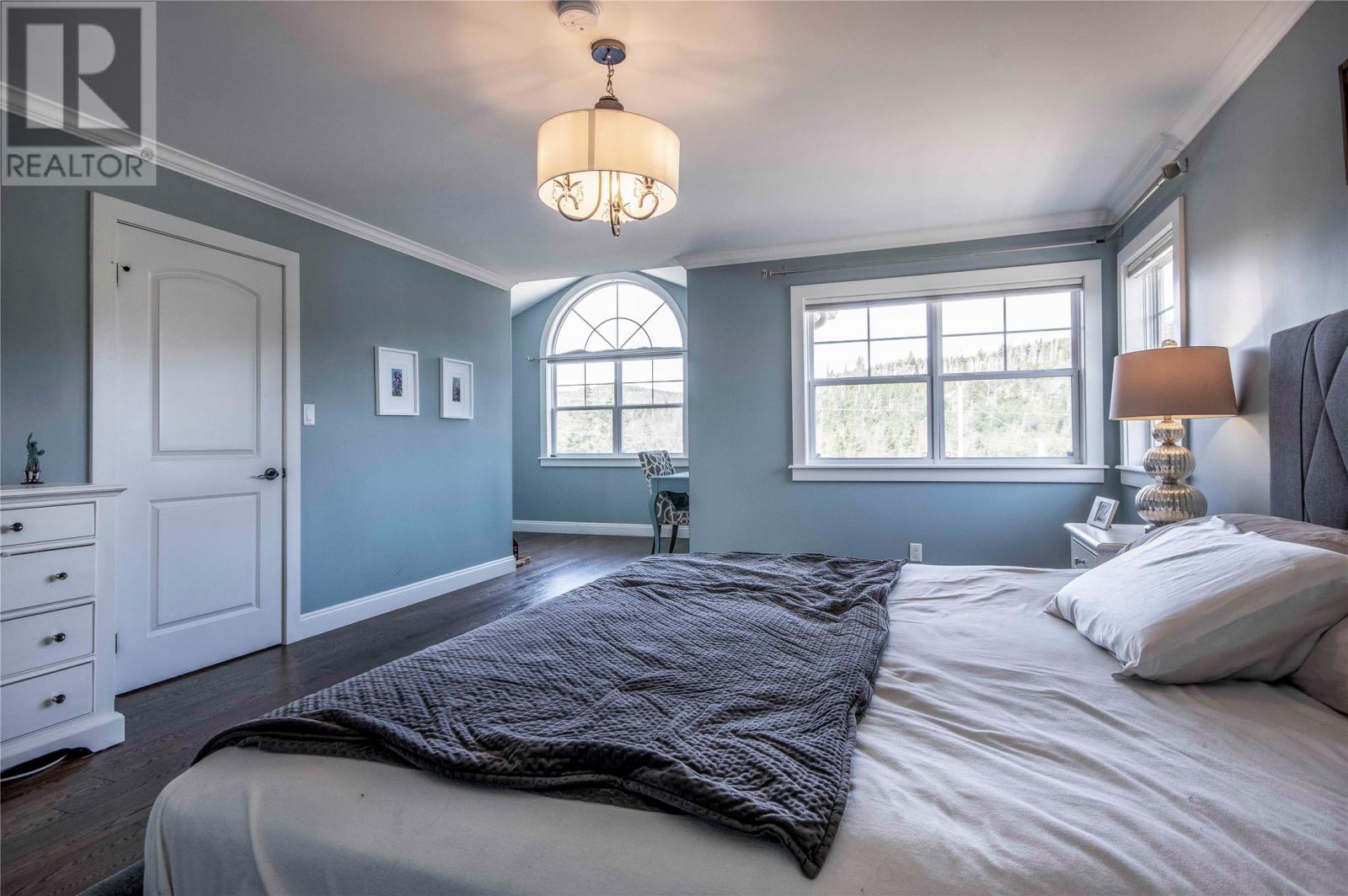 Welcome to 19 Country Path located in the scenic Town of Holyrood. This executive, pristine custom home is situated on an oversized private lot backing directly onto trees and the North Arm River. This spacious home is sure to impress from the moment you enter the picturesque property that shows like new. The property is fully landscaped with ample space to build a garage at the rear. The open concept has beautiful shiplap walls, quality hardwood floors and ceramic tiles, custom lighting and pot lights, spacious walk-in front porch and closet as well as a large area with custom ‘drop zone’ leading to attached garage. The exquisite kitchen and living spaces are designed for family and entertaining with a large granite island, abundance of quality cabinets and large custom walk-in pantry. The living space boasts a beautiful, custom propane fireplace with custom built quality shelving and cabinets. The beauty continues onto the second floor of the home with large windows in each of the three bedrooms and two bathrooms. The large principal suite has a cozy sitting room, beautiful ensuite with custom tile shower with waterfall showerhead, soaker tub and double vanity, and a large walk-in custom closet. There is a sizeable, finished room that is accessible via one bedroom (above the garage) that can be used as an office, playroom or sitting area. The second level is also complemented with a large laundry room that features custom shelving. The basement is fully complete with quality finishes throughout and features one spacious bedroom, full 3-piece bathroom, ample living space and plenty of storage. Located near schools, daycares, playground, soccer, baseball, dog park and, seconds away from the old railbed trail for hiking, ATVs and snowmobiling! 15 minutes to CBS; 25 minutes to St John’s. Other features include built in sound on main floor and rear patio, 400 amp service, lift pump in basement and home security system. (id:22211)