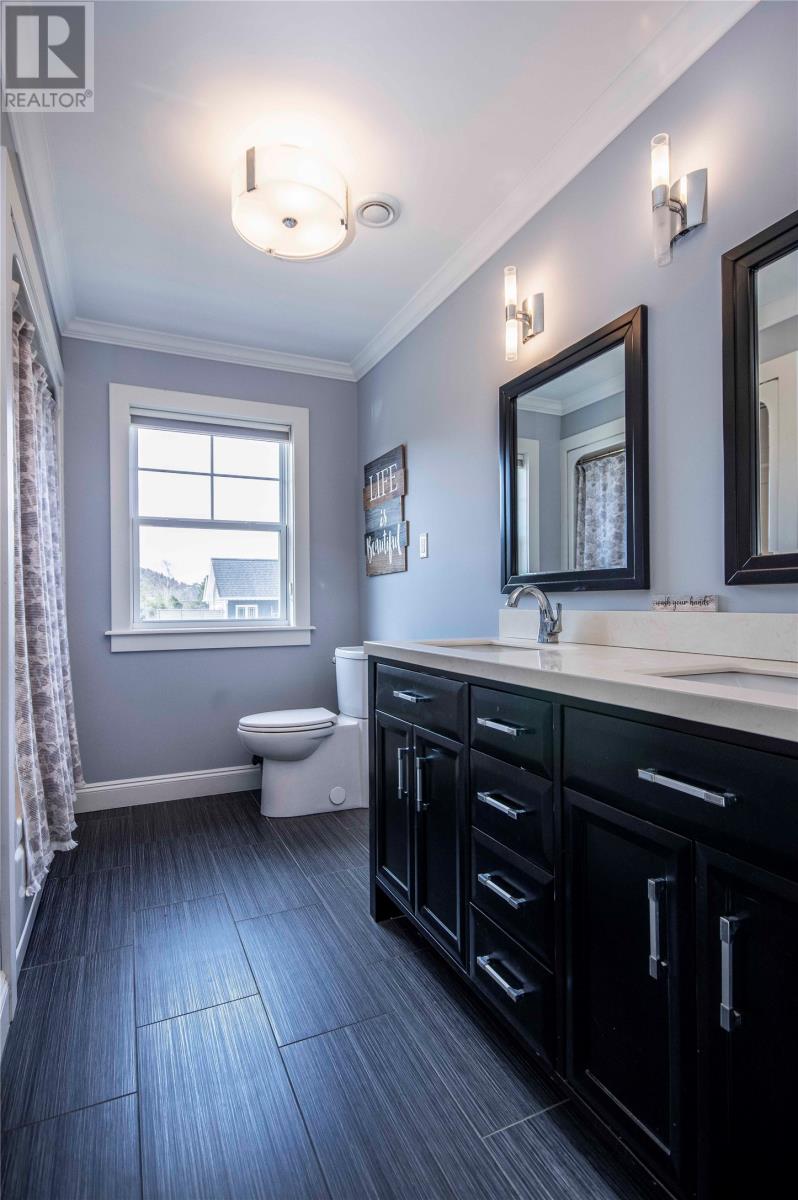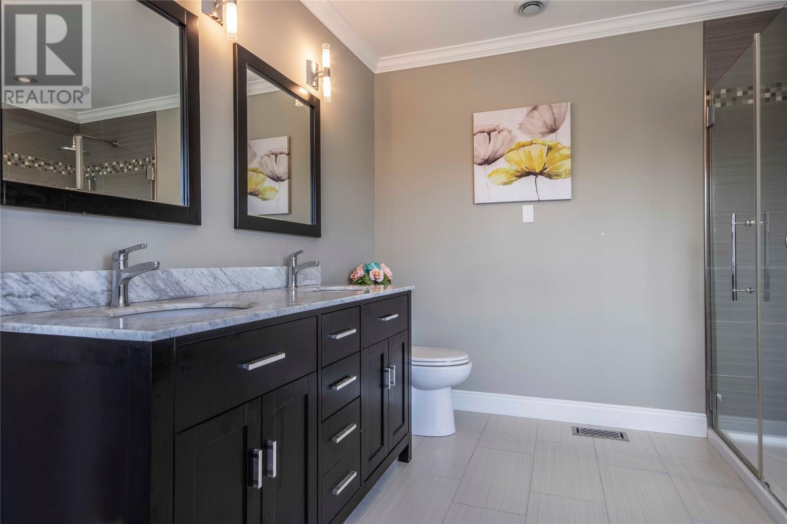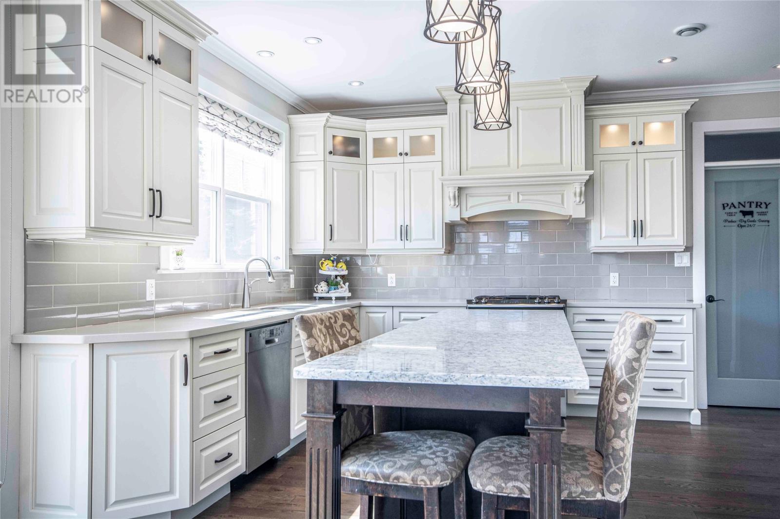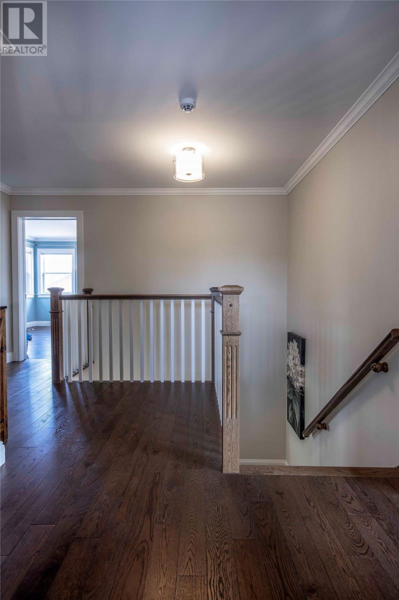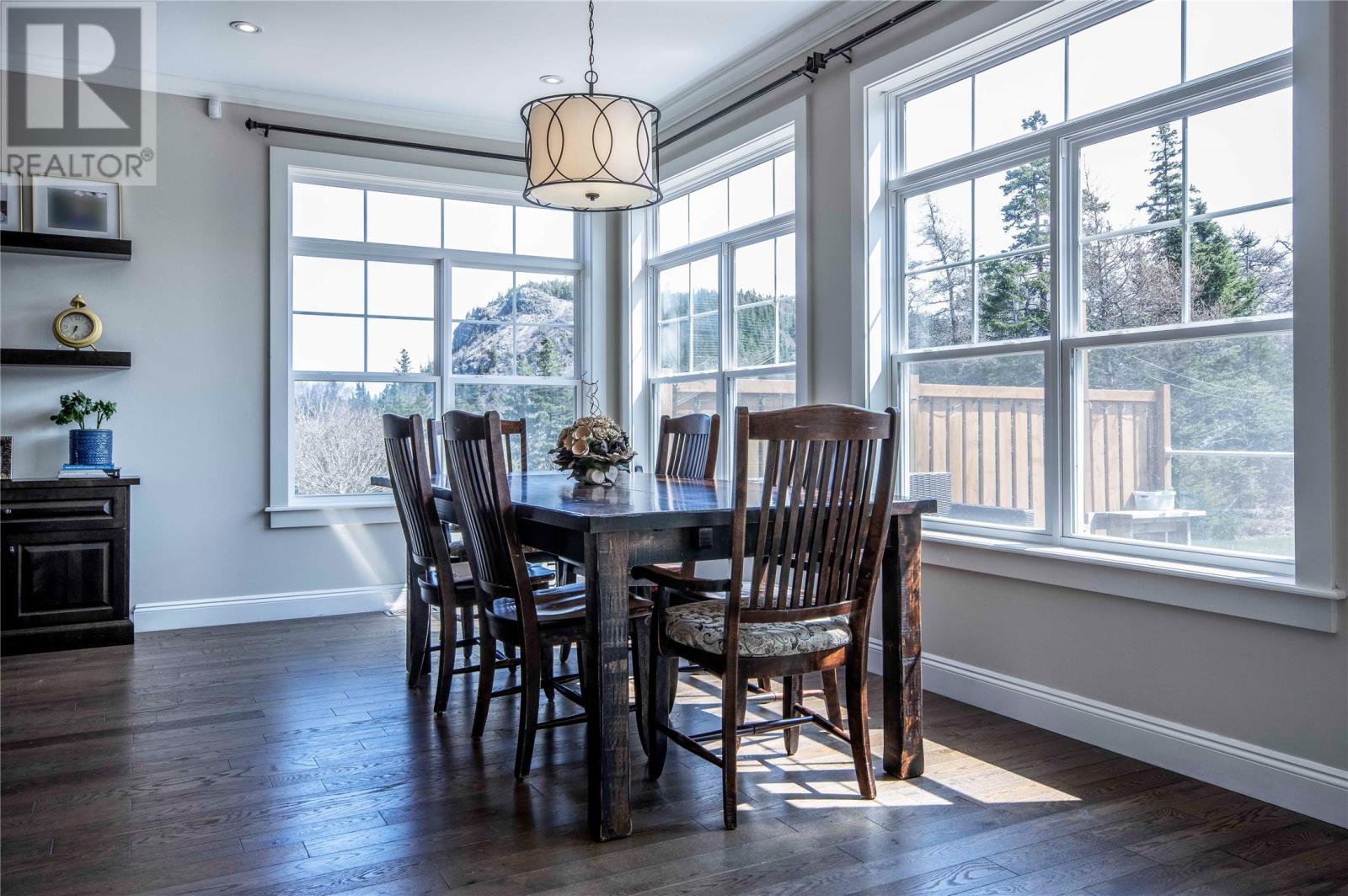 Welcome to 19 Country Path located in the scenic Town of Holyrood. This executive, pristine custom home is situated on an oversized private lot backing directly onto trees and the North Arm River. This spacious home is sure to impress from the moment you enter the picturesque property that shows like new. The property is fully landscaped with ample space to build a garage at the rear. The open concept has beautiful shiplap walls, quality hardwood floors and ceramic tiles, custom lighting and pot lights, spacious walk-in front porch and closet as well as a large area with custom ‘drop zone’ leading to attached garage. The exquisite kitchen and living spaces are designed for family and entertaining with a large granite island, abundance of quality cabinets and large custom walk-in pantry. The living space boasts a beautiful, custom propane fireplace with custom built quality shelving and cabinets. The beauty continues onto the second floor of the home with large windows in each of the three bedrooms and two bathrooms. The large principal suite has a cozy sitting room, beautiful ensuite with custom tile shower with waterfall showerhead, soaker tub and double vanity, and a large walk-in custom closet. There is a sizeable, finished room that is accessible via one bedroom (above the garage) that can be used as an office, playroom or sitting area. The second level is also complemented with a large laundry room that features custom shelving. The basement is fully complete with quality finishes throughout and features one spacious bedroom, full 3-piece bathroom, ample living space and plenty of storage. Located near schools, daycares, playground, soccer, baseball, dog park and, seconds away from the old railbed trail for hiking, ATVs and snowmobiling! 15 minutes to CBS; 25 minutes to St John’s. Other features include built in sound on main floor and rear patio, 400 amp service, lift pump in basement and home security system. (id:22211)