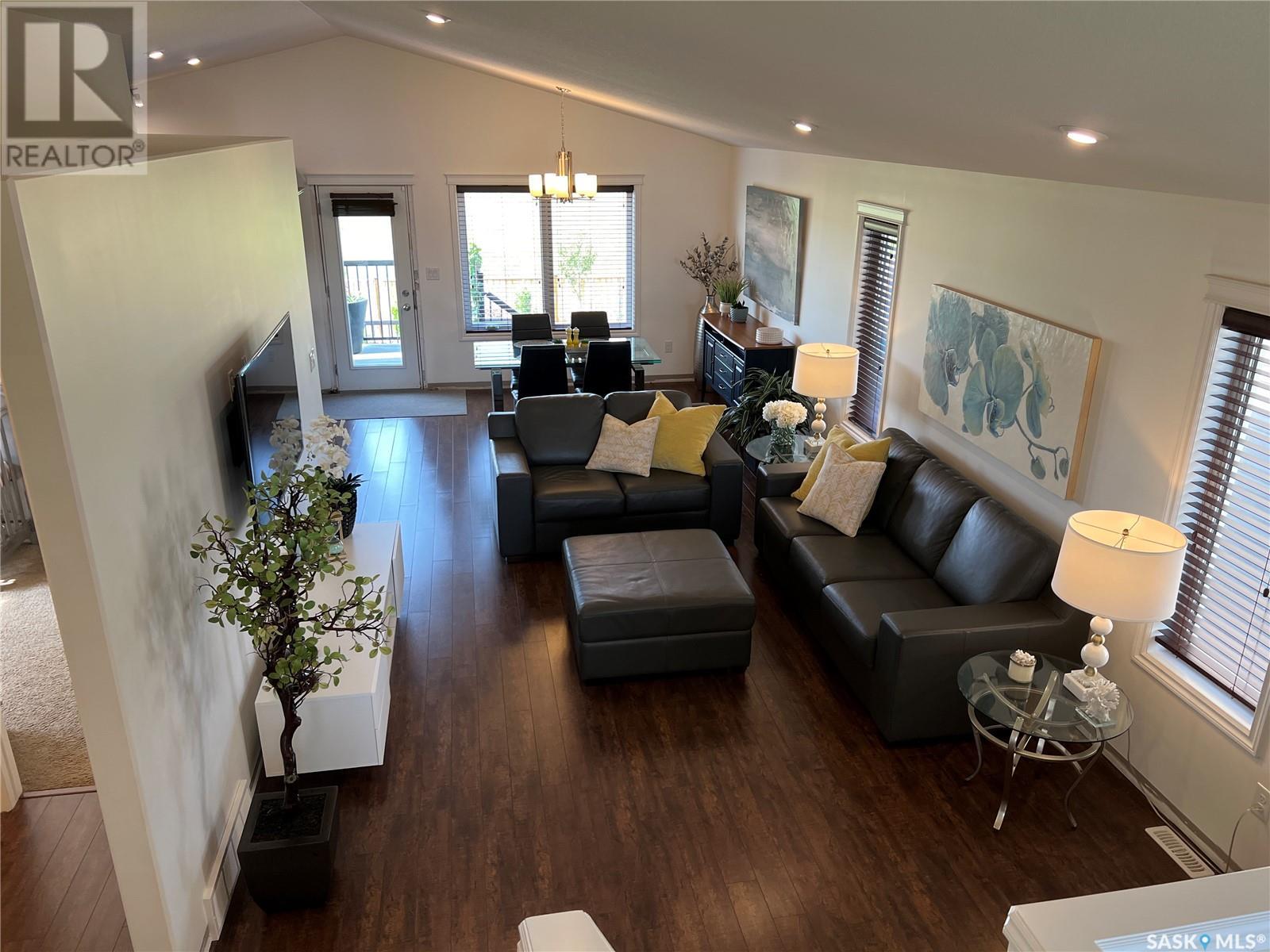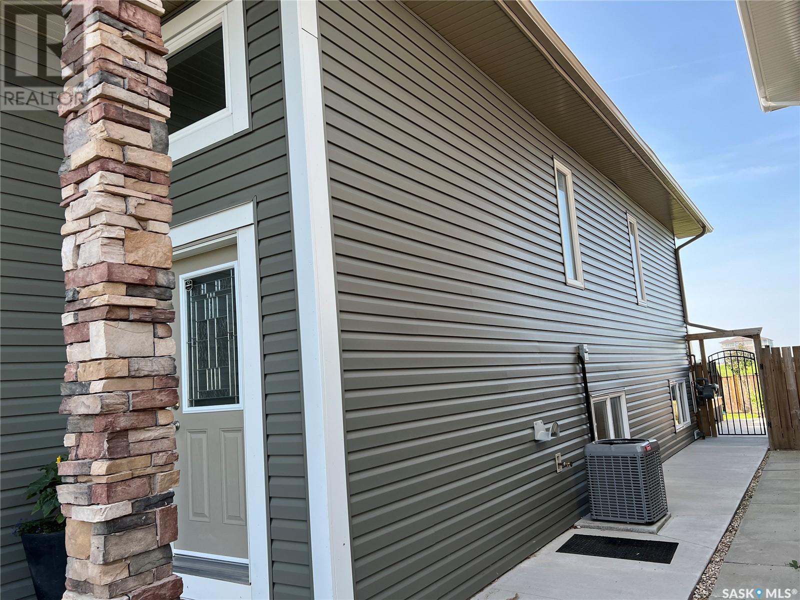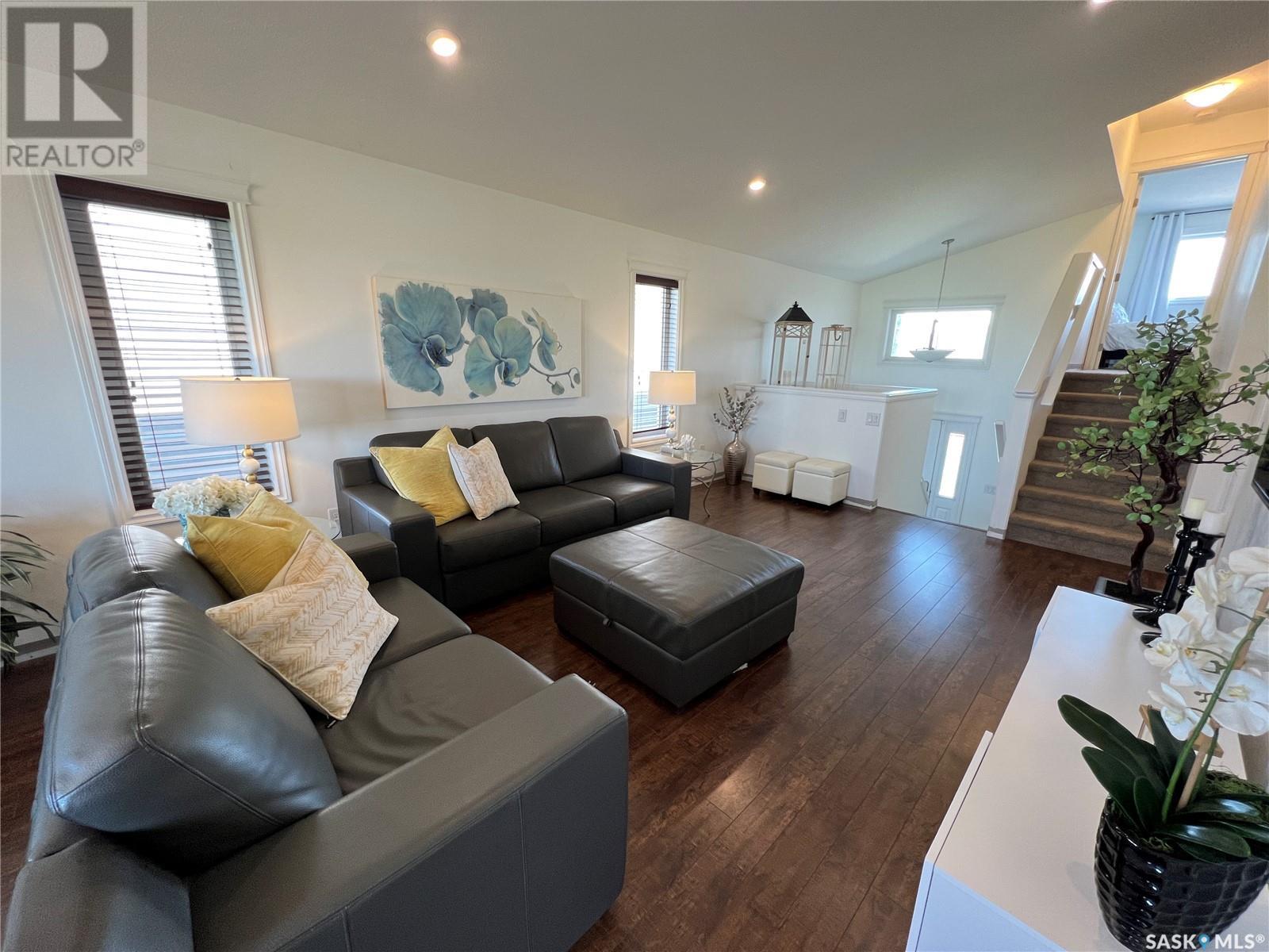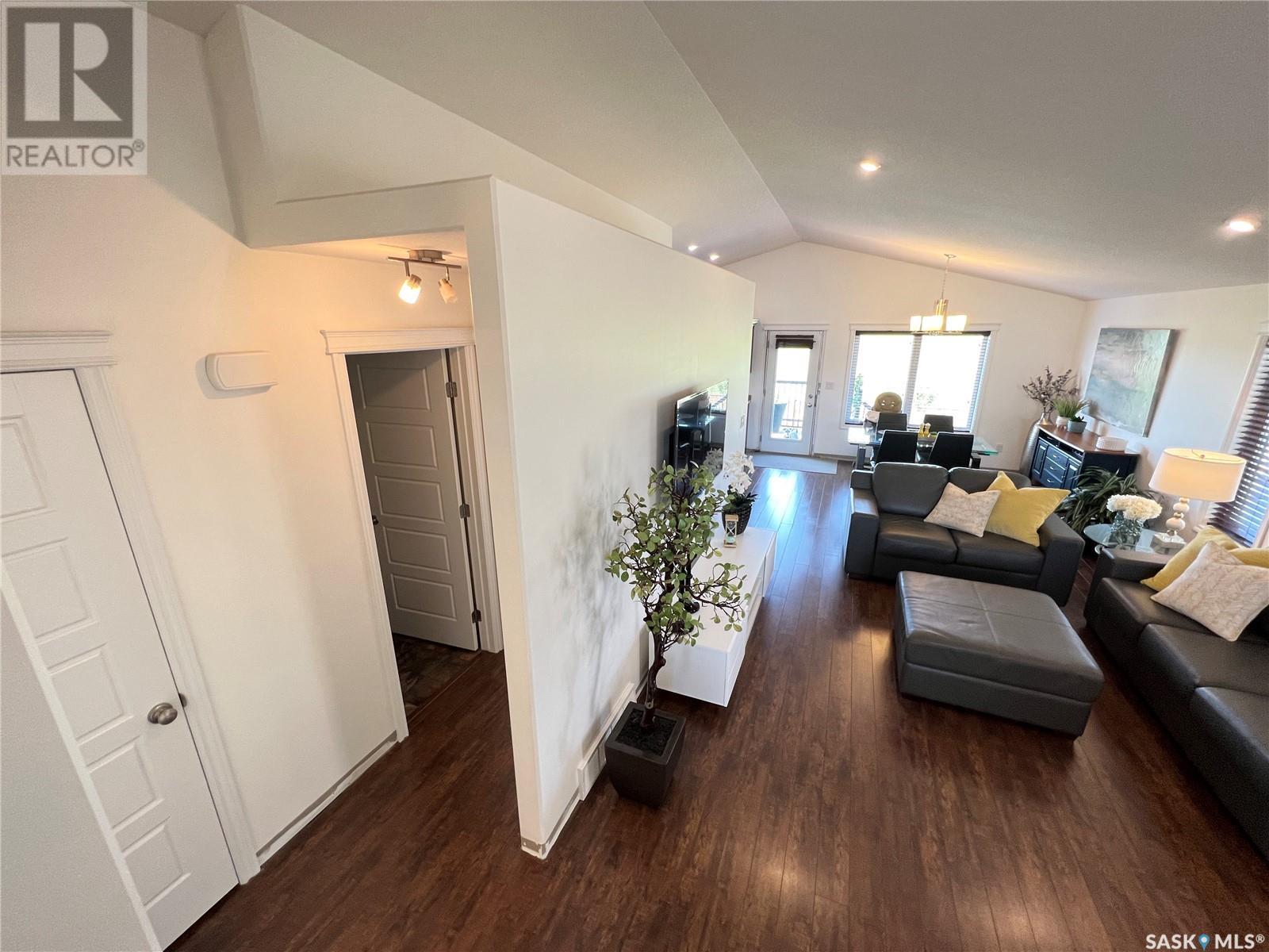 Fantastic modified bi-level 3+1 bedroom home located on a quiet crescent in newly developed area in Humboldt, Sask. This home shows like new and will check off all the boxes - 3 bedrooms, modern decor, easy to maintain flooring throughout, three 4 pc. bathrooms, open concept, vaulted ceilings, double attached garage, and beautifully landscaped yard. Great street appeal with double concrete drive and extra gravel spot for extra parking. Door from dining/kitchen area leads you to a 2 tier deck overlooking a gorgeous yard to views of open field space and nightly sunsets. Air conditioning, all appliances, wet bar in basement (mini fridge included), central vac, storage space under the deck and a home that can be shown with pride. Seller has enough vinyl plank and baseboard to match basement to put throughout main floor! Buyer to install. IT WON'T LAST LONG - SO BOOK YOUR SHOWING!! Buyer to verify all measurements. (id:22211)