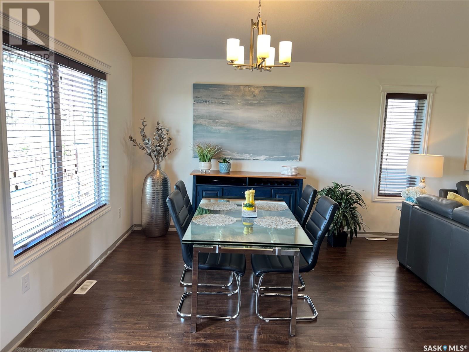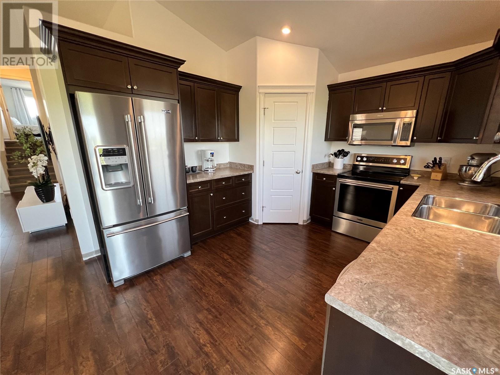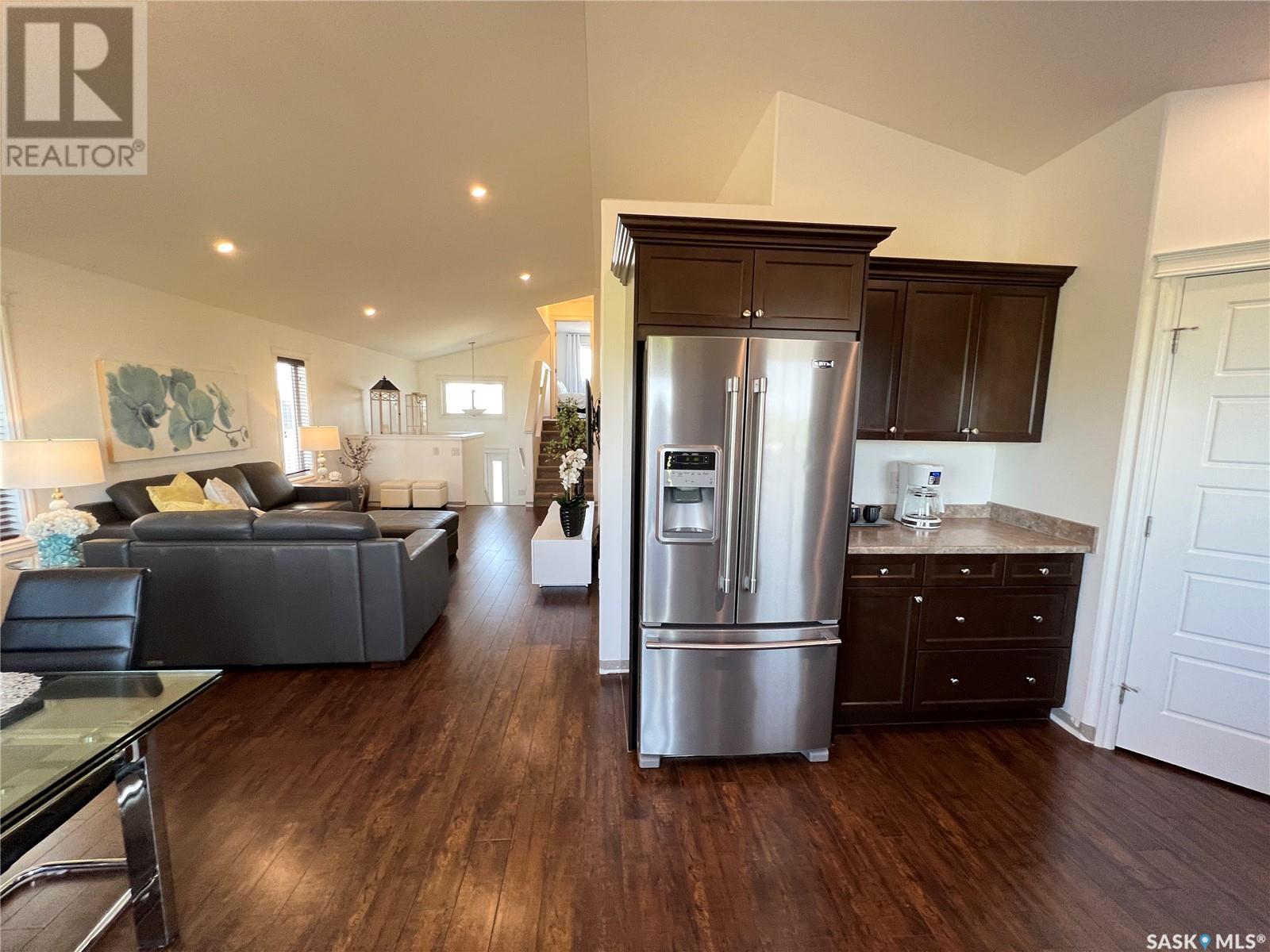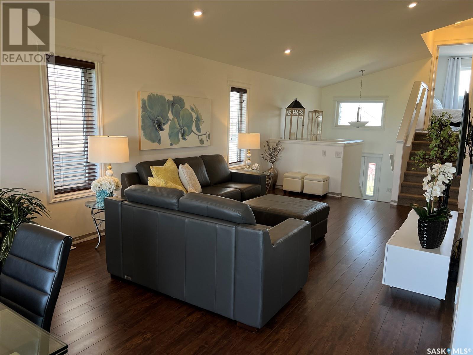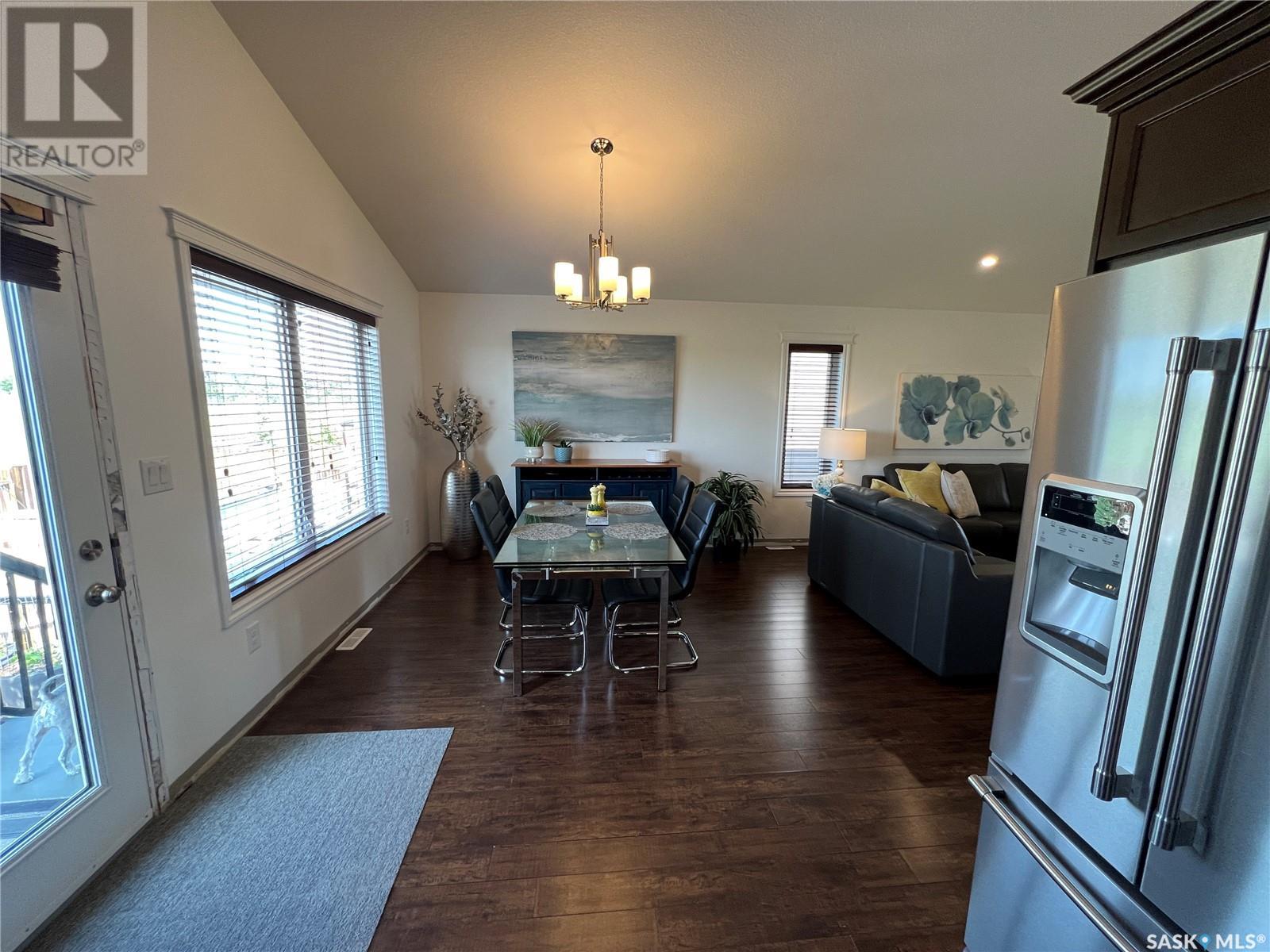 Fantastic modified bi-level 3+1 bedroom home located on a quiet crescent in newly developed area in Humboldt, Sask. This home shows like new and will check off all the boxes - 3 bedrooms, modern decor, easy to maintain flooring throughout, three 4 pc. bathrooms, open concept, vaulted ceilings, double attached garage, and beautifully landscaped yard. Great street appeal with double concrete drive and extra gravel spot for extra parking. Door from dining/kitchen area leads you to a 2 tier deck overlooking a gorgeous yard to views of open field space and nightly sunsets. Air conditioning, all appliances, wet bar in basement (mini fridge included), central vac, storage space under the deck and a home that can be shown with pride. Seller has enough vinyl plank and baseboard to match basement to put throughout main floor! Buyer to install. IT WON'T LAST LONG - SO BOOK YOUR SHOWING!! Buyer to verify all measurements. (id:22211)