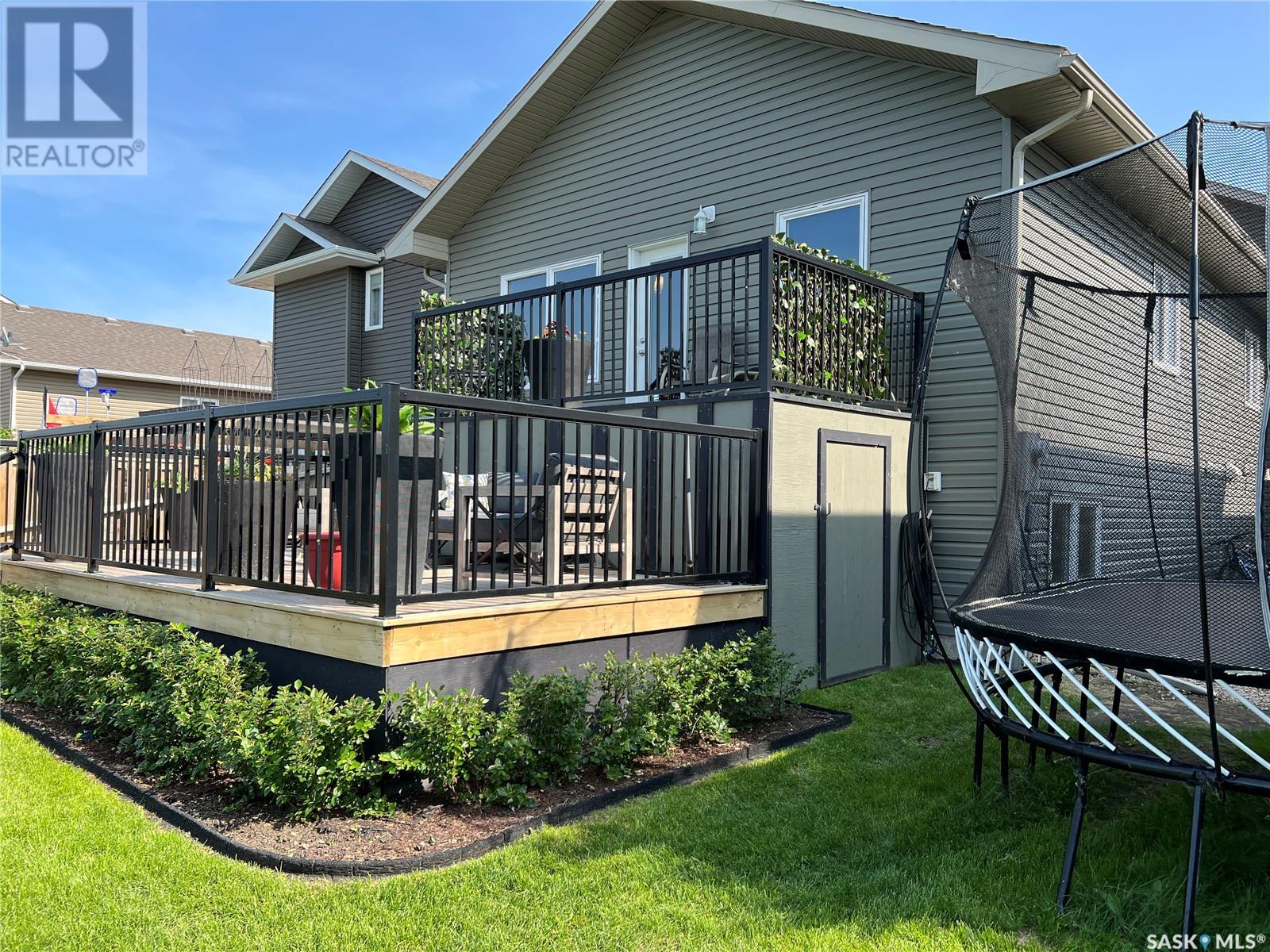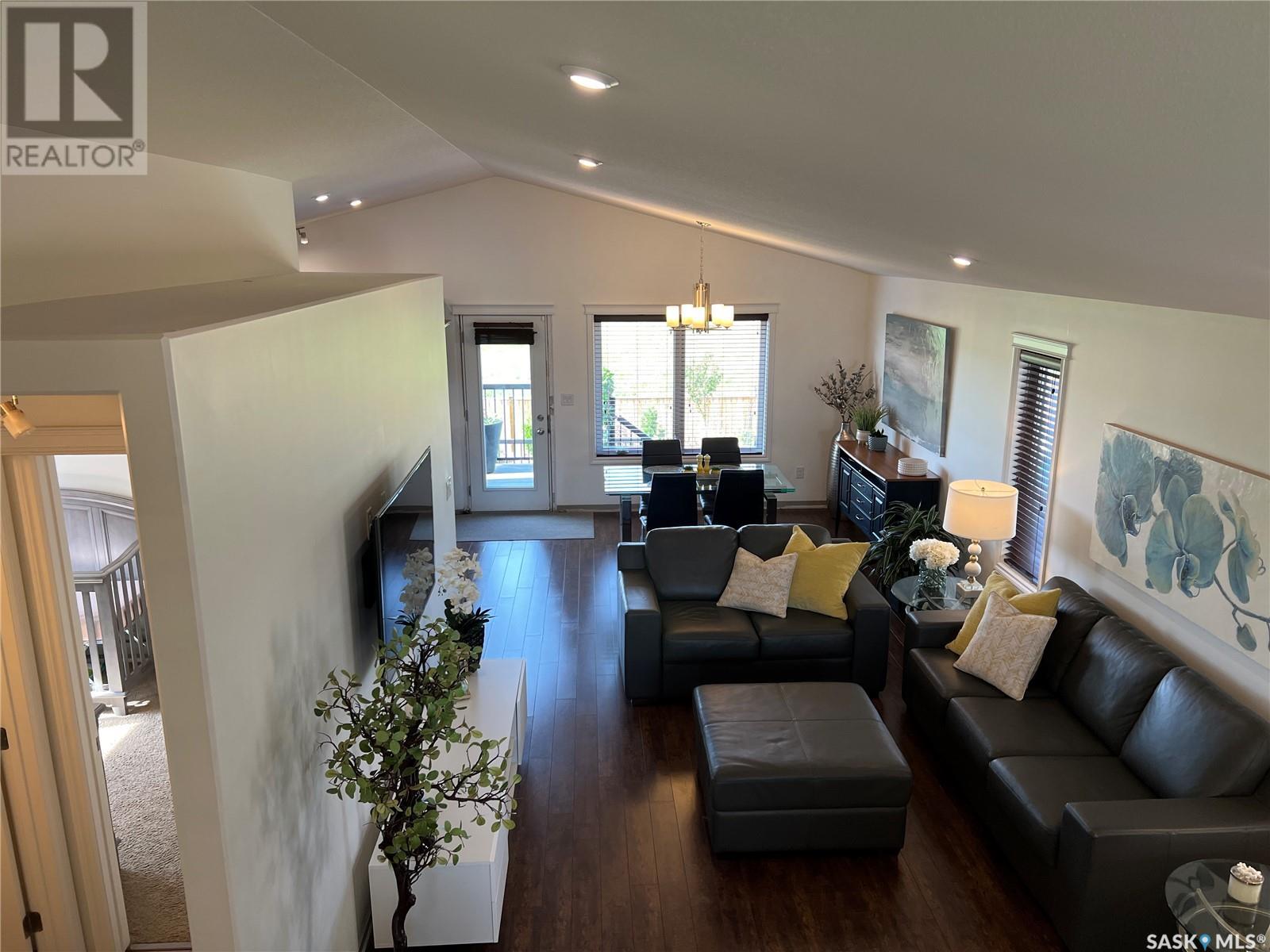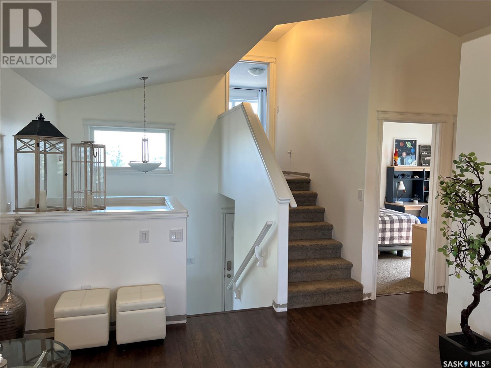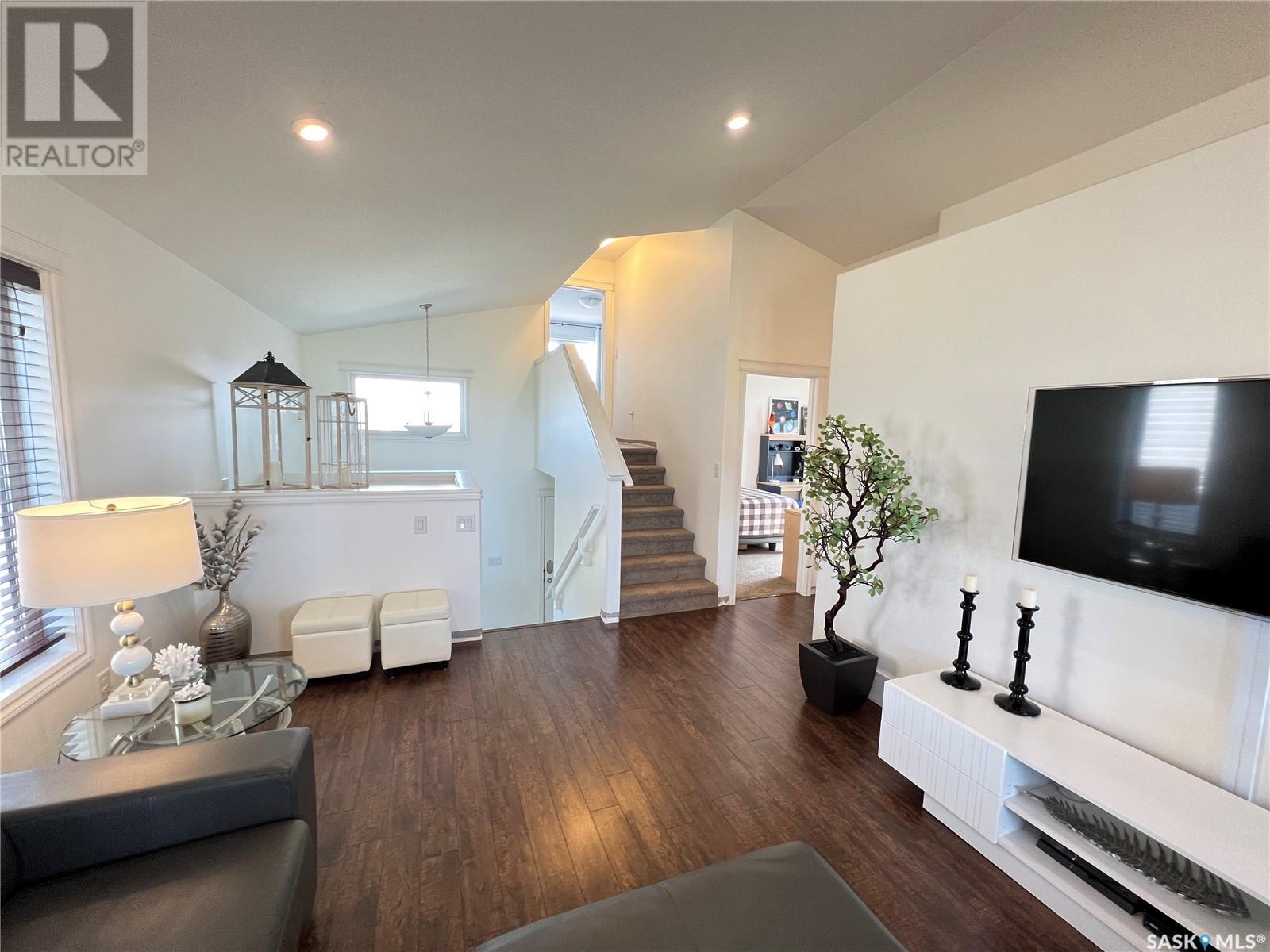 Fantastic modified bi-level 3+1 bedroom home located on a quiet crescent in newly developed area in Humboldt, Sask. This home shows like new and will check off all the boxes - 3 bedrooms, modern decor, easy to maintain flooring throughout, three 4 pc. bathrooms, open concept, vaulted ceilings, double attached garage, and beautifully landscaped yard. Great street appeal with double concrete drive and extra gravel spot for extra parking. Door from dining/kitchen area leads you to a 2 tier deck overlooking a gorgeous yard to views of open field space and nightly sunsets. Air conditioning, all appliances, wet bar in basement (mini fridge included), central vac, storage space under the deck and a home that can be shown with pride. Seller has enough vinyl plank and baseboard to match basement to put throughout main floor! Buyer to install. IT WON'T LAST LONG - SO BOOK YOUR SHOWING!! Buyer to verify all measurements. (id:22211)