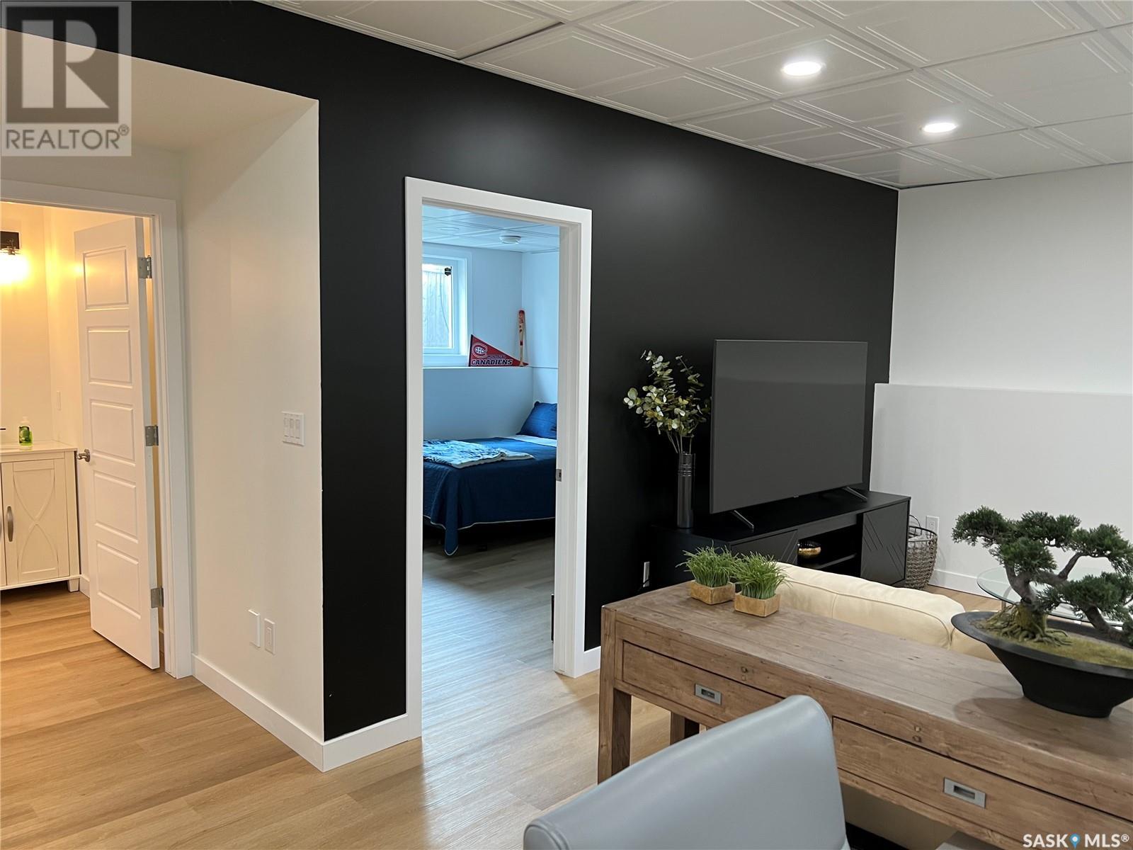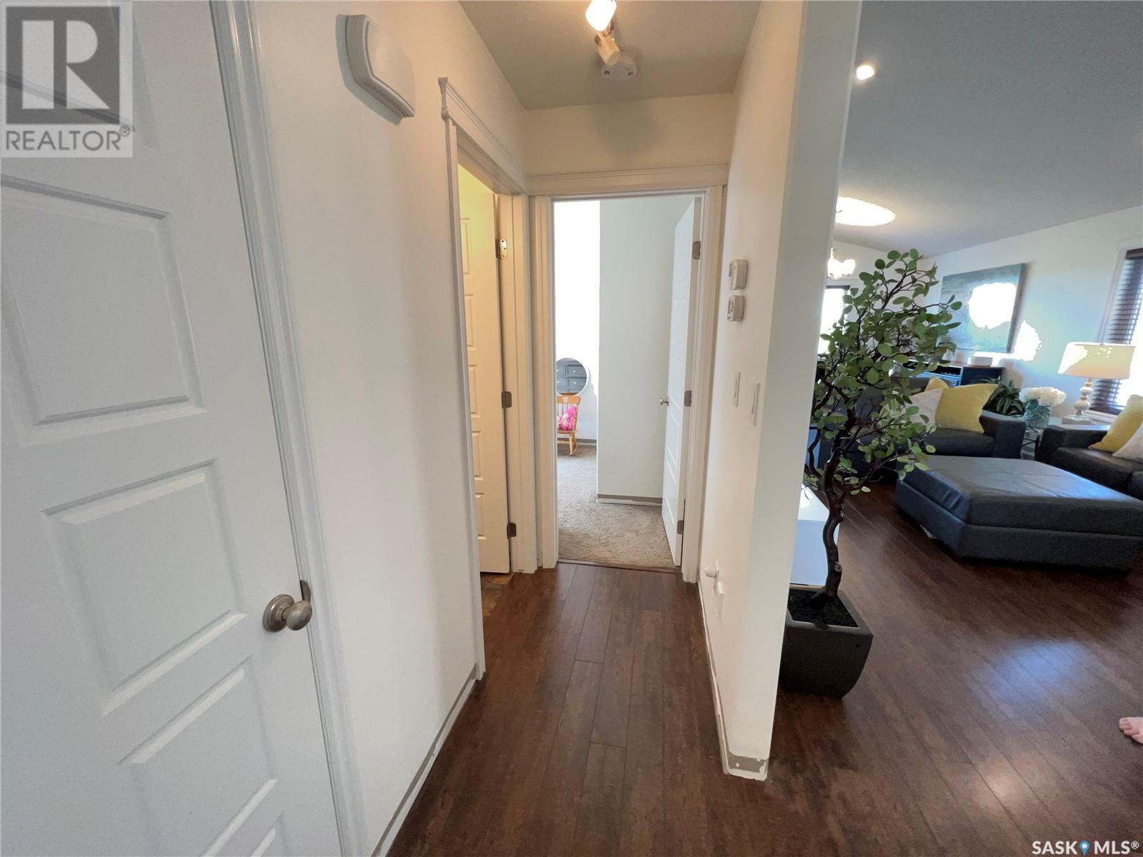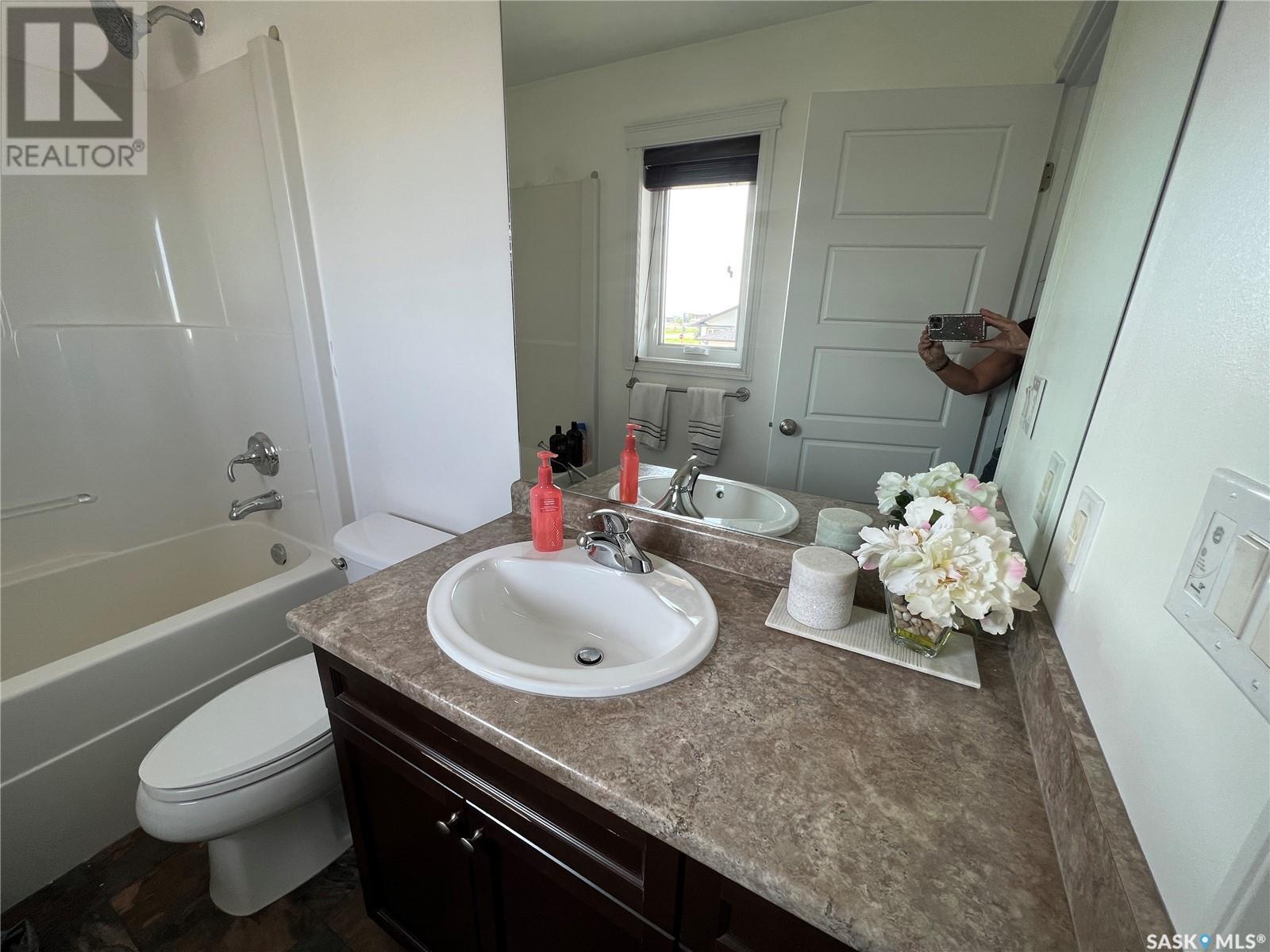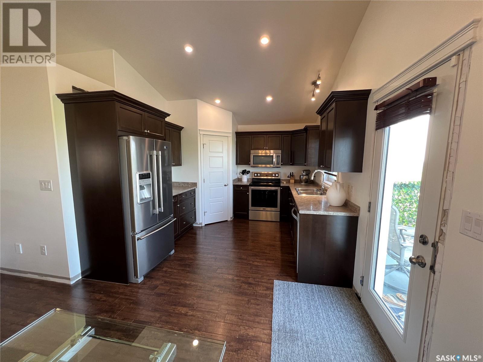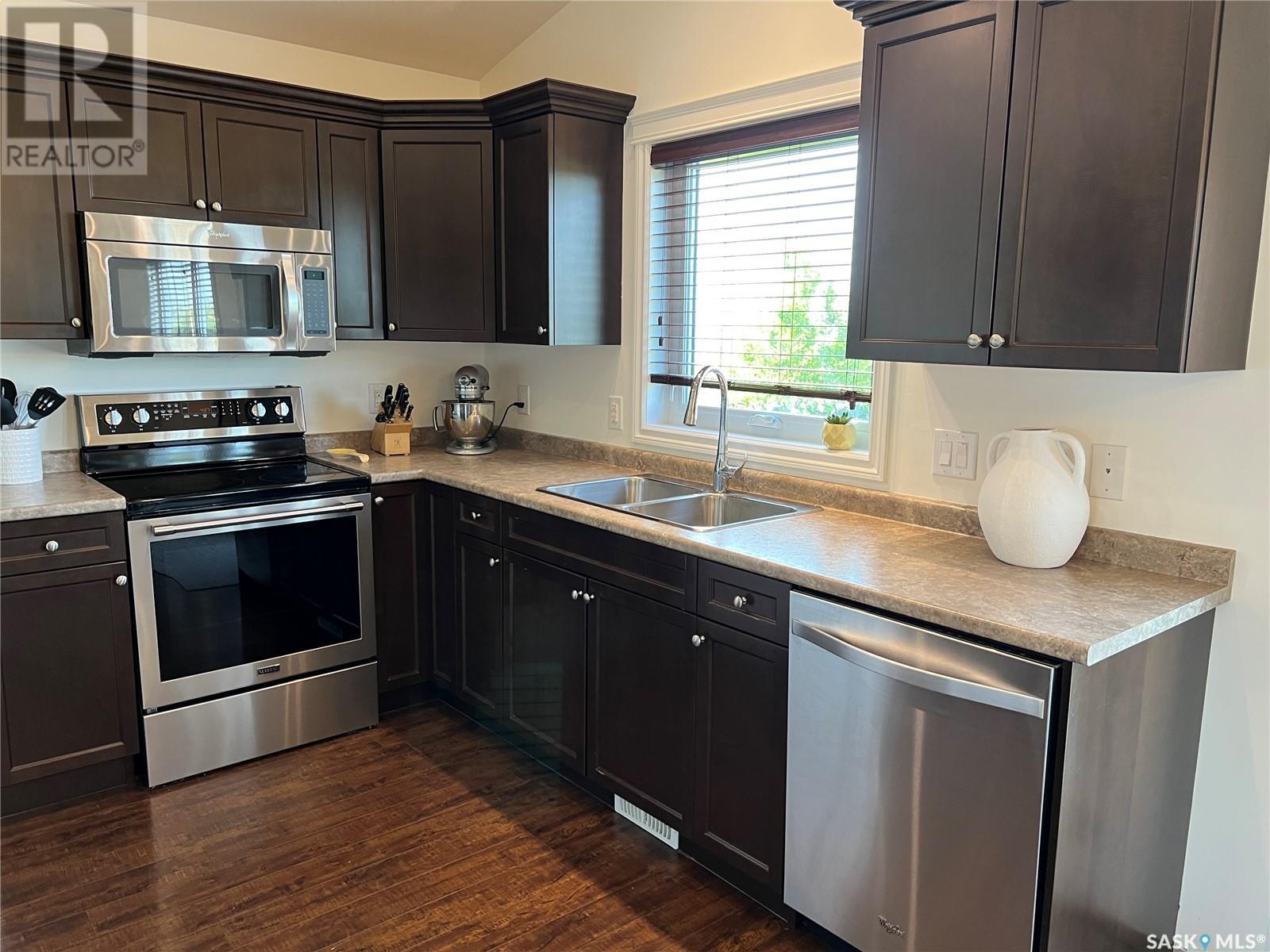 Fantastic modified bi-level 3+1 bedroom home located on a quiet crescent in newly developed area in Humboldt, Sask. This home shows like new and will check off all the boxes - 3 bedrooms, modern decor, easy to maintain flooring throughout, three 4 pc. bathrooms, open concept, vaulted ceilings, double attached garage, and beautifully landscaped yard. Great street appeal with double concrete drive and extra gravel spot for extra parking. Door from dining/kitchen area leads you to a 2 tier deck overlooking a gorgeous yard to views of open field space and nightly sunsets. Air conditioning, all appliances, wet bar in basement (mini fridge included), central vac, storage space under the deck and a home that can be shown with pride. Seller has enough vinyl plank and baseboard to match basement to put throughout main floor! Buyer to install. IT WON'T LAST LONG - SO BOOK YOUR SHOWING!! Buyer to verify all measurements. (id:22211)