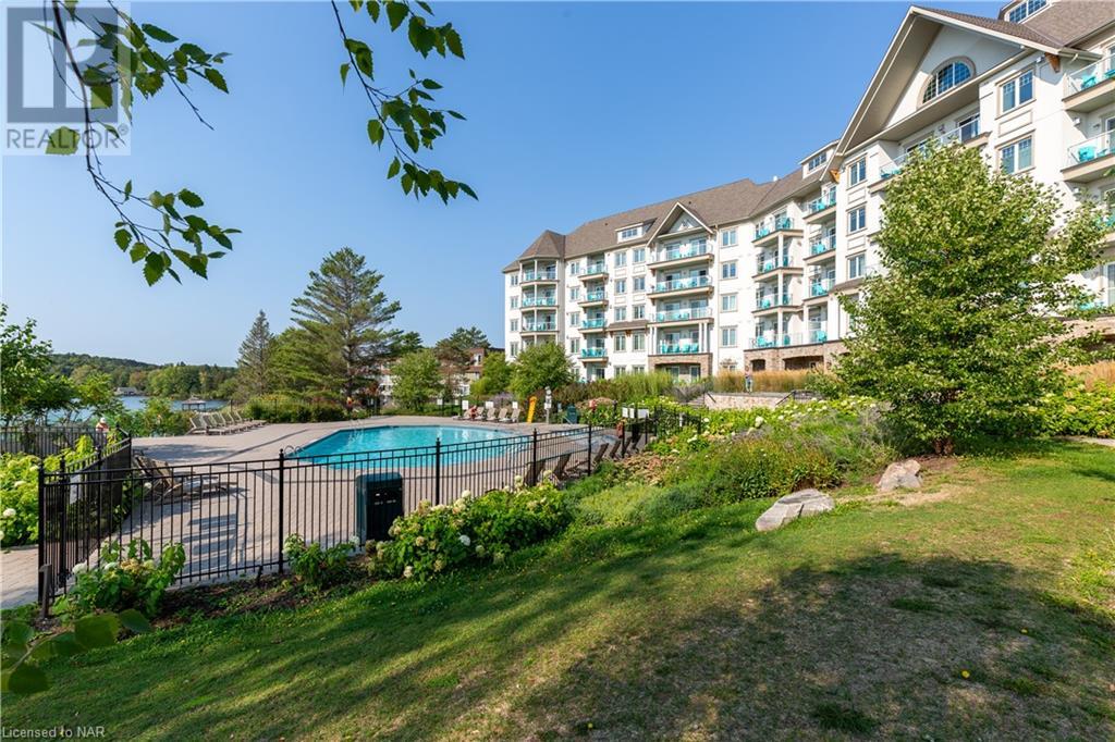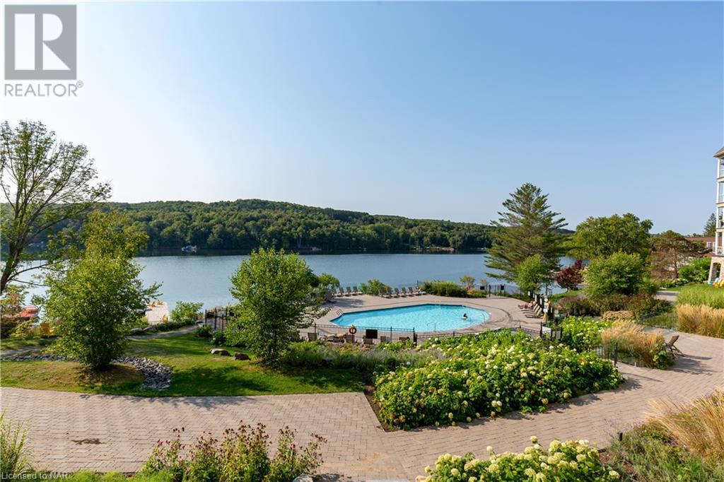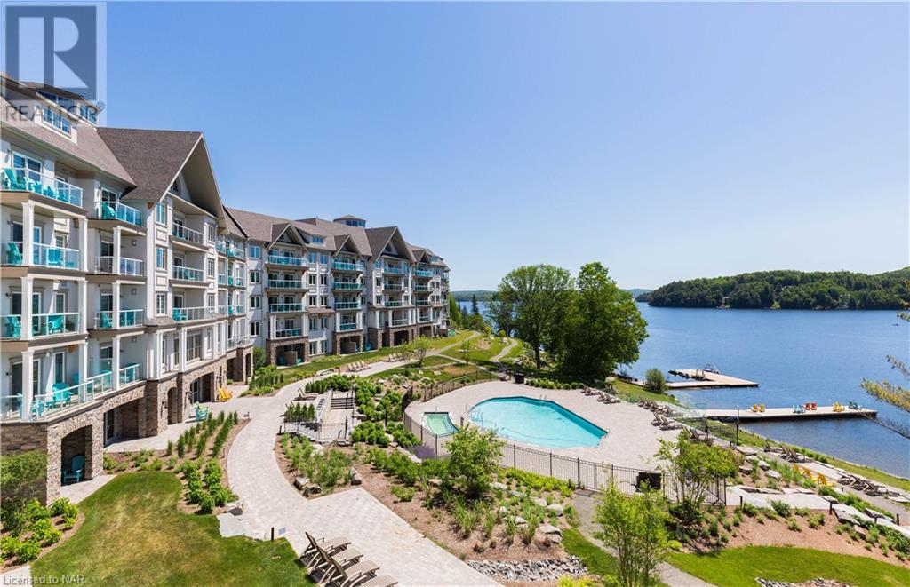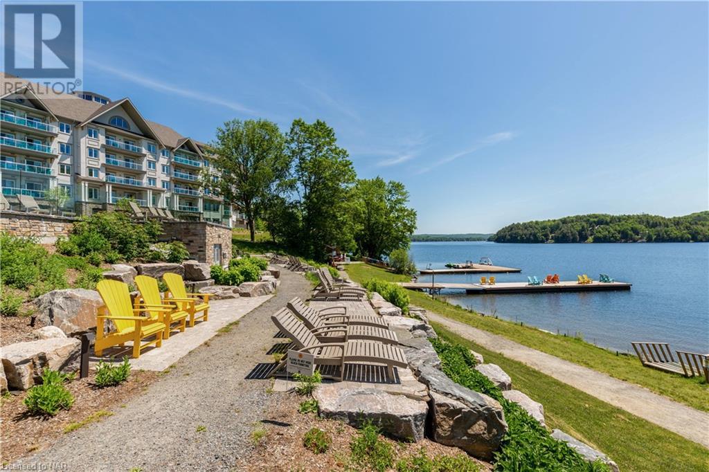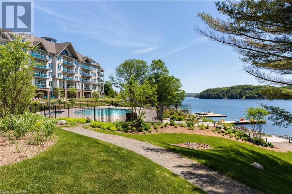 Own a piece of Muskoka paradise with the added bonus of rental income! This immaculately maintained, 2 bed 2 bath terrace condo is located within the newly constructed Deerhurst Resort and is your rare opportunity to enjoy the Muskoka life without worrying about upkeep. This south-facing unit gives you a million dollar view of the Peninsula Lake and surrounding nature, all while being just a few steps from the resort's massive swimming pool. Inside of this luxurious unit you will love the modern yet functional layout which boasts soaring ceilings, vinyl plank flooring, stone counters, a gas fireplace in the family room, 3 piece ensuite bath plus hidden in-unit laundry. This fabulous location offers endless activities to enjoy year-round including over 40 miles of boating on 4 lake chain system, world class lakeside golf course, spa, excellent dining options, Hidden Valley Ski Resort, Treetop Trekking, short drive to Algonquin Park plus easy access to Highway 60 and Downtown Huntsville. All that's left to do is move in - come see for yourself! (id:22211)