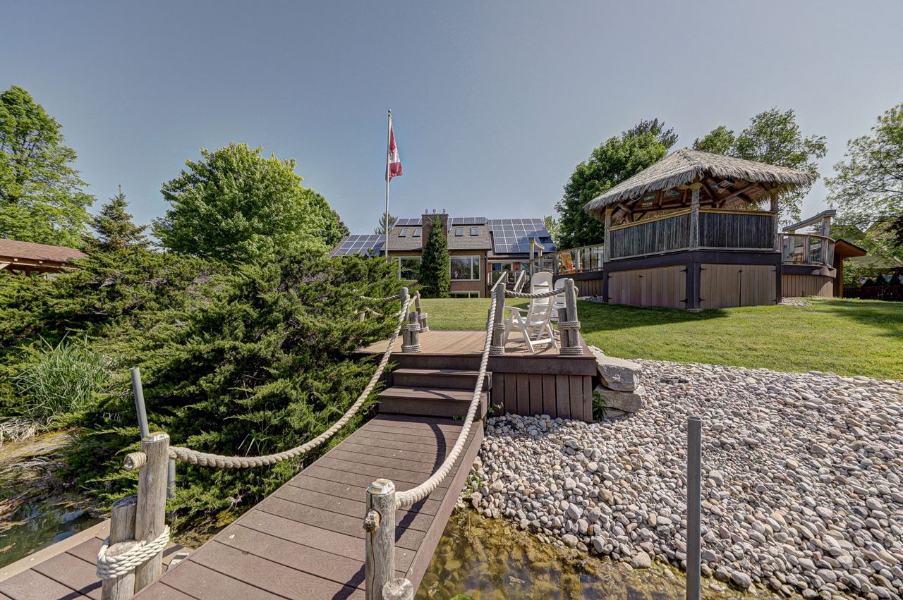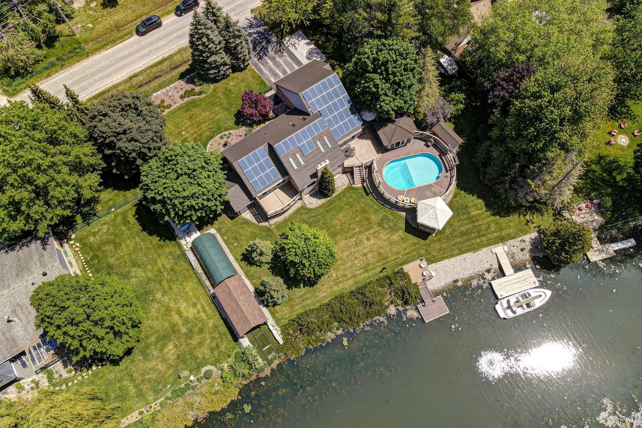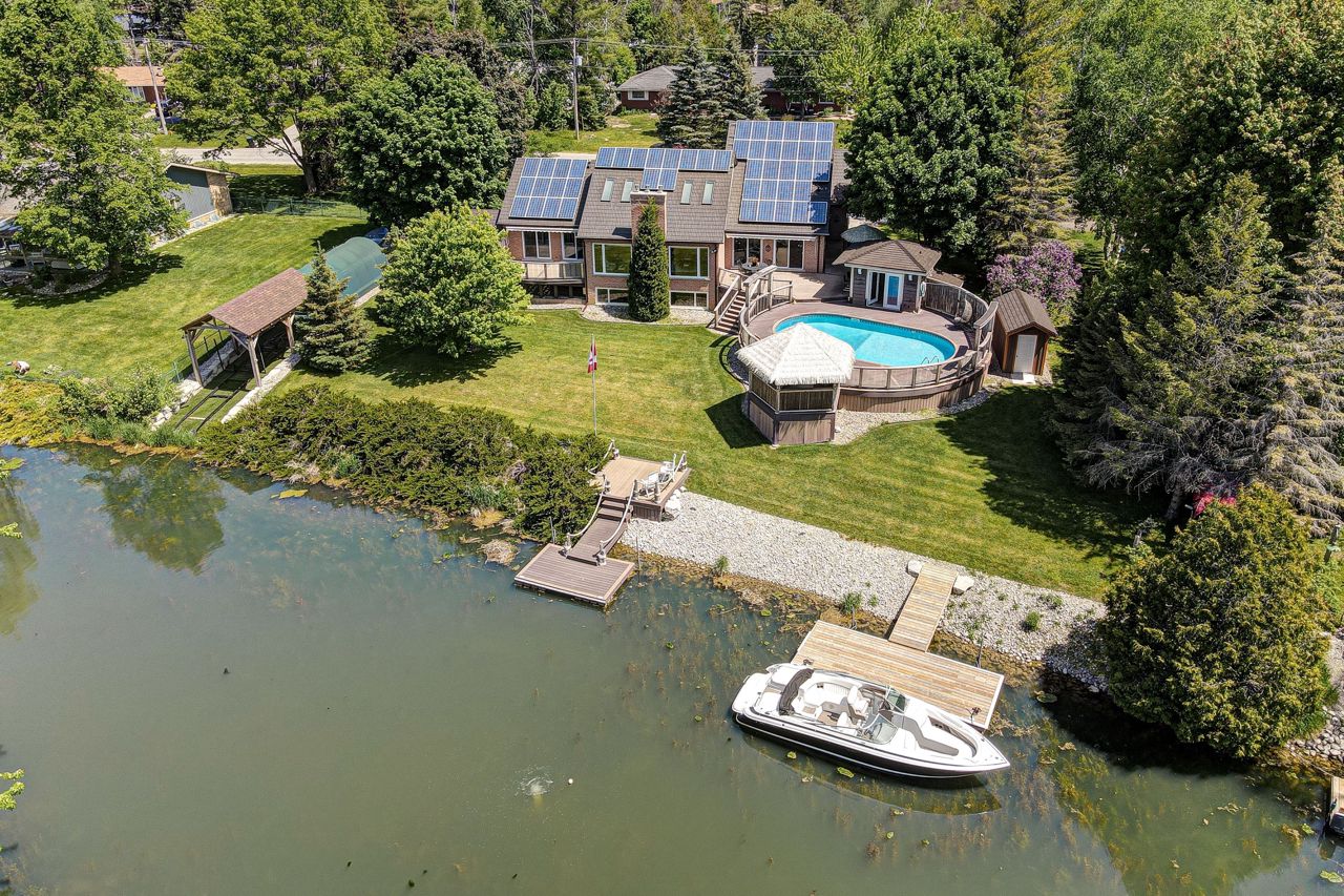 This home has been meticulously maintained and exudes pride of ownership. Quality construction and craftsmanship is evident with no expense spared to improvements or upgrades. Enjoy life on the water with 146 feet of frontage on canal with access to Cook’s Bay on Lake Simcoe. Entertain in the private backyard oasis with above ground saltwater pool, extensive composite decking, built in cedar bar with washroom including outdoor shower, covered tiki lounge area, and built/in barbeque. Inside be welcomed to a bright and airy home filled with natural light. Some fine features of this home include: vaulted ceilings in great room, hardwood floors, skylights, multiple walkouts, geothermal heating, generator, steel roof, income generating solar panels, heated and insulated garage with high ceilings to accommodate a car lift. This is a must-see home located in the fantastic quiet lakeside community of Gilford, known for its proximity to commuter routes and Bradford or Barrie Go Service.