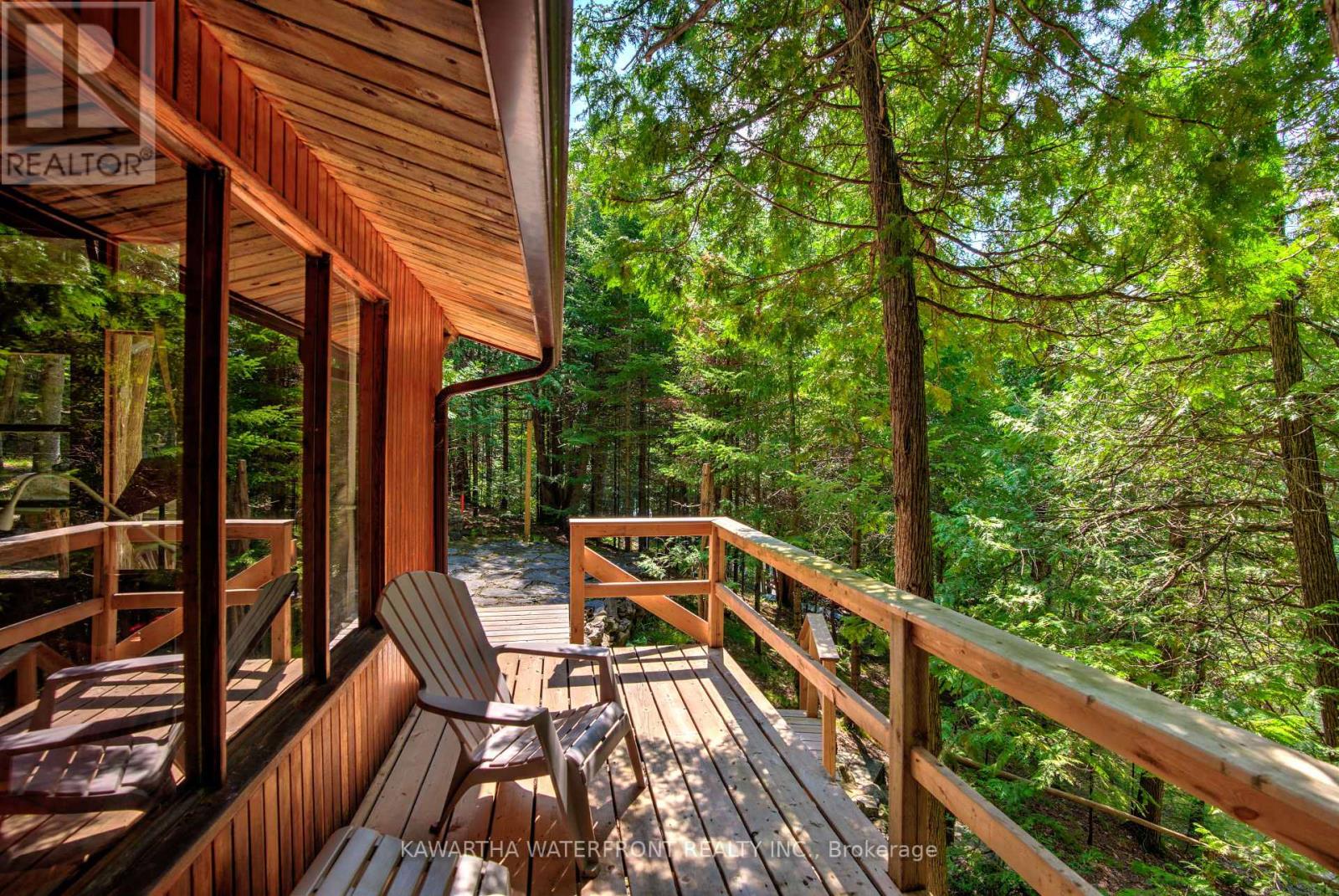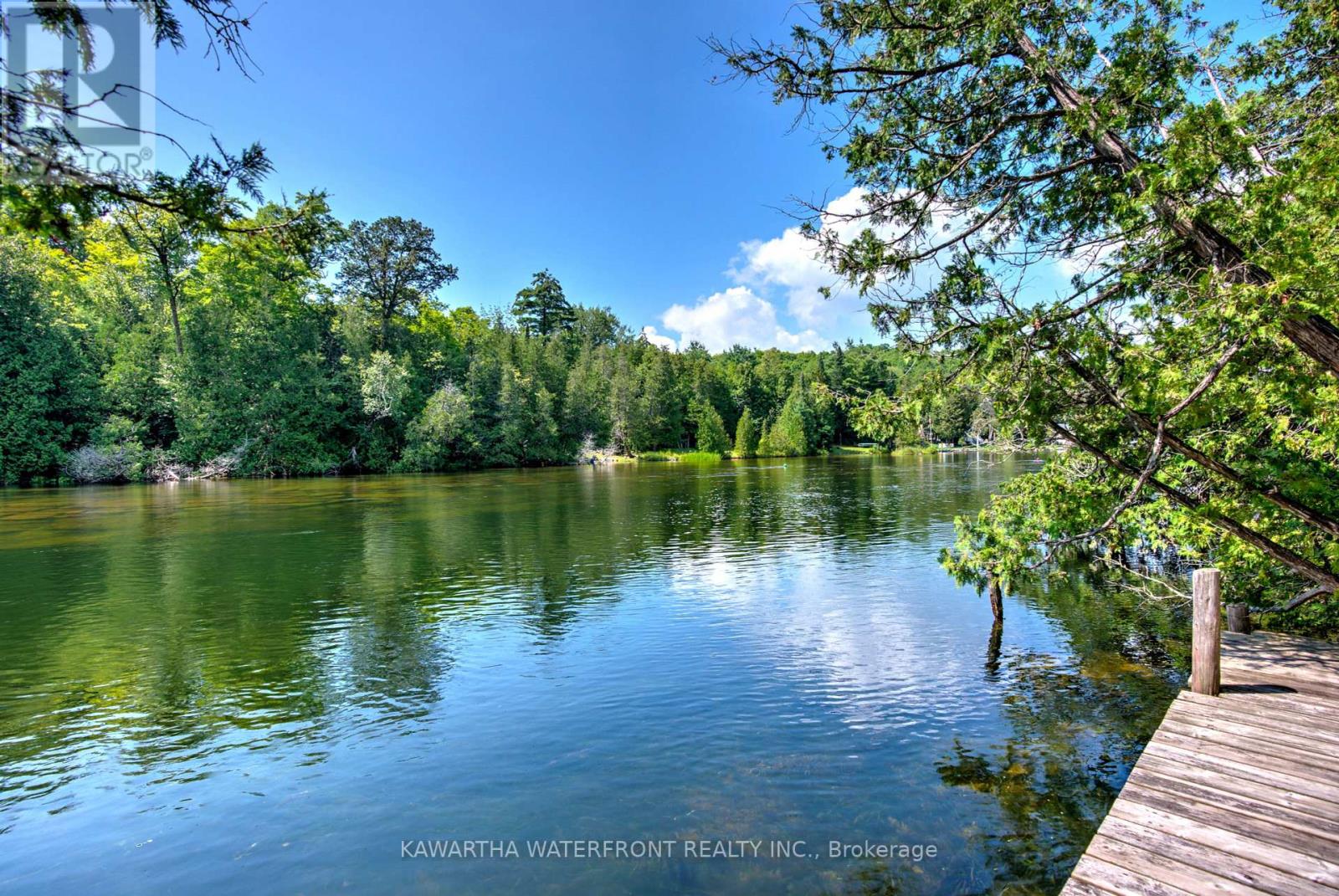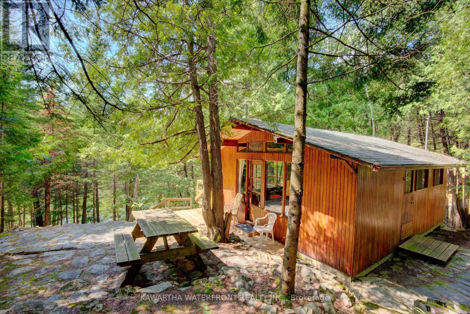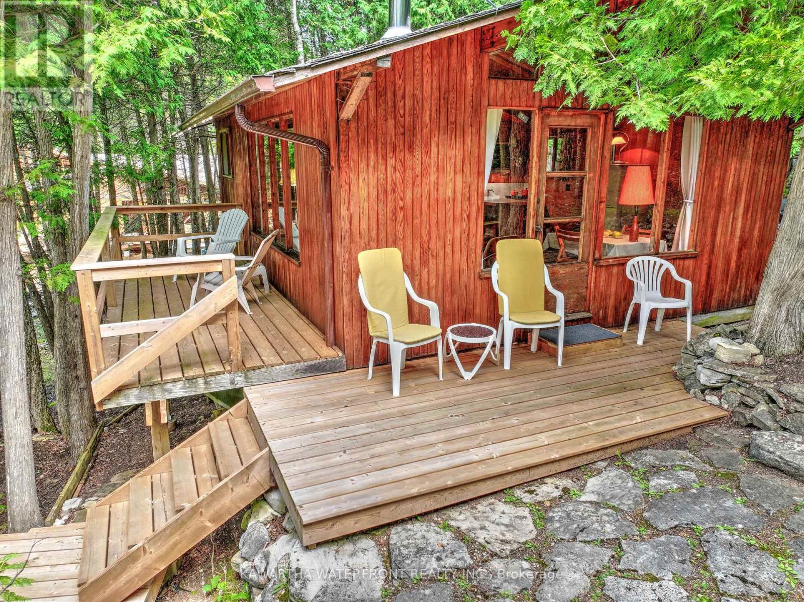 This charming 3-season chalet-style cottage on the southern Gull River section of the Shadow Lake System was designed and built by the original owners and has been in the same family for over 50 years. It has cedar siding and ceilings, large picture windows, open-concept living, kitchen and dining areas and two bedrooms, with heating provided by portable electric heaters and a wood stove. A verandah, deck and stone patio wrap around the cottage and provide views of the wooded lot and the river. The 0.35 acre property features 100 ft of waterfront and has a large sturdy dock for boating and recreation. The gentle current provides for safe swimming in the crystal-clear water as well as fishing and tubing down the river. The location of the cottage is idyllic as it resides on the widest part of the river with no cottages on the opposite shore. This property will appeal to those longing to re-acquaint themselves with the wonders of nature, while providing the option for future expansion.**** EXTRAS **** Recent enhancements (2020) include a new deck, verandah, stairs to the waterfront and outhouse. A site survey was also completed in 2020. It is a short 5-minute drive to amenities in Coboconk. (id:22211)