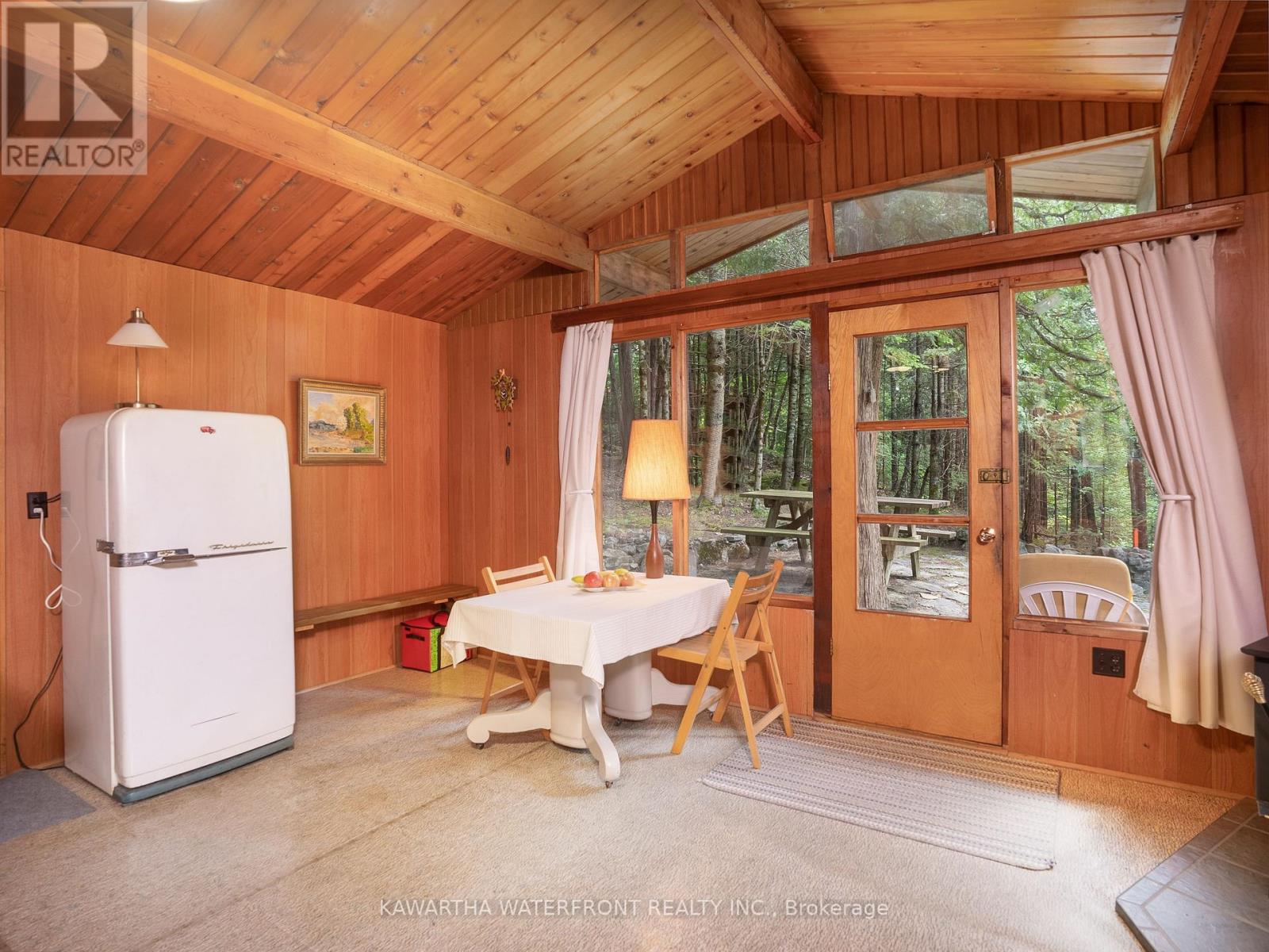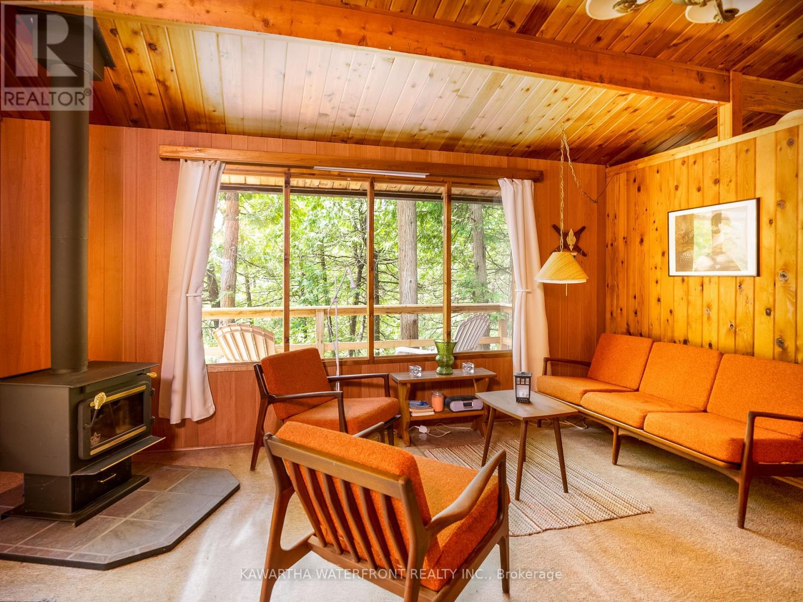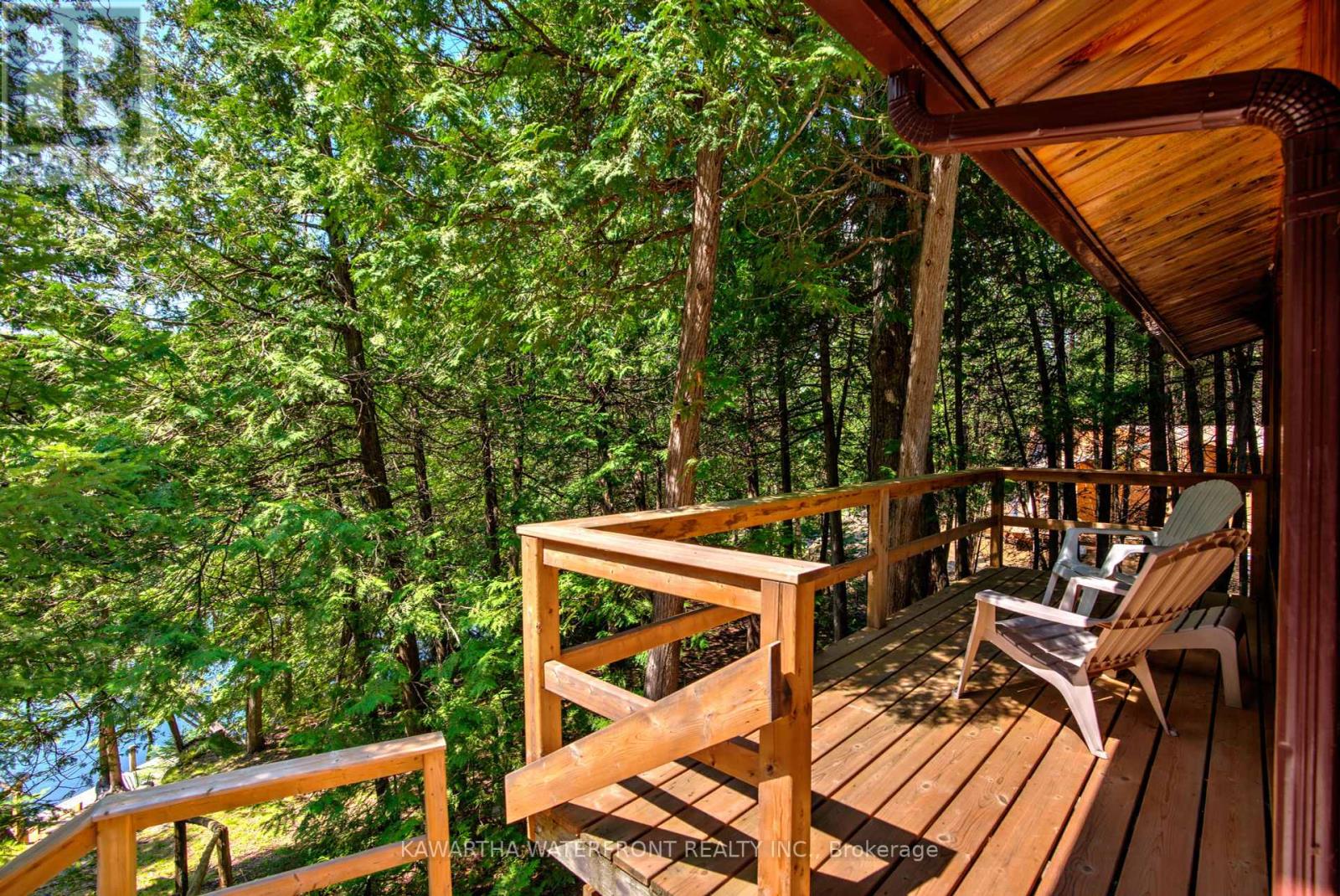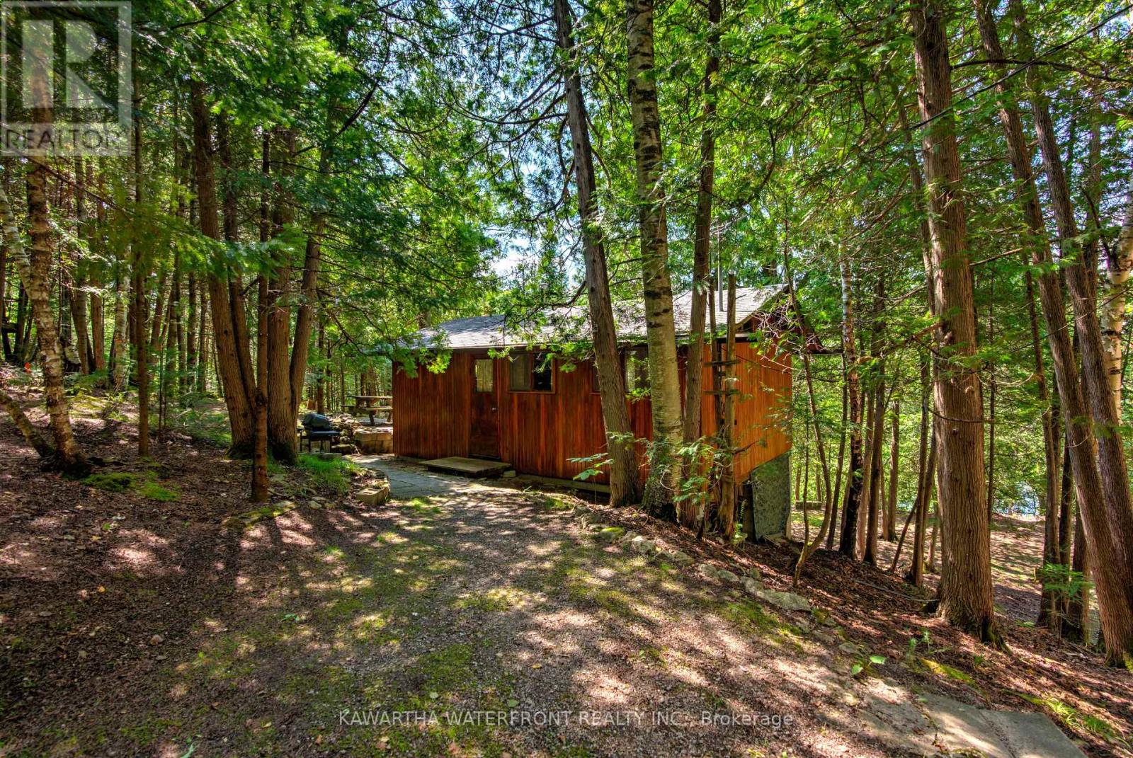 This charming 3-season chalet-style cottage on the southern Gull River section of the Shadow Lake System was designed and built by the original owners and has been in the same family for over 50 years. It has cedar siding and ceilings, large picture windows, open-concept living, kitchen and dining areas and two bedrooms, with heating provided by portable electric heaters and a wood stove. A verandah, deck and stone patio wrap around the cottage and provide views of the wooded lot and the river. The 0.35 acre property features 100 ft of waterfront and has a large sturdy dock for boating and recreation. The gentle current provides for safe swimming in the crystal-clear water as well as fishing and tubing down the river. The location of the cottage is idyllic as it resides on the widest part of the river with no cottages on the opposite shore. This property will appeal to those longing to re-acquaint themselves with the wonders of nature, while providing the option for future expansion.**** EXTRAS **** Recent enhancements (2020) include a new deck, verandah, stairs to the waterfront and outhouse. A site survey was also completed in 2020. It is a short 5-minute drive to amenities in Coboconk. (id:22211)