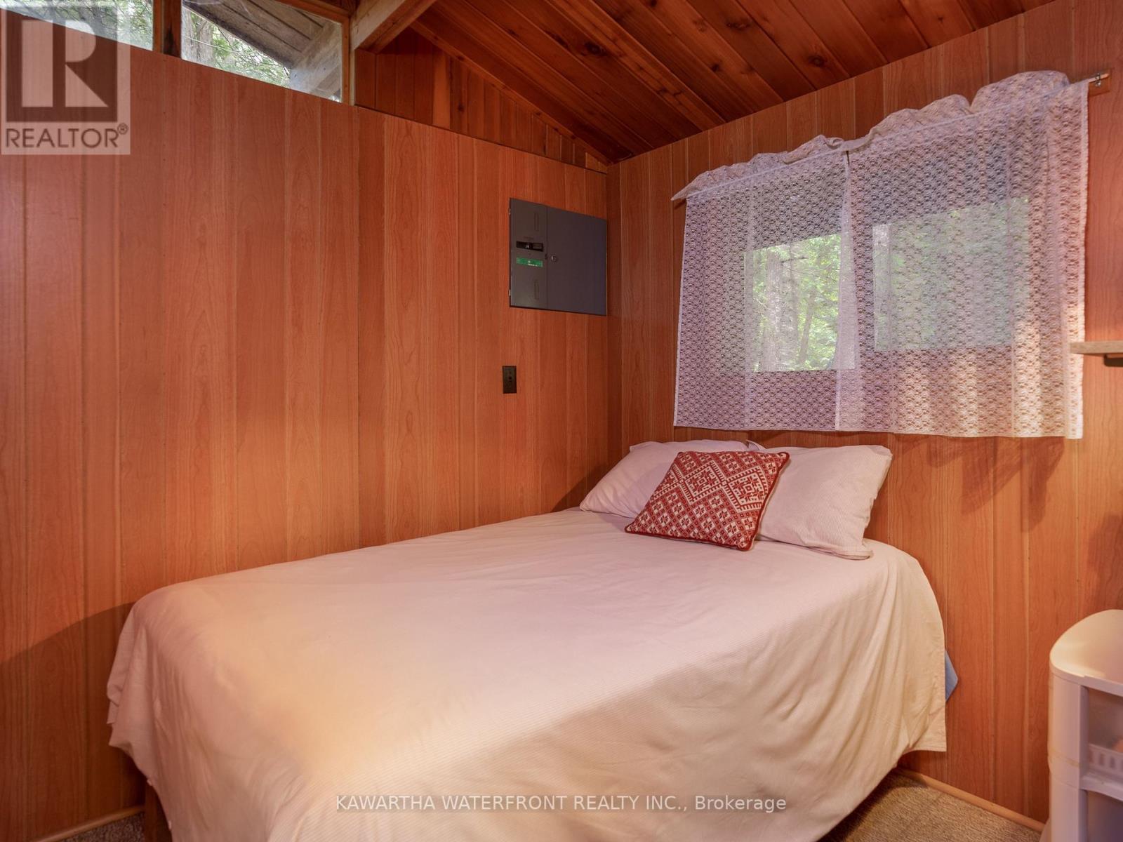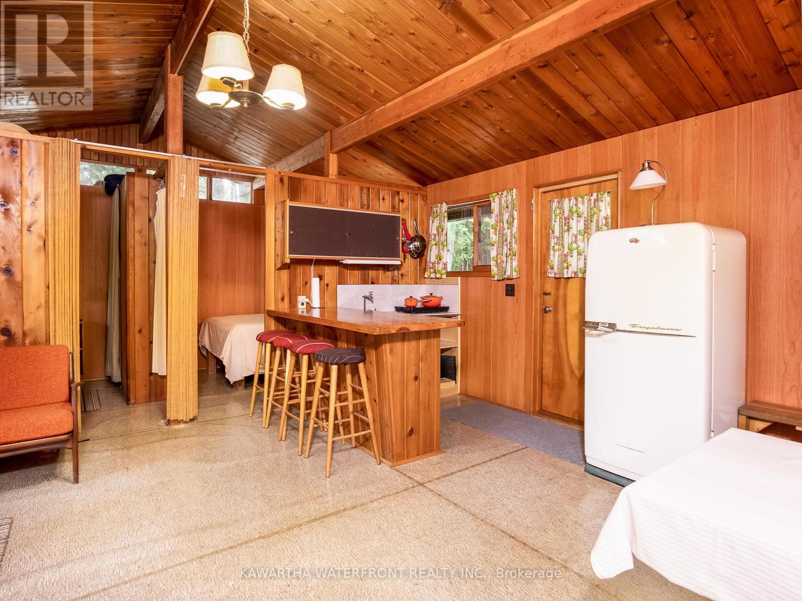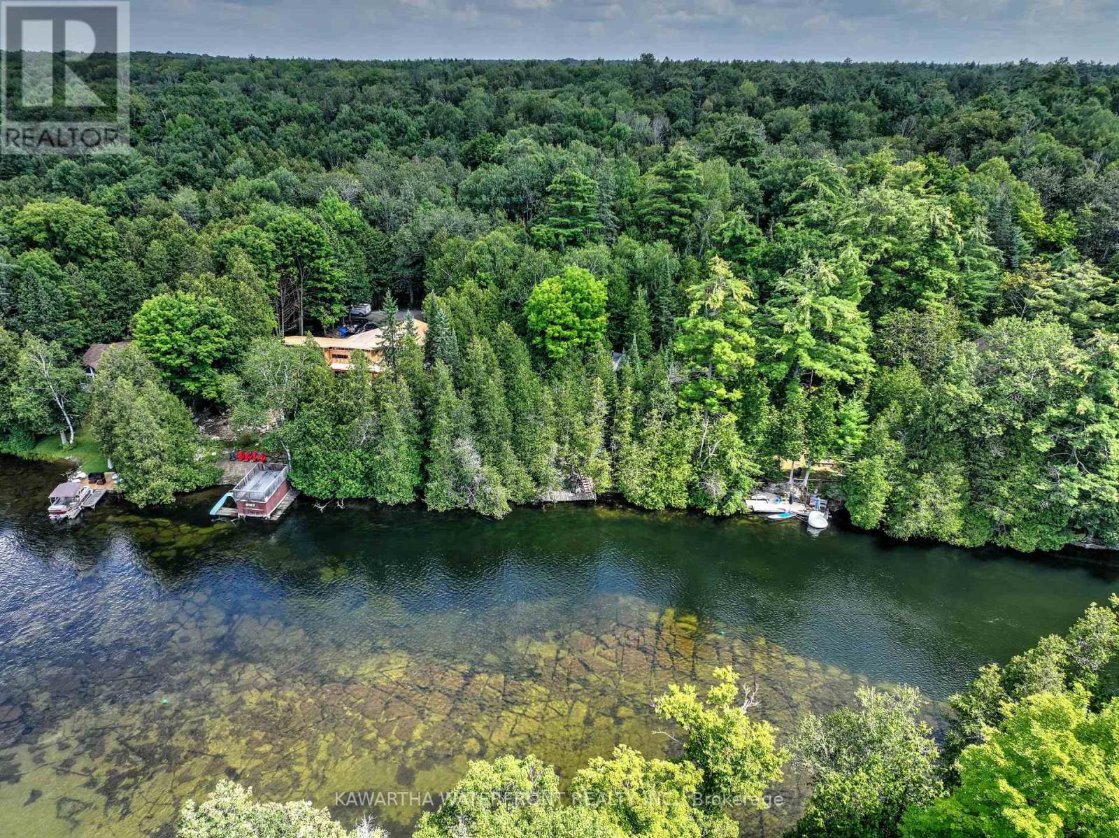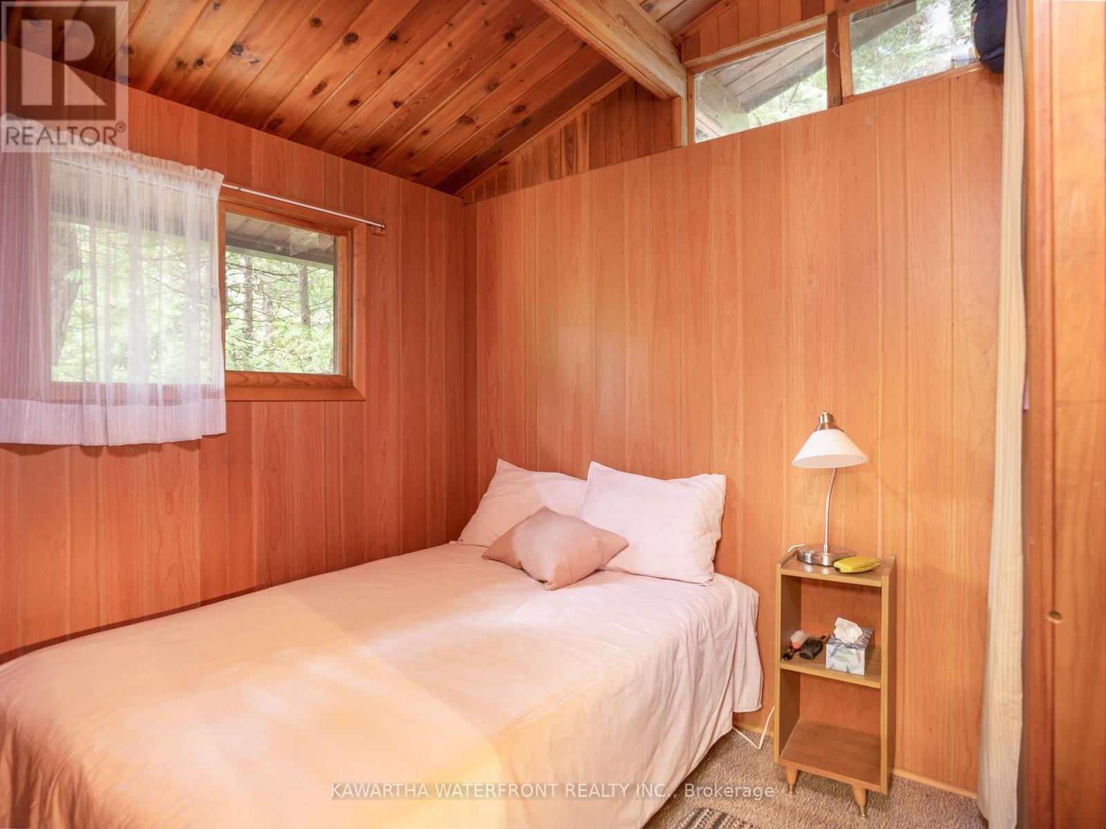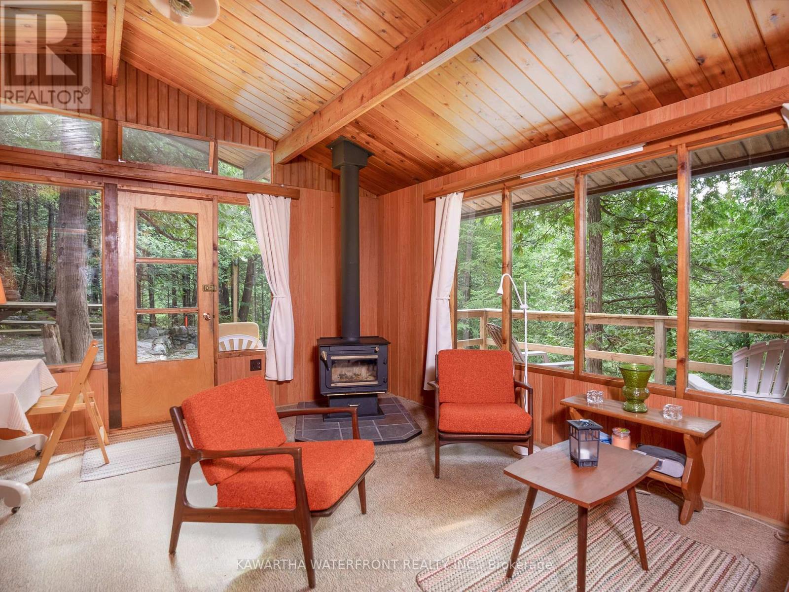 This charming 3-season chalet-style cottage on the southern Gull River section of the Shadow Lake System was designed and built by the original owners and has been in the same family for over 50 years. It has cedar siding and ceilings, large picture windows, open-concept living, kitchen and dining areas and two bedrooms, with heating provided by portable electric heaters and a wood stove. A verandah, deck and stone patio wrap around the cottage and provide views of the wooded lot and the river. The 0.35 acre property features 100 ft of waterfront and has a large sturdy dock for boating and recreation. The gentle current provides for safe swimming in the crystal-clear water as well as fishing and tubing down the river. The location of the cottage is idyllic as it resides on the widest part of the river with no cottages on the opposite shore. This property will appeal to those longing to re-acquaint themselves with the wonders of nature, while providing the option for future expansion.**** EXTRAS **** Recent enhancements (2020) include a new deck, verandah, stairs to the waterfront and outhouse. A site survey was also completed in 2020. It is a short 5-minute drive to amenities in Coboconk. (id:22211)