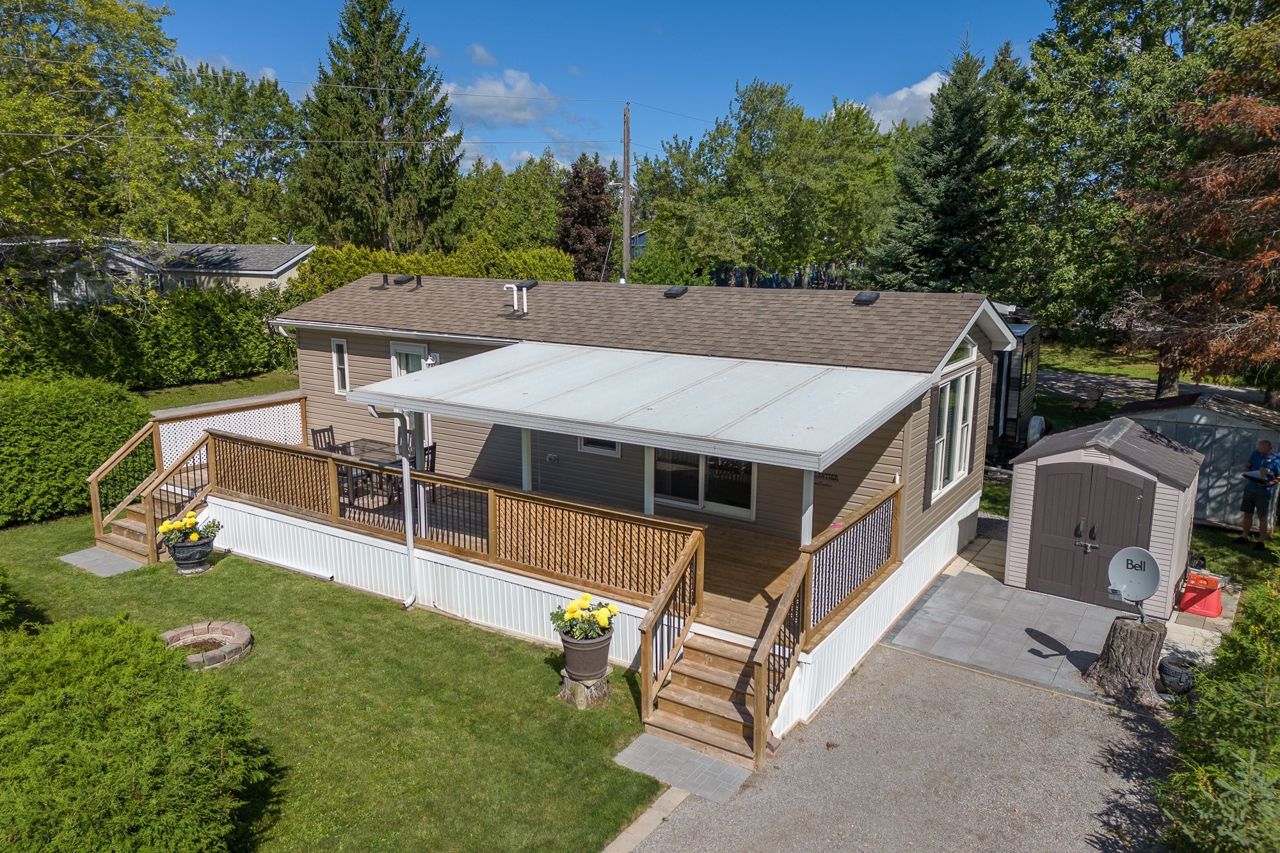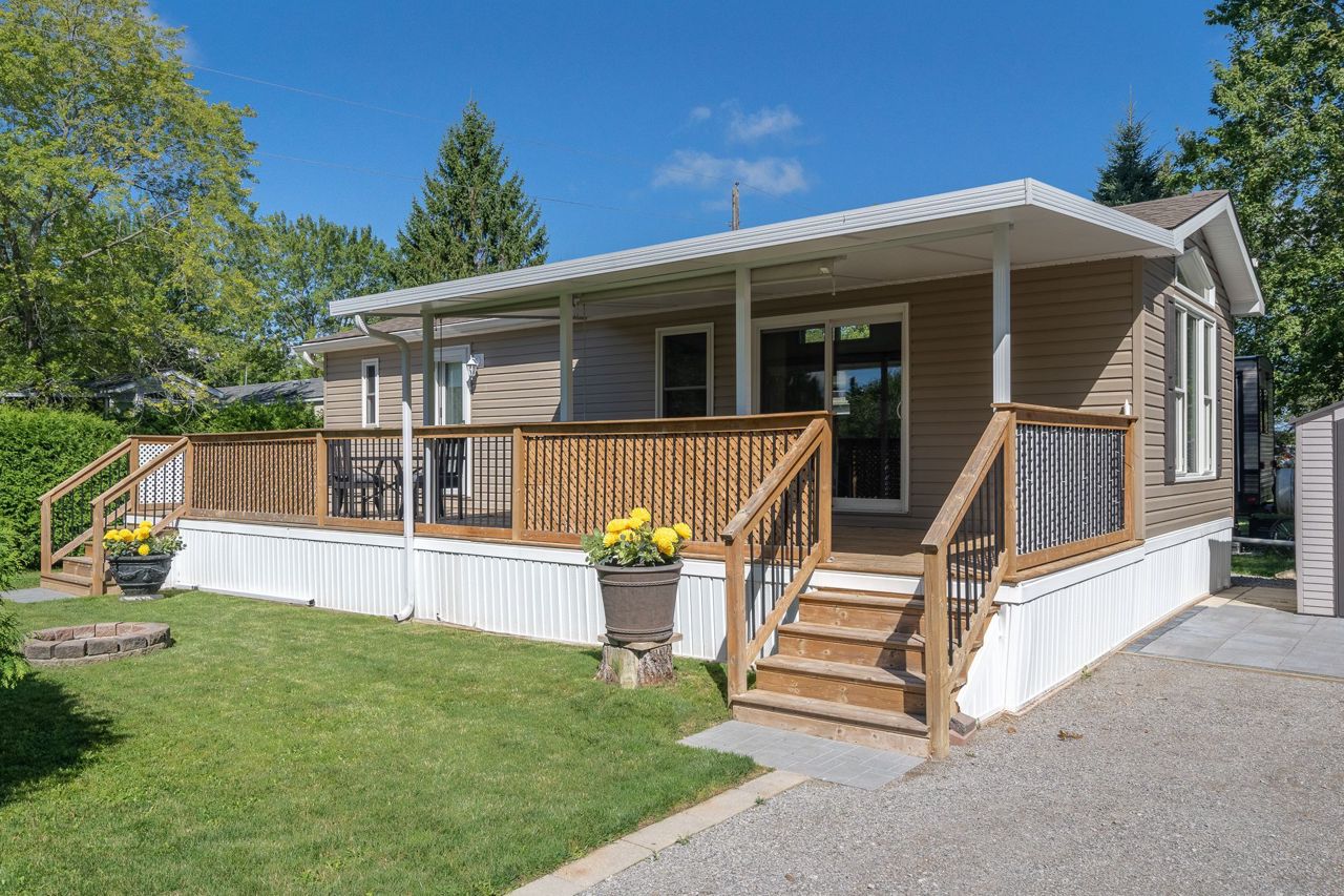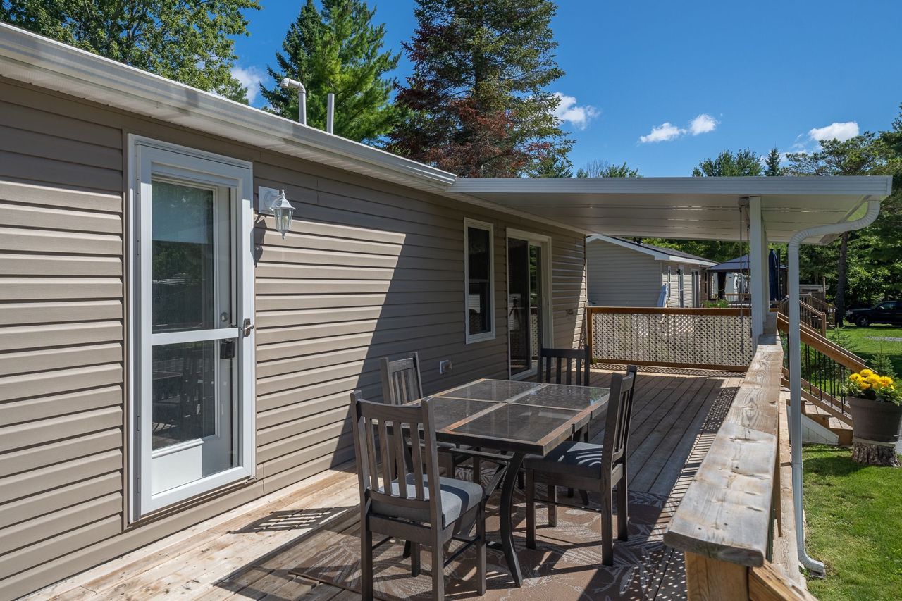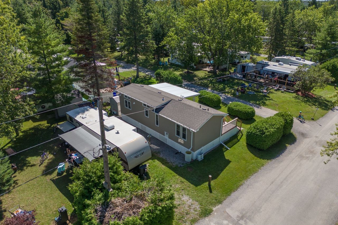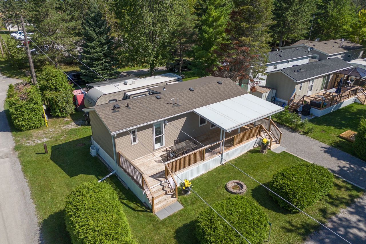 KICK-BACK & RELAX AT AMENITY-RICH "NESTLE IN" RESORT ALONG EMILY CREEK - Discover an affordable way to enjoy the Summer season with this 2018 Frontier modular unit by General coach gives you 540 sq ft of open concept living featuring vaulted ceilings. This unit comes fully furnished & is bright & spacious, modern & inviting for the May - Oct season. The kitchen is massive & features a peninsula with bar stools for casual eating. By any measure, this is one of the best kitchens you can have with full appliances, double sink, windows & a built-in microwave for all your needs. There are 2 bedrooms & 1 3-piece bath that all have tons of storage, clean vinyl plank flooring. Bedroom 2 has a custom bunk bed with easy to access stairs with storage for safety & functionality. Outside, the huge deck coverage partially by an sizable permanent hard covered awning give you options for full sun or shade or protection from the rain & eaves all around. This lot is private & walkable to the docks,beach, community pool, gym, playground, rec hall, store, horseshoe pit & more! Plus you can boat along Emily Creek into Sturgeon Lake & the rest of the Trent Severn Waterway. Don't miss your chance to Summer in style at Nestle In!
