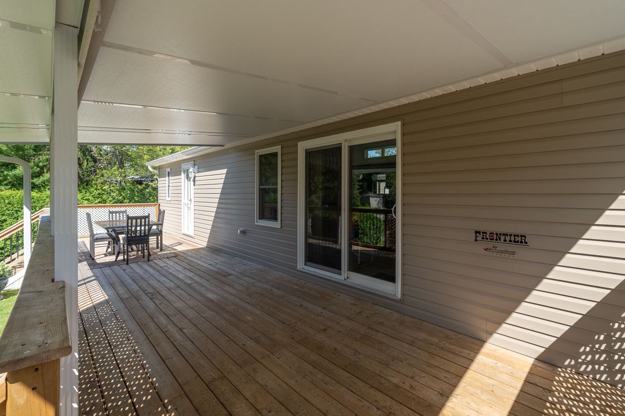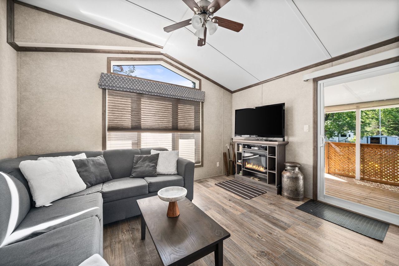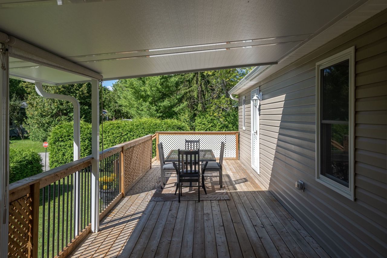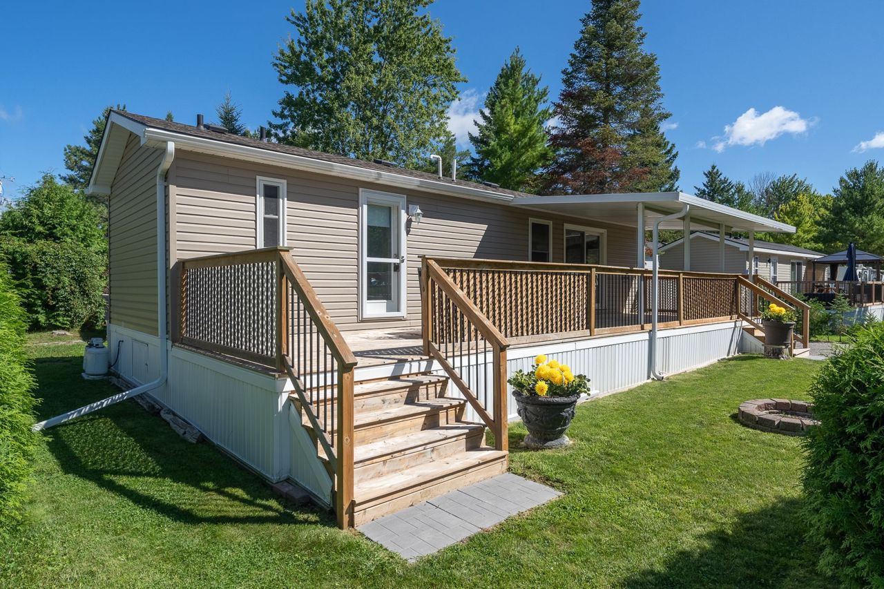 KICK-BACK & RELAX AT AMENITY-RICH "NESTLE IN" RESORT ALONG EMILY CREEK - Discover an affordable way to enjoy the Summer season with this 2018 Frontier modular unit by General coach gives you 540 sq ft of open concept living featuring vaulted ceilings. This unit comes fully furnished & is bright & spacious, modern & inviting for the May - Oct season. The kitchen is massive & features a peninsula with bar stools for casual eating. By any measure, this is one of the best kitchens you can have with full appliances, double sink, windows & a built-in microwave for all your needs. There are 2 bedrooms & 1 3-piece bath that all have tons of storage, clean vinyl plank flooring. Bedroom 2 has a custom bunk bed with easy to access stairs with storage for safety & functionality. Outside, the huge deck coverage partially by an sizable permanent hard covered awning give you options for full sun or shade or protection from the rain & eaves all around. This lot is private & walkable to the docks,beach, community pool, gym, playground, rec hall, store, horseshoe pit & more! Plus you can boat along Emily Creek into Sturgeon Lake & the rest of the Trent Severn Waterway. Don't miss your chance to Summer in style at Nestle In!