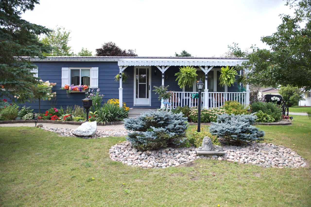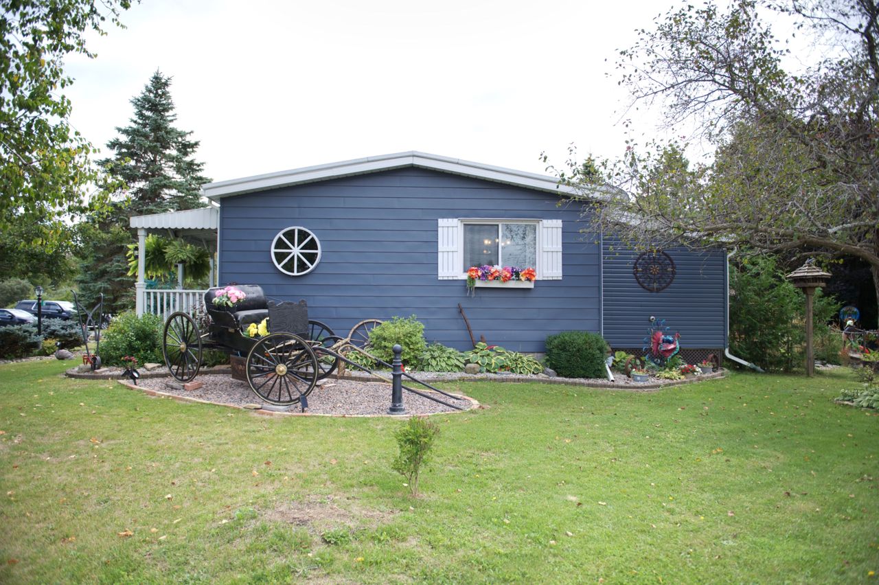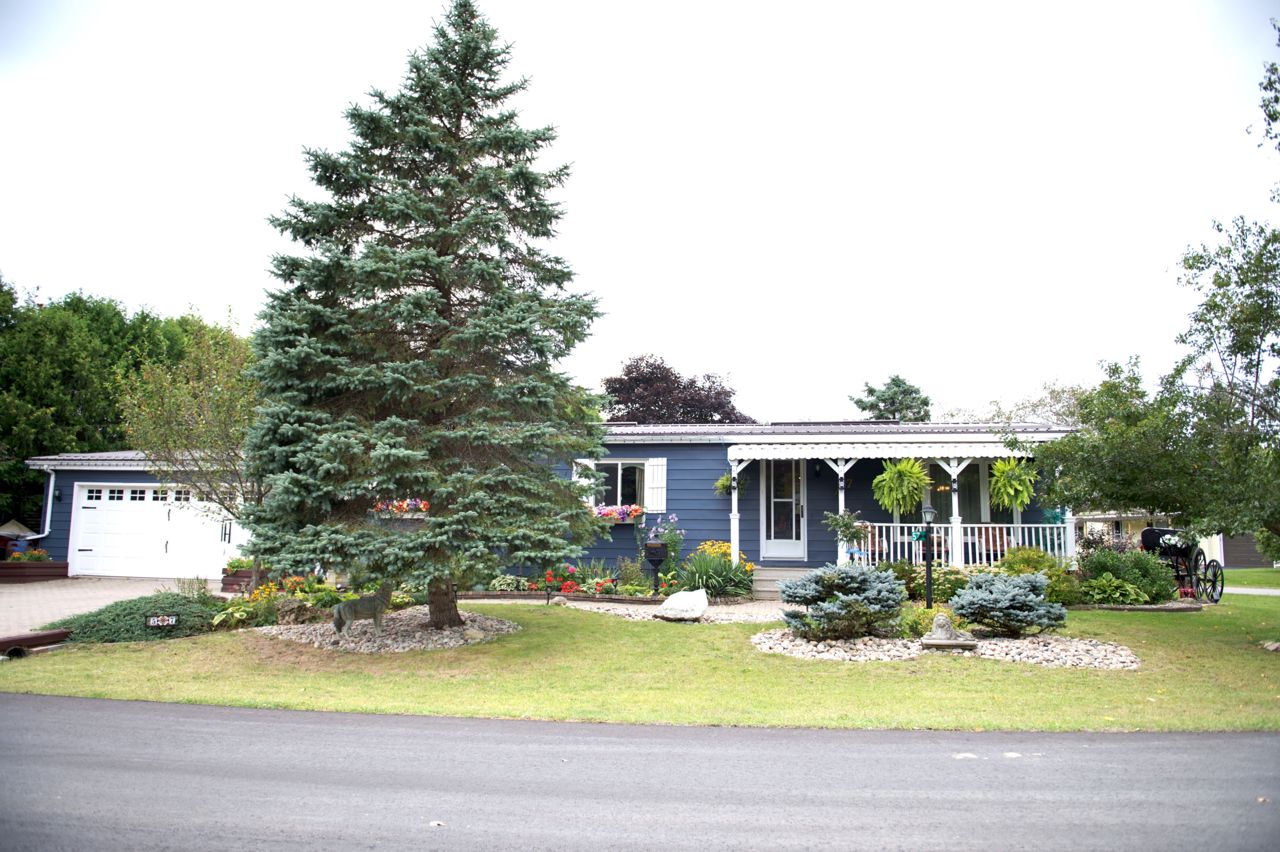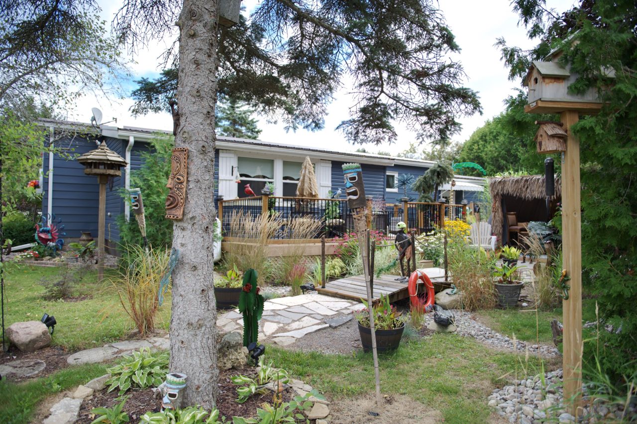 This 2 bed 2 bath bungalow is spectacular to look at as it is landscaped like no other. Front covered porch, double car attached garage , 2 large mennonite built sheds and a super fun tropical gazebo. ALL THIS with a land lease of $676.00 per month. GREAT News... this fee includes TAXES, WATER, and SEPTIC MAINTENANCE, POOL & CLUBHOUSE with shuffleboard, darts, library, day games, evening games and social events. You will love this living !