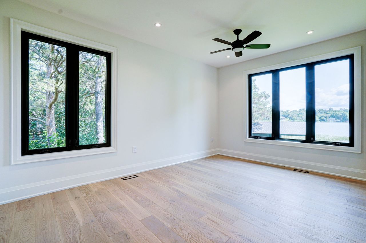 Large living area with views of the water, large windows and a fireplace. Primary bedroom has a