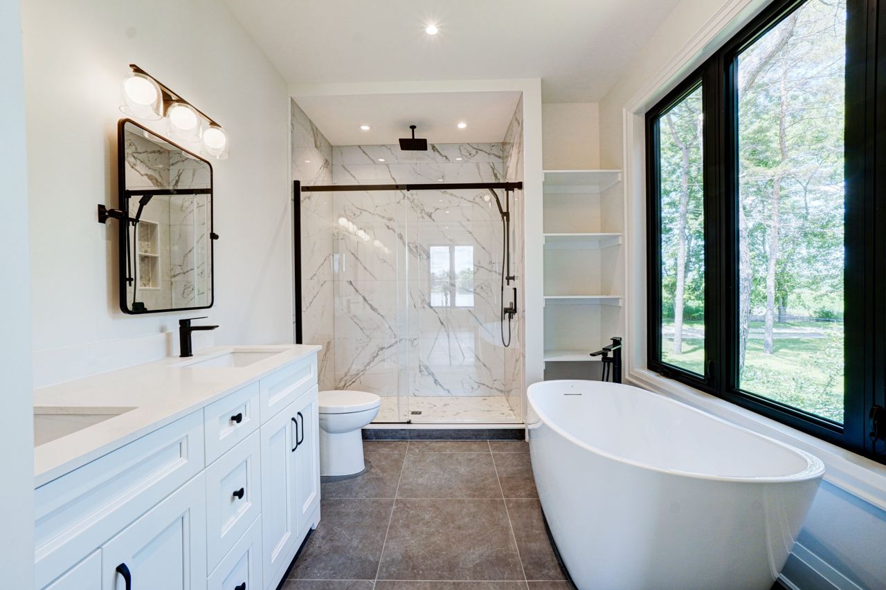 large walk-in closet with builtin storage, 5 piece ensuite with a large shower and stand alone tub.