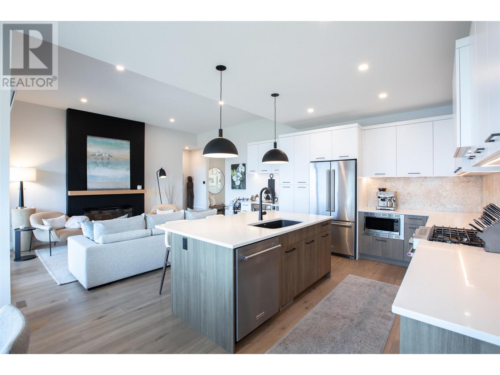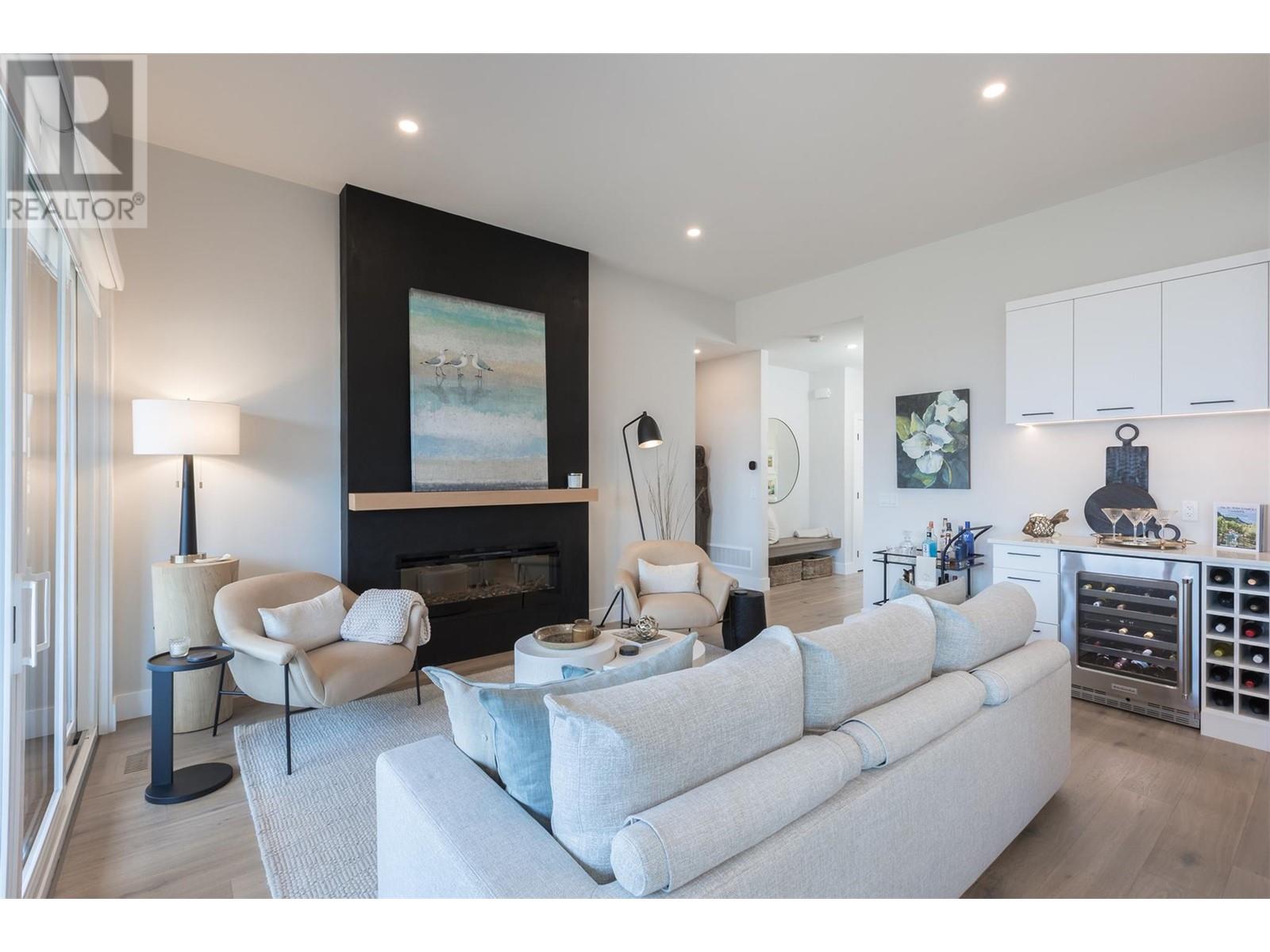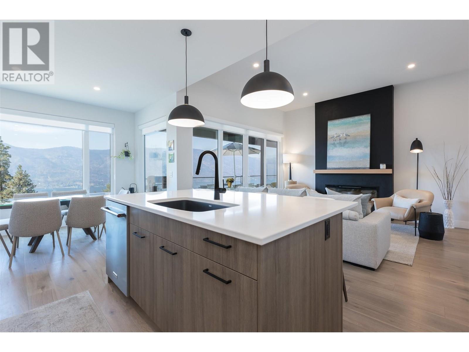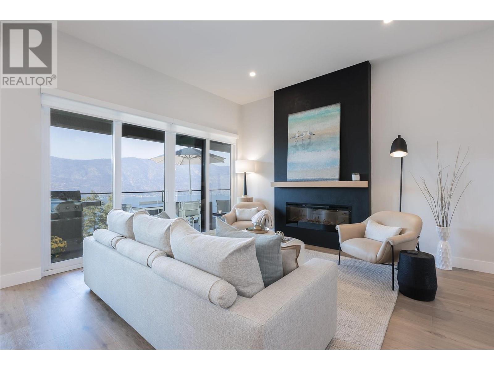 Experience luxury living in this meticulously designed walkout rancher home with a stunning lake view.The main level boasts a primary bedroom with ensuite and walk-in closet, while the lower walkout level offers 2 additional bedrooms.Light oak plank flooring runs throughout the main floor,leading to a covered deck with panoramic lake views.The designer kitchen and feature fireplace wall create an elegant focal point.Additional features include a powder room and laundry space on the main level,while the lower level offers a storage room,open family room,media room,and a full bath.This home backs onto a scenic walking path,providing both privacy and the convenience of a bareland strata.McKinley Beach,a desirable community, just 15 minutes from Kelowna International Airport and offers a community garden, pickleball/tennis courts, private marina,play park and upcoming rec centre with indoor pool & retail services.Experience lakeside luxury living in a thriving community at its finest. (id:22211)