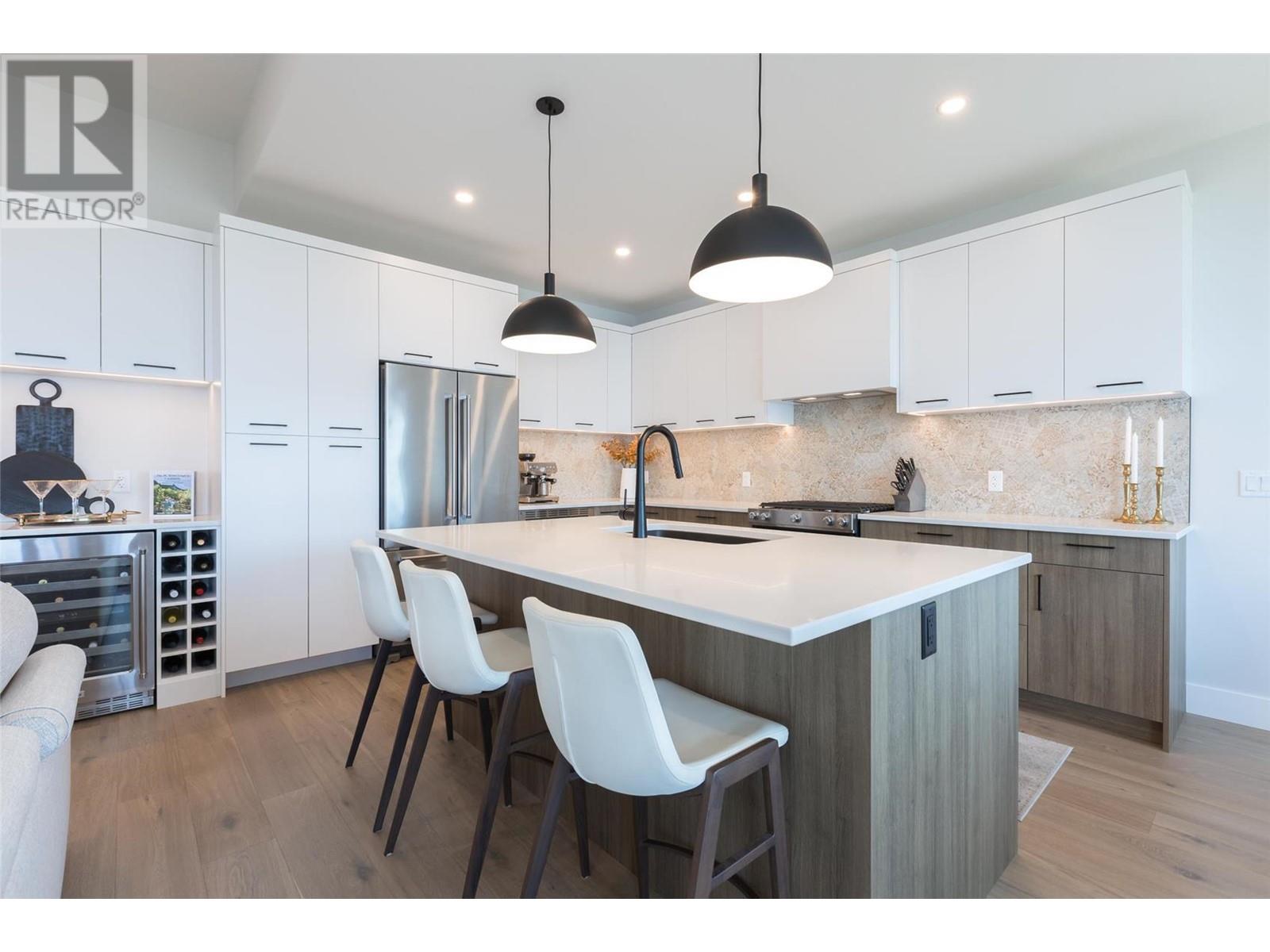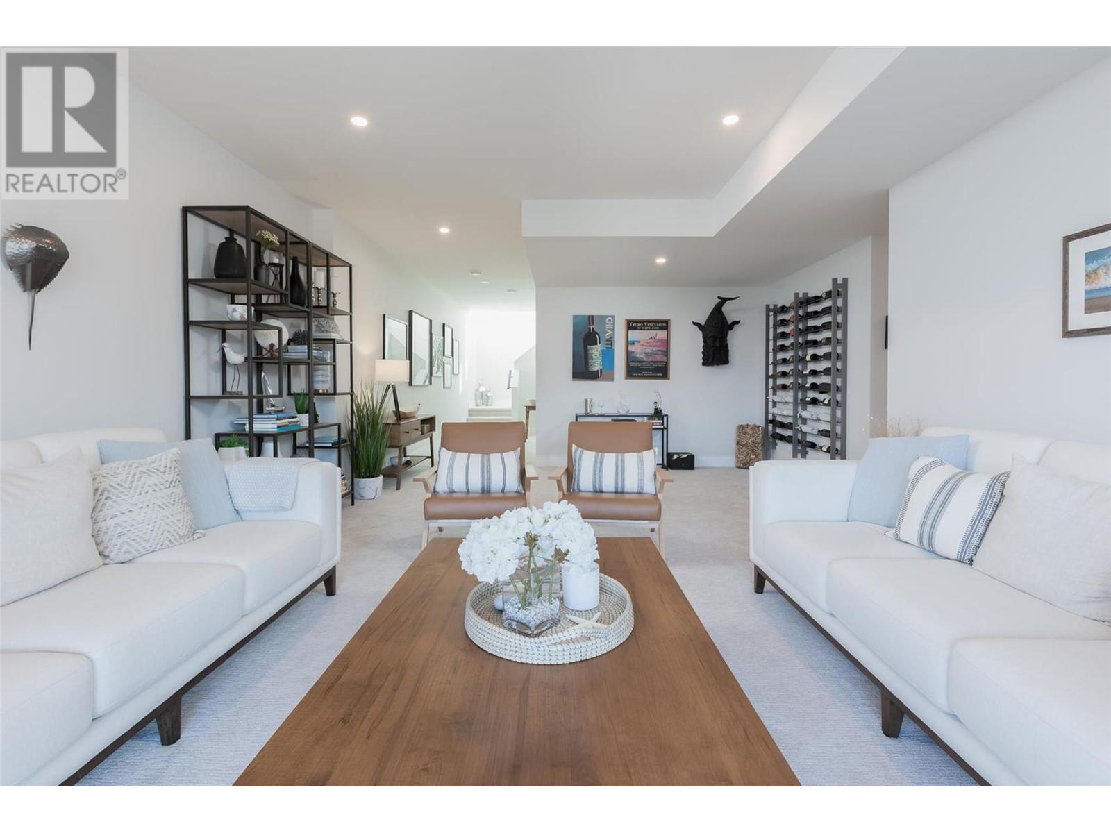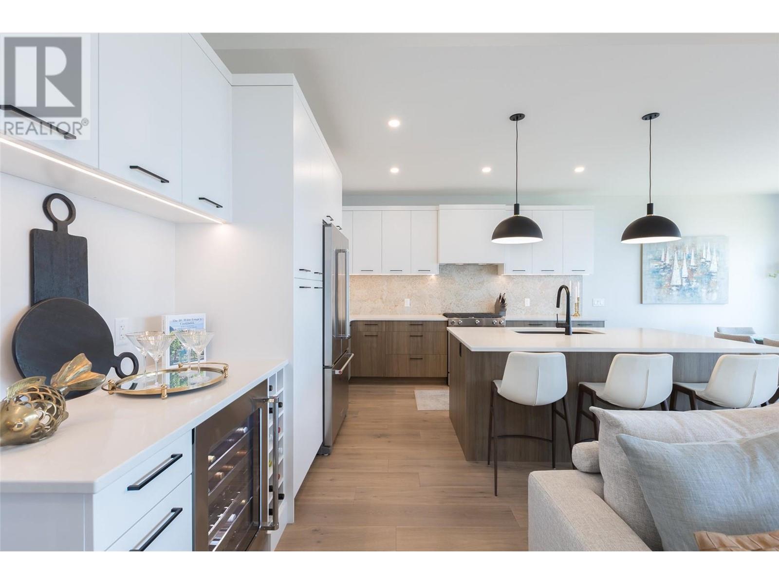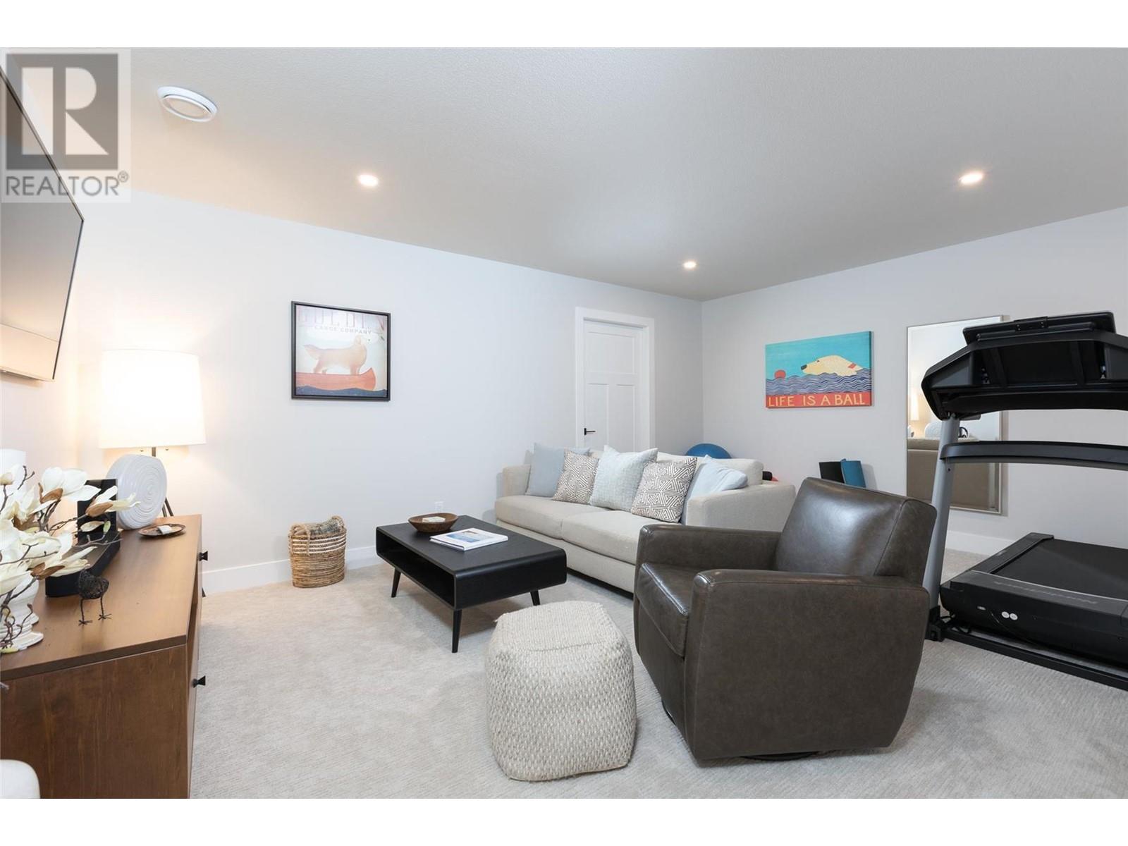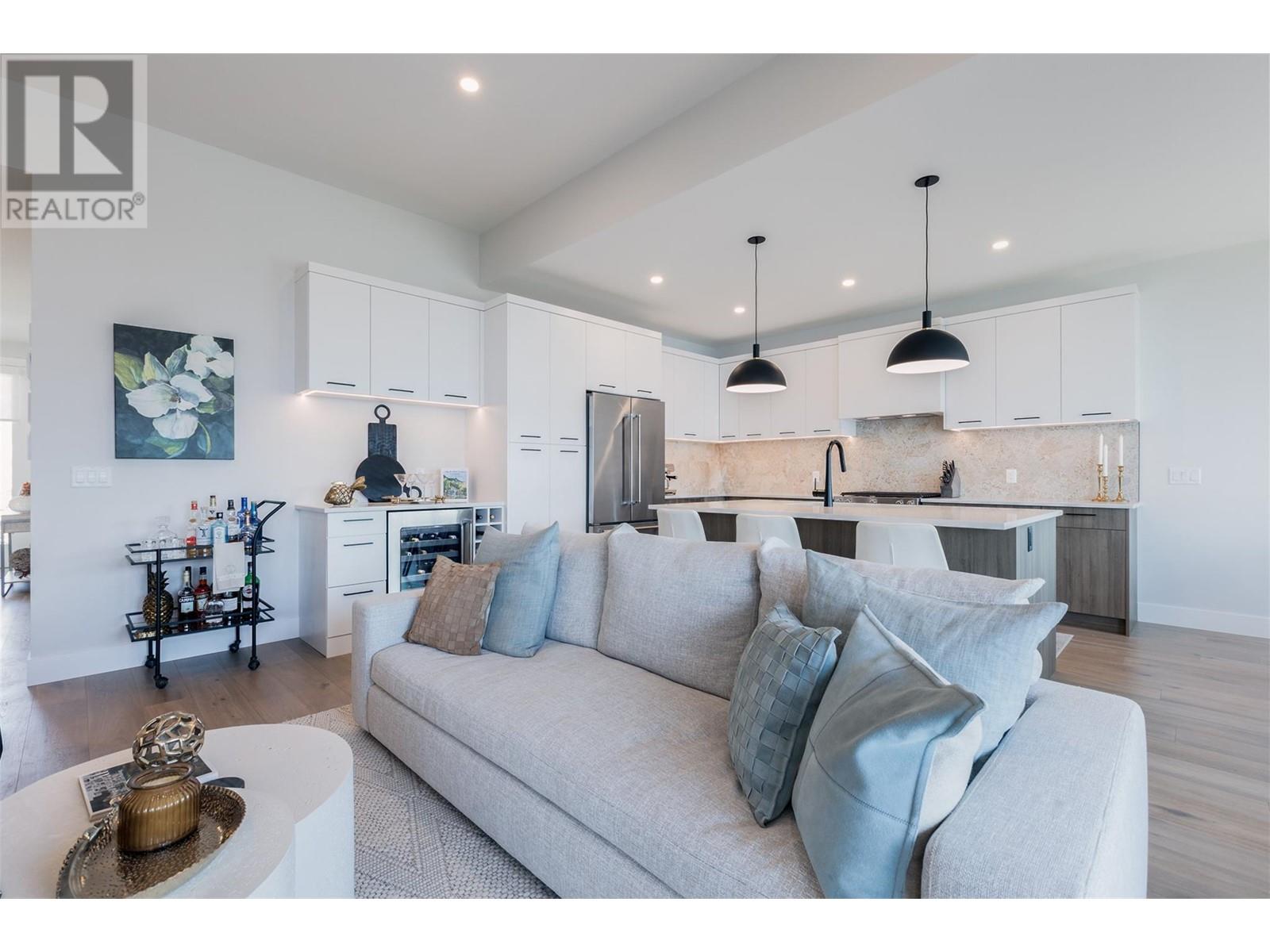 Experience luxury living in this meticulously designed walkout rancher home with a stunning lake view.The main level boasts a primary bedroom with ensuite and walk-in closet, while the lower walkout level offers 2 additional bedrooms.Light oak plank flooring runs throughout the main floor,leading to a covered deck with panoramic lake views.The designer kitchen and feature fireplace wall create an elegant focal point.Additional features include a powder room and laundry space on the main level,while the lower level offers a storage room,open family room,media room,and a full bath.This home backs onto a scenic walking path,providing both privacy and the convenience of a bareland strata.McKinley Beach,a desirable community, just 15 minutes from Kelowna International Airport and offers a community garden, pickleball/tennis courts, private marina,play park and upcoming rec centre with indoor pool & retail services.Experience lakeside luxury living in a thriving community at its finest. (id:22211)