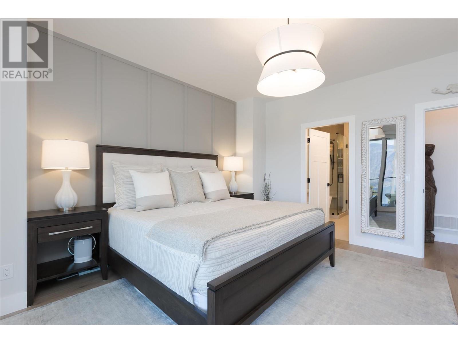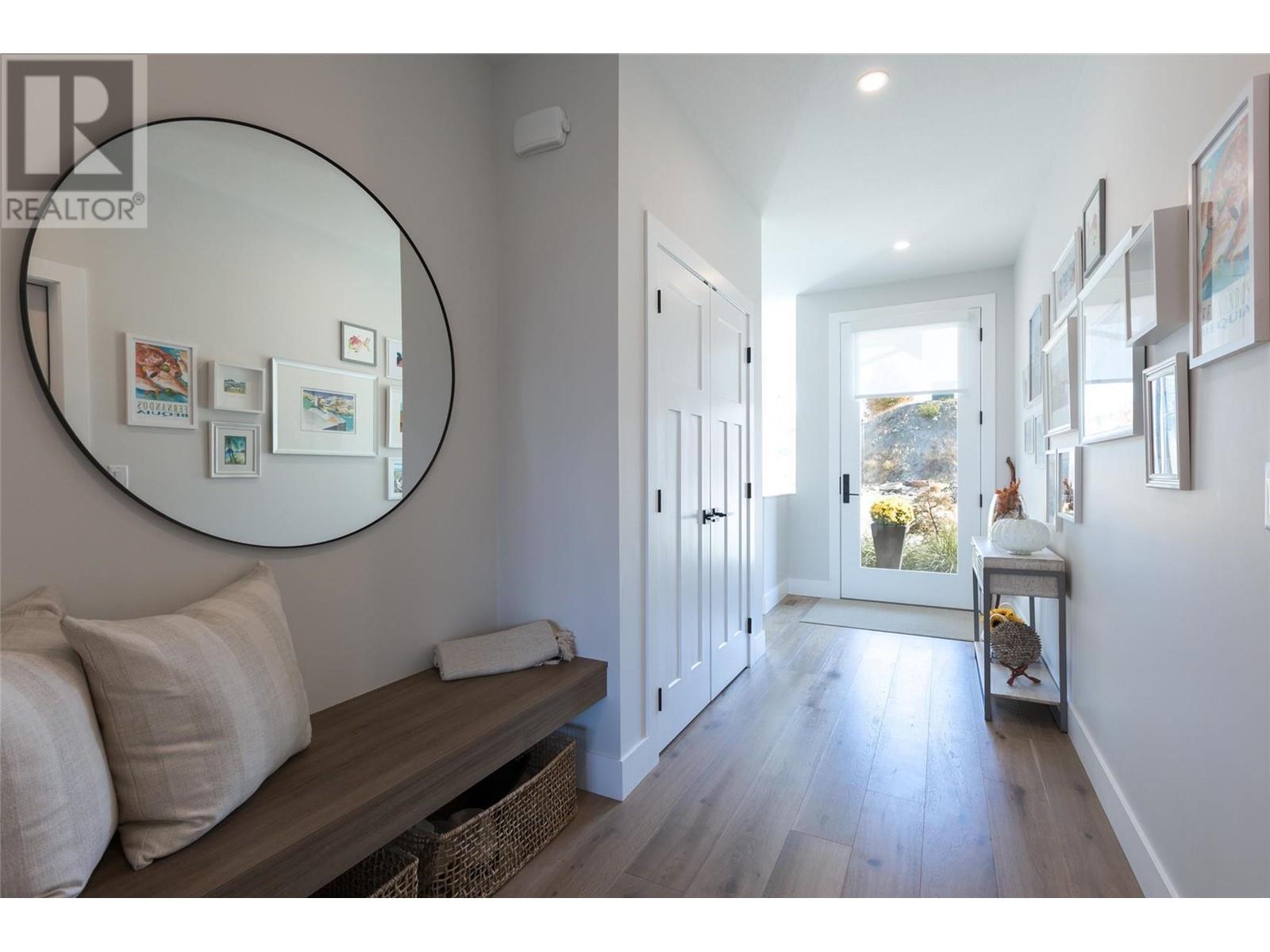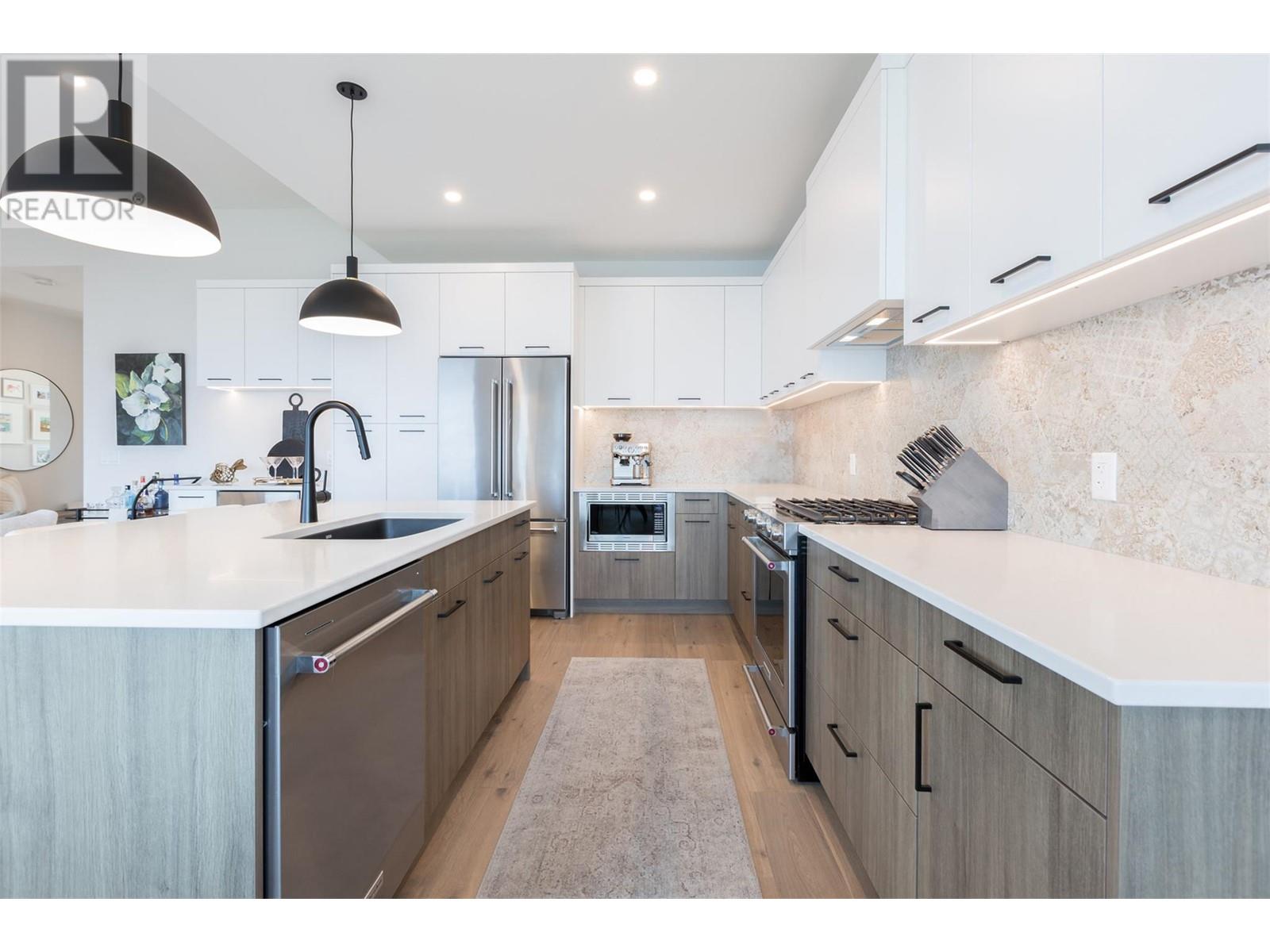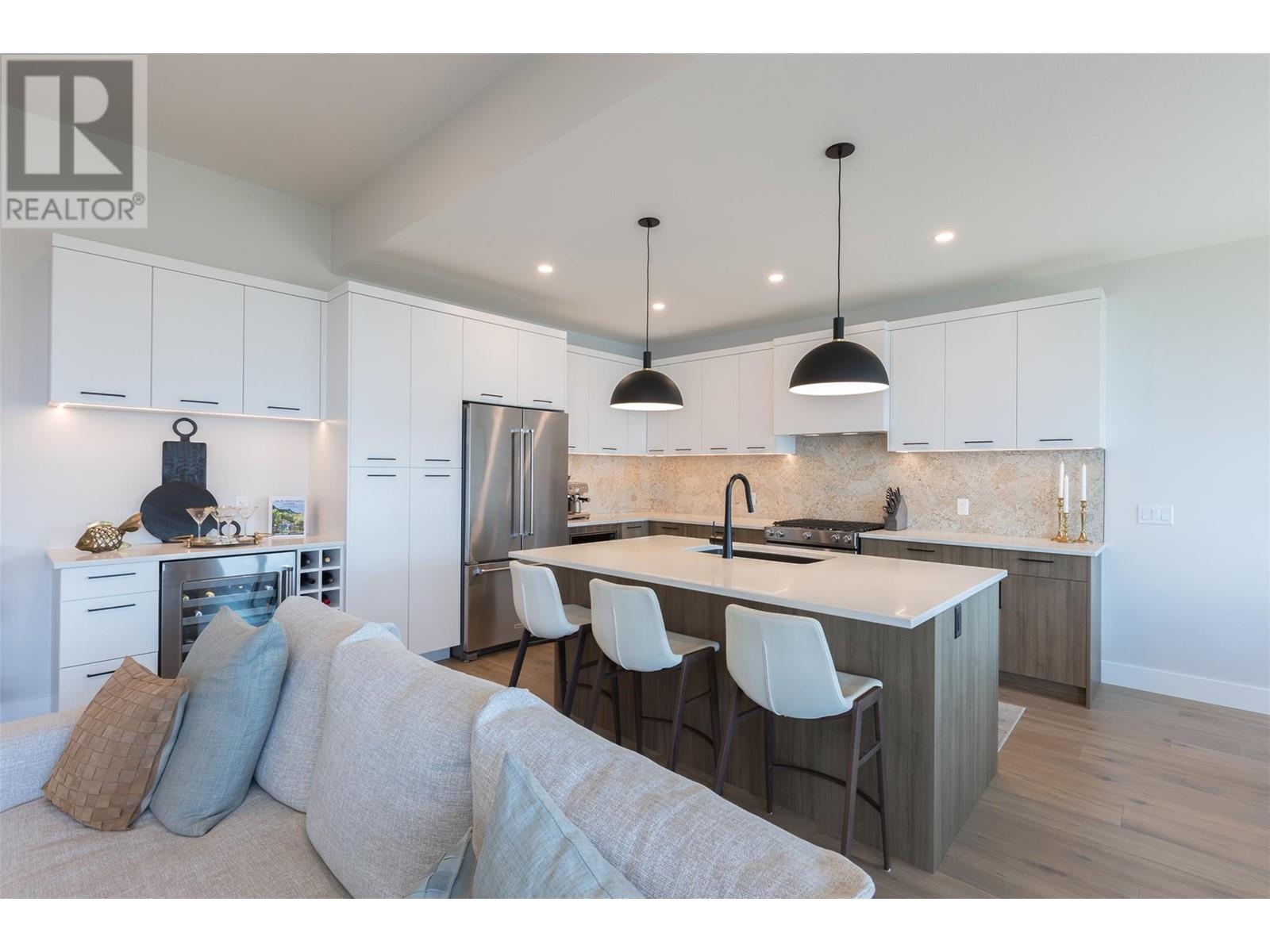 Experience luxury living in this meticulously designed walkout rancher home with a stunning lake view.The main level boasts a primary bedroom with ensuite and walk-in closet, while the lower walkout level offers 2 additional bedrooms.Light oak plank flooring runs throughout the main floor,leading to a covered deck with panoramic lake views.The designer kitchen and feature fireplace wall create an elegant focal point.Additional features include a powder room and laundry space on the main level,while the lower level offers a storage room,open family room,media room,and a full bath.This home backs onto a scenic walking path,providing both privacy and the convenience of a bareland strata.McKinley Beach,a desirable community, just 15 minutes from Kelowna International Airport and offers a community garden, pickleball/tennis courts, private marina,play park and upcoming rec centre with indoor pool & retail services.Experience lakeside luxury living in a thriving community at its finest. (id:22211)